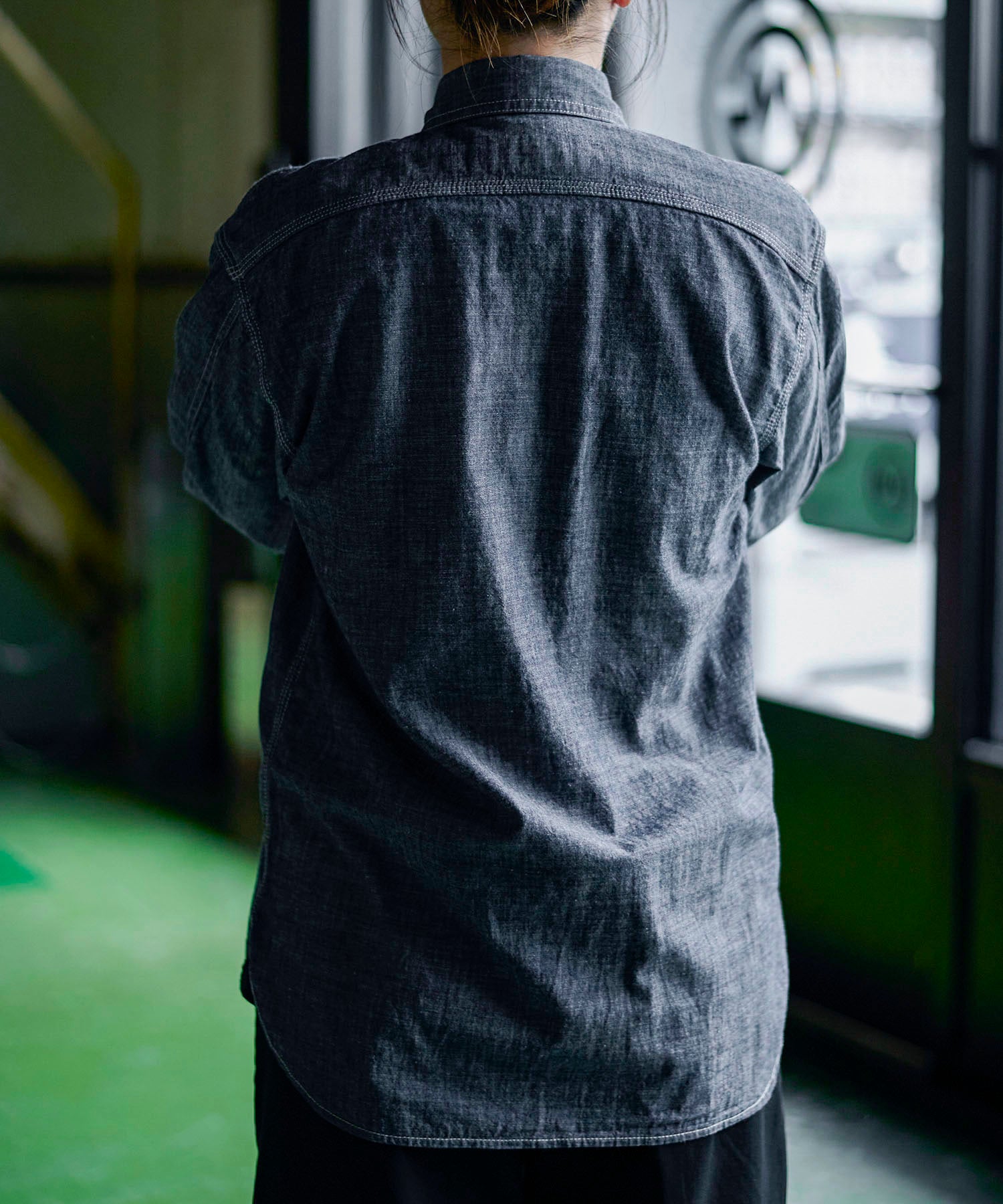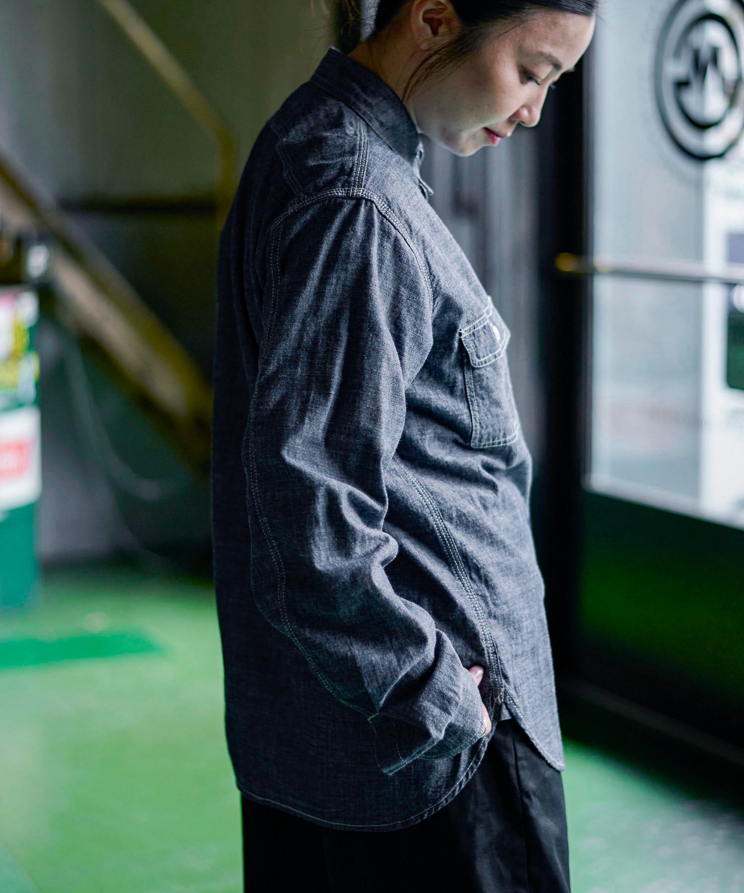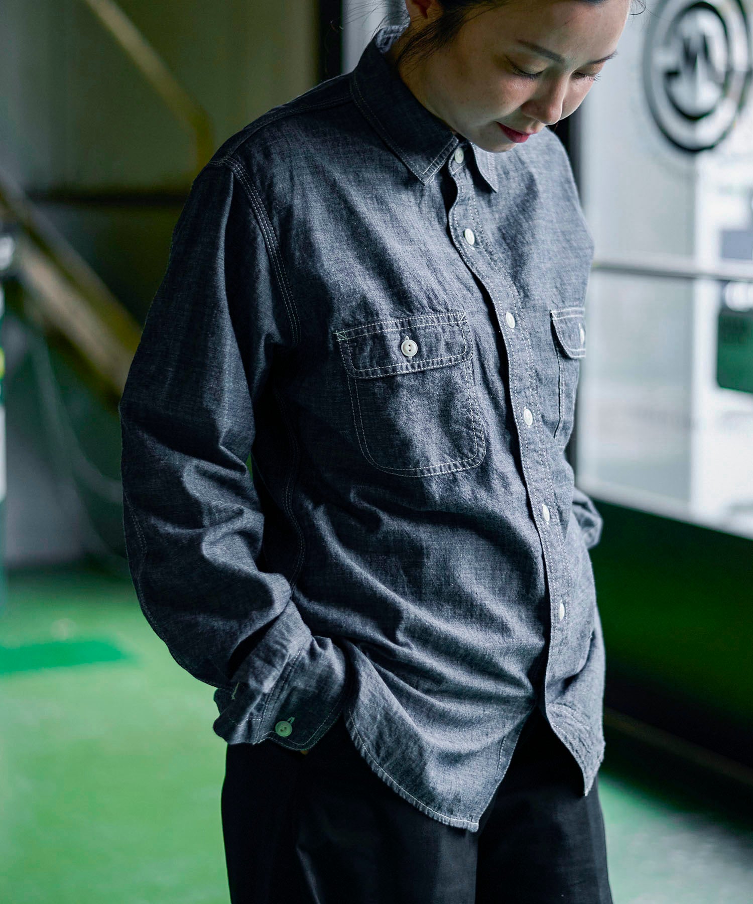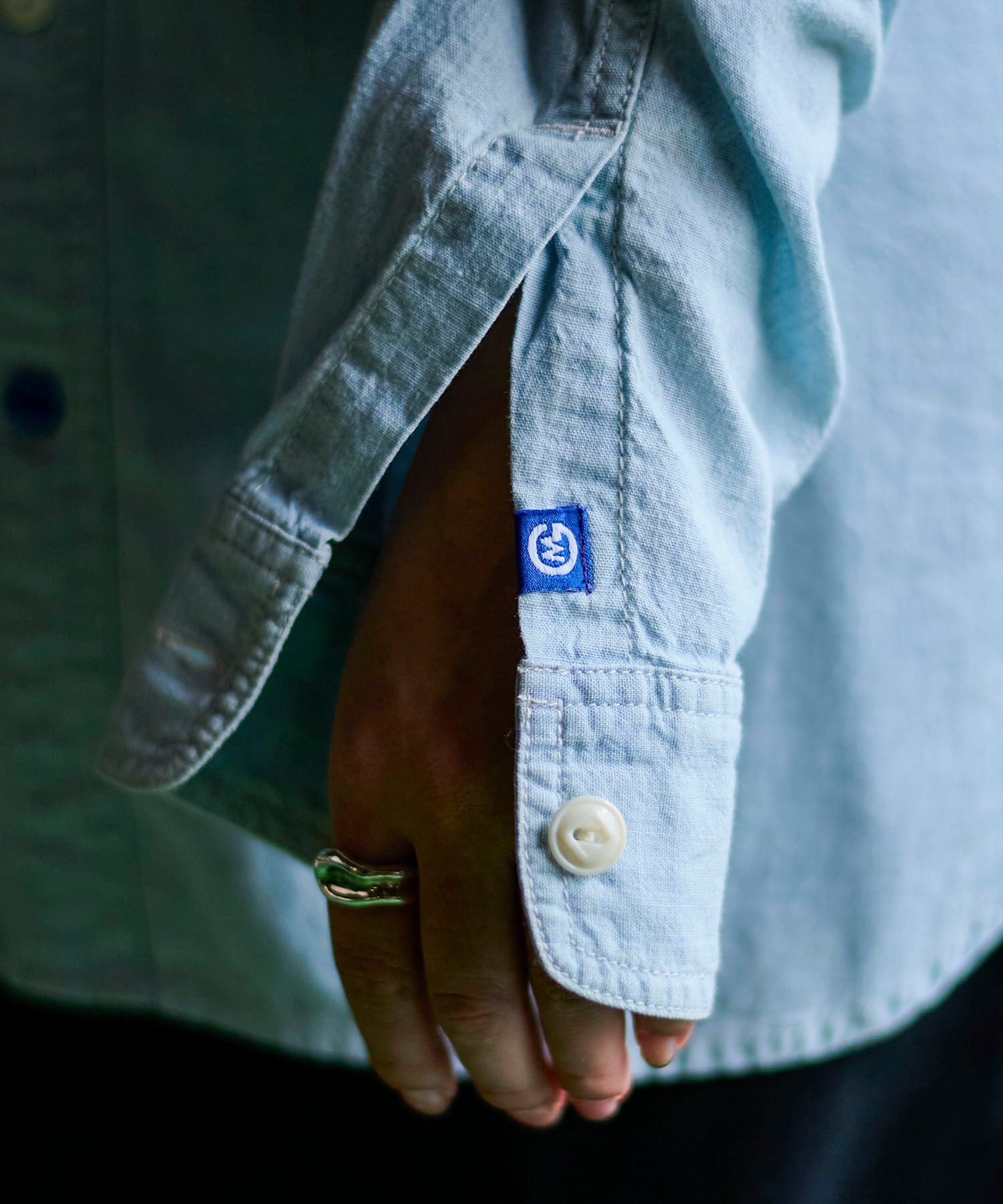 ワークシャツの仕様に仕上げながらも、シャツでは用いない立体裁断風3Dスリーブパターンを採用。4.5oz(オンス)のインディゴシャンブレー生地はムラ糸を使用した味のあるヘビーデューティーなものをチョイス。左右対称型のフラップポケットのワークシャツで癖を抑えた着回しのしやすいデザインを採用しました。フロントのワンポイント釦やチェーンステッチの裏糸配色でベーシックなワークシャツにデザインアクセントをプラス。シャツではあまり採用されることのない袖を肘部分から前側に振る立体的な構造で、すっきりとしたシルエットと着心地の良さを両立させています。左袖口に隠れて付いているピスネームは袖をまくった時にさりげなくブランドカラーをアピールできる位置になっています。ファブリックは上質な日本製を使用しています。