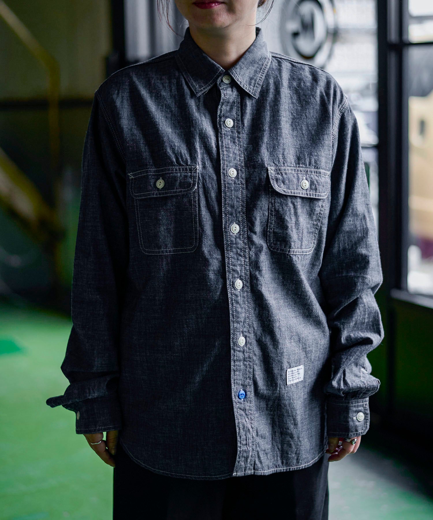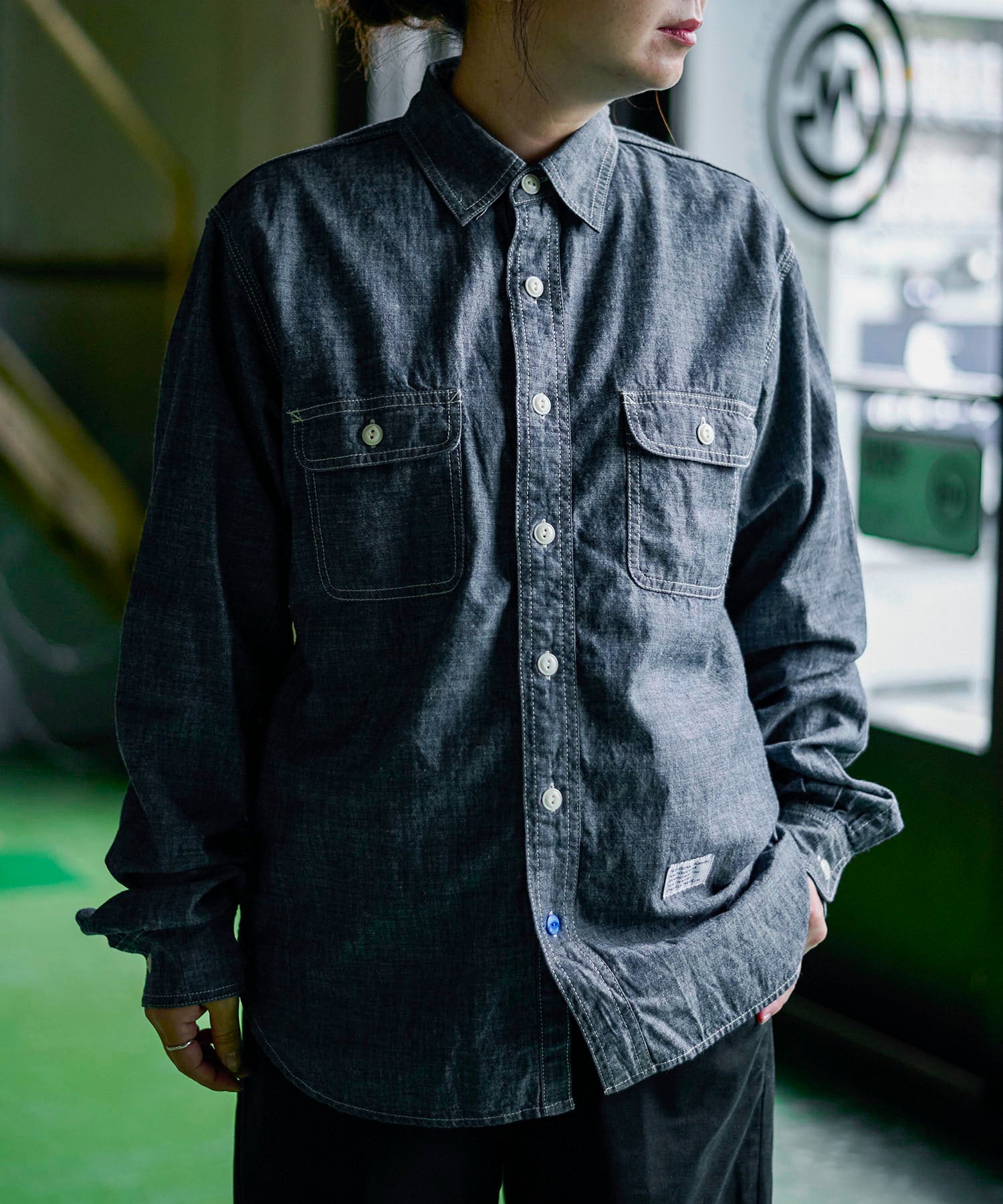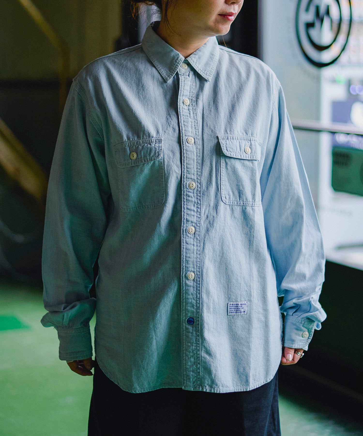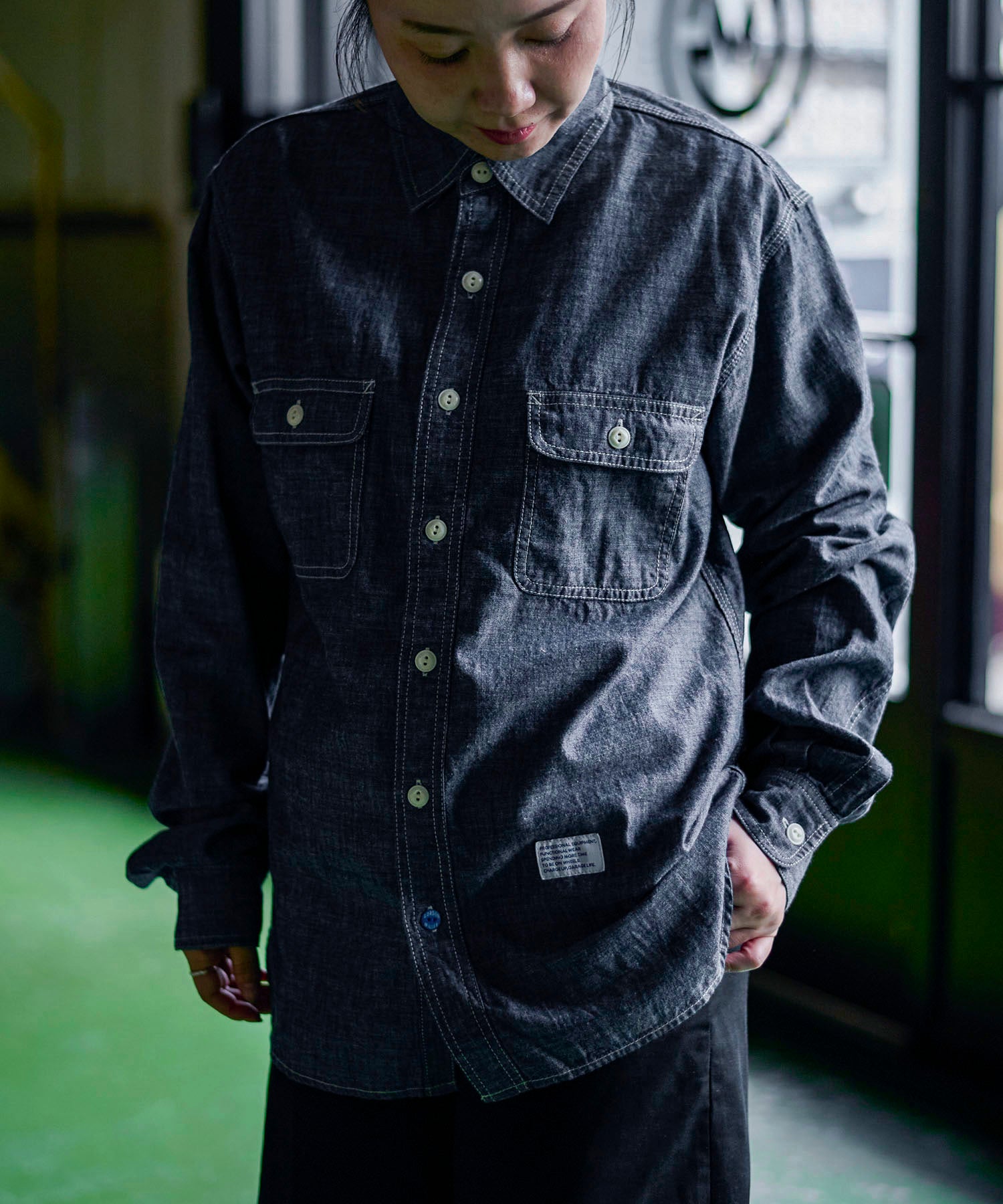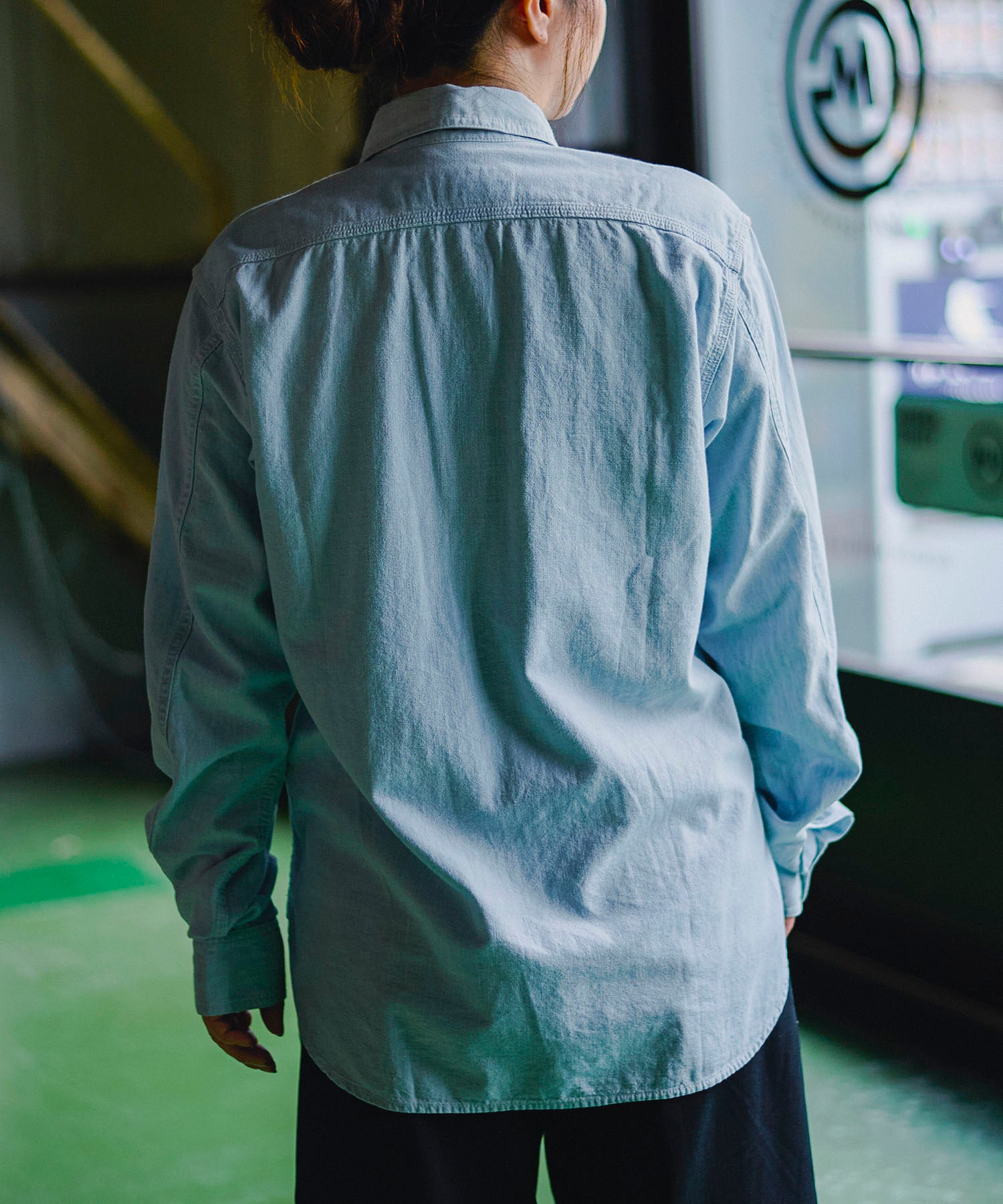 ワークシャツの仕様に仕上げながらも、シャツでは用いない立体裁断風3Dスリーブパターンを採用。4.5oz(オンス)のインディゴシャンブレー生地はムラ糸を使用した味のあるヘビーデューティーなものをチョイス。左右対称型のフラップポケットのワークシャツで癖を抑えた着回しのしやすいデザインを採用しました。フロントのワンポイント釦やチェーンステッチの裏糸配色でベーシックなワークシャツにデザインアクセントをプラス。シャツではあまり採用されることのない袖を肘部分から前側に振る立体的な構造で、すっきりとしたシルエットと着心地の良さを両立させています。左袖口に隠れて付いているピスネームは袖をまくった時にさりげなくブランドカラーをアピールできる位置になっています。ファブリックは上質な日本製を使用しています。