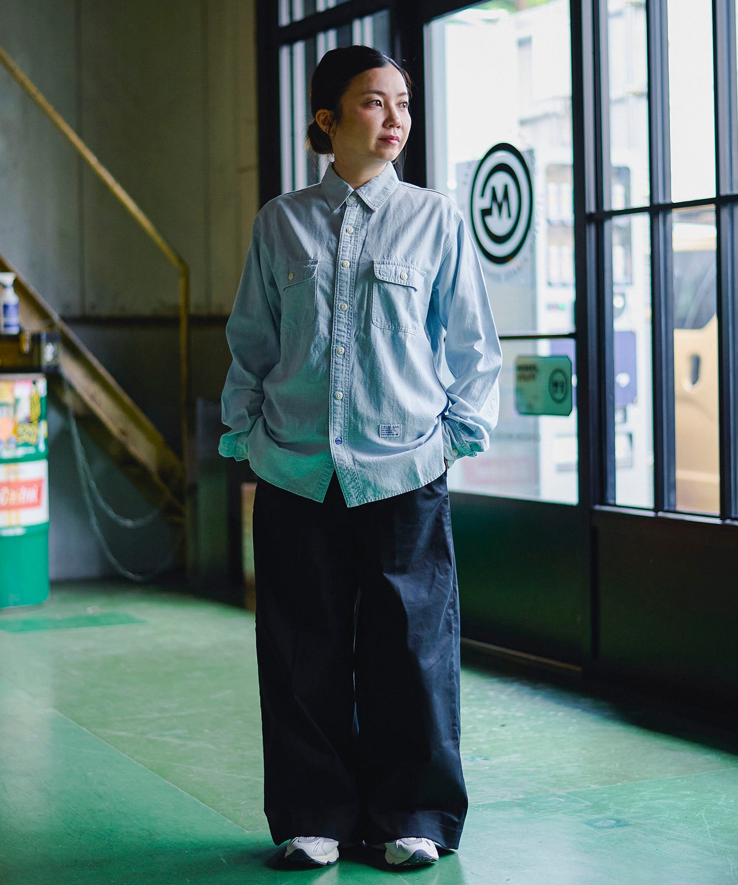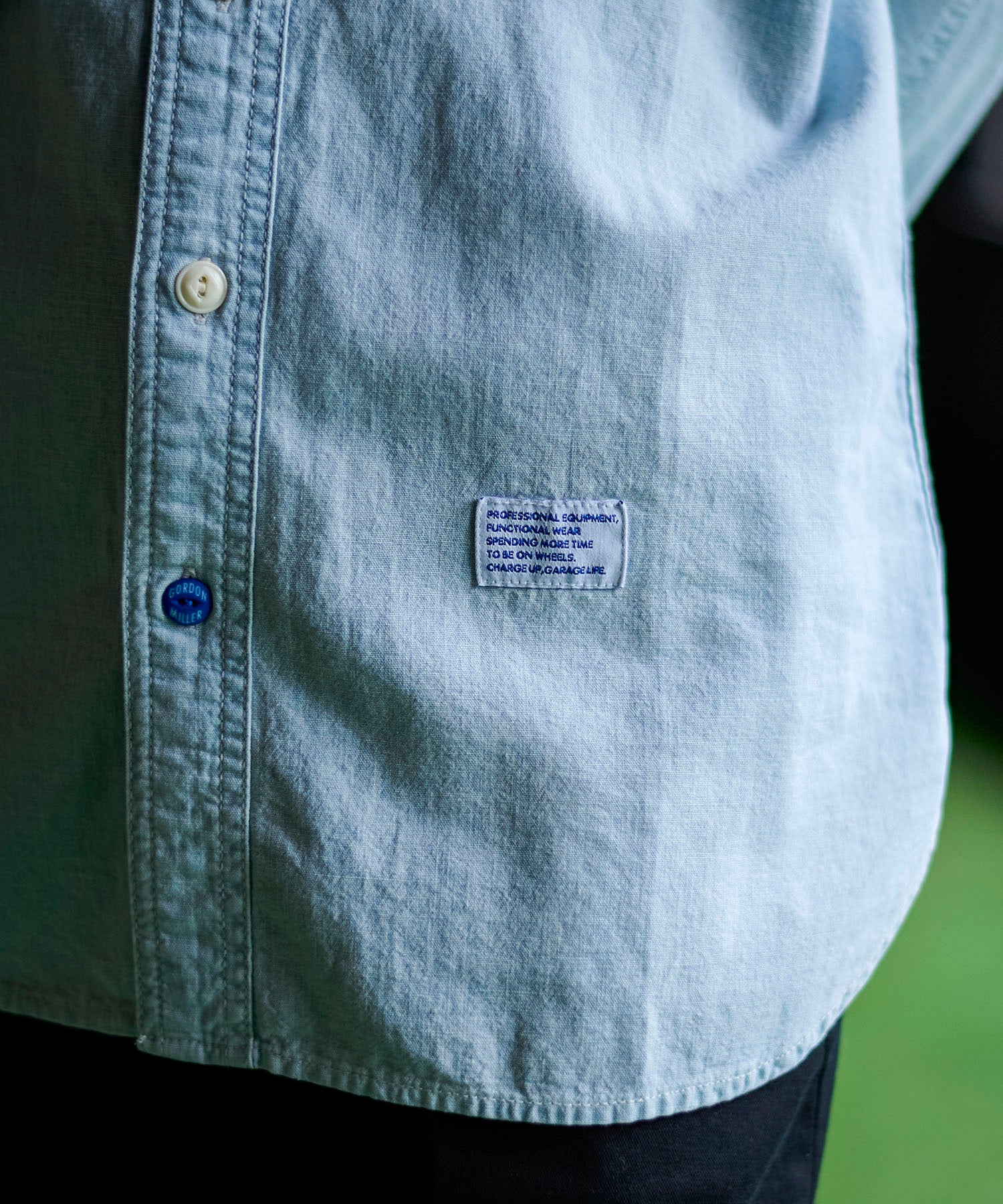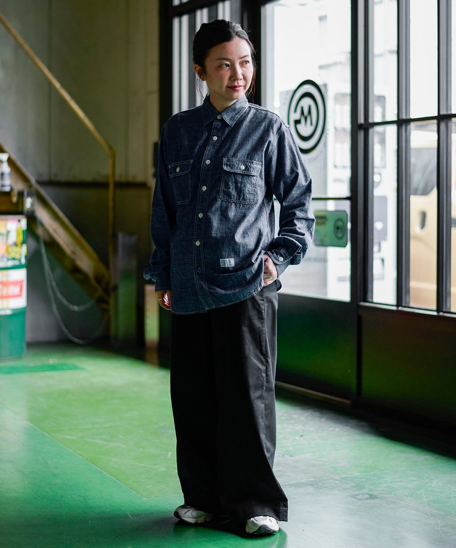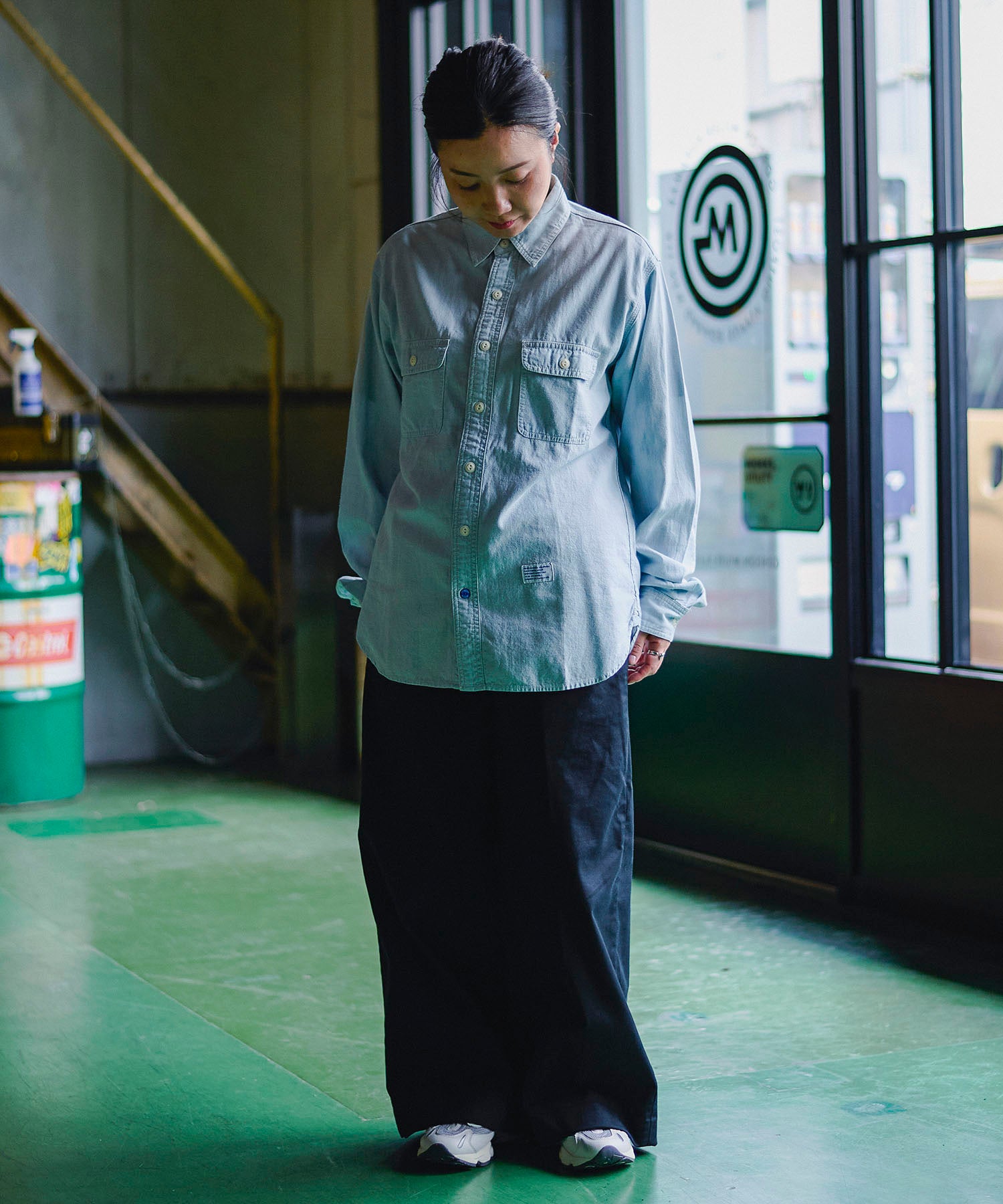 ワークシャツの仕様に仕上げながらも、シャツでは用いない立体裁断風3Dスリーブパターンを採用。4.5oz(オンス)のインディゴシャンブレー生地はムラ糸を使用した味のあるヘビーデューティーなものをチョイス。左右対称型のフラップポケットのワークシャツで癖を抑えた着回しのしやすいデザインを採用しました。フロントのワンポイント釦やチェーンステッチの裏糸配色でベーシックなワークシャツにデザインアクセントをプラス。シャツではあまり採用されることのない袖を肘部分から前側に振る立体的な構造で、すっきりとしたシルエットと着心地の良さを両立させています。左袖口に隠れて付いているピスネームは袖をまくった時にさりげなくブランドカラーをアピールできる位置になっています。ファブリックは上質な日本製を使用しています。