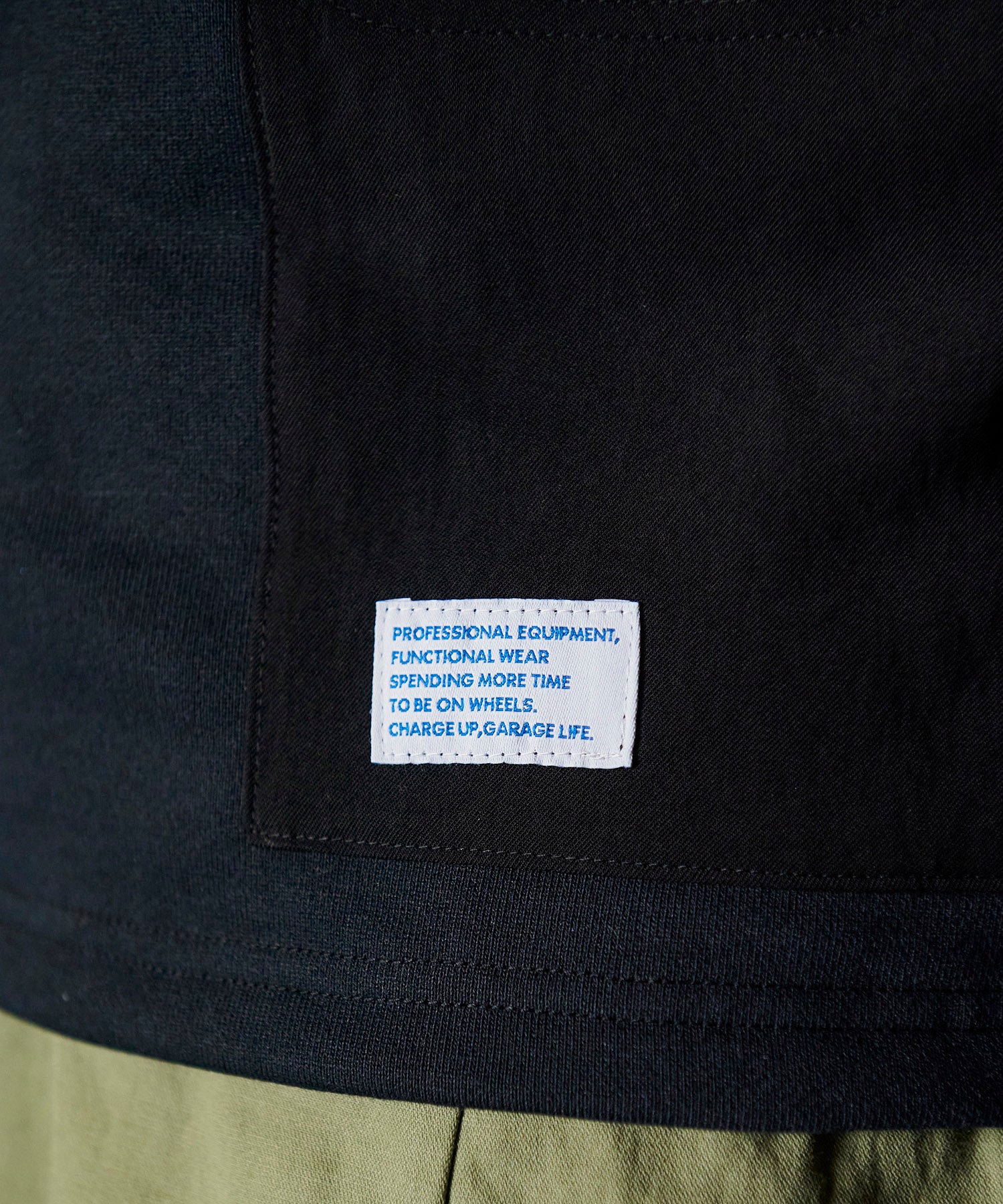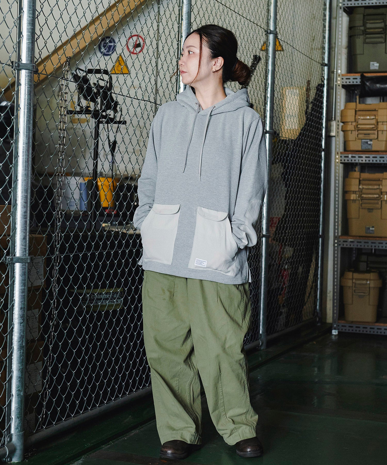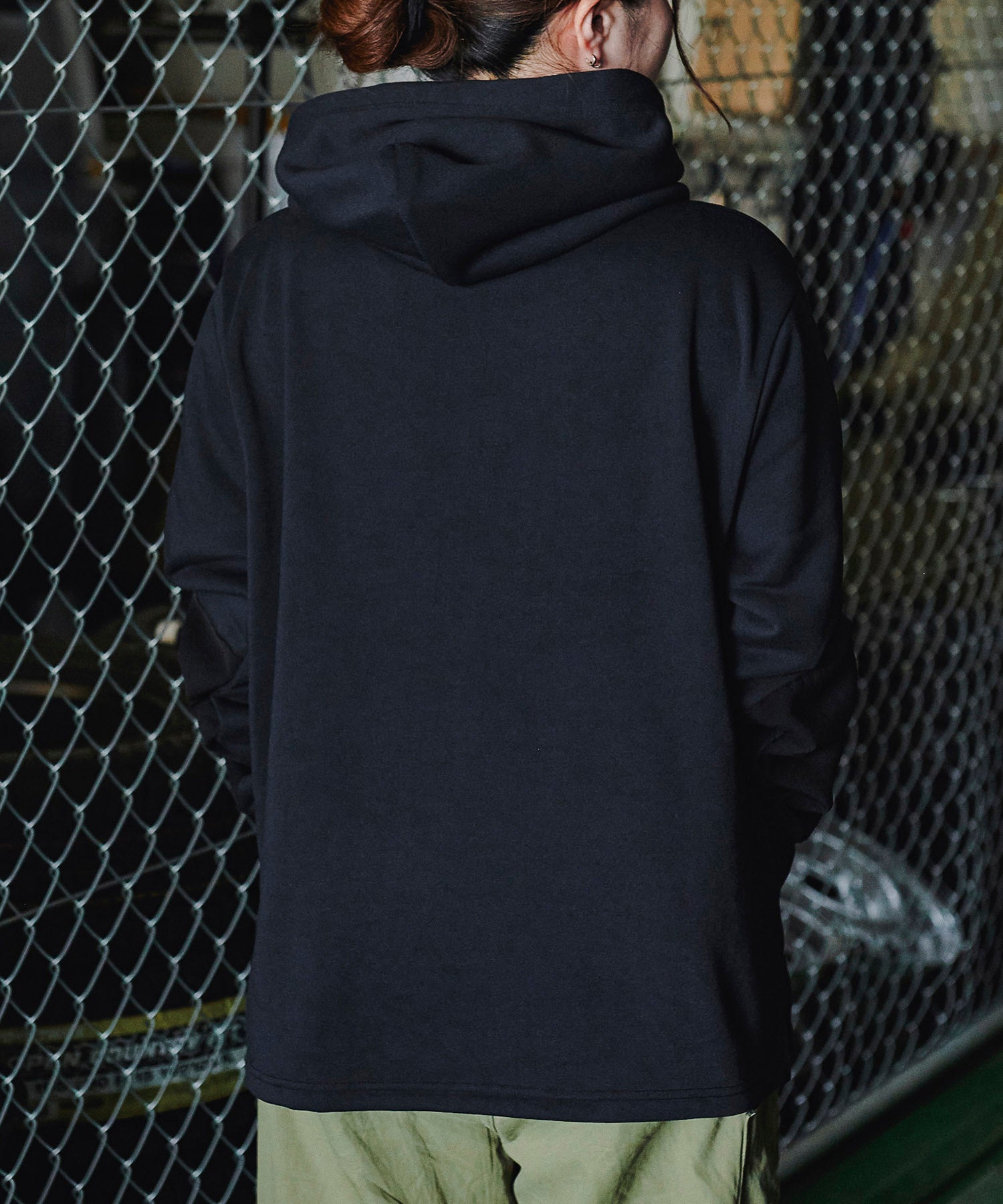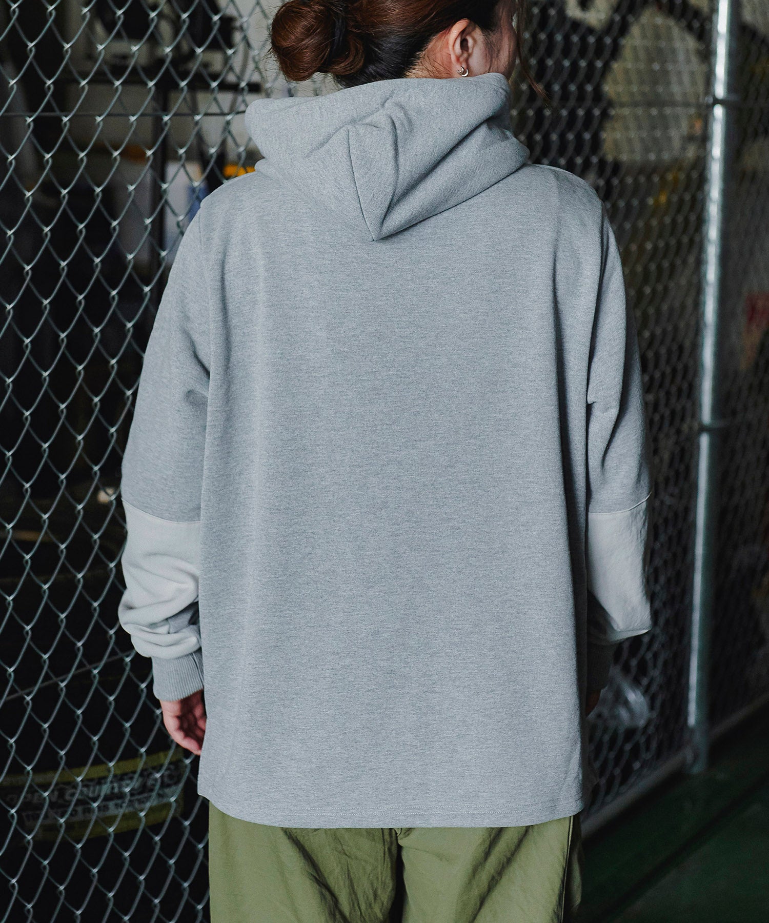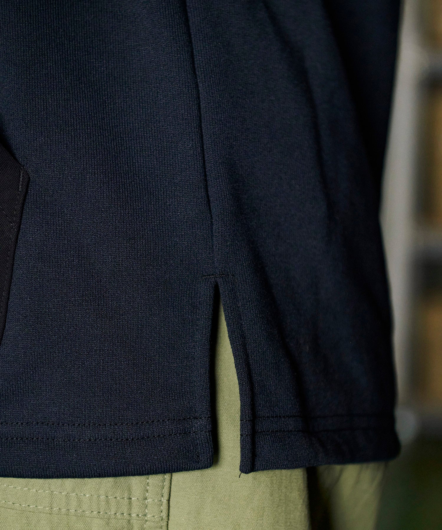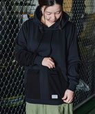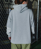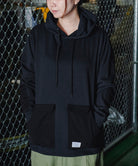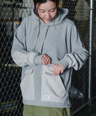 一見普通のコットンに見えますが実はポリエステル素材「Policotto(ポリコット)」を使用したスウェットパーカー。ドライタッチなサラサラとした肌触りが特徴で、綿と比べ速乾性があり縮みも少ないイージーケアアイテムです。ミニフラップポケットが付いたフロントポケットと補強を兼ねたエルボーパッチはポリエステルの布帛を使用しデザインアクセントにもなっています。ゆったりとしたシルエットと裾のリブのないデザインでボトムスを選ばずストレスフリーで着まわしやすい設計にしています。