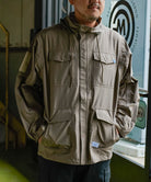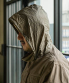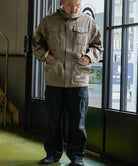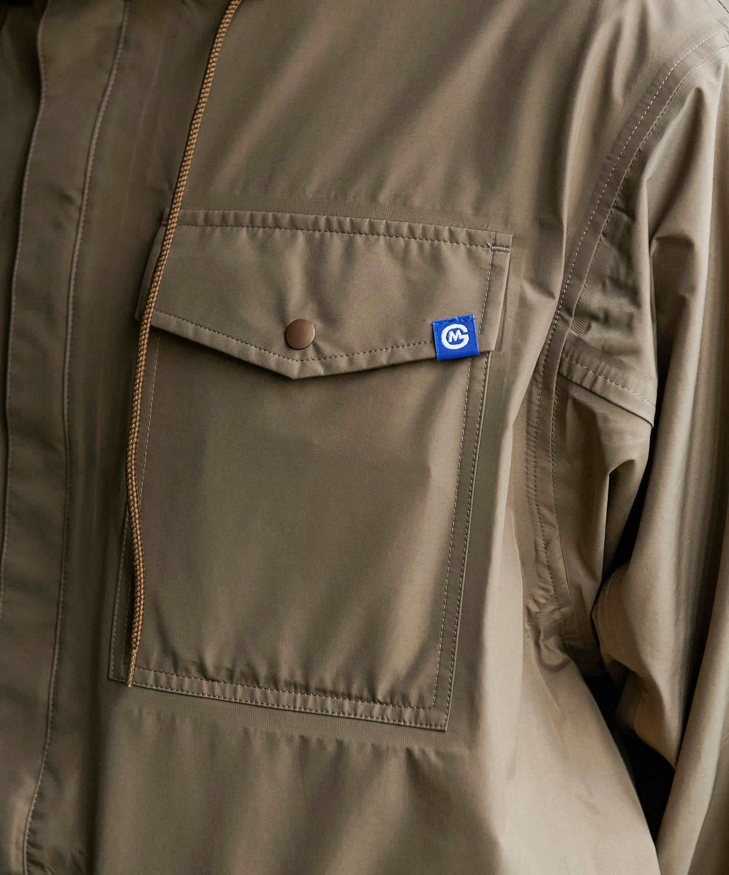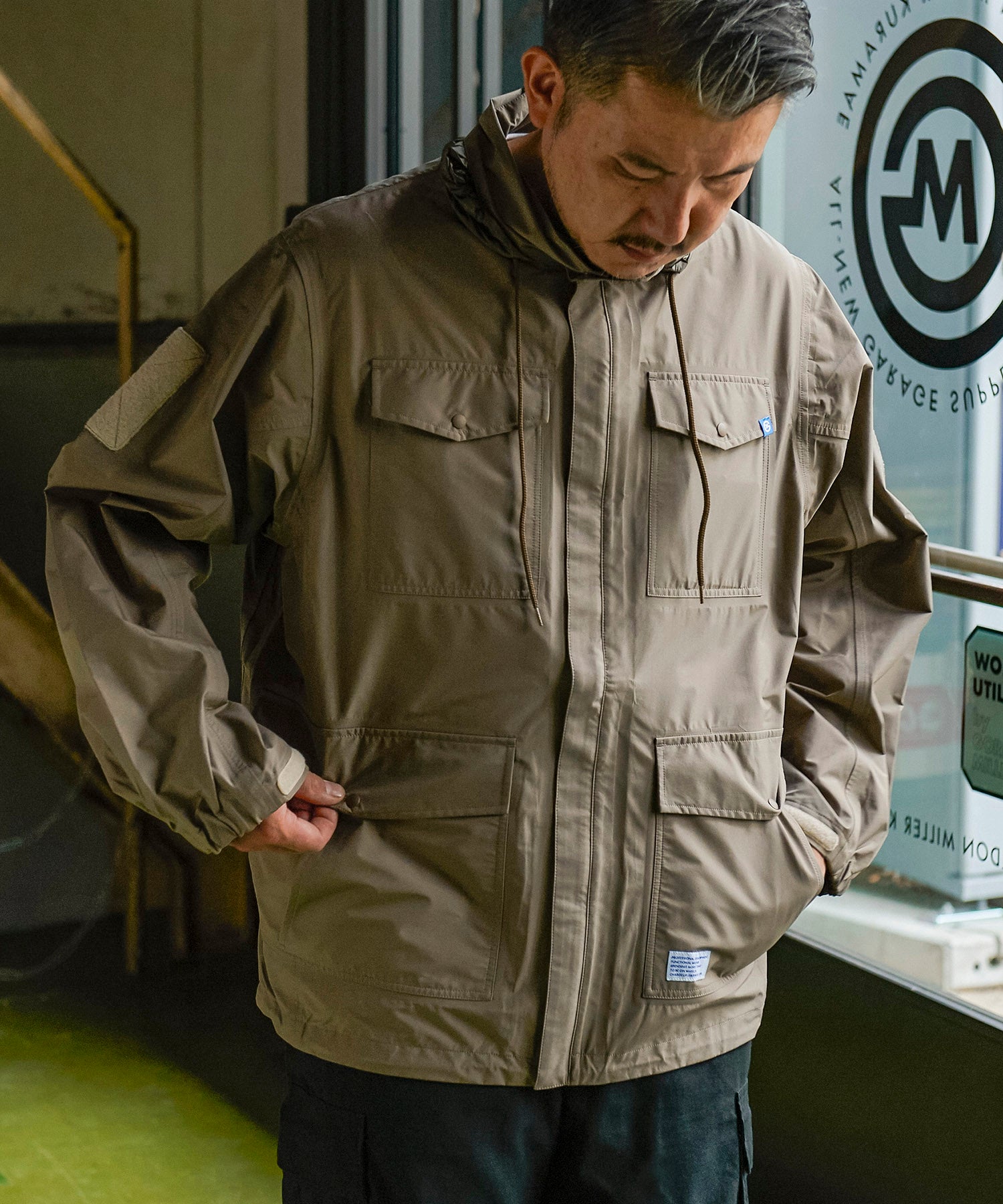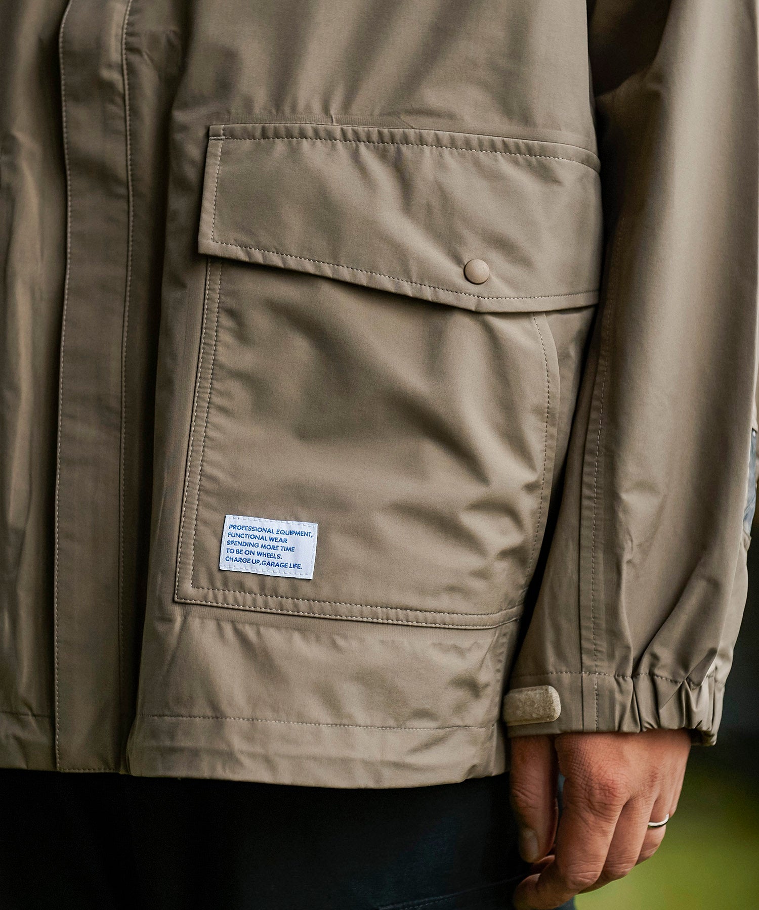 高機能な透湿防水素材「eVent」を使用したオーバーサイズのミリタリーブルゾンは衿にインナーフードを備えています。左袖口の塩ビの窓は別売の「ALLIED DOWNデタッチャブルブルゾン」をインした際スマートキーの操作を着用したまま出来る仕様になっています。また雨天時に車内に入る際に片手でファスナーが開けられる「トップオープンファスナー」を採用。