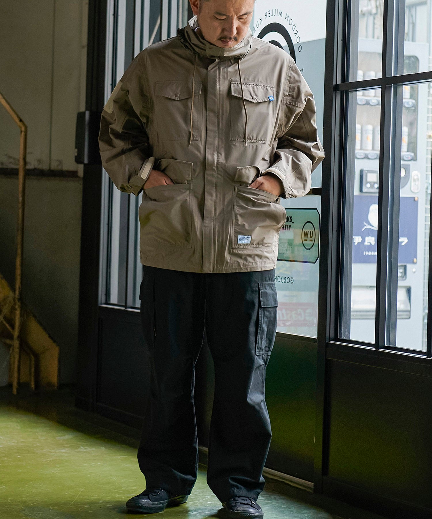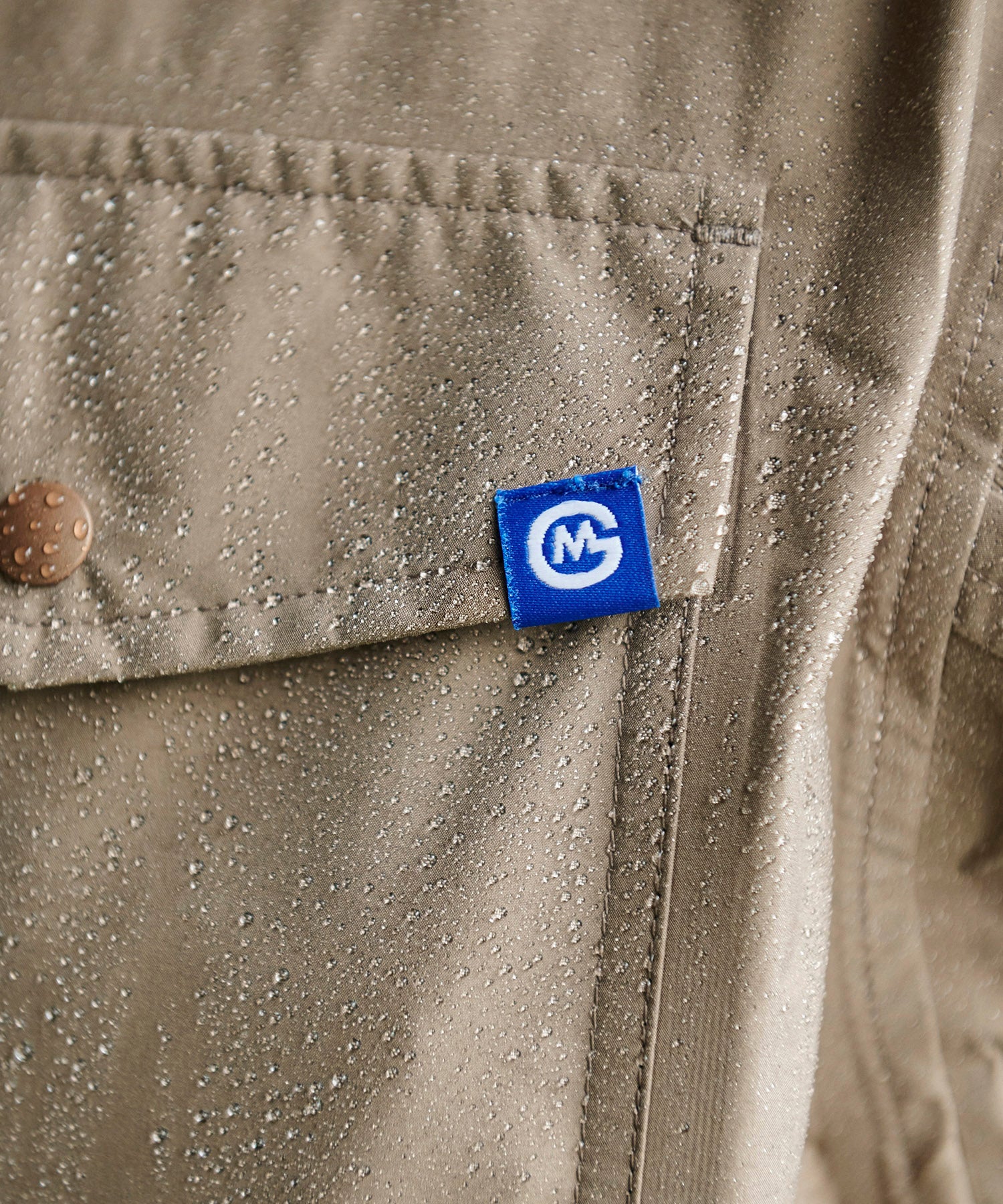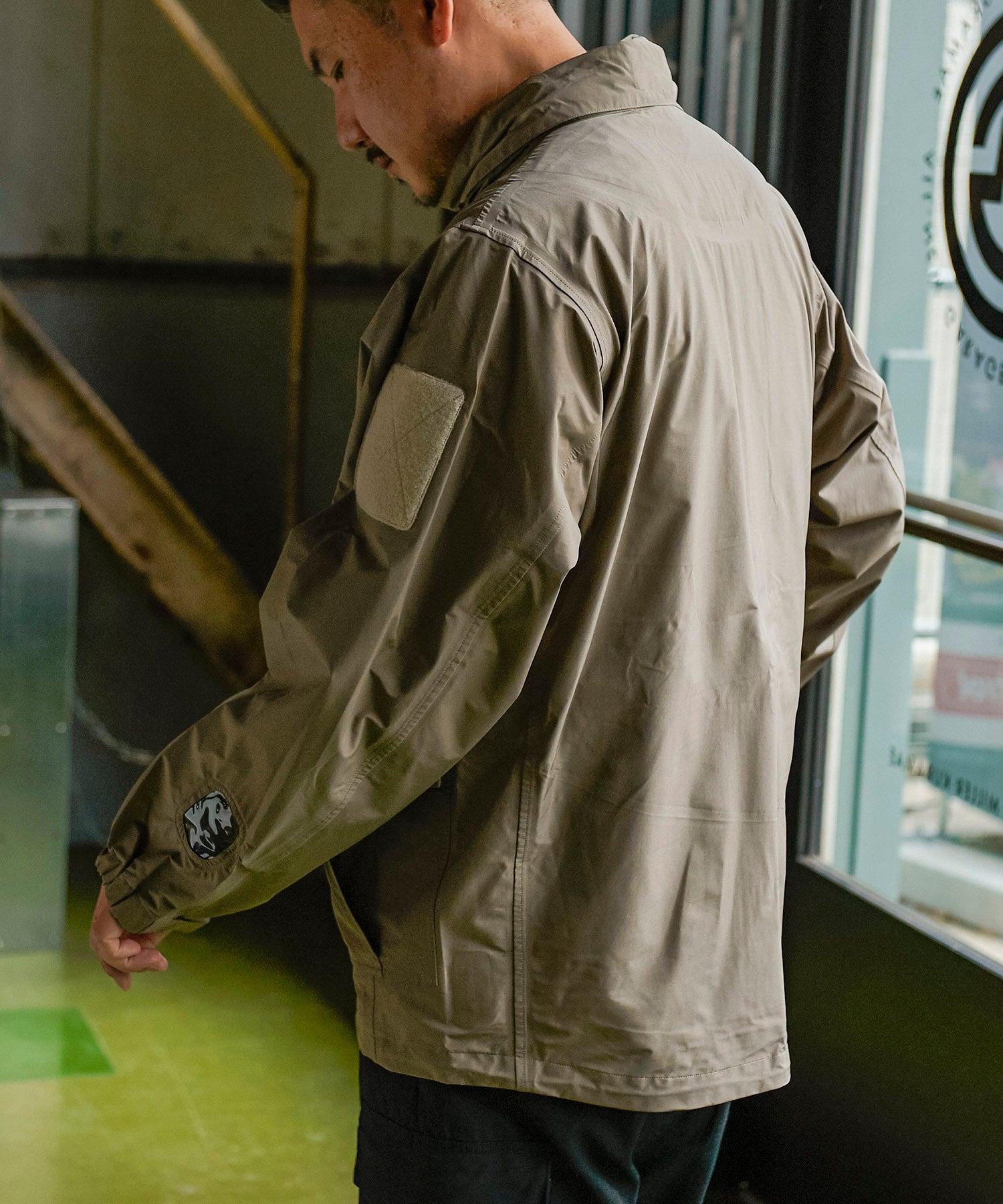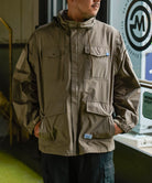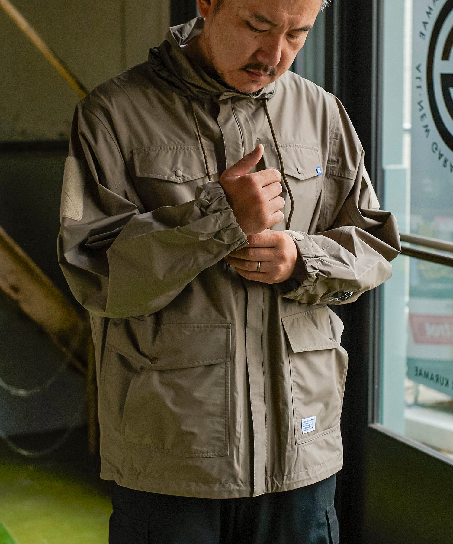 高機能な透湿防水素材「eVent」を使用したオーバーサイズのミリタリーブルゾンは衿にインナーフードを備えています。左袖口の塩ビの窓は別売の「ALLIED DOWNデタッチャブルブルゾン」をインした際スマートキーの操作を着用したまま出来る仕様になっています。また雨天時に車内に入る際に片手でファスナーが開けられる「トップオープンファスナー」を採用。