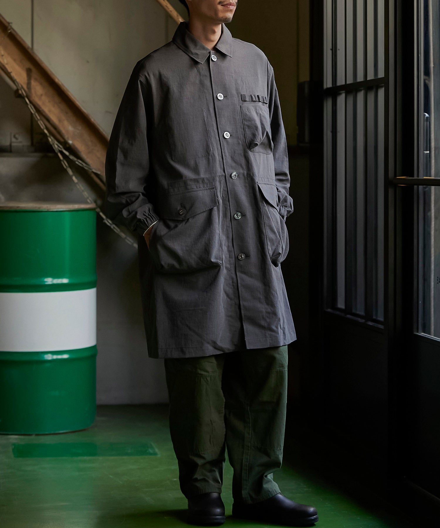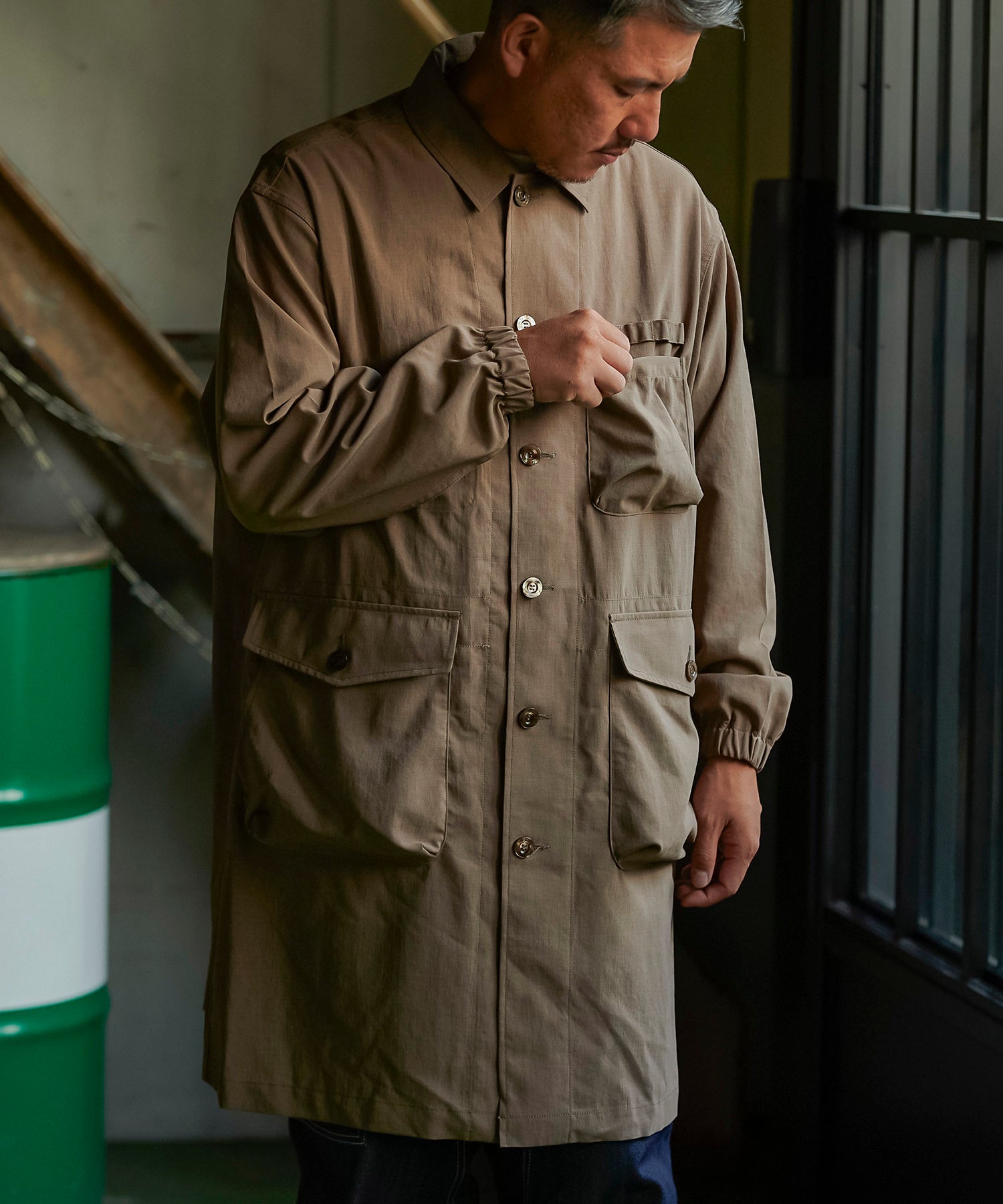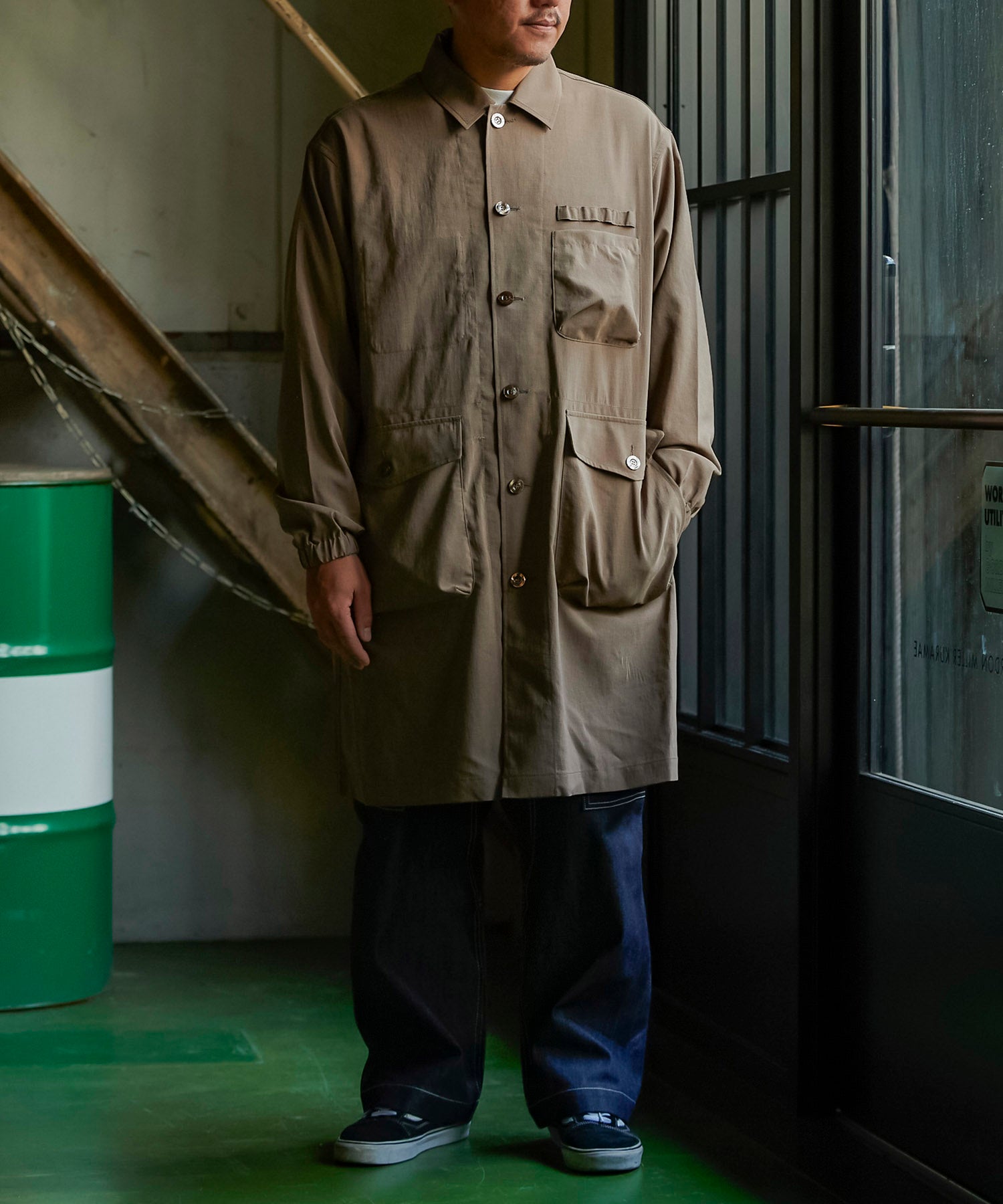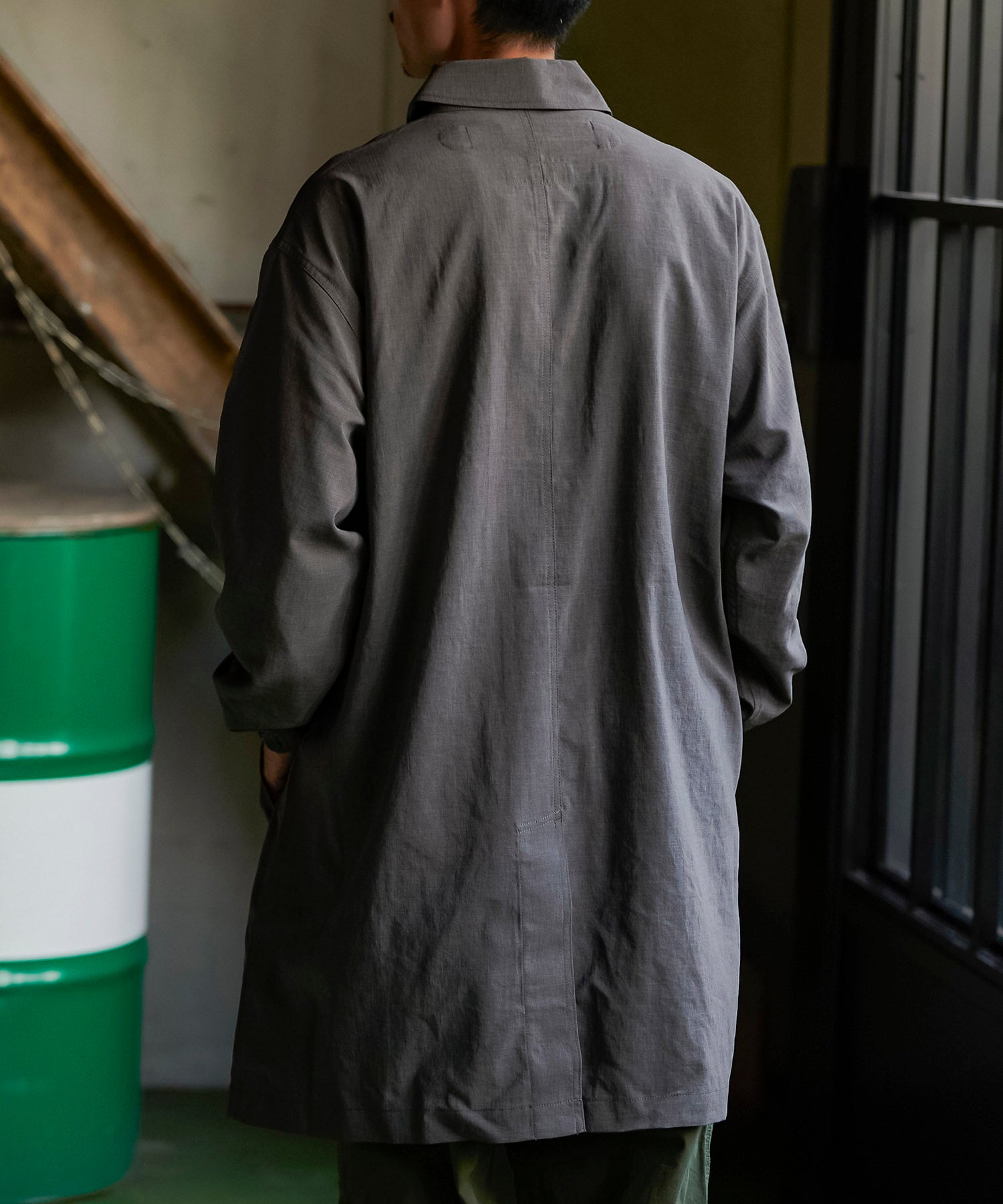 麻の様な表情が特徴のポリエステル系イージーケア素材を使った一重のショップコート。