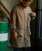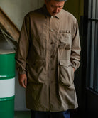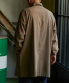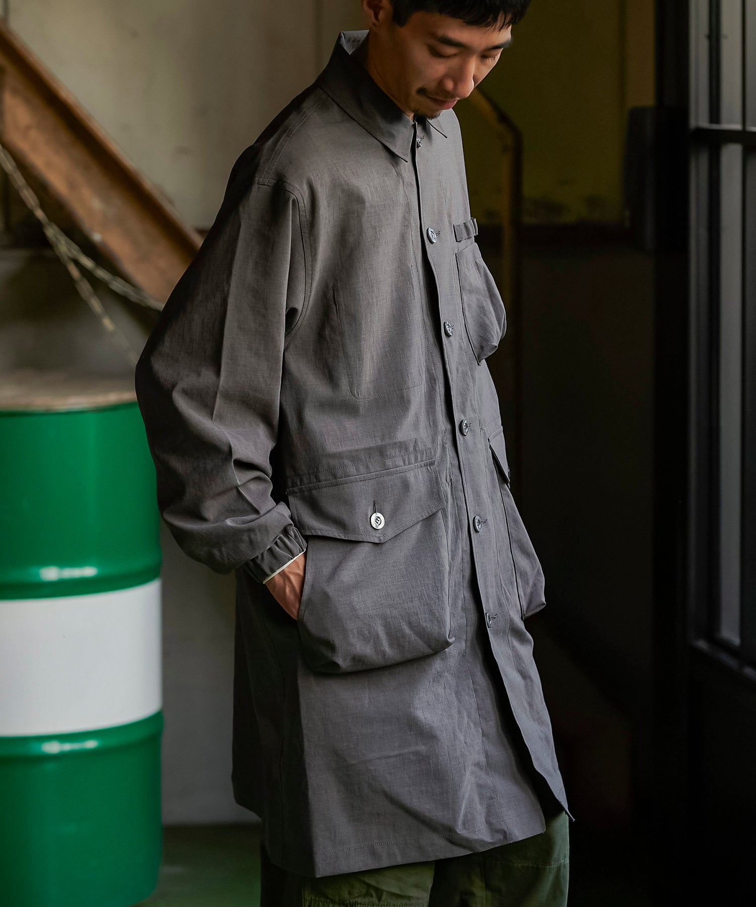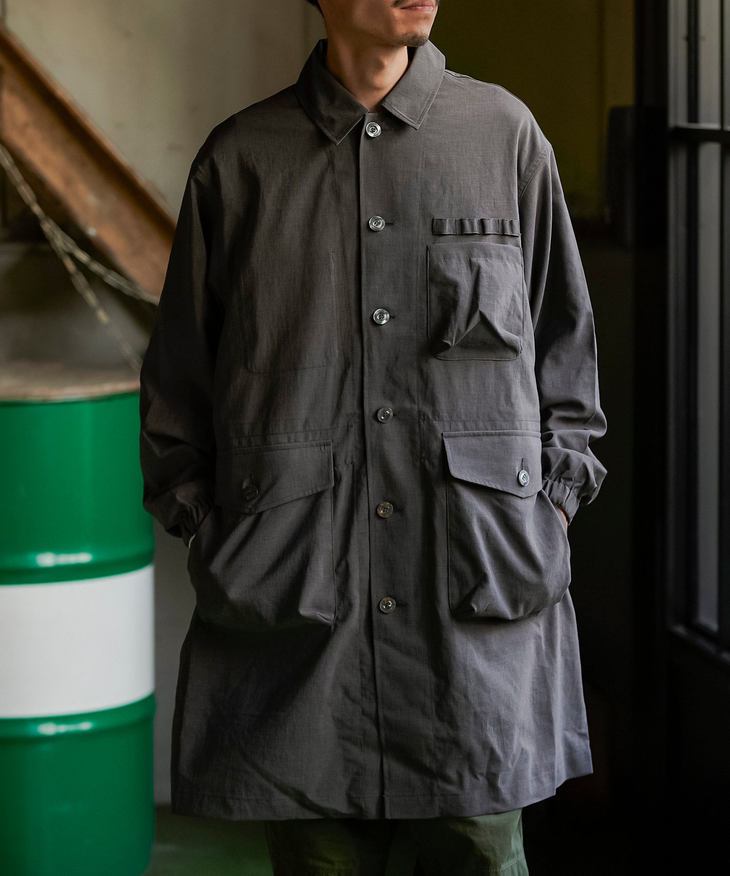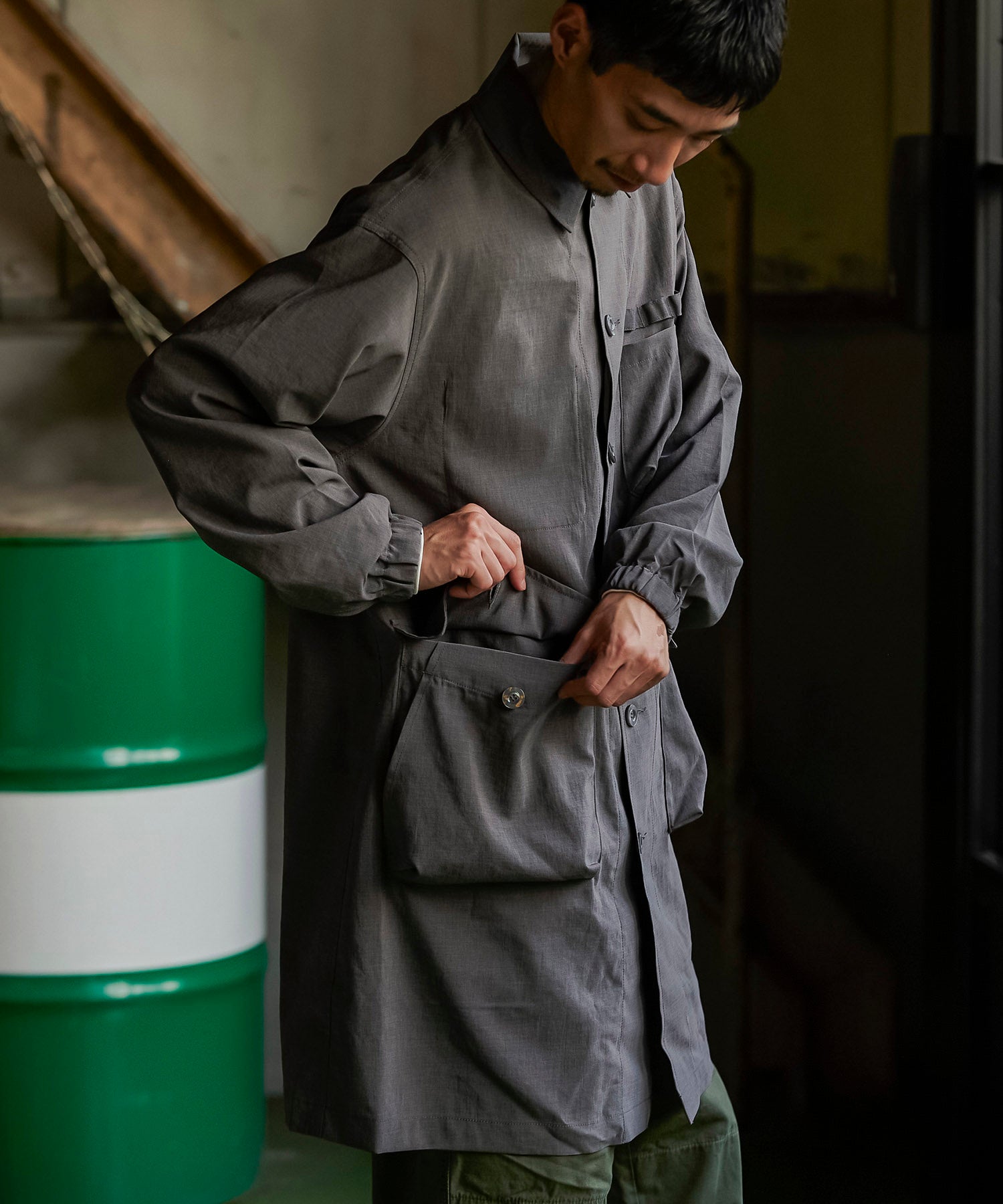 麻の様な表情が特徴のポリエステル系イージーケア素材を使った一重のショップコート。