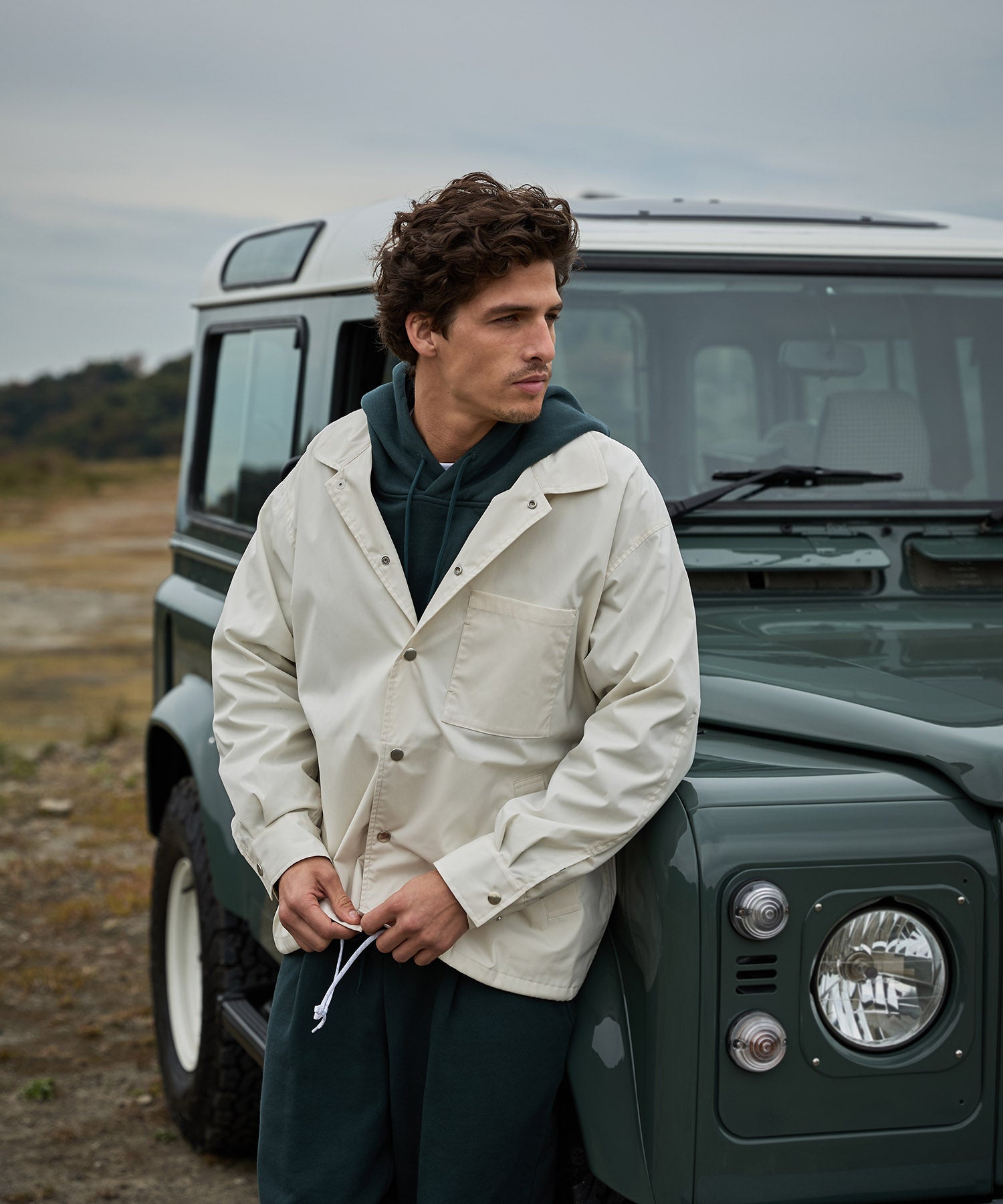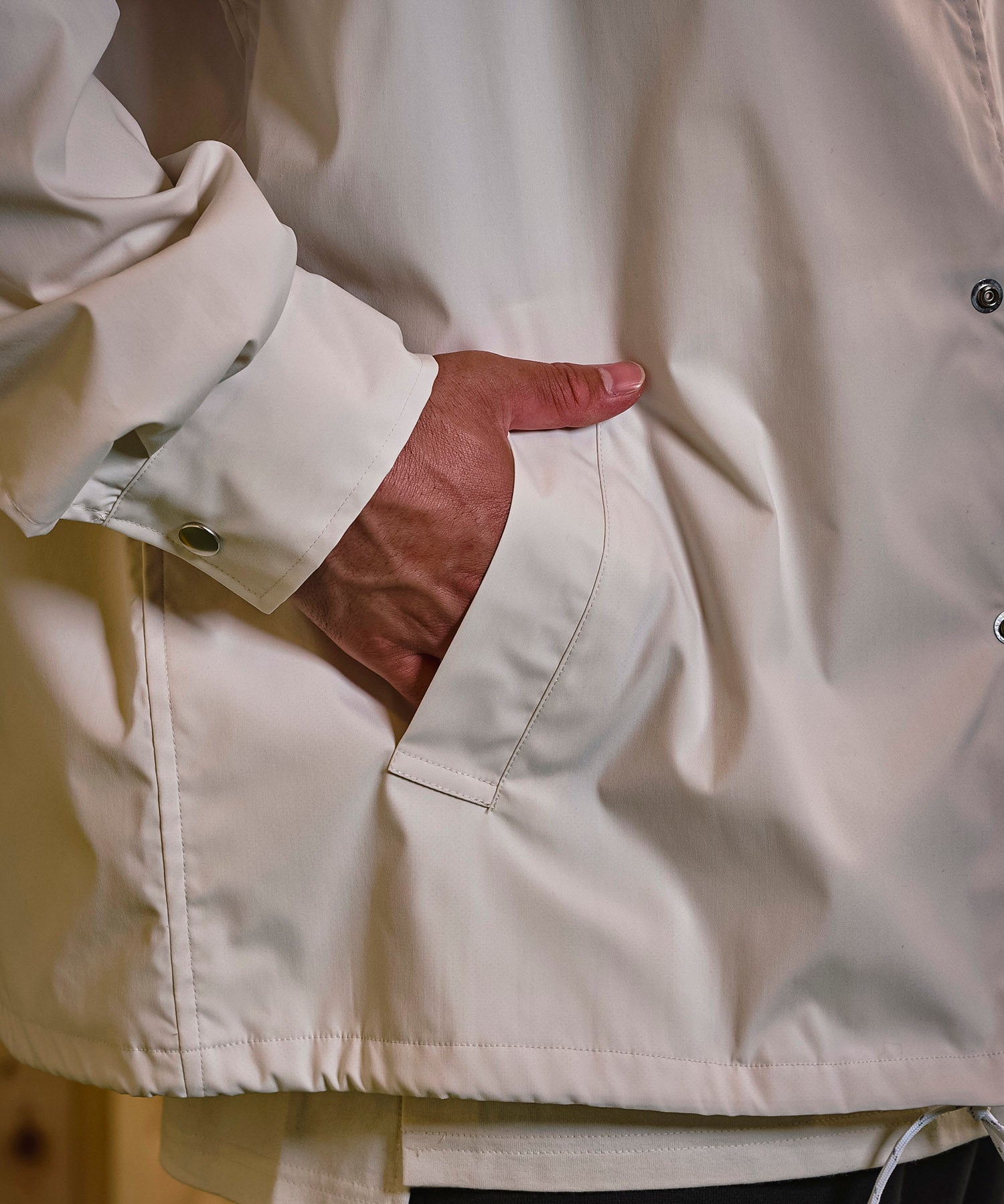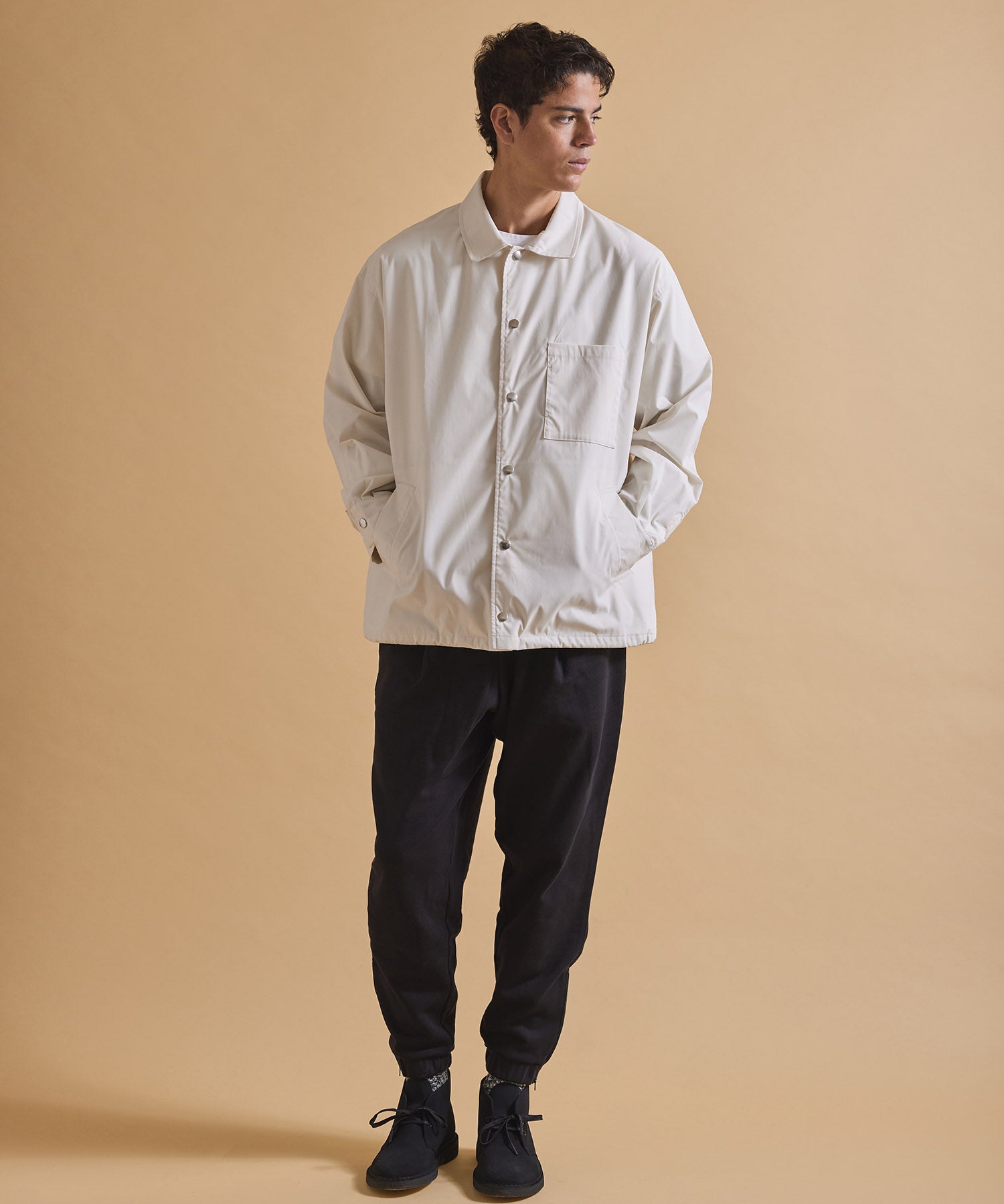軍モノやワークウエアとしても使用されるほど、丈夫でイージーケアなウェザークロスという生地はライトウェイトでもハリコシがあり、軽やかなシルエットを出すことができます。