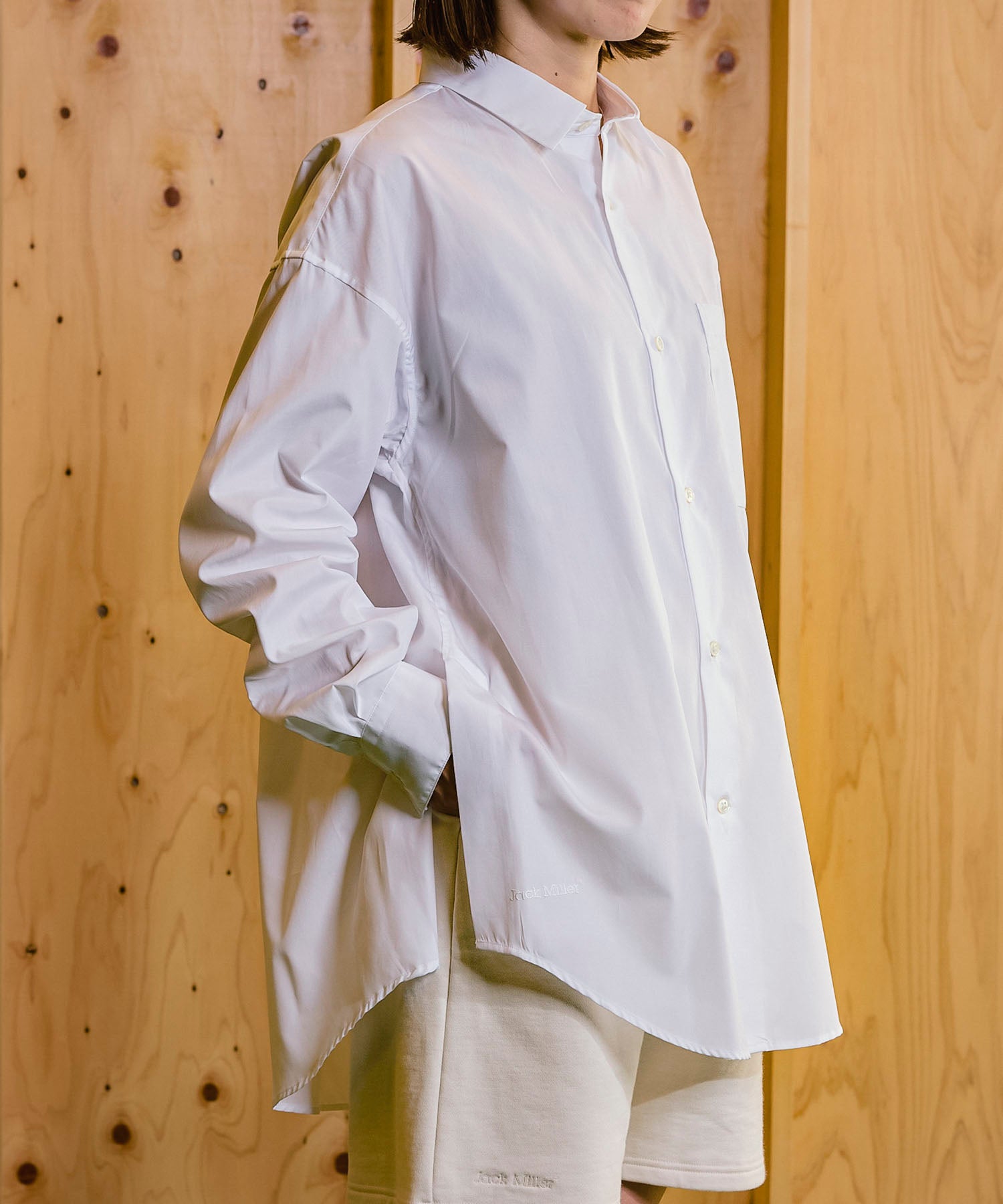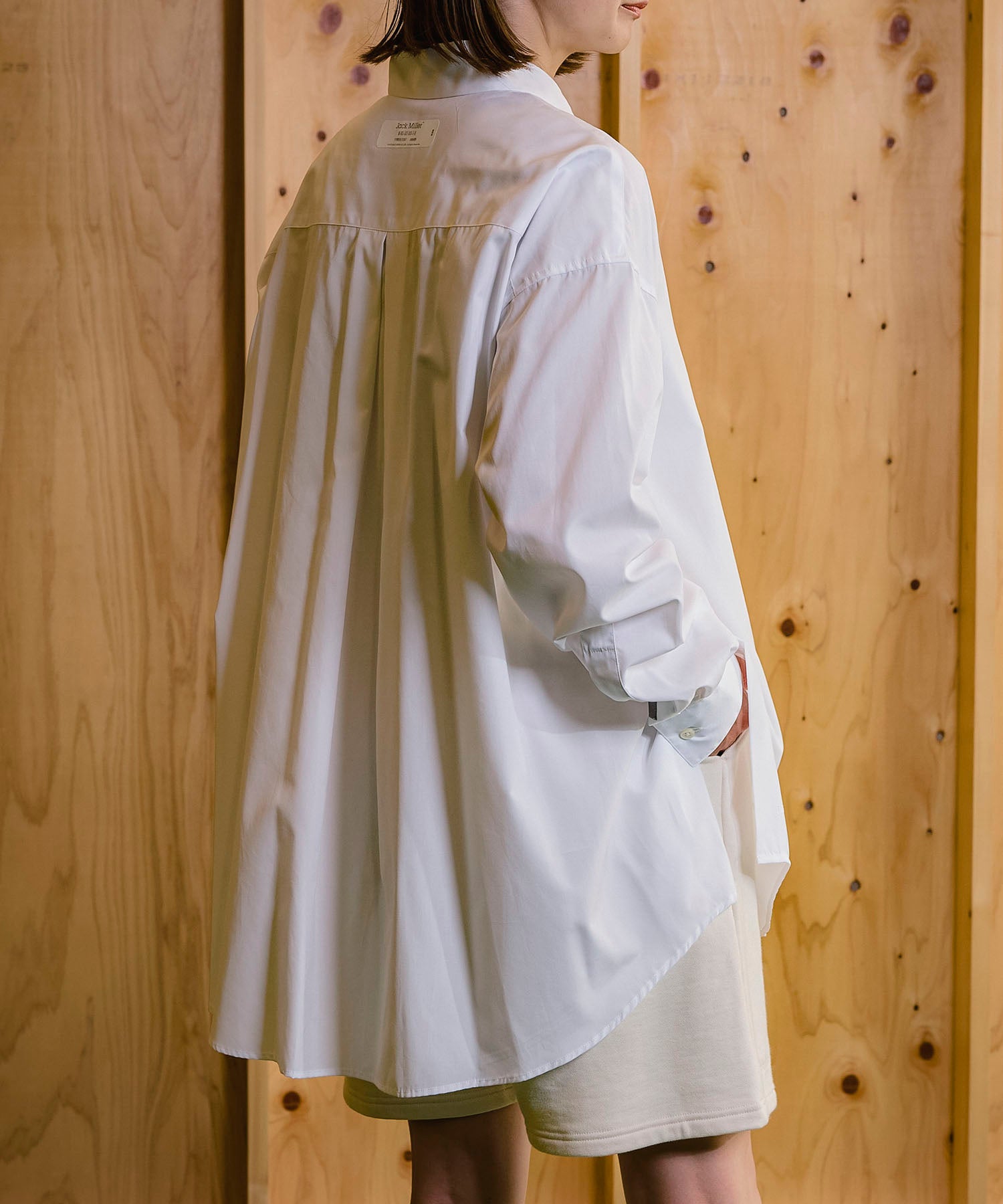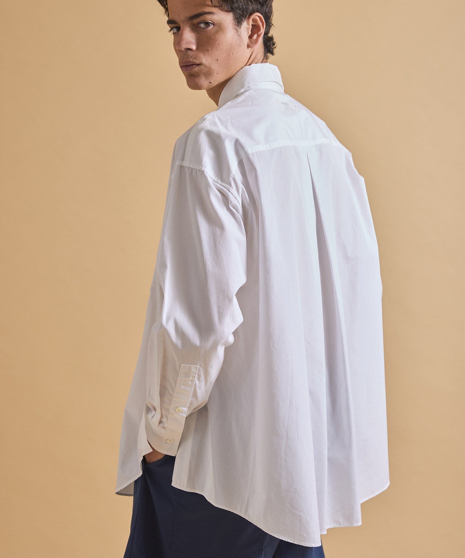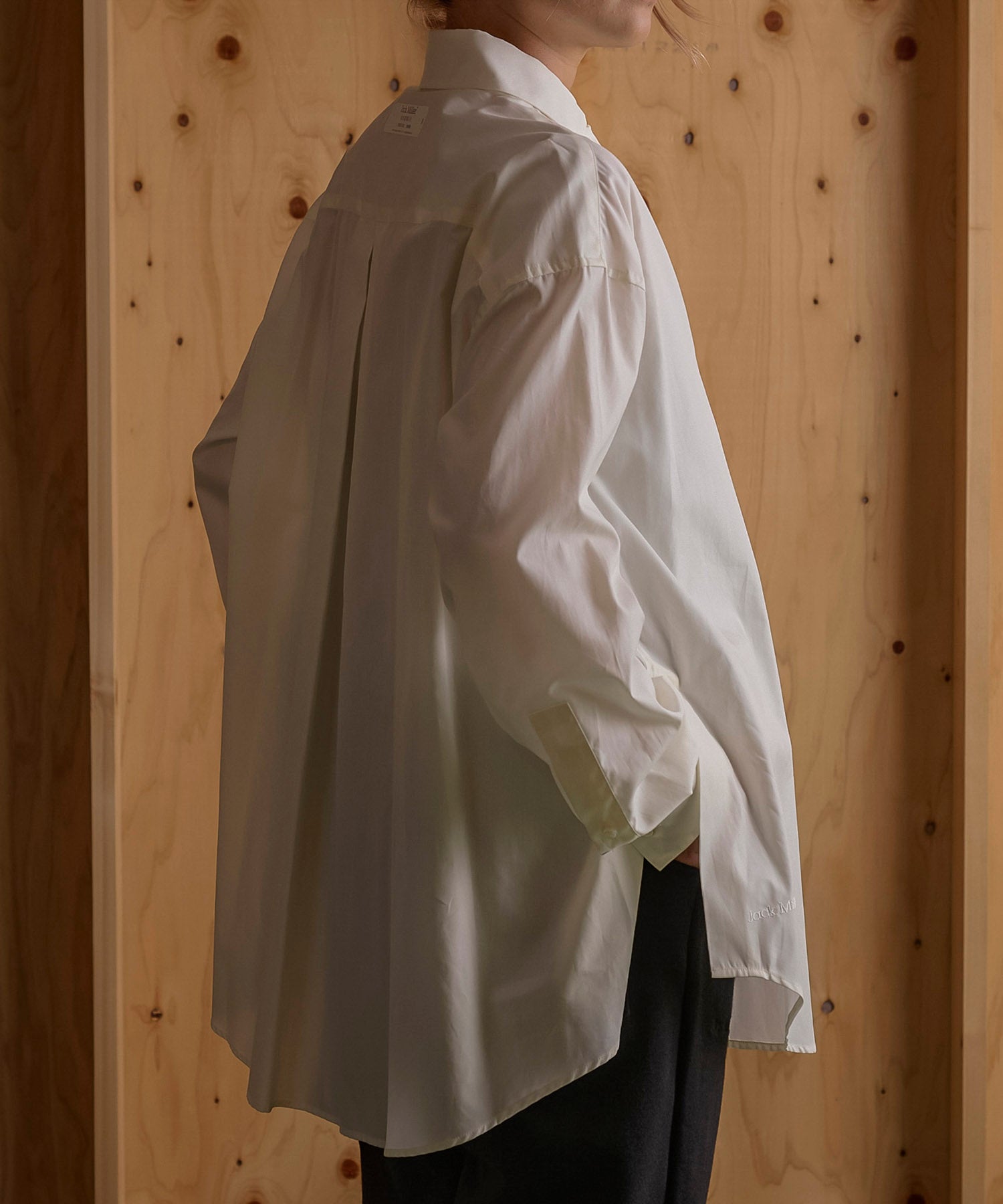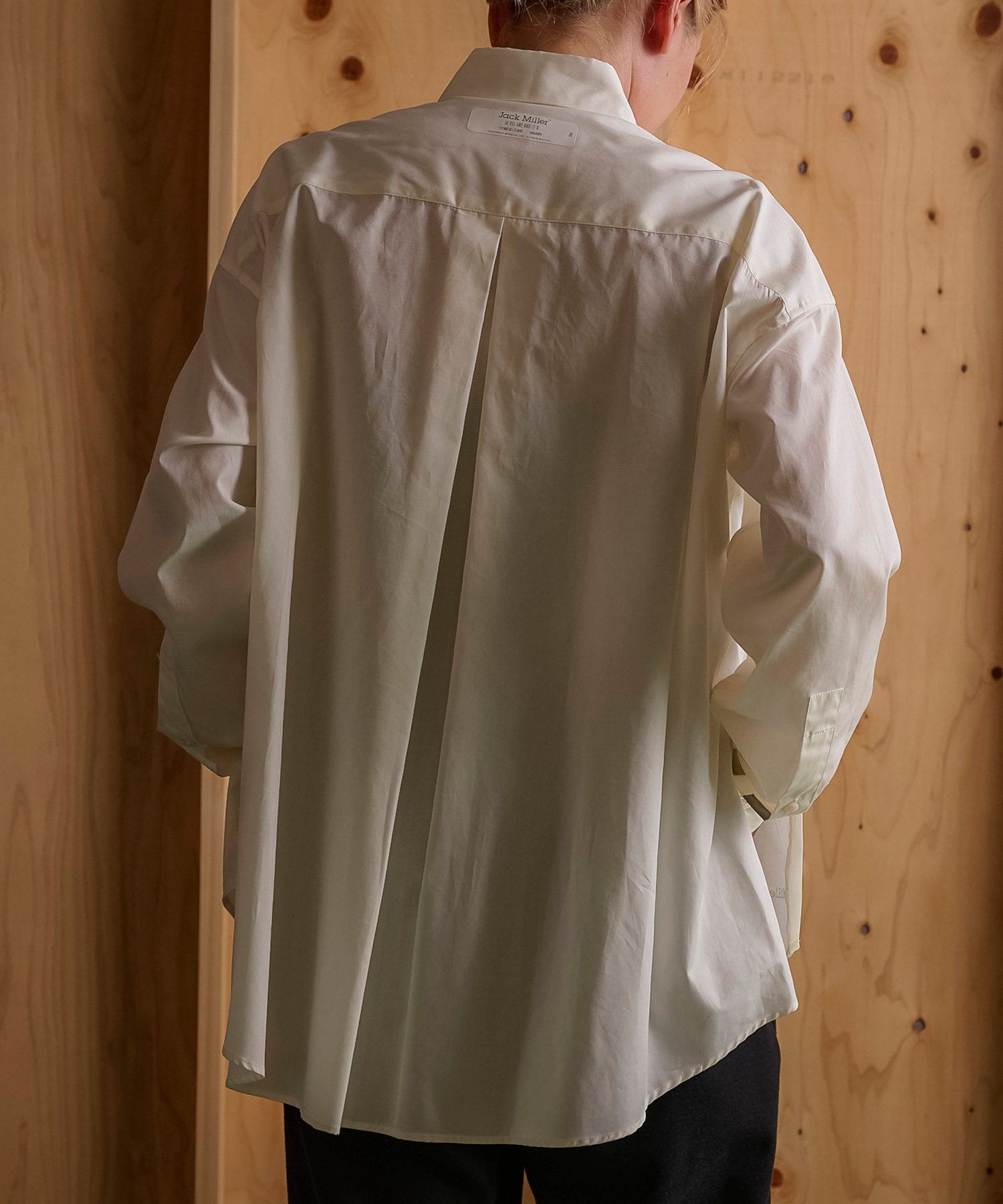 カジュアル、マニッシュになりがちな大きめシャツも、衿をミニマルにしたり、後ろにインバーテッドプリーツを入れることで上品さを演出。