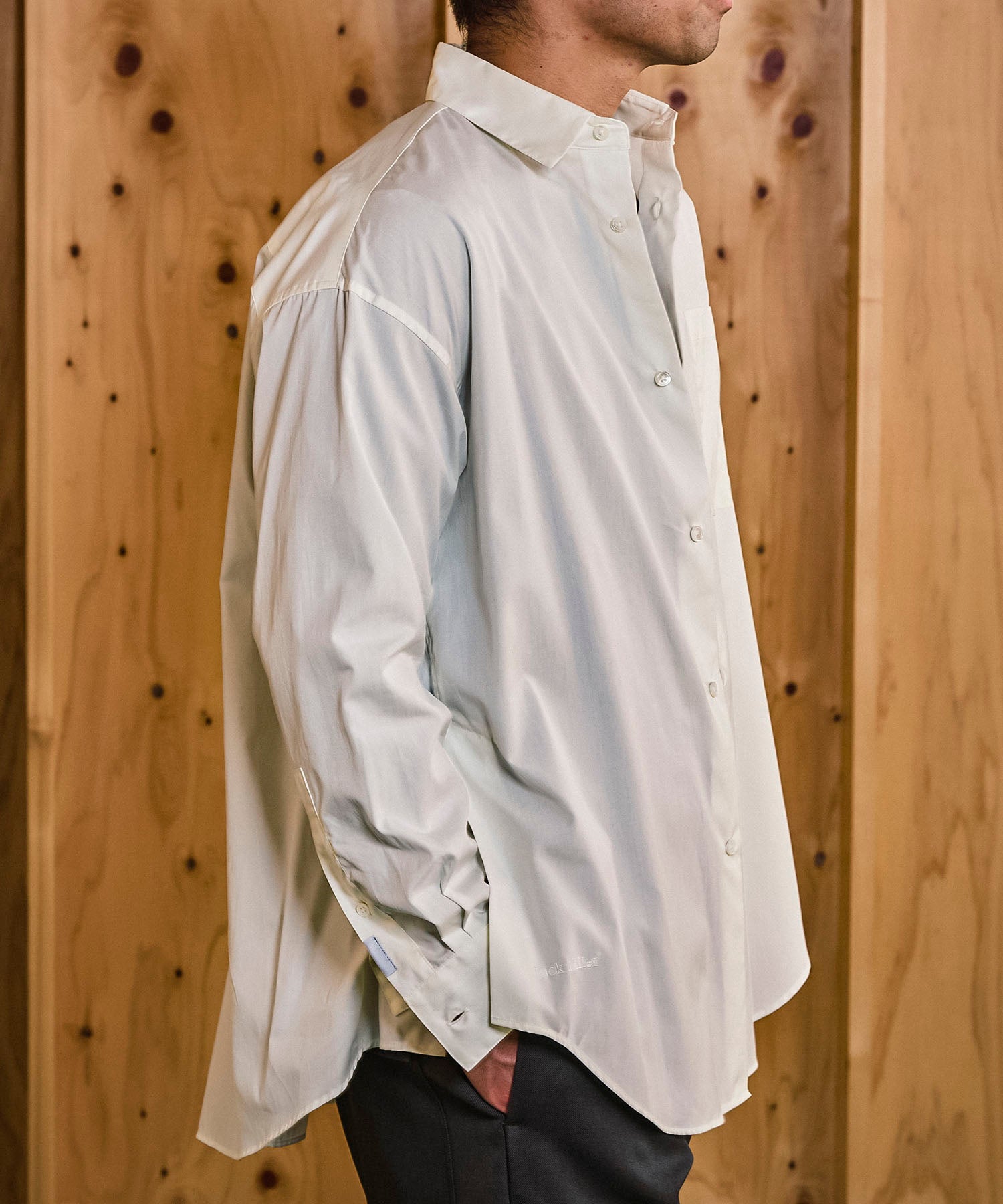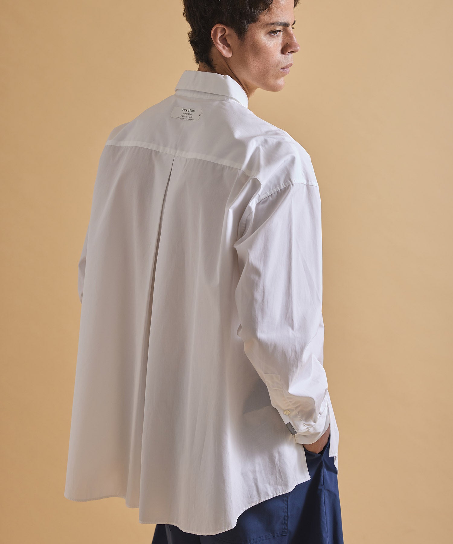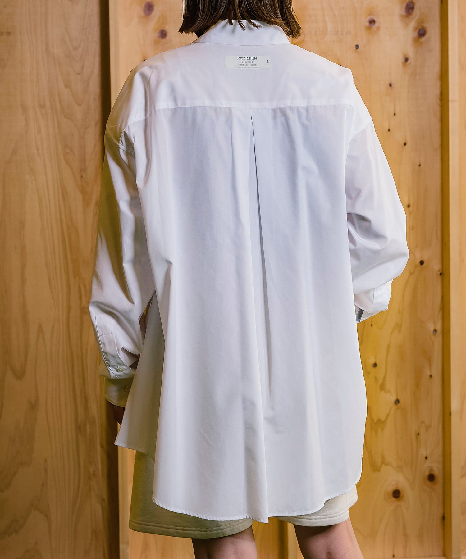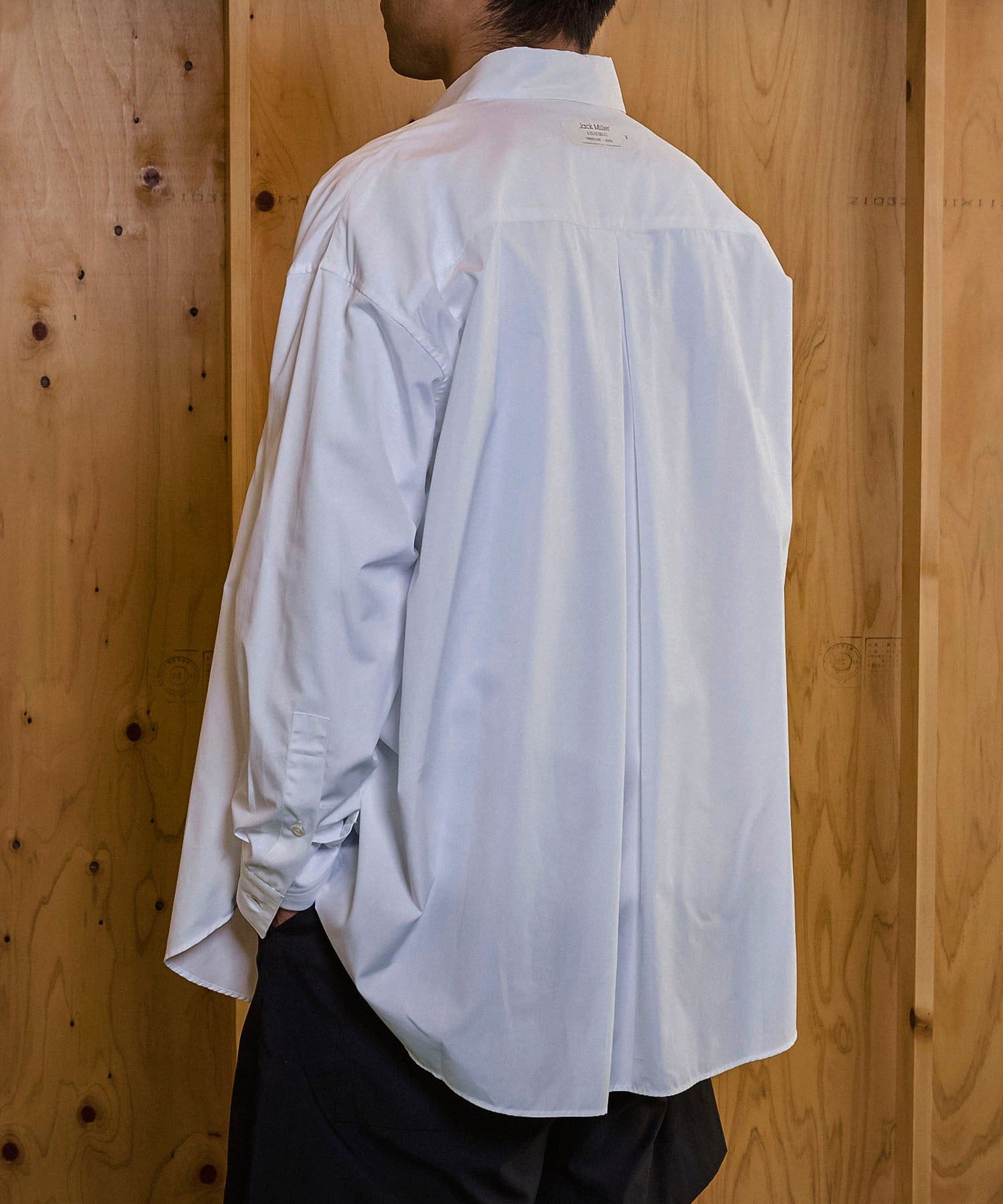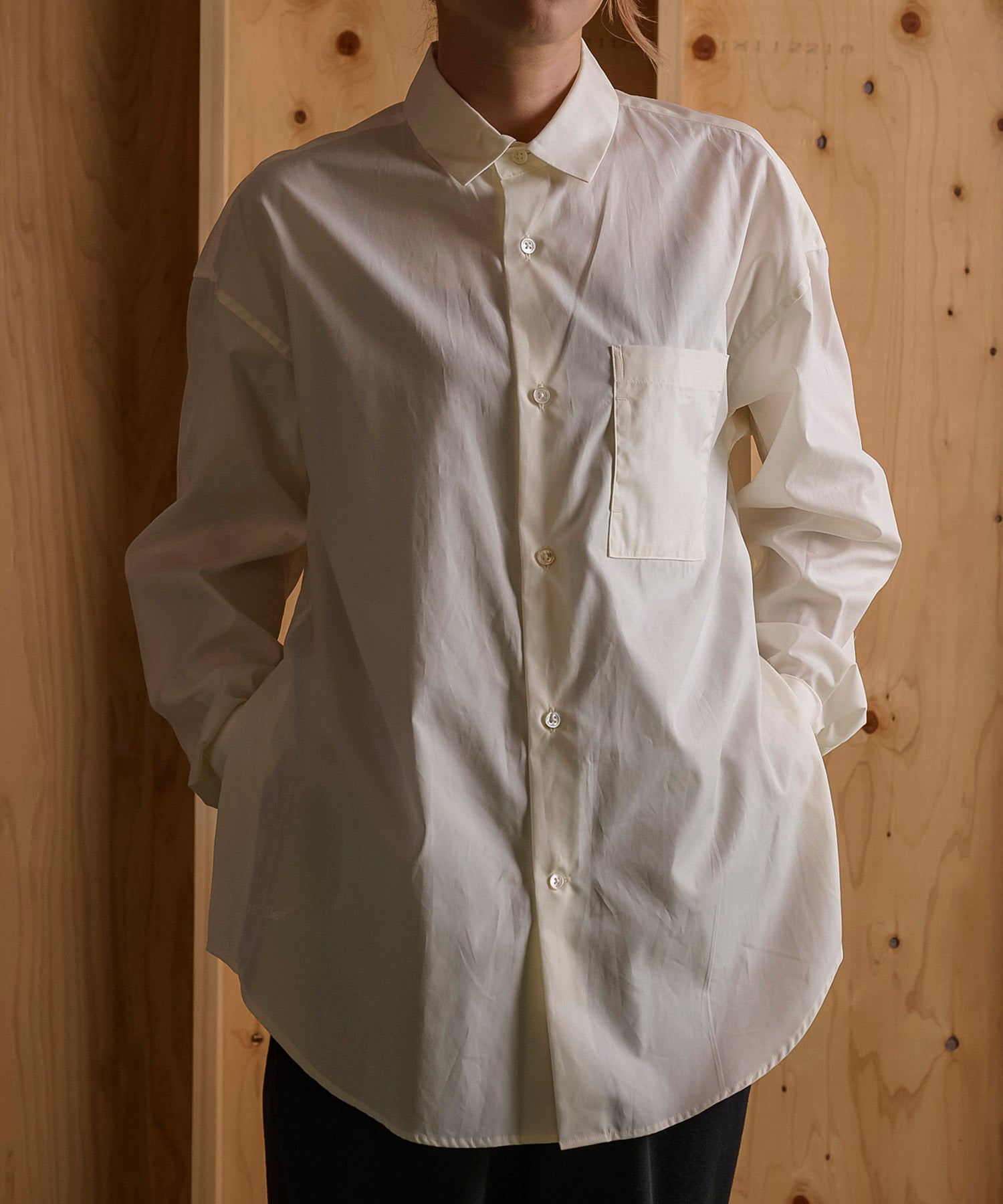 カジュアル、マニッシュになりがちな大きめシャツも、衿をミニマルにしたり、後ろにインバーテッドプリーツを入れることで上品さを演出。