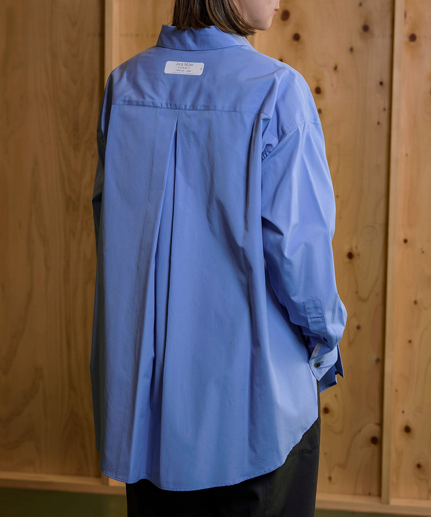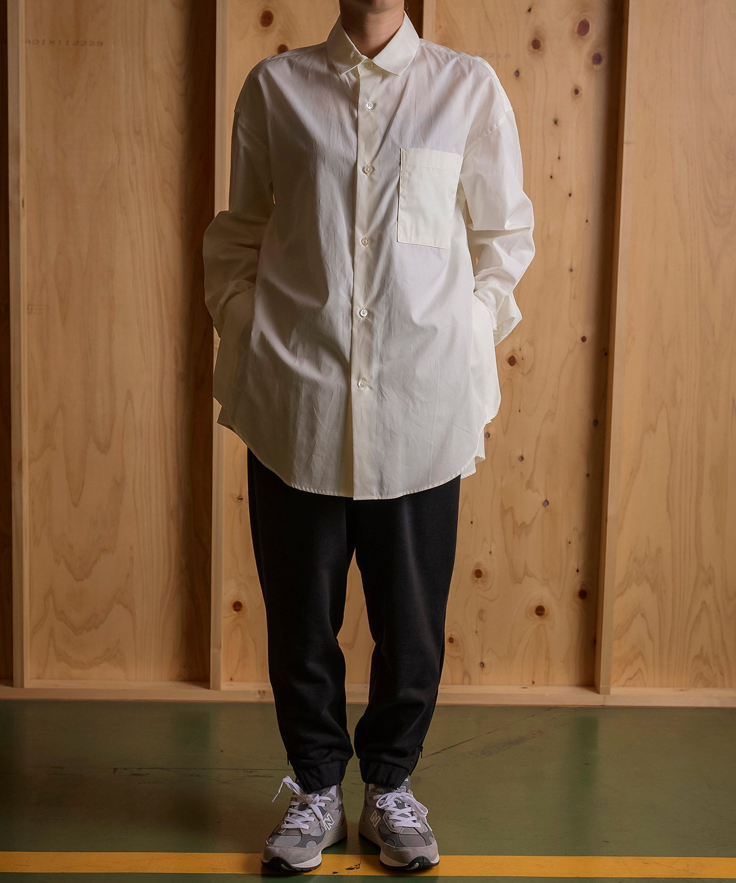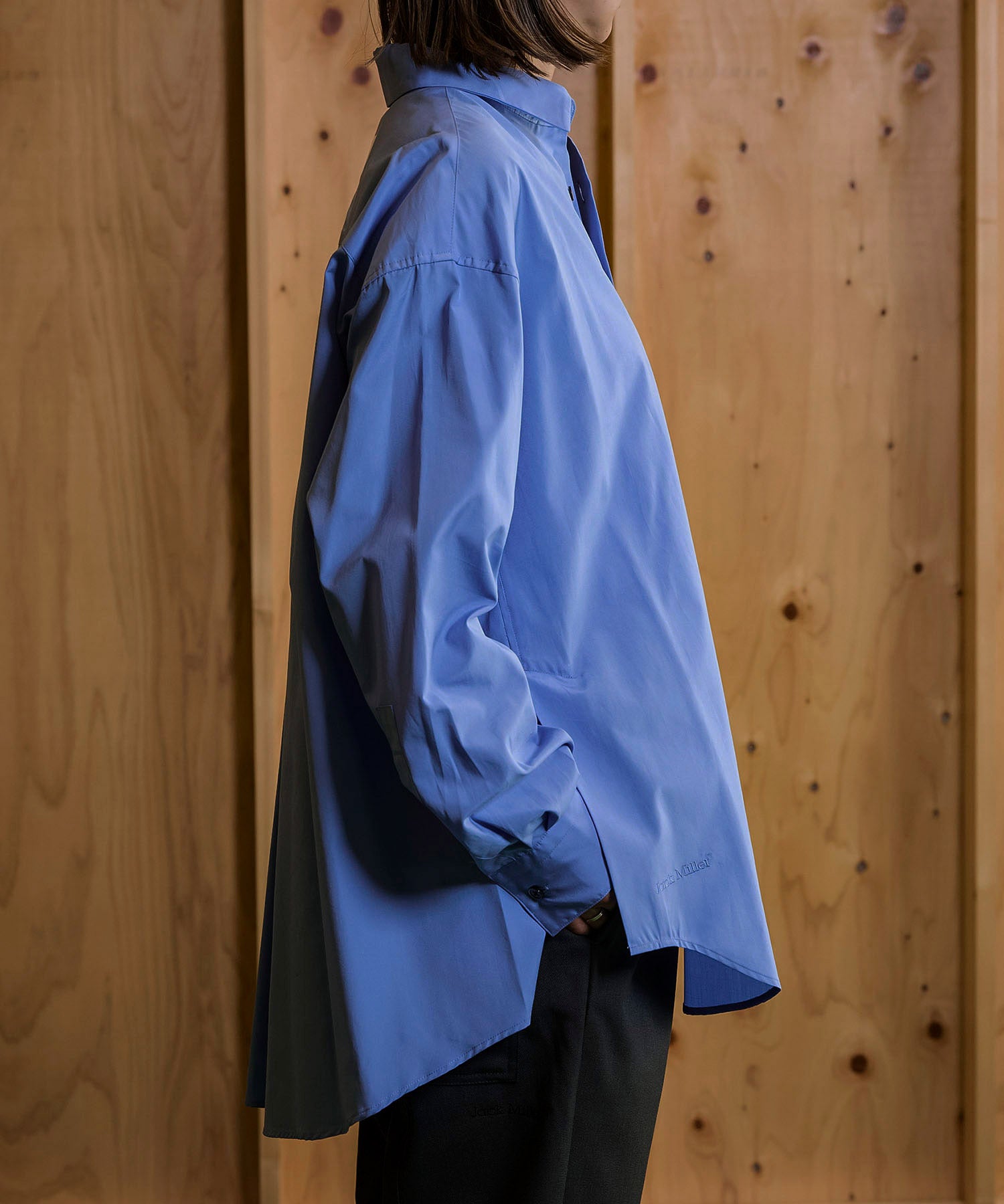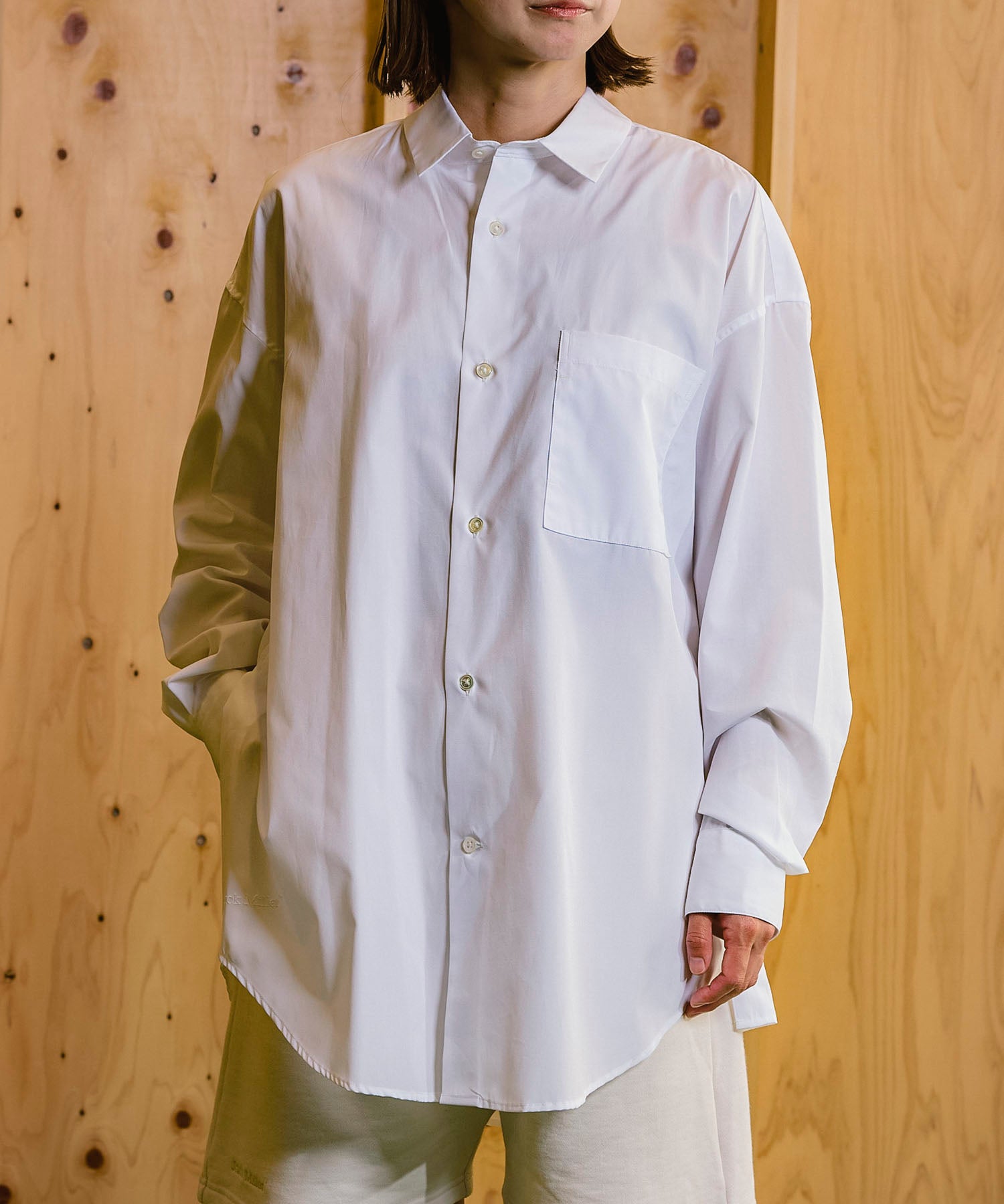 カジュアル、マニッシュになりがちな大きめシャツも、衿をミニマルにしたり、後ろにインバーテッドプリーツを入れることで上品さを演出。