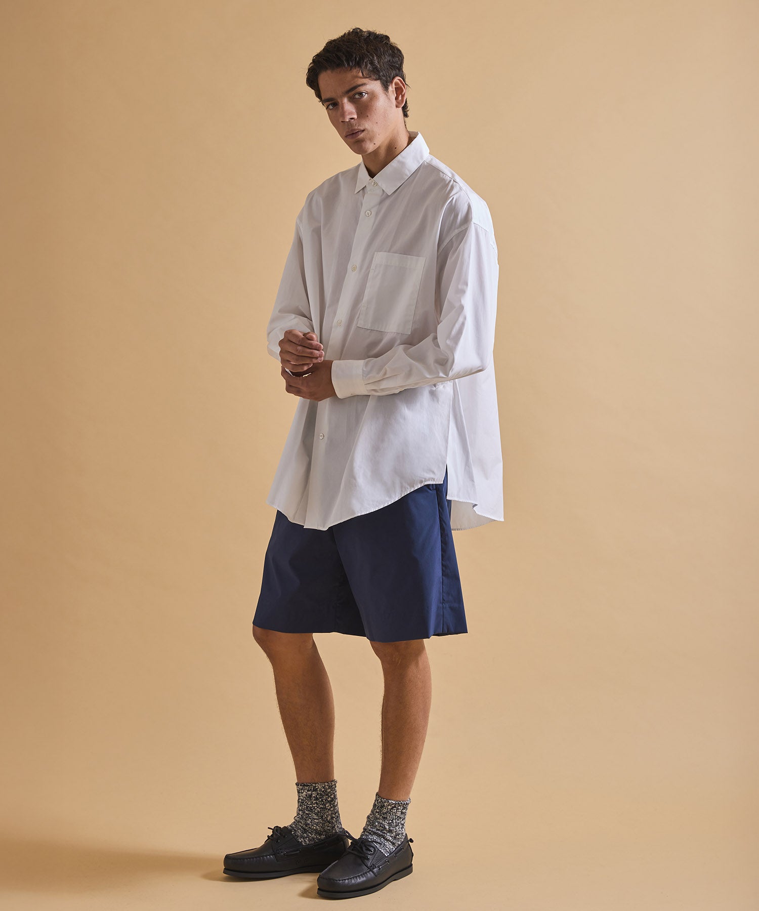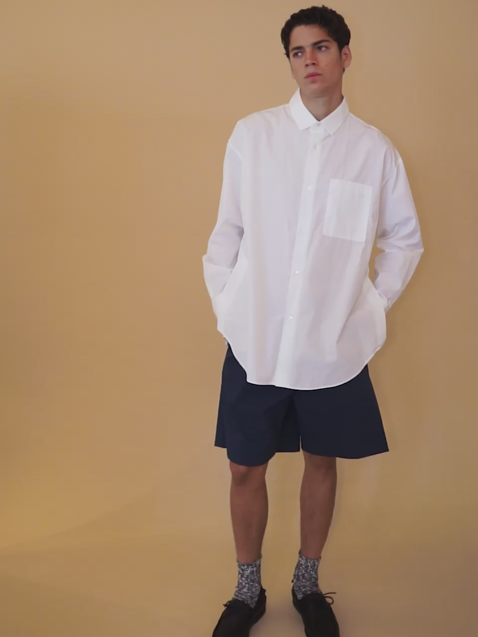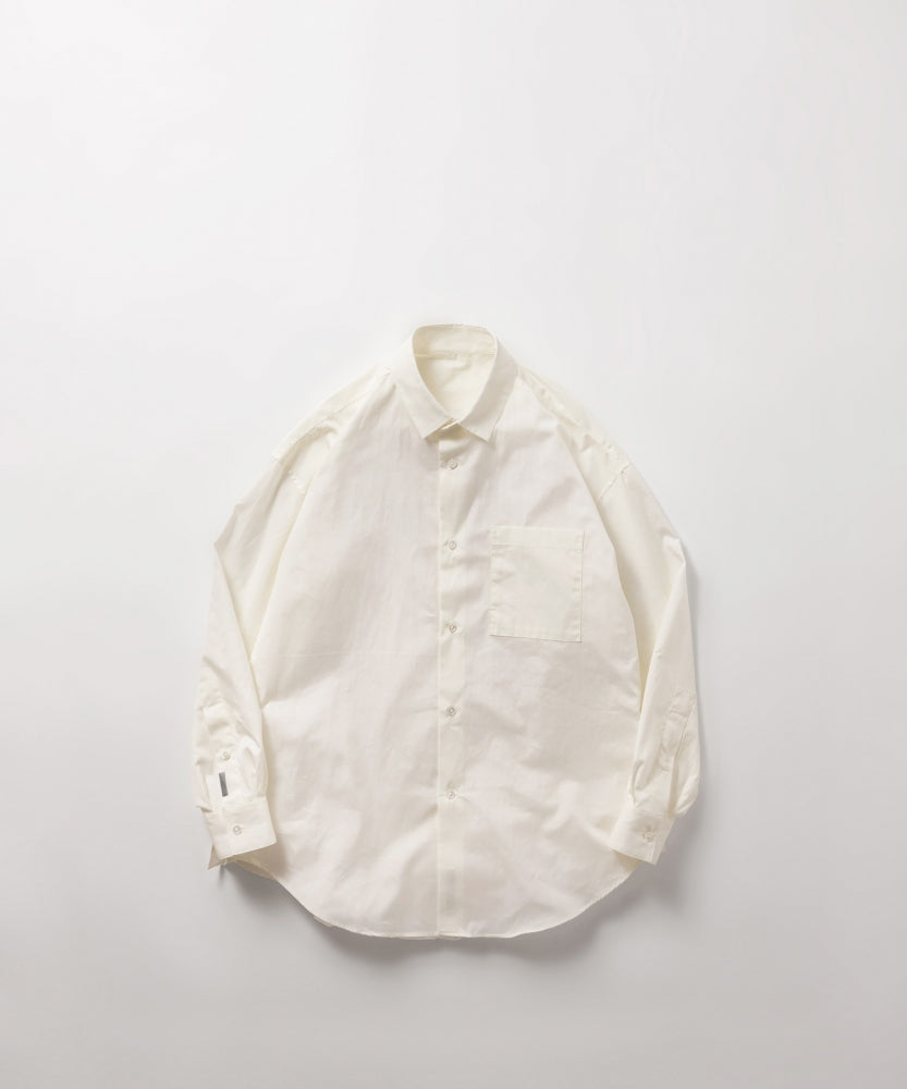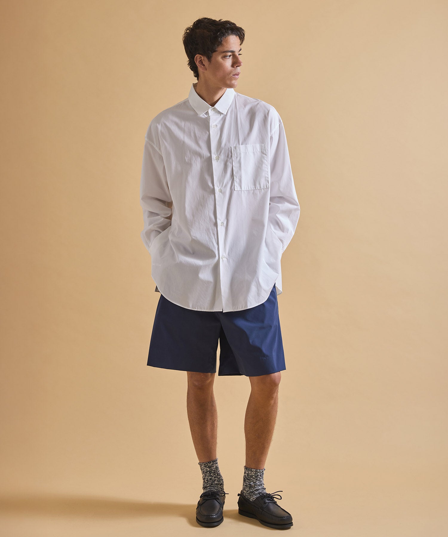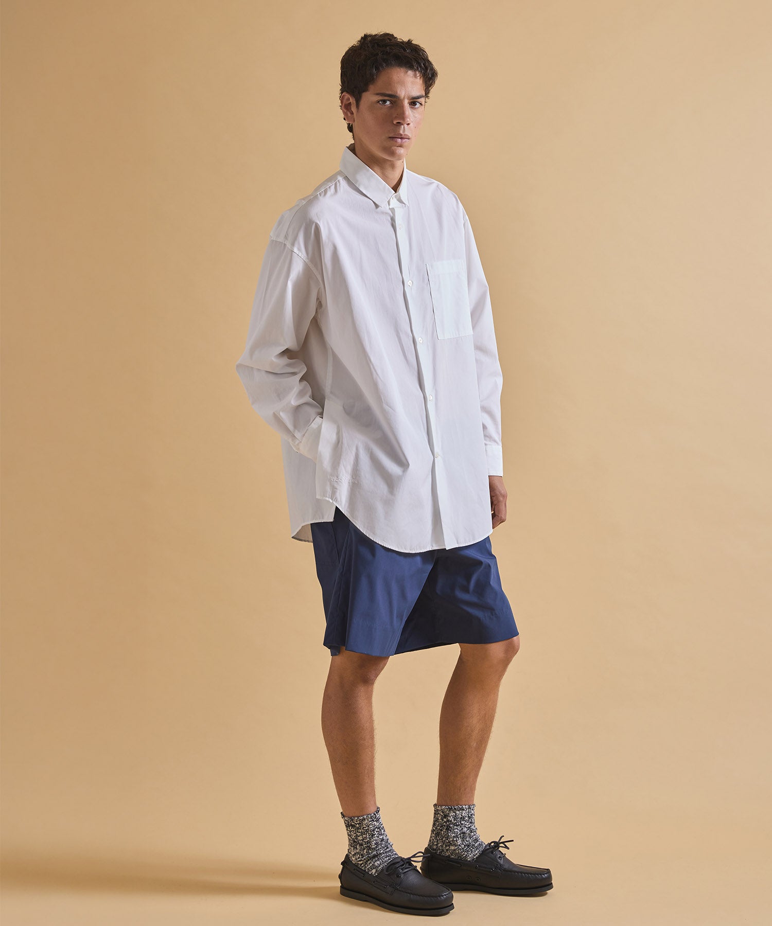 カジュアル、マニッシュになりがちな大きめシャツも、衿をミニマルにしたり、後ろにインバーテッドプリーツを入れることで上品さを演出。
