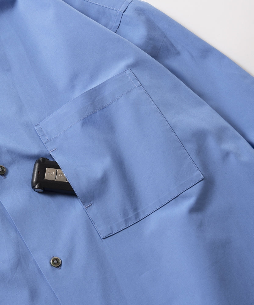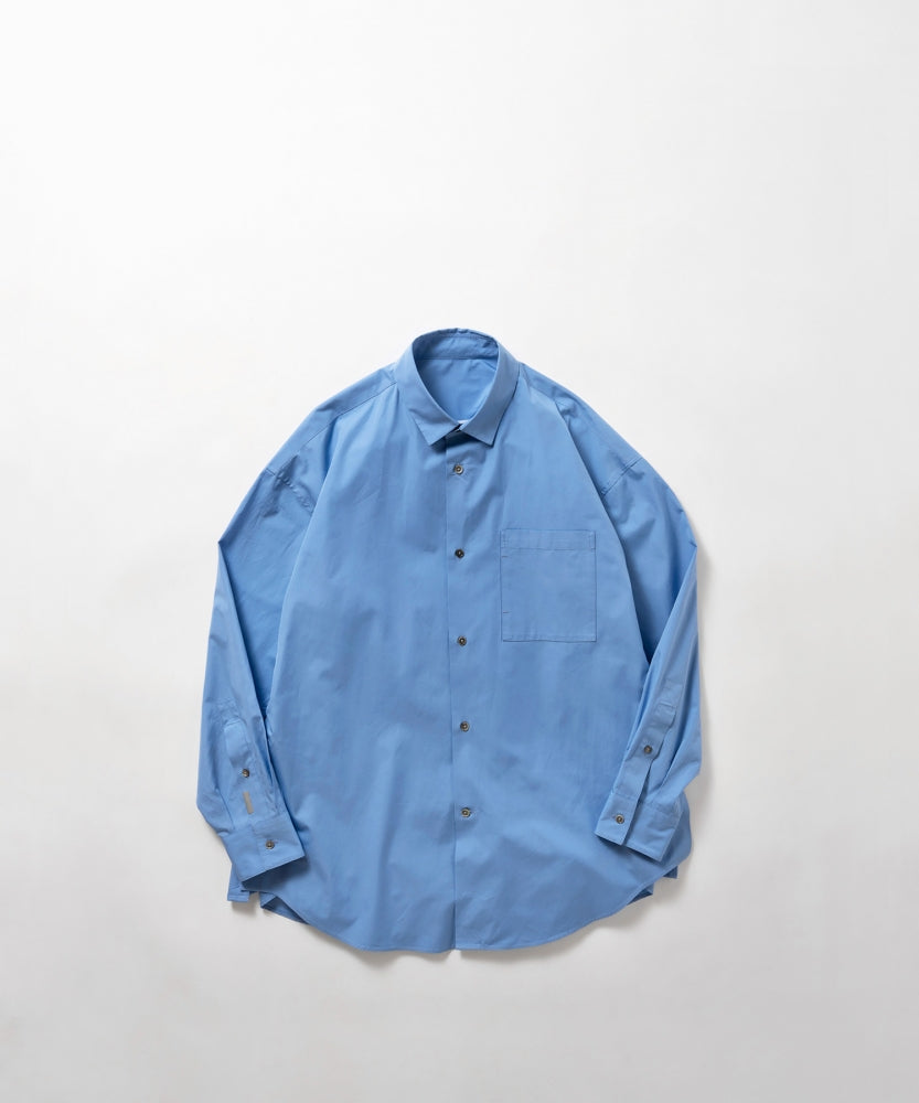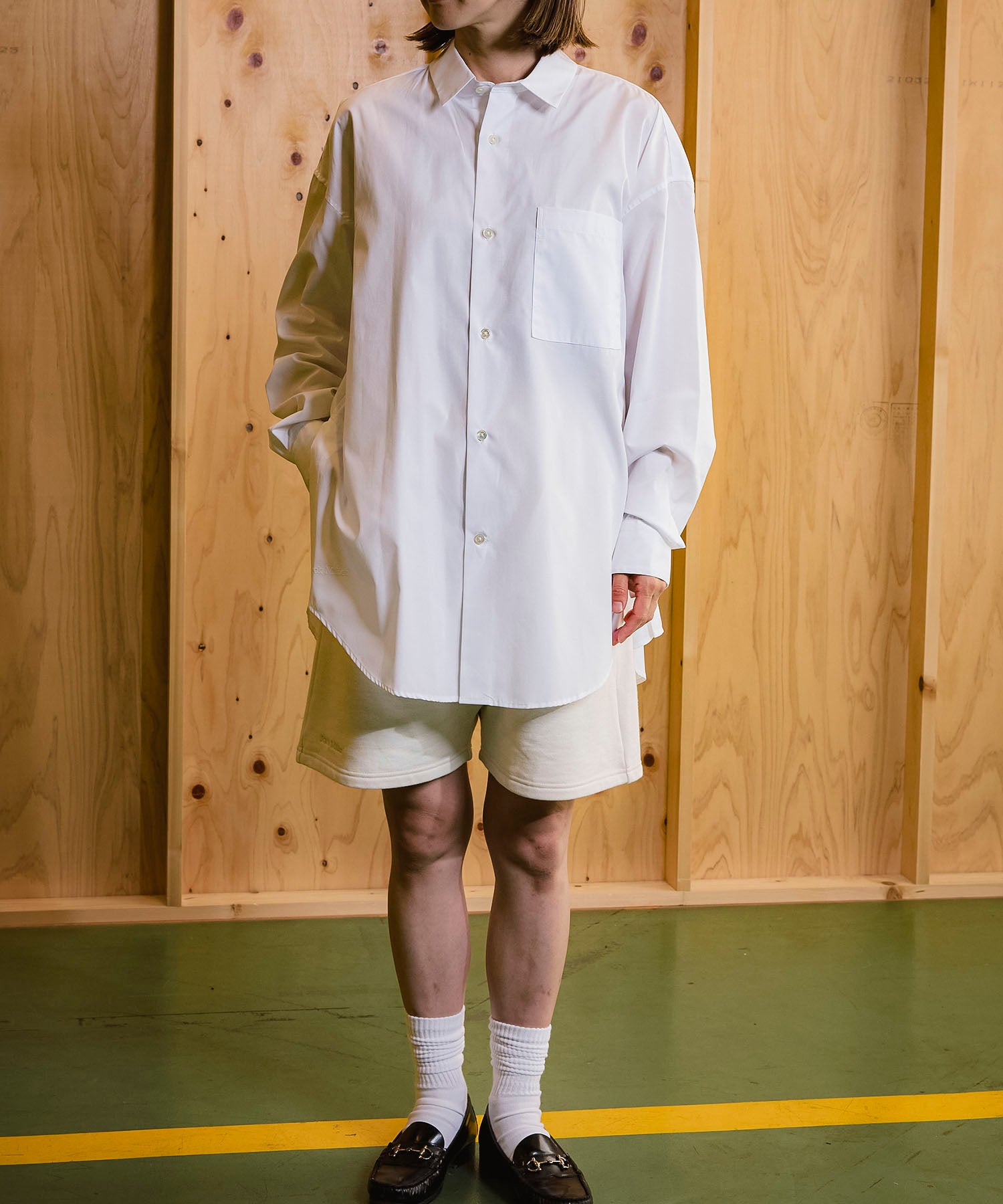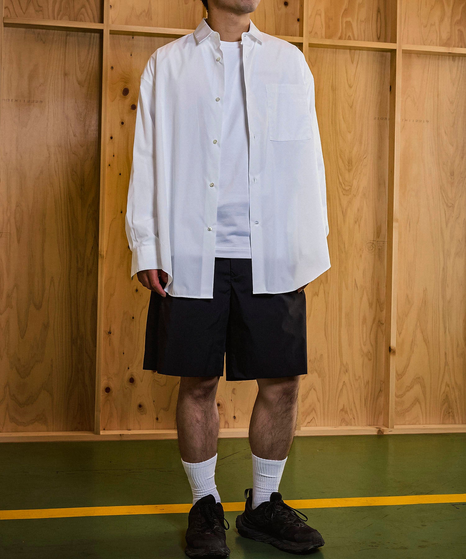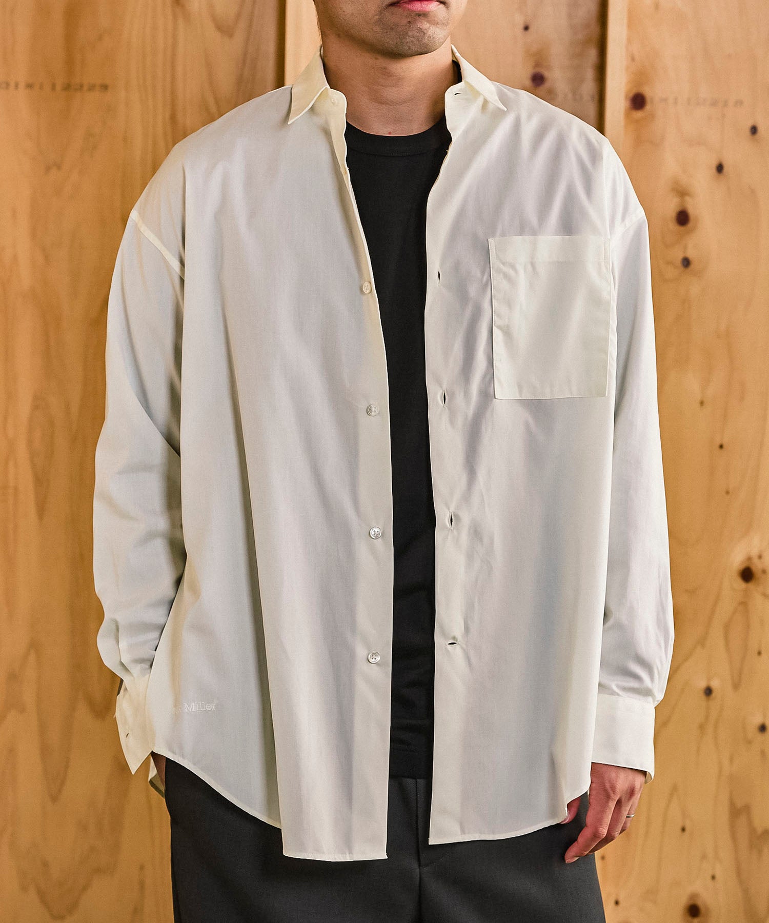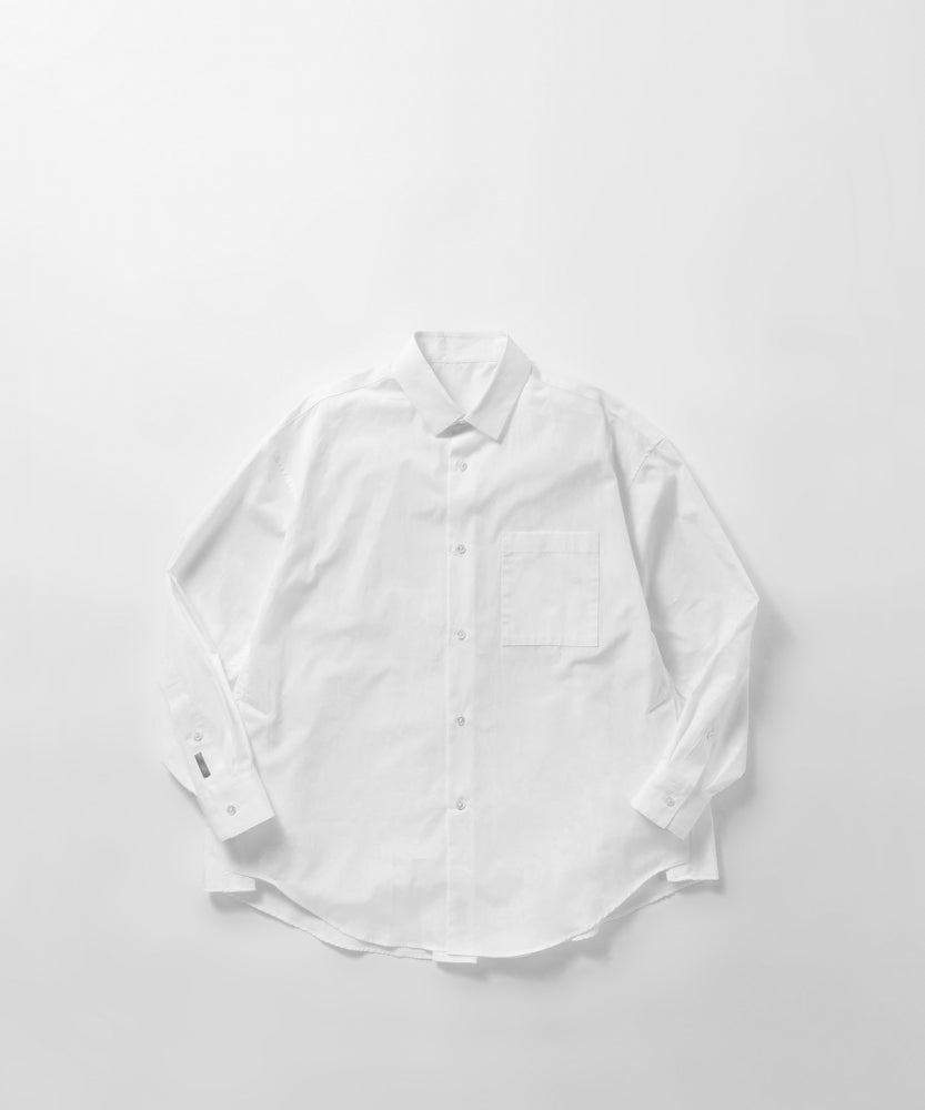 カジュアル、マニッシュになりがちな大きめシャツも、衿をミニマルにしたり、後ろにインバーテッドプリーツを入れることで上品さを演出。