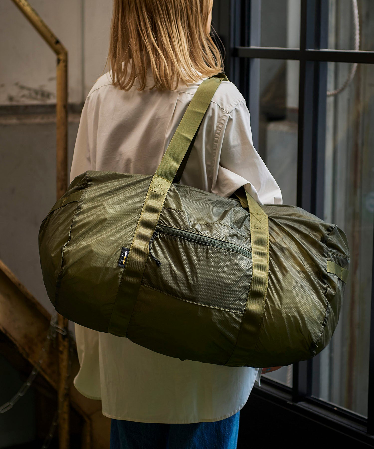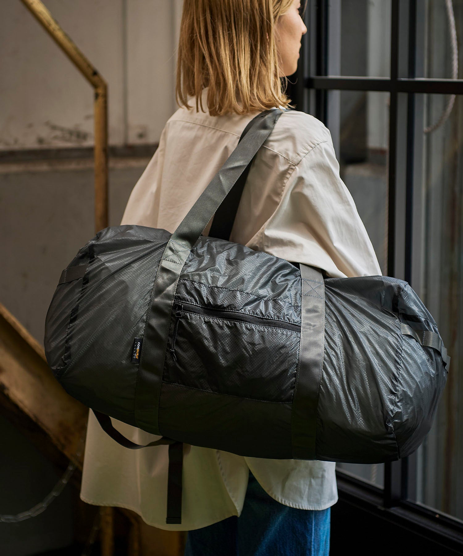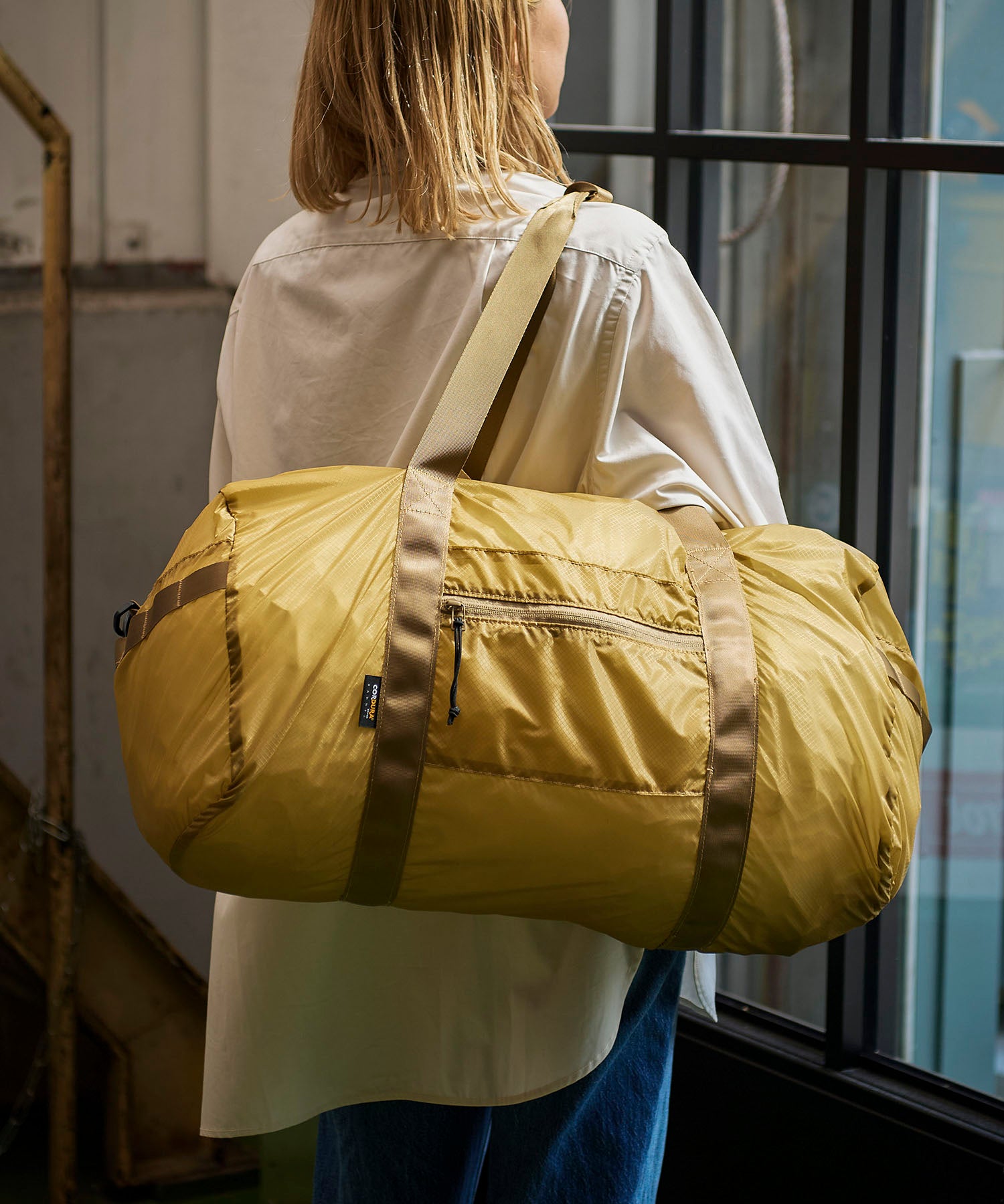 軽量で高強度の生地を生かしコンパクトにパッカブル出来るダッフルバッグです。(内ポケットをひっくり返し本体を中に入れる事でパッカブルできます。)