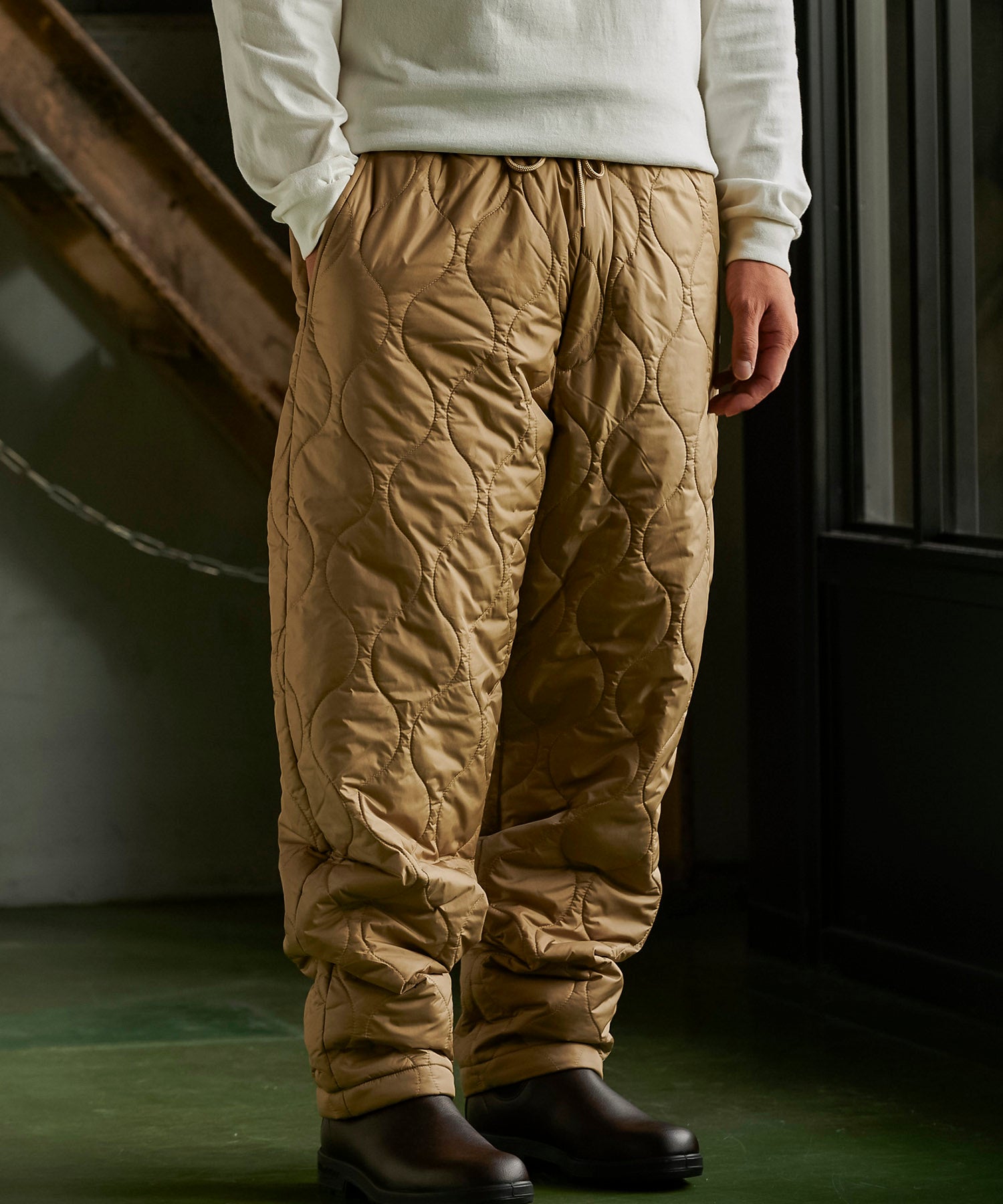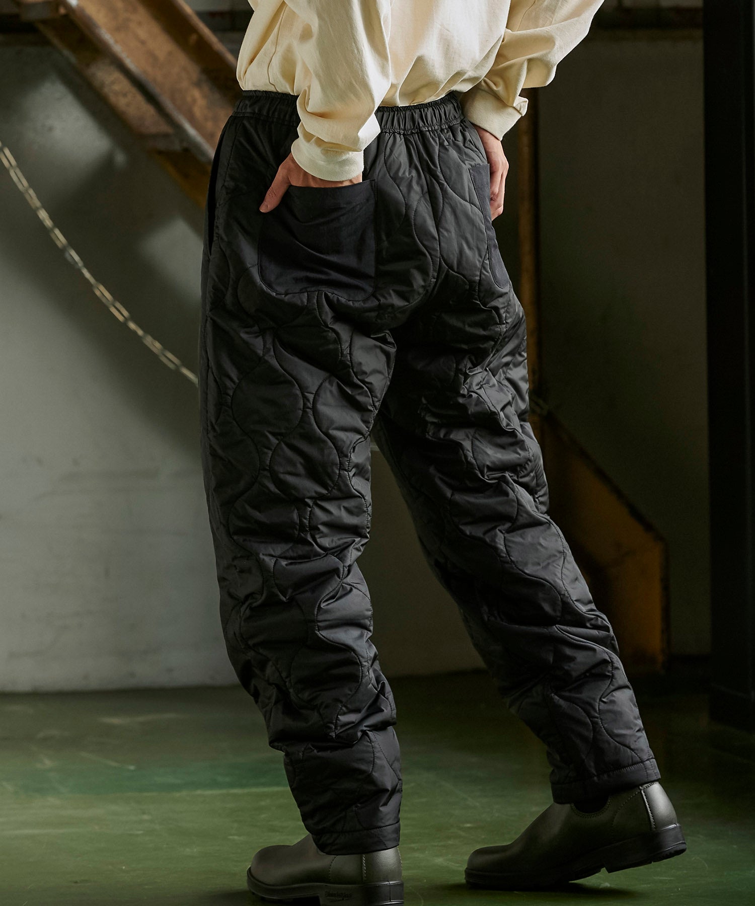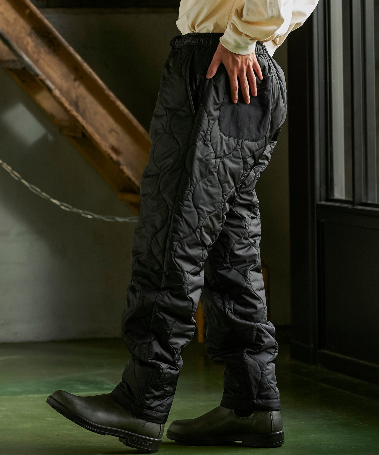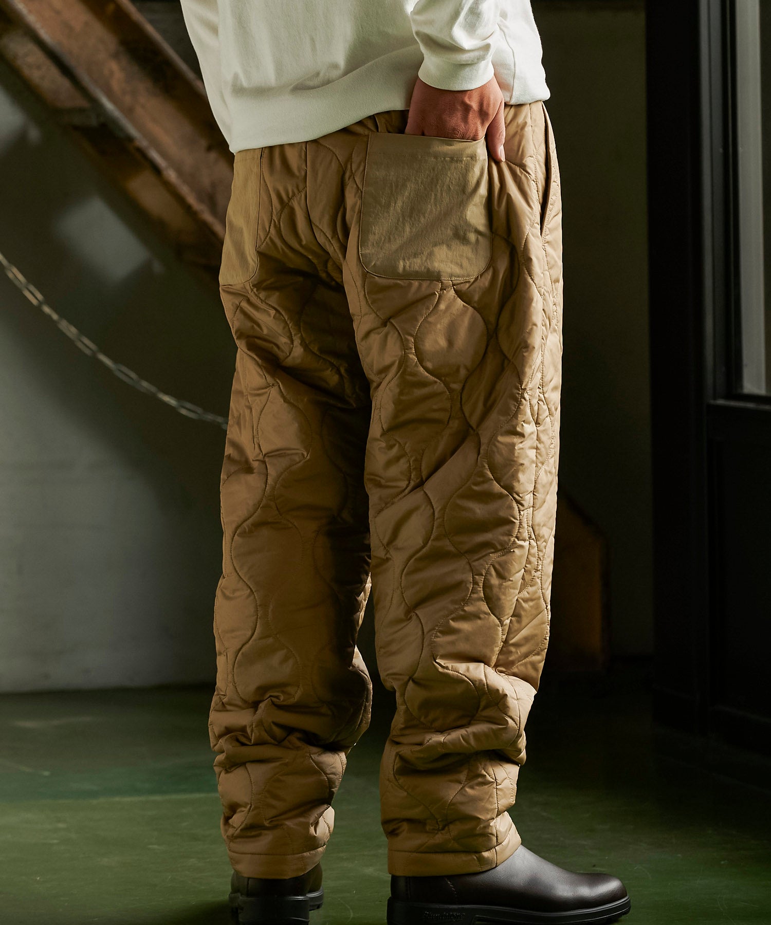 ミリタリーライナーパンツをイメージソースとし作成した中綿キルティングパンツ。