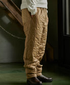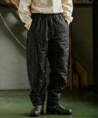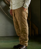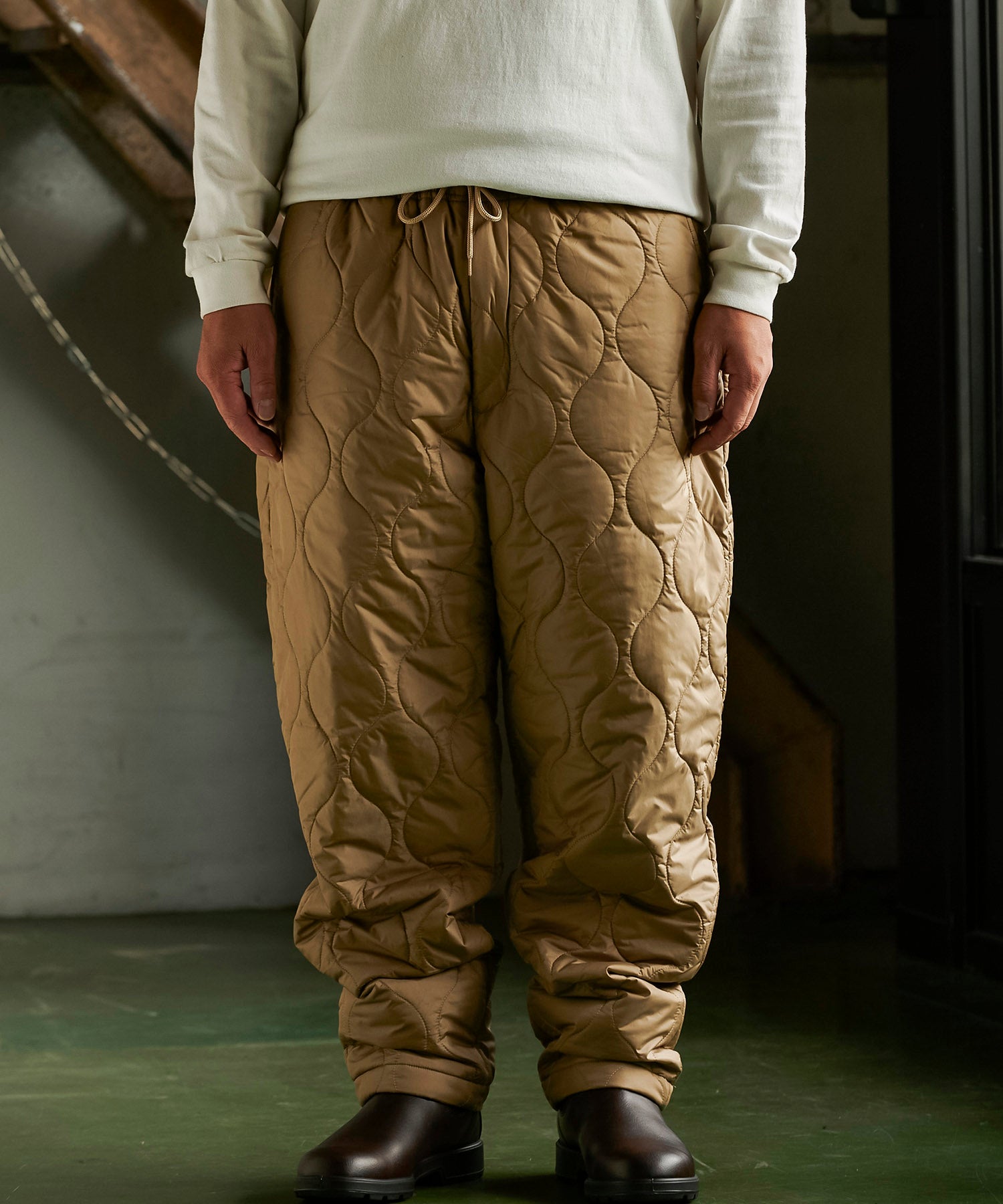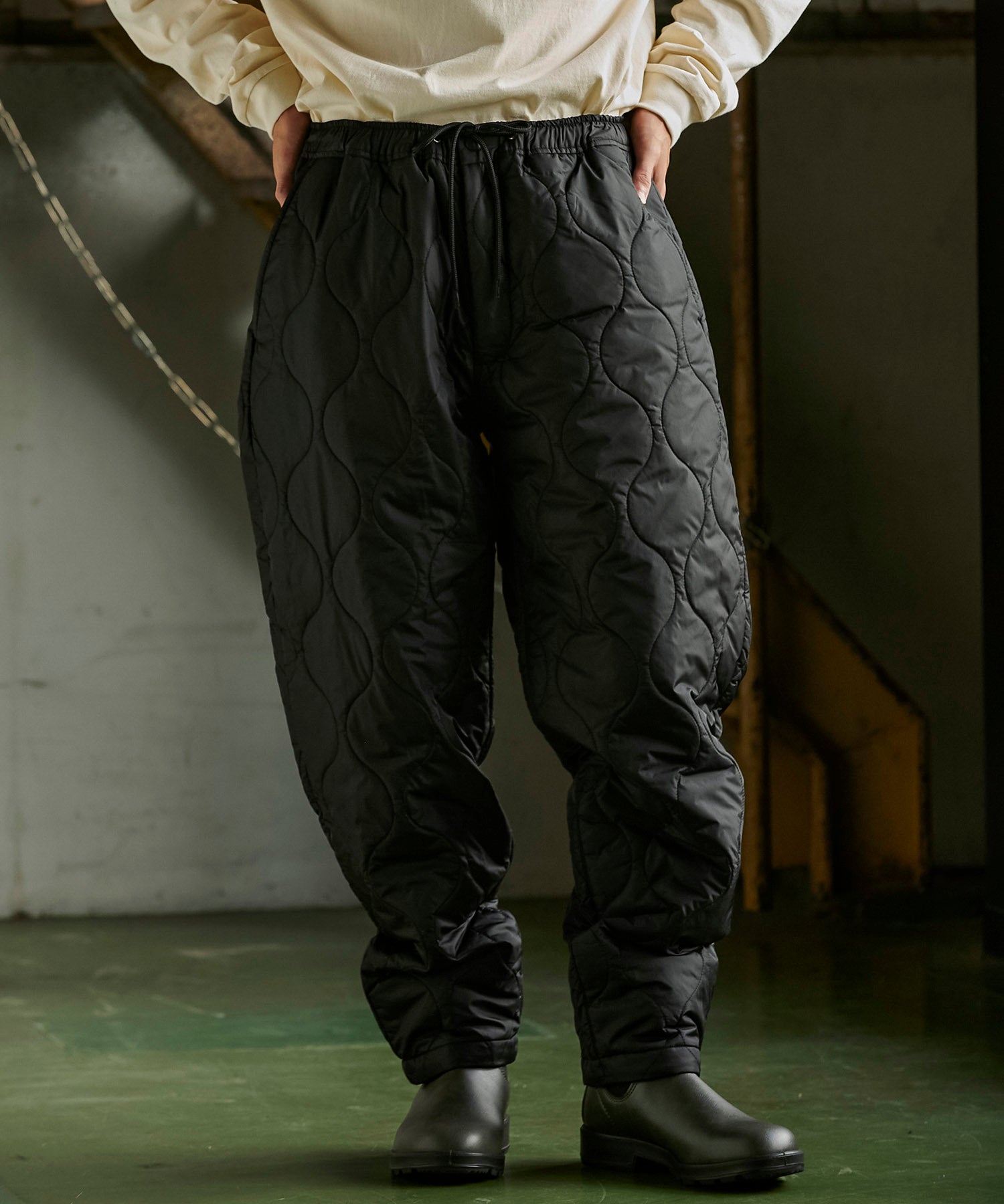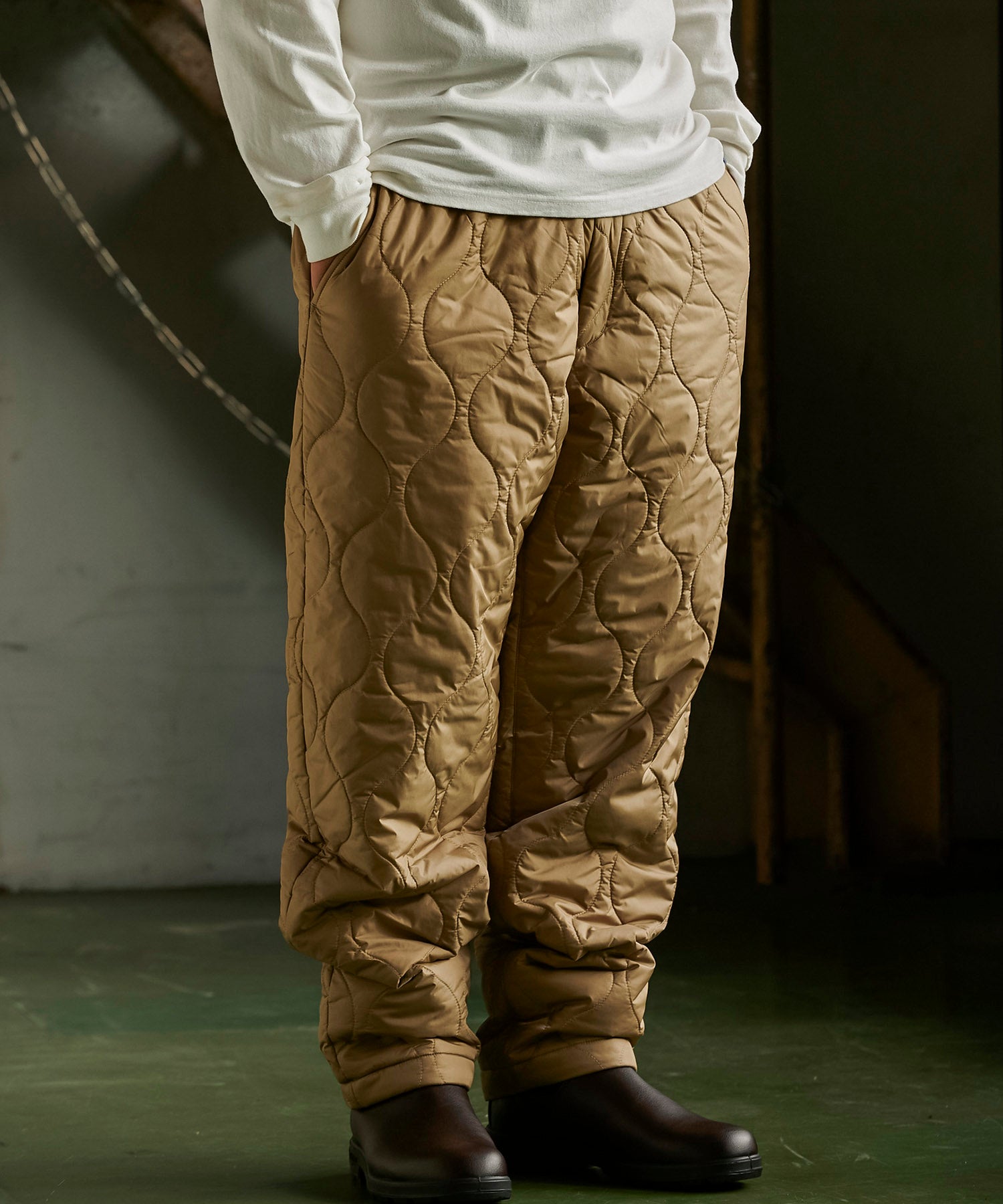 ミリタリーライナーパンツをイメージソースとし作成した中綿キルティングパンツ。