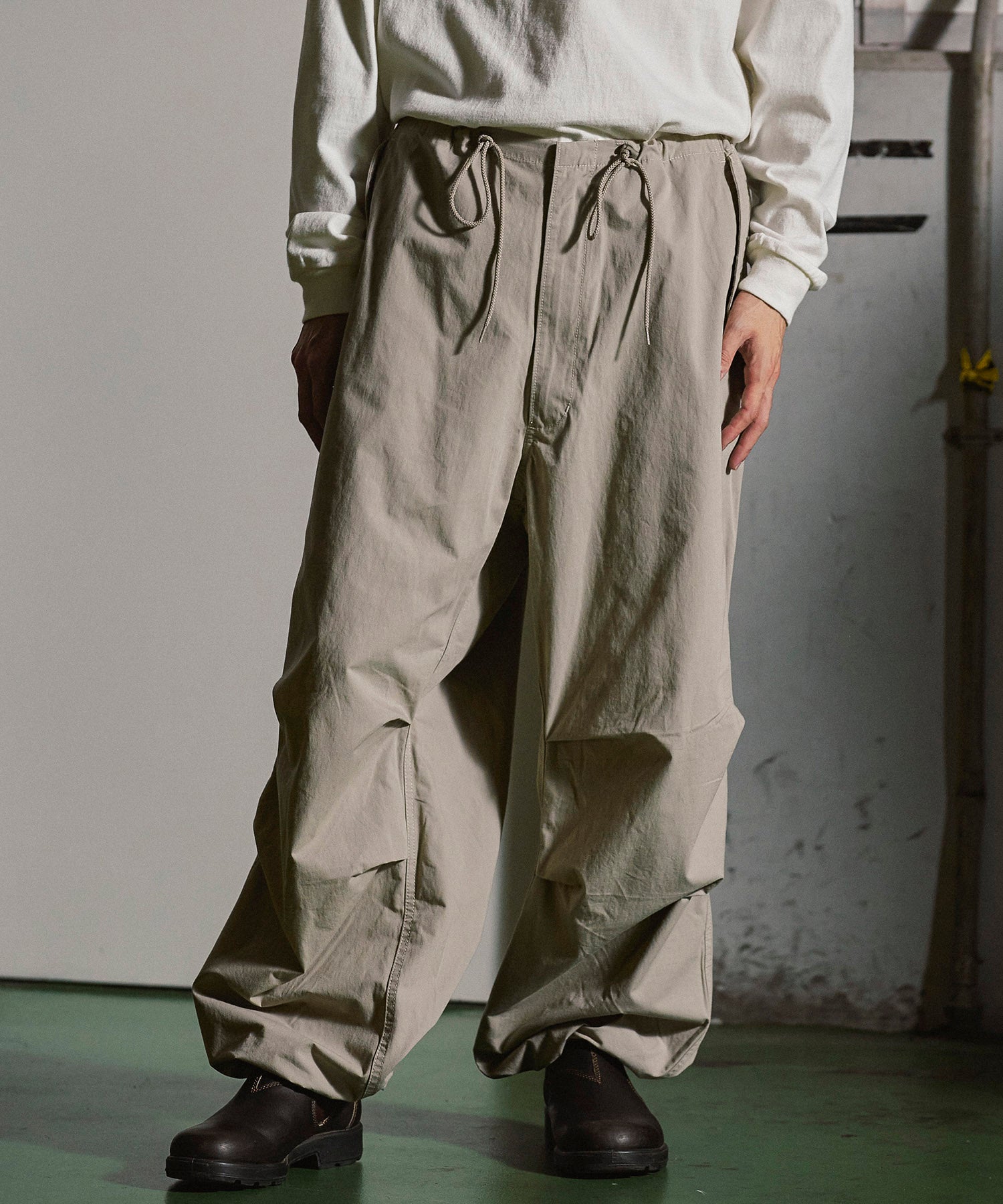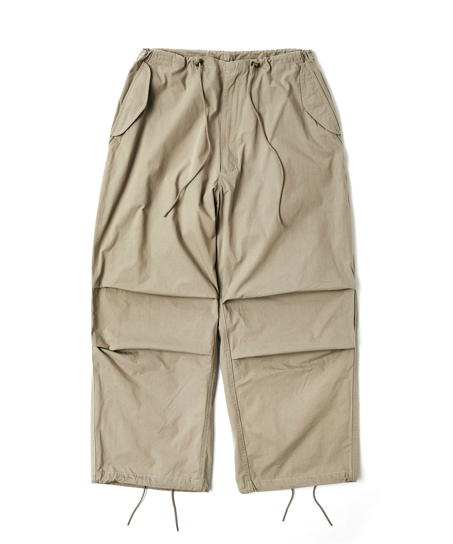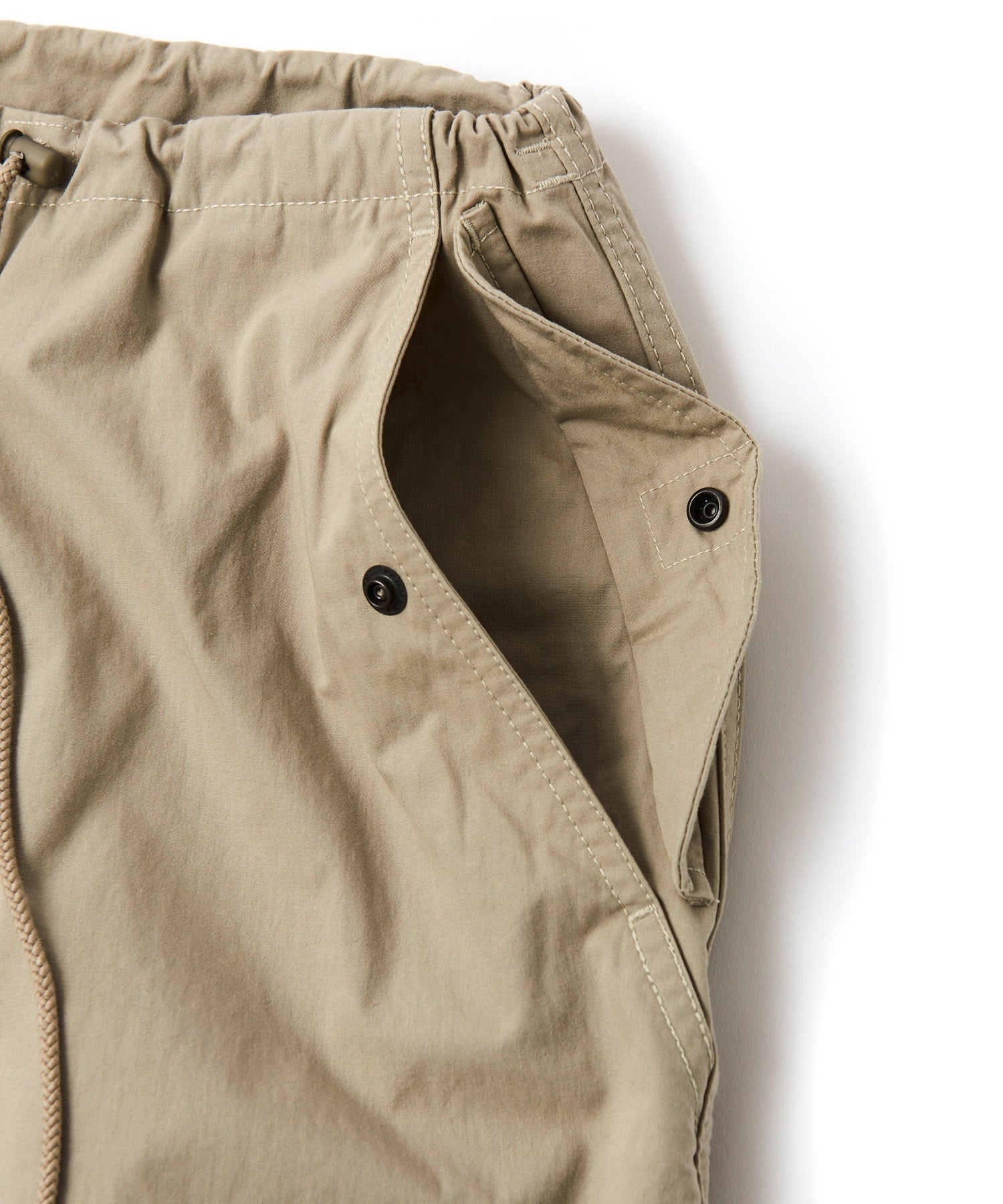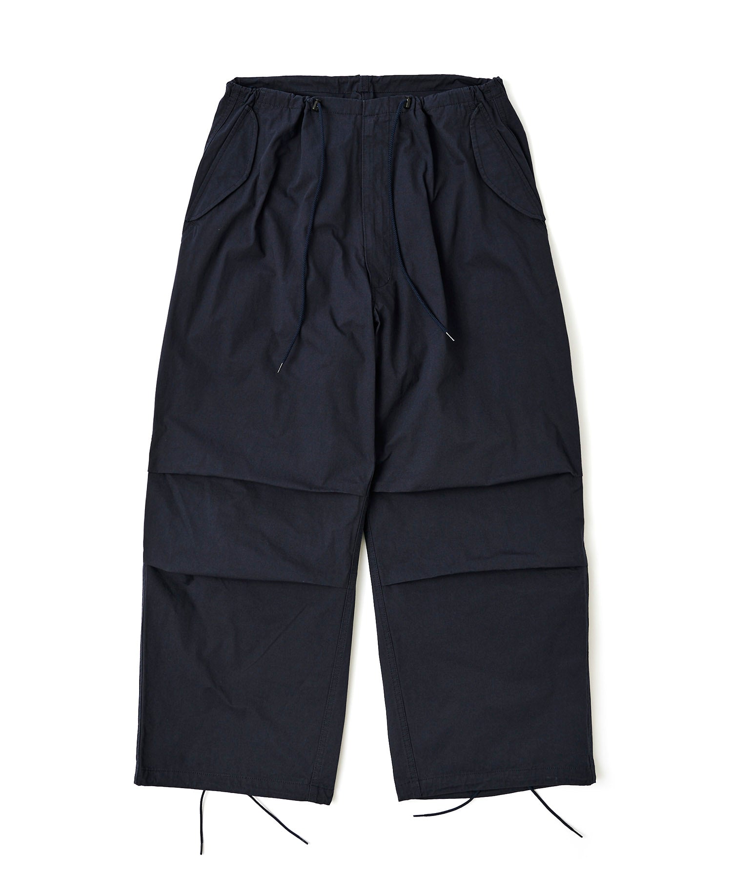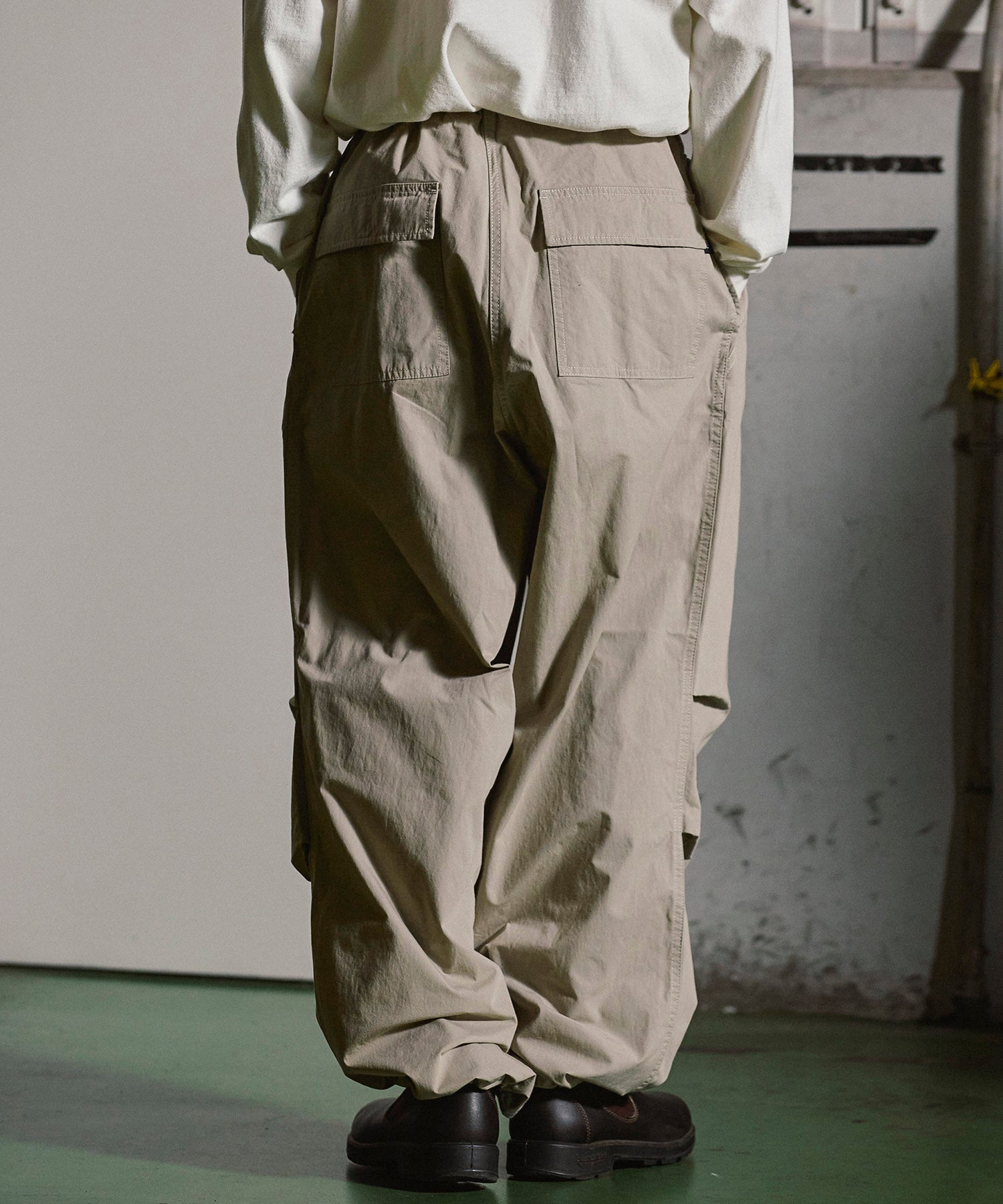 アメリカ軍が降雪地帯での戦闘用として採用していた「US Army Snow Camo Pants」をベースにしたワイドパンツ。オーバーパンツではなくあくまで1枚で着用する事を前提としシルエットをオリジナルよりやや細身にアレンジ。前ポケットも袋布をつけ実用性を持たせています。また、本来サスペンダーを取り付けるためのベルト裏のコードは両脇に1点止めとし、キーホルダーやウォレットチェーンを取り付けたい時に外側に出す事で装着可能となります。