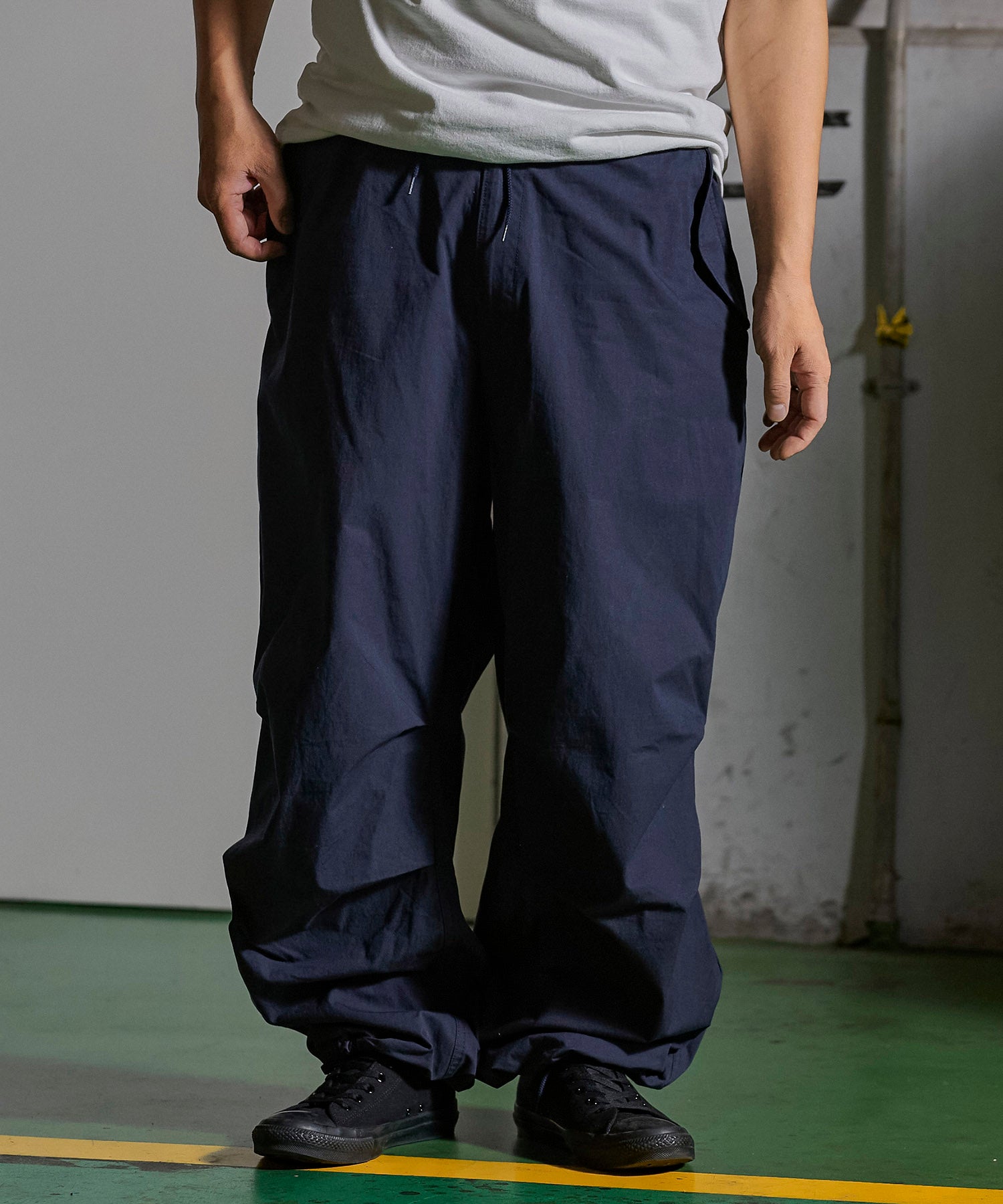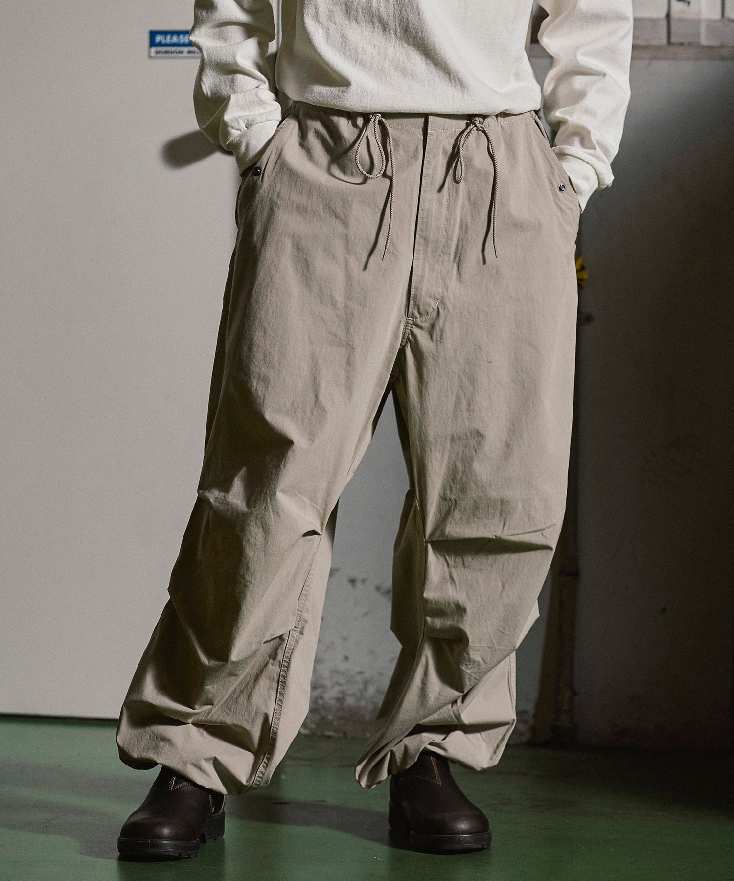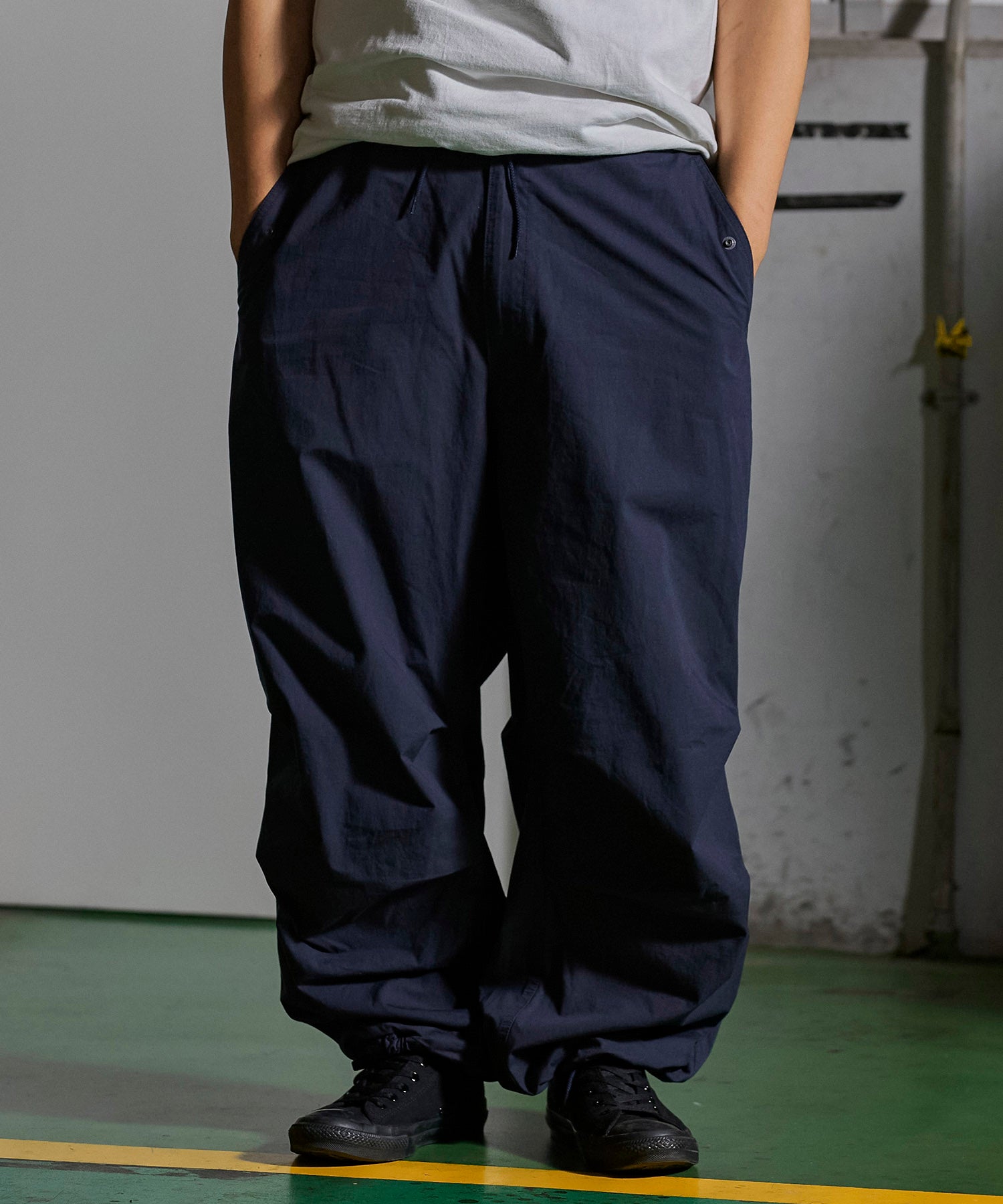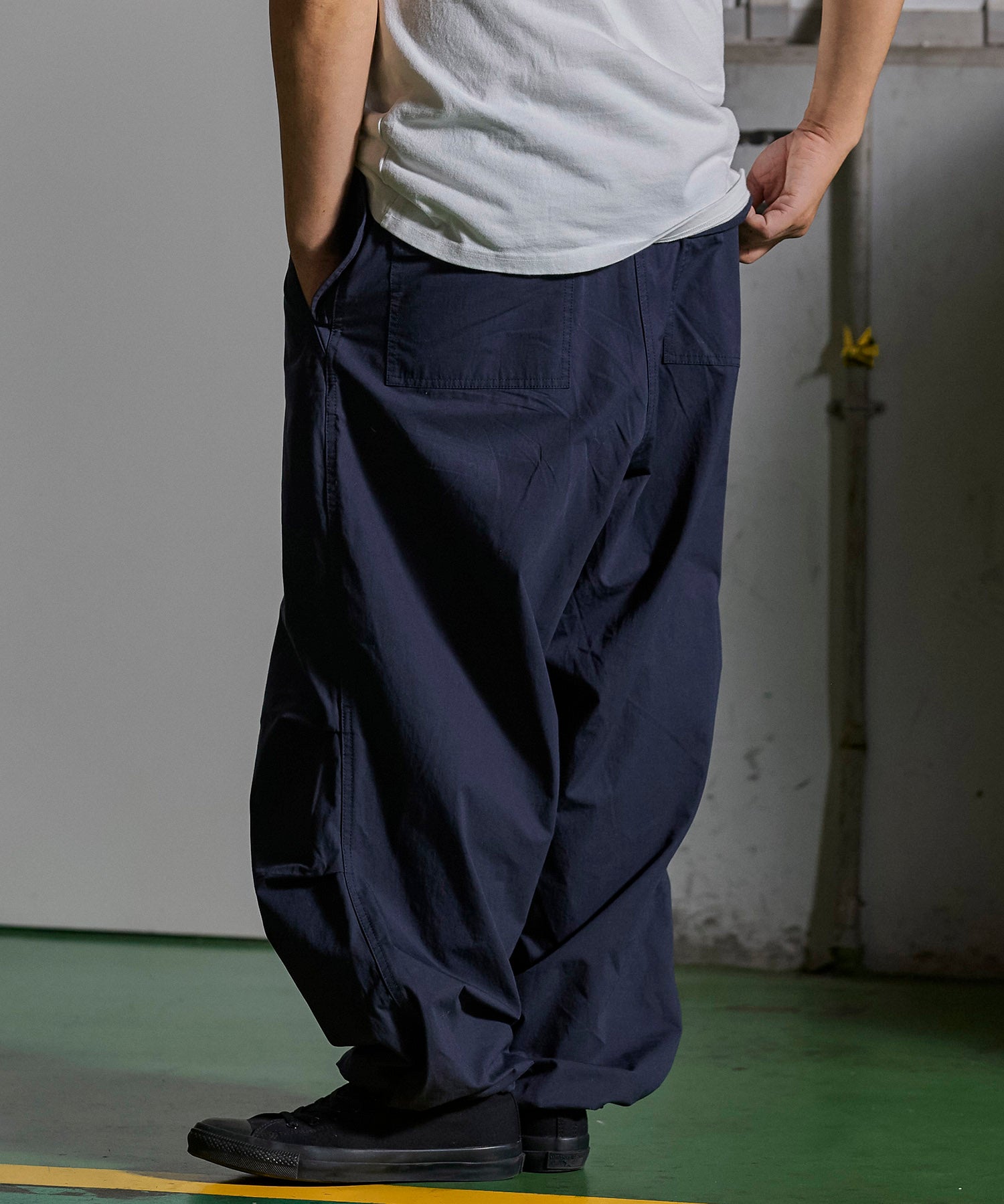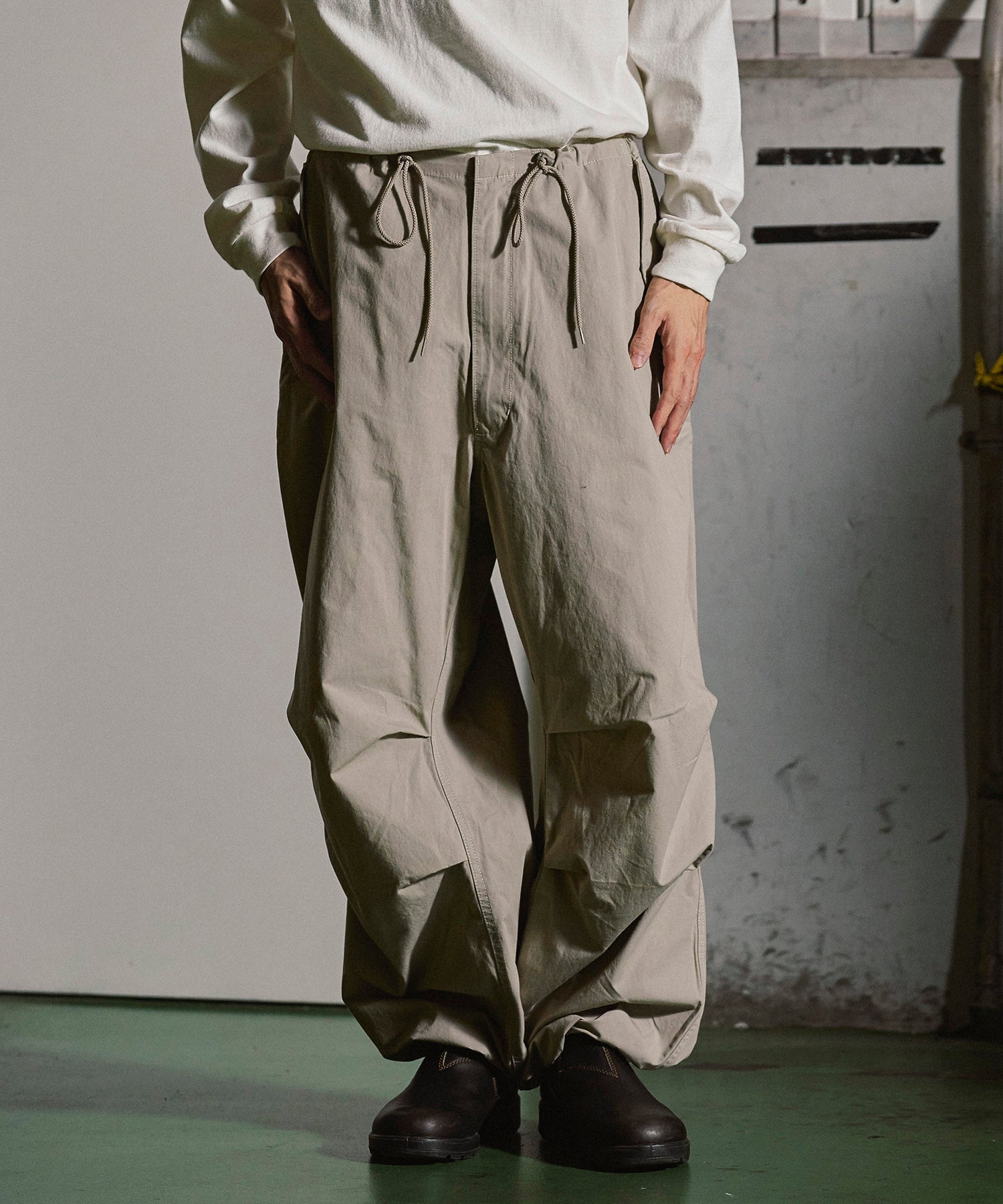 アメリカ軍が降雪地帯での戦闘用として採用していた「US Army Snow Camo Pants」をベースにしたワイドパンツ。オーバーパンツではなくあくまで1枚で着用する事を前提としシルエットをオリジナルよりやや細身にアレンジ。前ポケットも袋布をつけ実用性を持たせています。また、本来サスペンダーを取り付けるためのベルト裏のコードは両脇に1点止めとし、キーホルダーやウォレットチェーンを取り付けたい時に外側に出す事で装着可能となります。