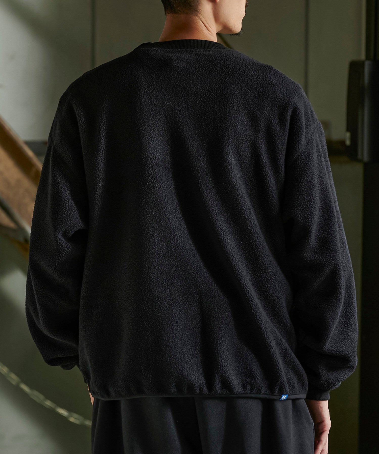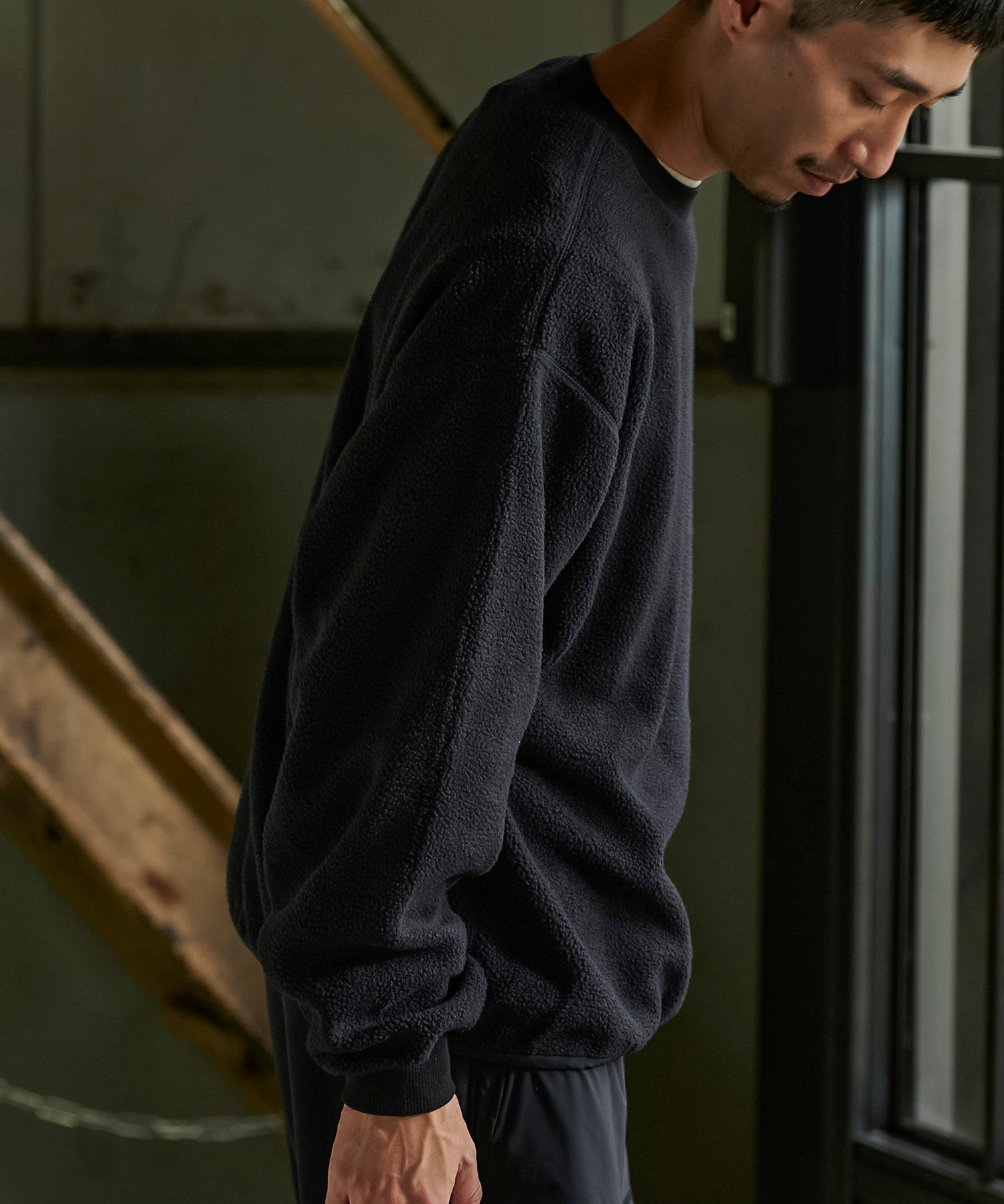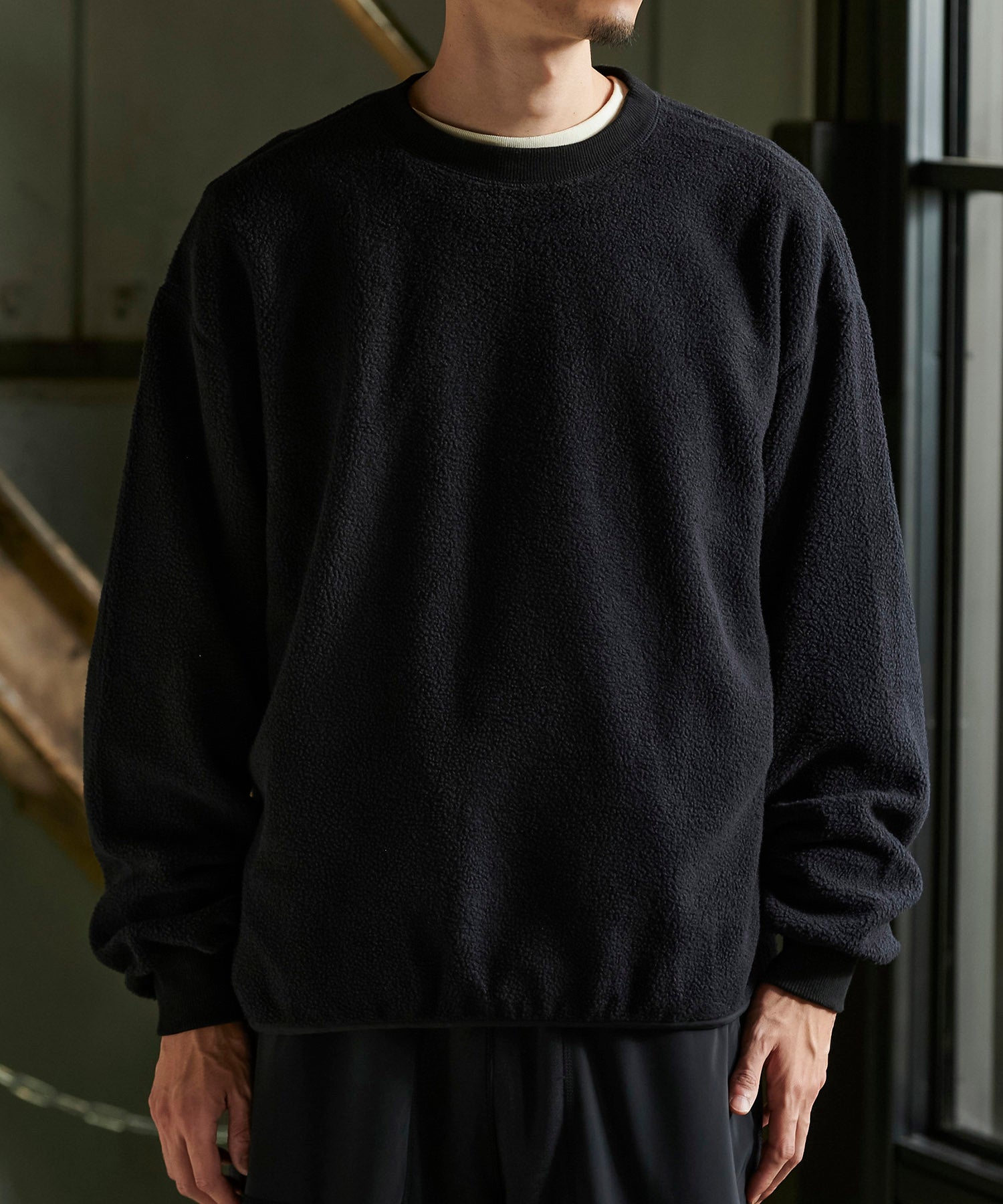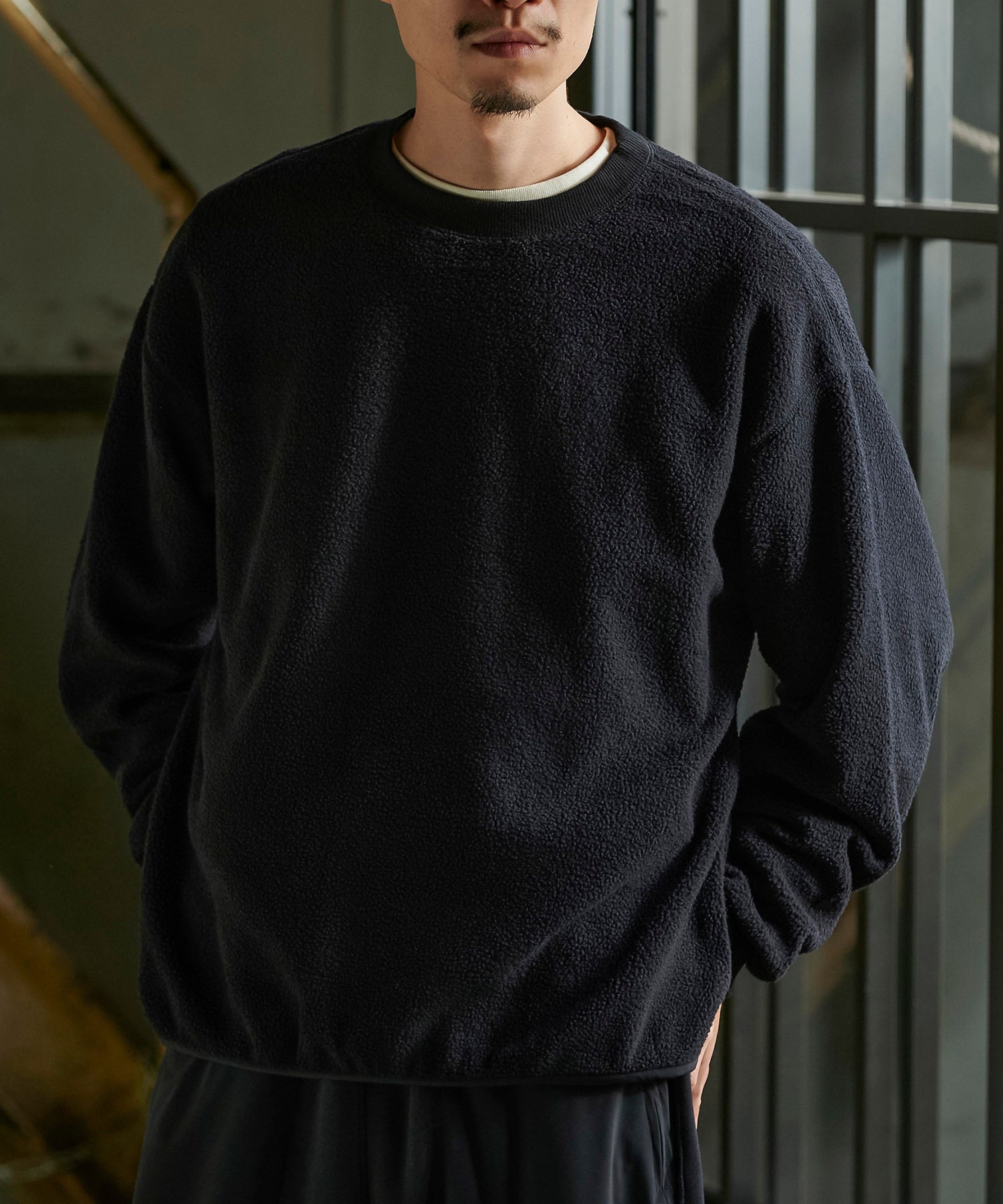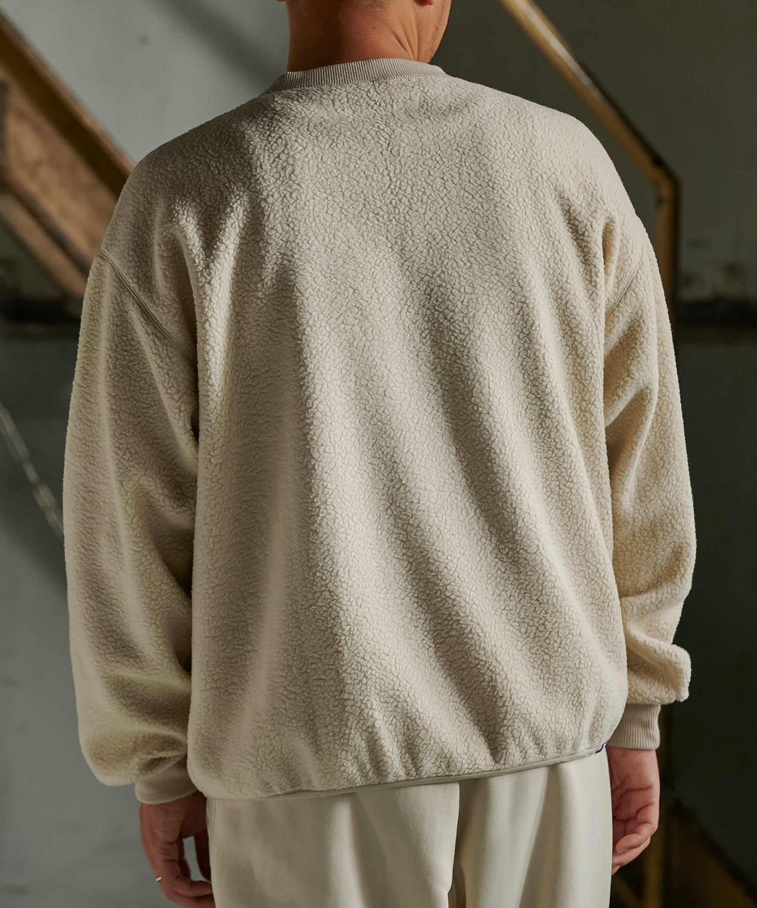 リバーシブルで着用出来るボアスウェット。程よい厚みと軽さ・柔らかさで着心地が良く、ボアが空気を含むことで暖かさを保つことが出来ます。襟元はリブ仕様でシンプルに、コットンベースなのでチクチクしないのも魅力。もう片面は天竺目のフラットなフェイス。ボアとは対照的なキレイ目でシンプルなイメージで着ていただけます。寒さが残る春先は天竺面を着用すれば冬っぽくならずに暖かさが保てるので重宝します。一枚で2役、いつものライフスタイルに、アウトドアにも最適なアイテムです。