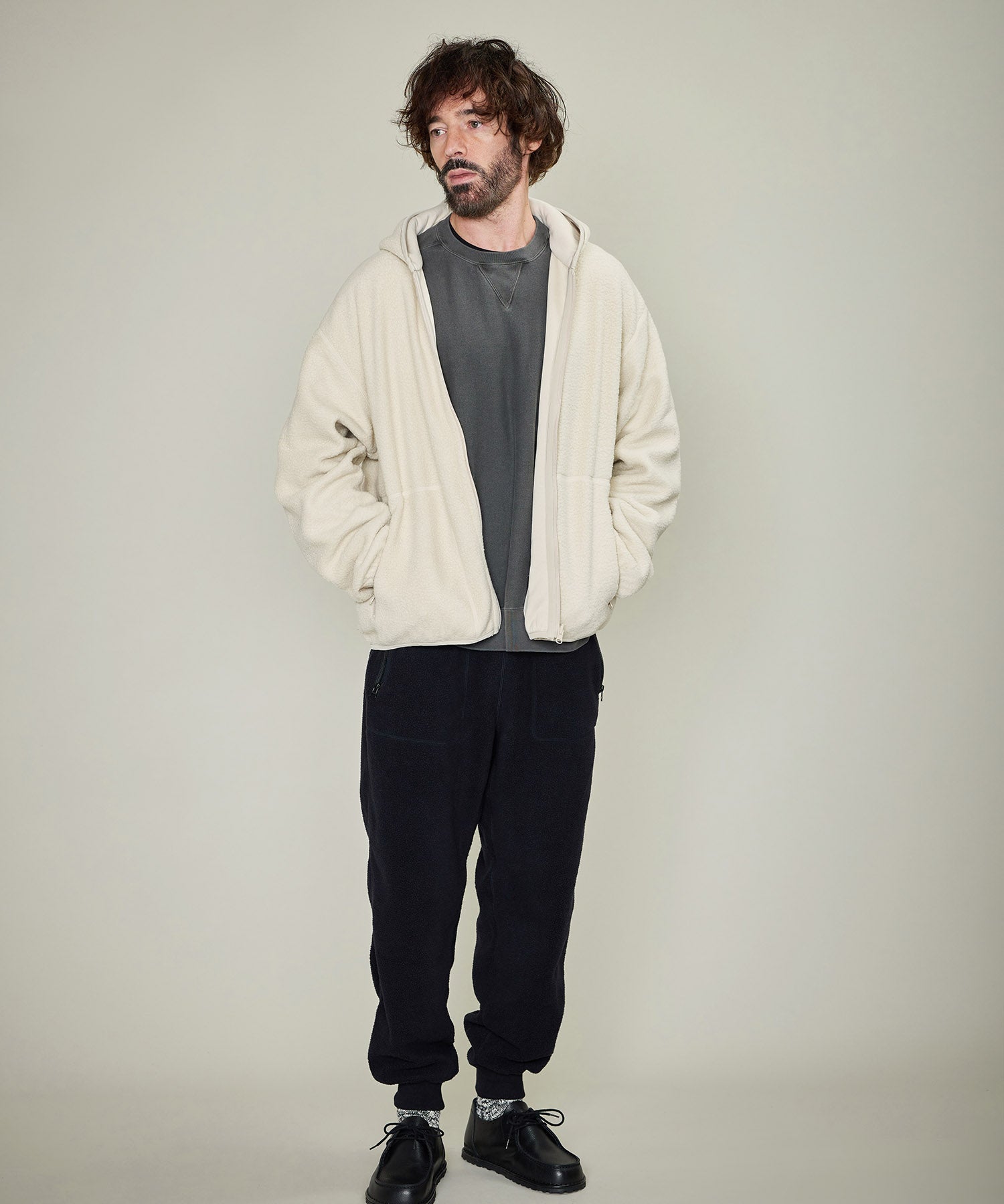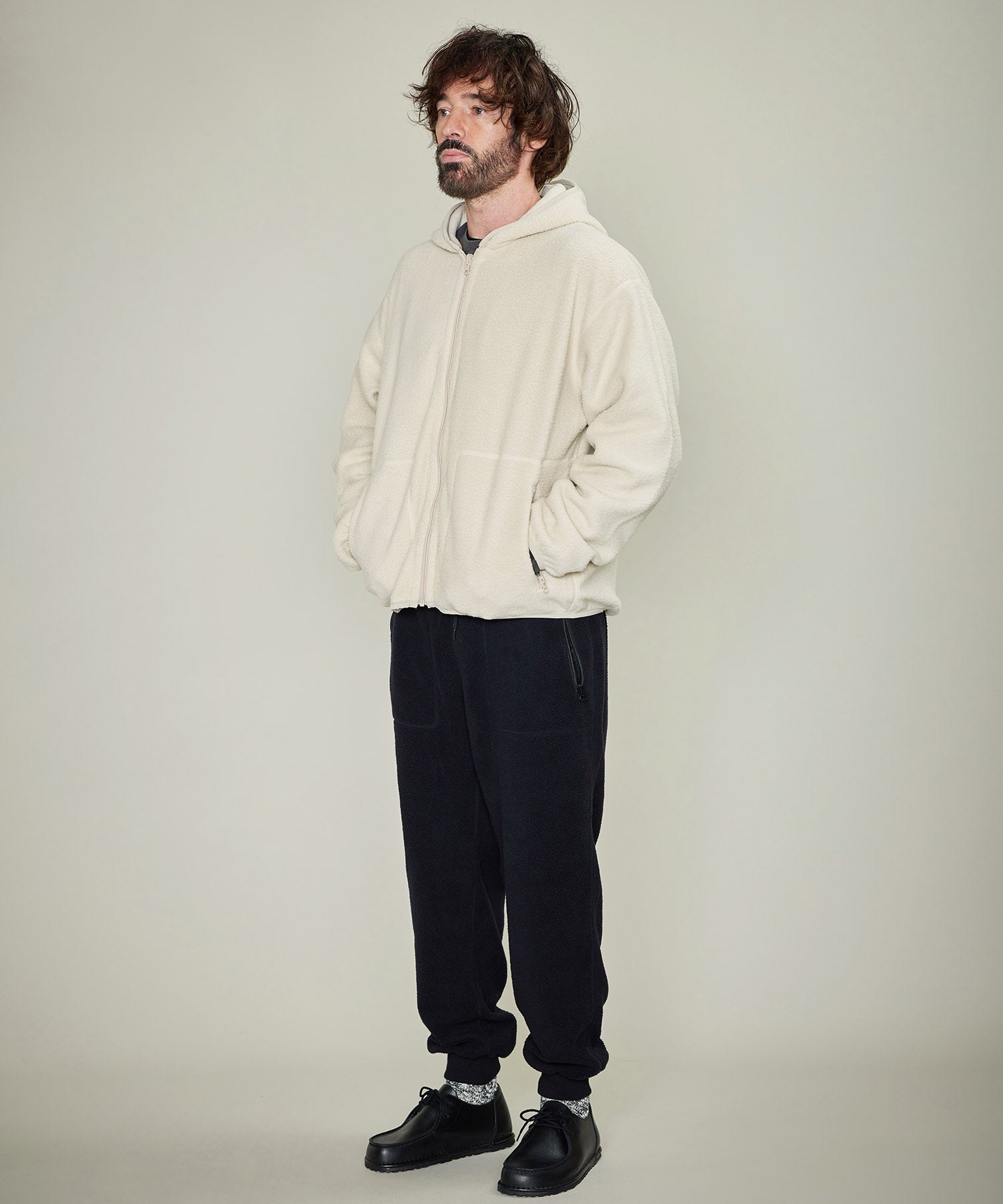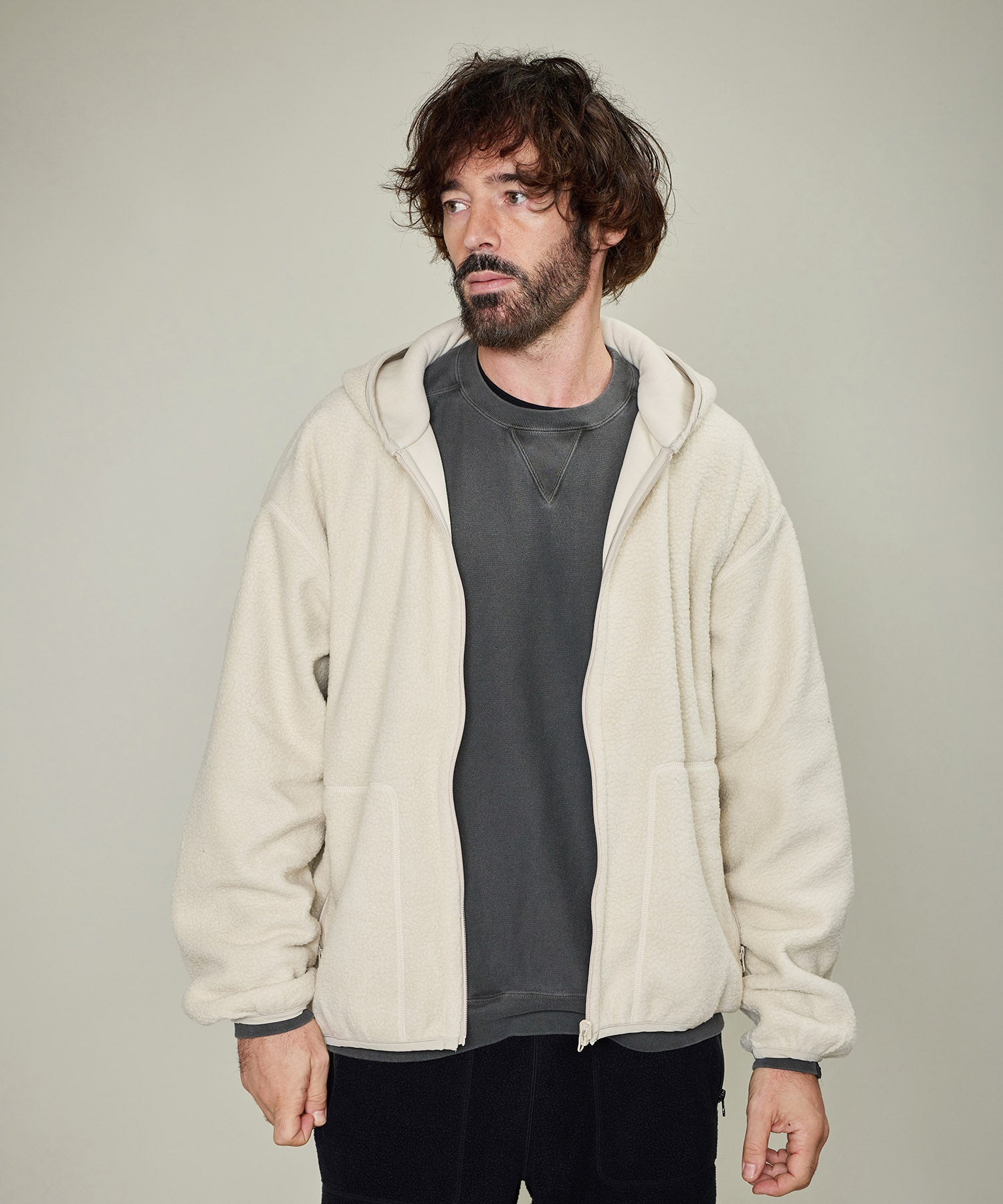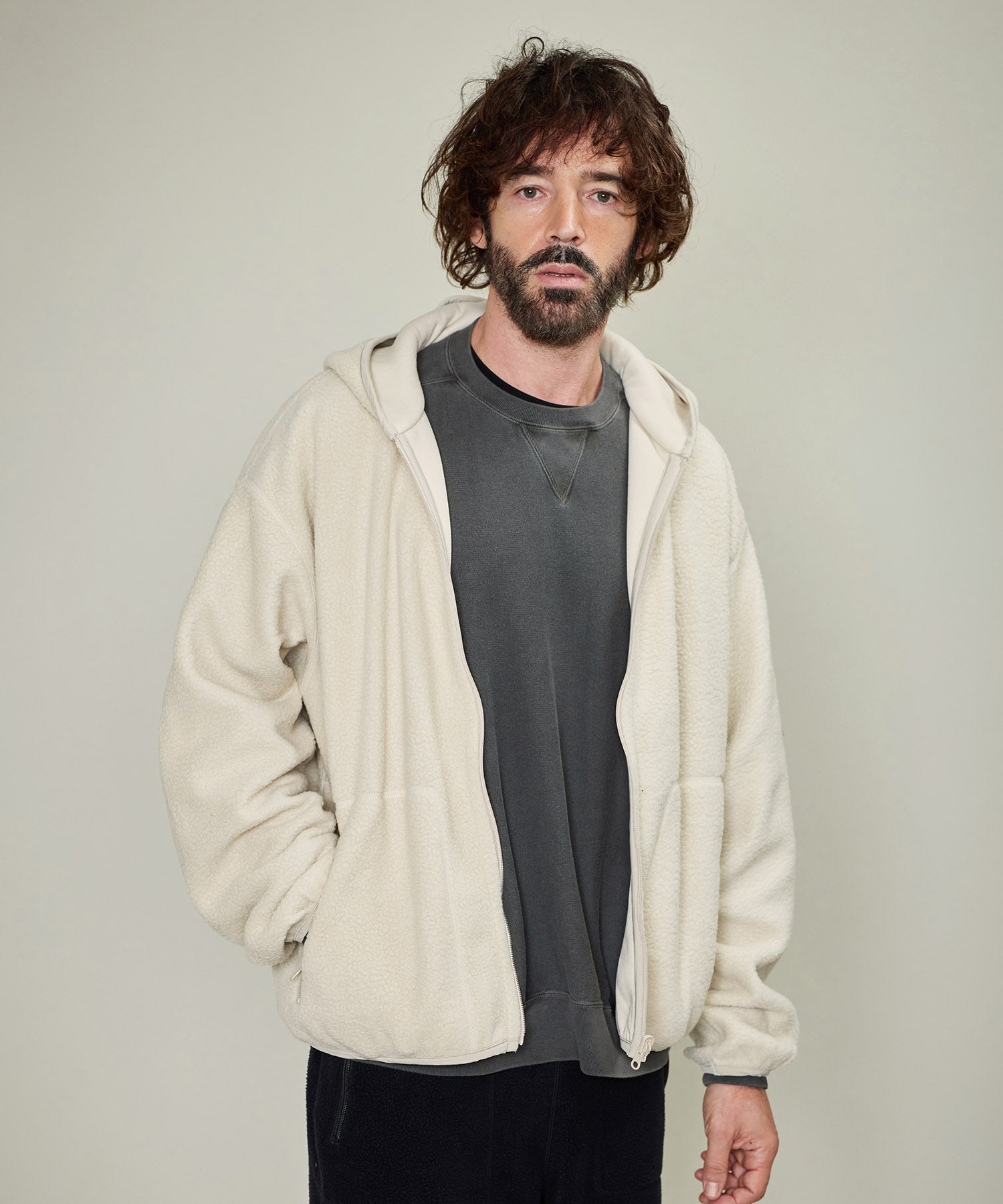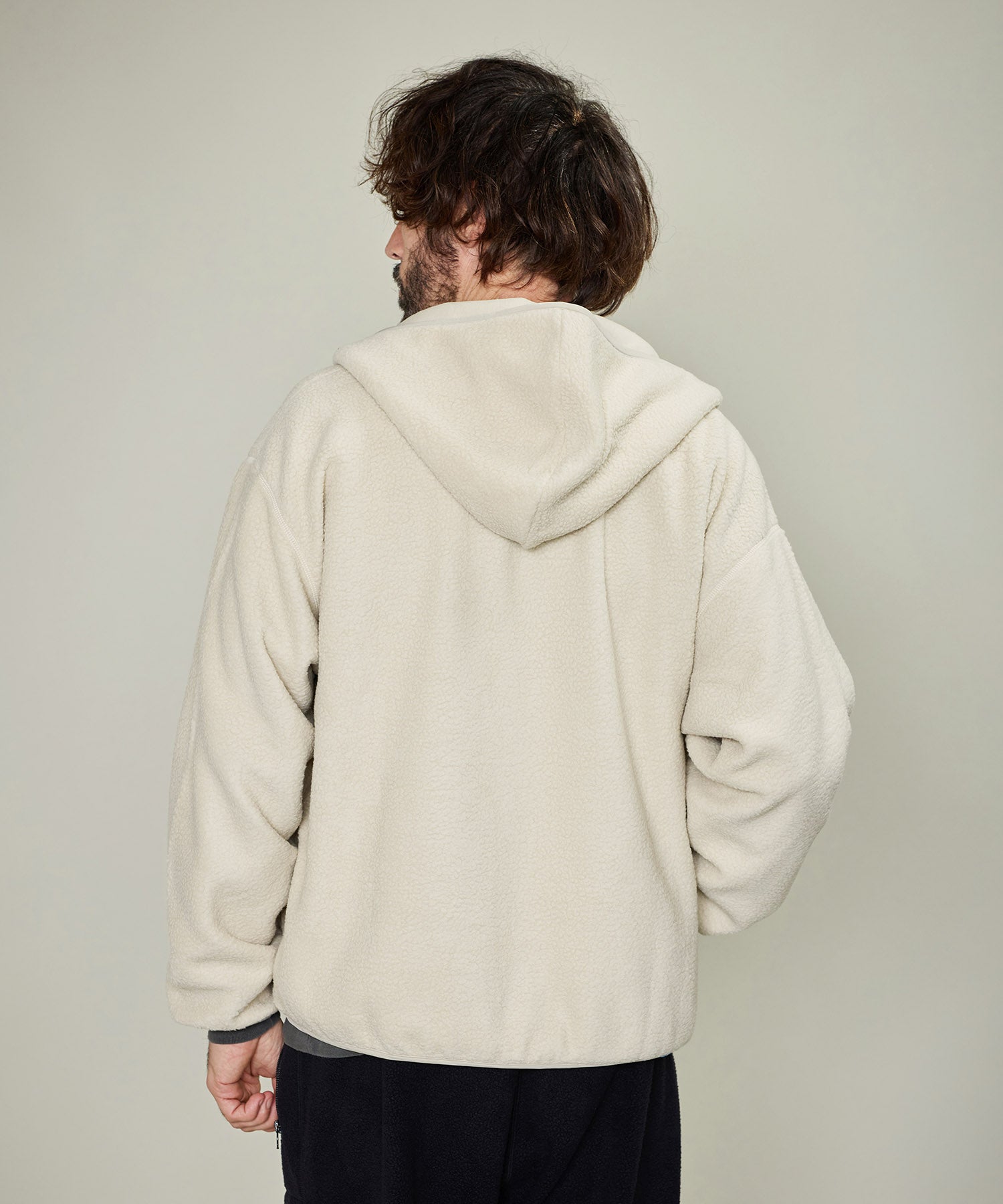 リバーシブルで着用出来るボアスウェット。程よい厚みと軽さ・柔らかさで着心地が良く、ボアが空気を含むことで暖かさを保つことが出来ます。フード付きのジップアップパーカは表裏両面共にジップポケット付き。もう片面は天竺目のフラットなフェイス。ボアとは対照的なキレイ目でシンプルなイメージで着ていただけます。寒さが残る春先は天竺面を着用すれば冬っぽくならずに暖かさが保てるので重宝します。一枚で2役、いつものライフスタイルに、アウトドアにも最適なアイテムです。