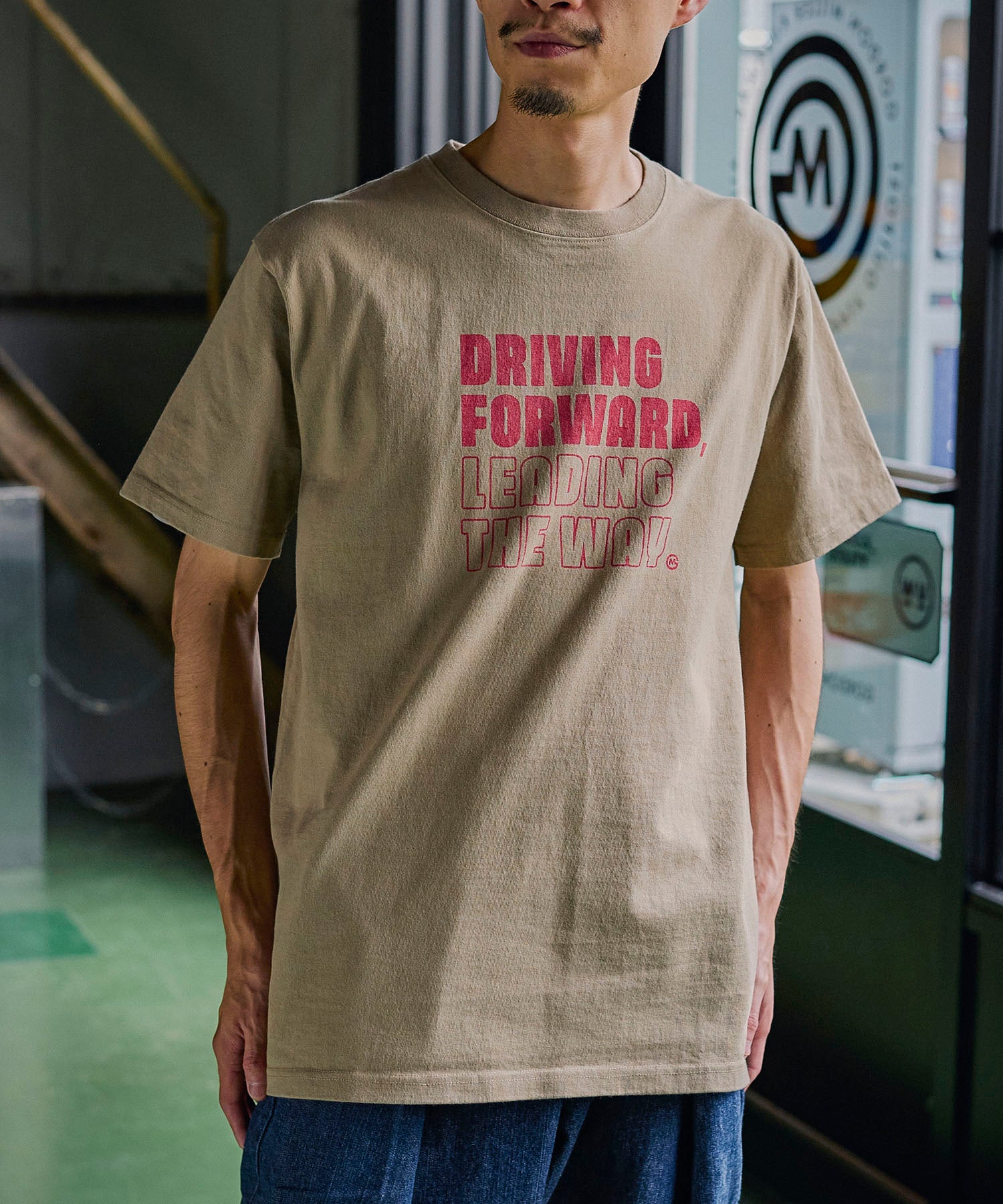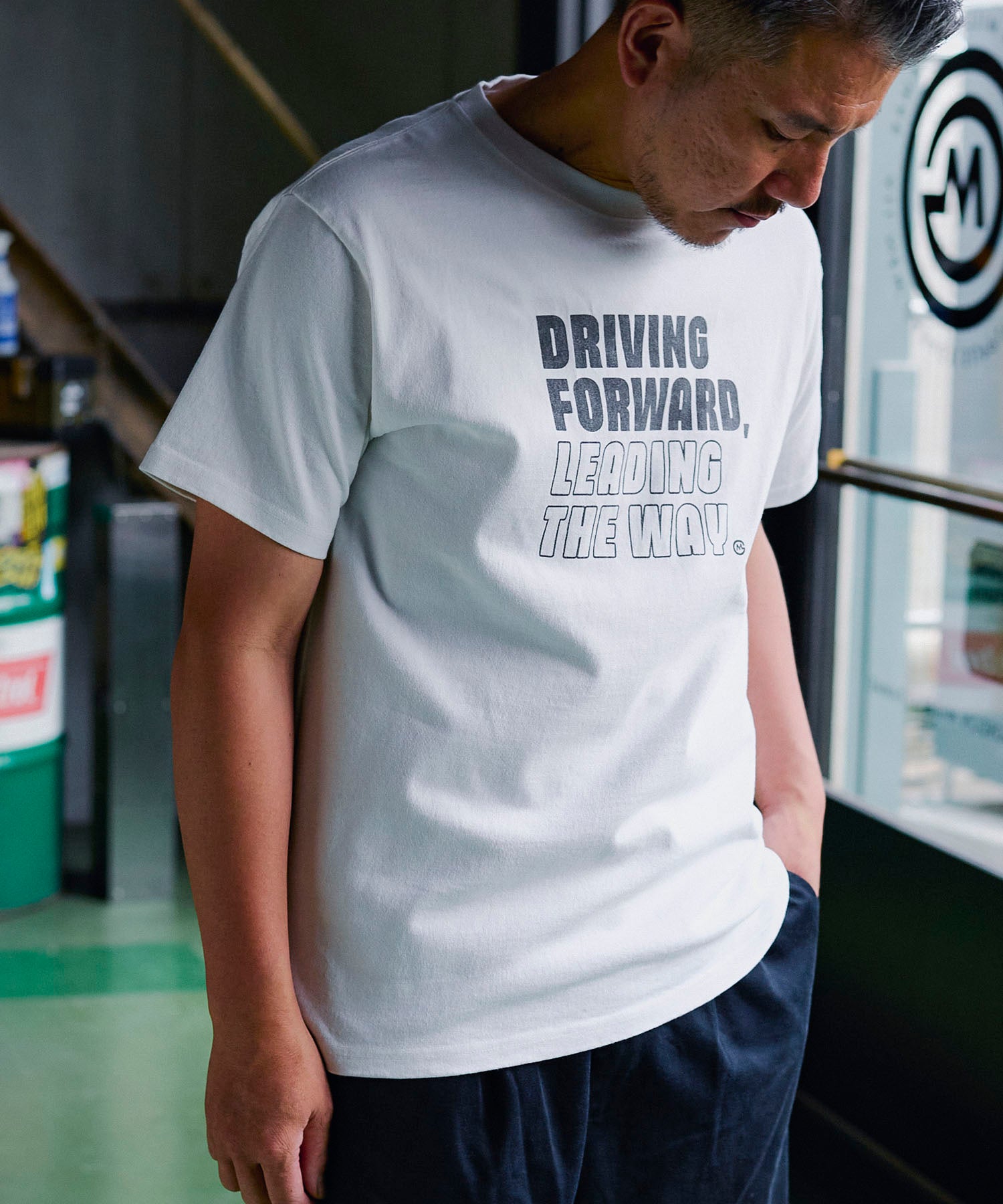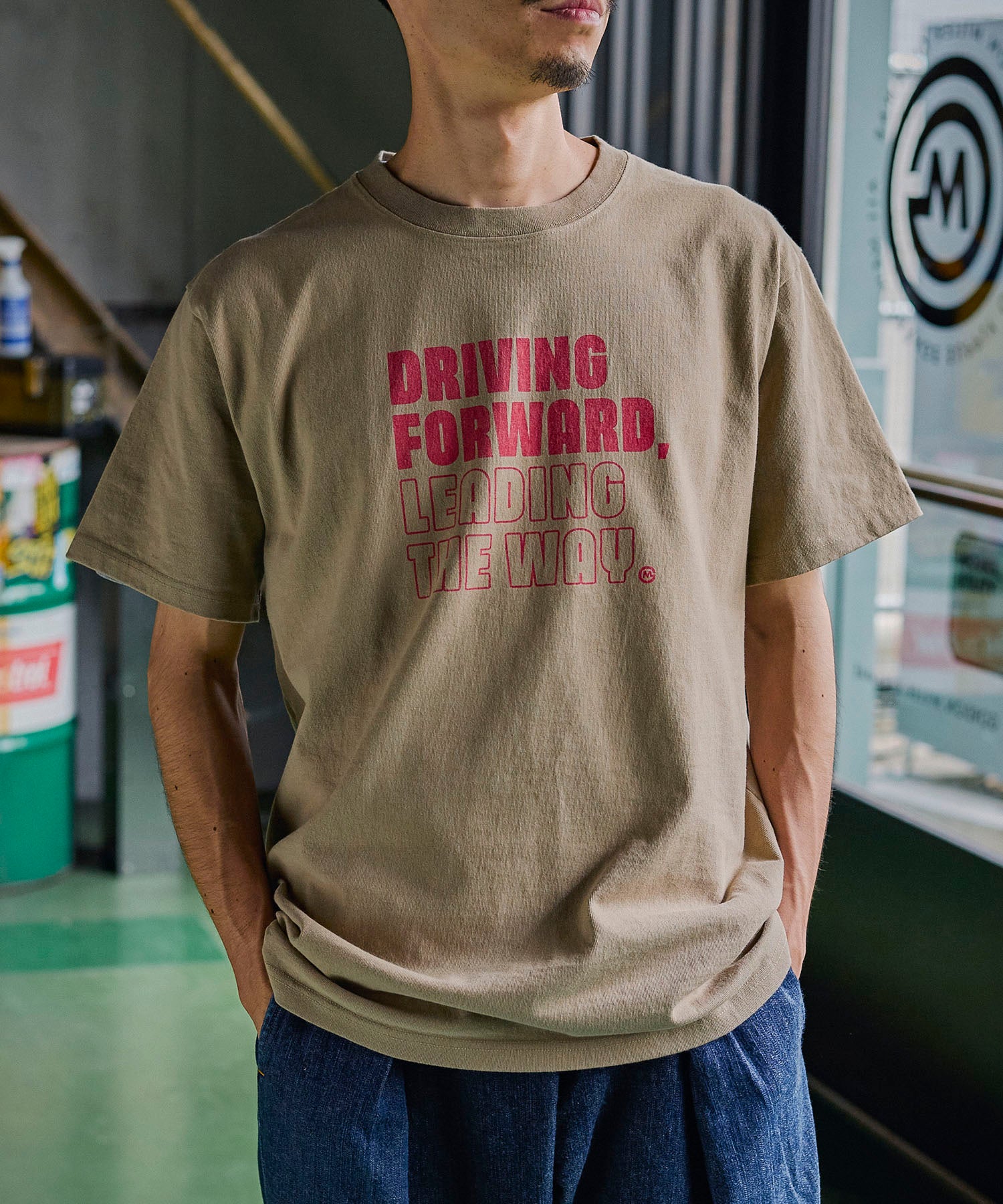 "DRIVING FORWORD LEADING THE WAY" ~前進し、道を切り開く~という男らしいワードをゲームのようなコミカルなフォントで表現したロゴTシャツ。地厚な12.7ozのコットン天竺はドライなタッチで型崩れがしにくく通年人気の素材です。