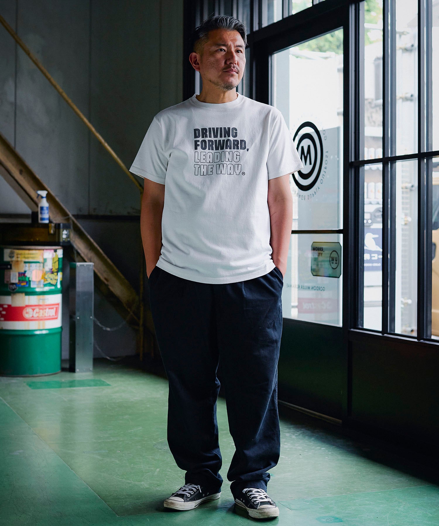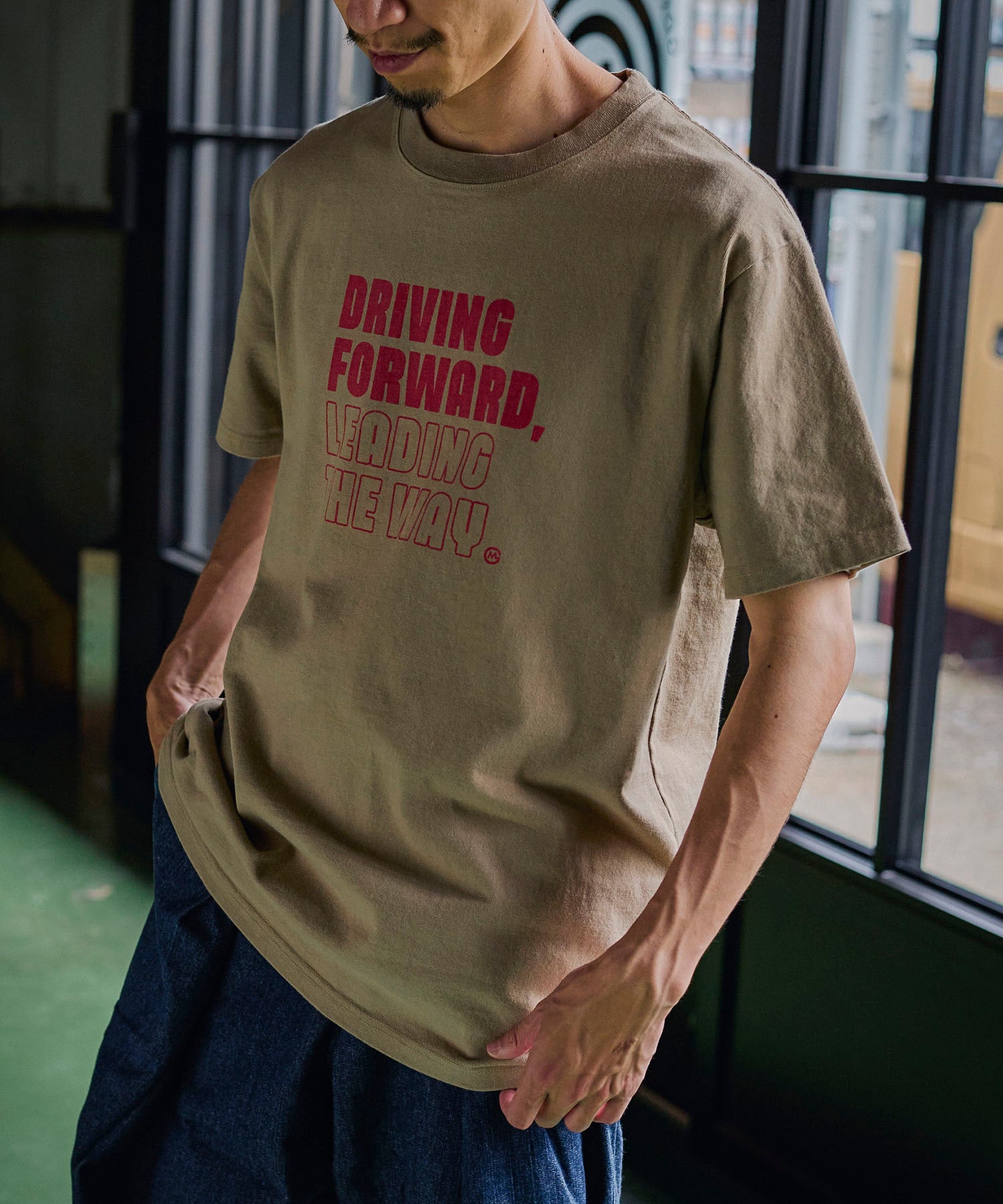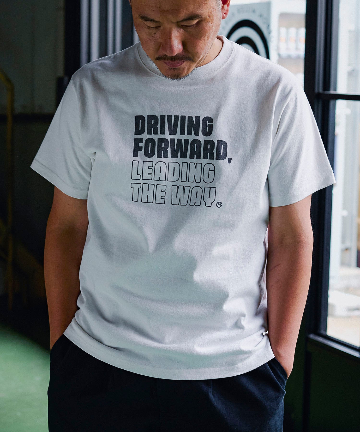 "DRIVING FORWORD LEADING THE WAY" ~前進し、道を切り開く~という男らしいワードをゲームのようなコミカルなフォントで表現したロゴTシャツ。地厚な12.7ozのコットン天竺はドライなタッチで型崩れがしにくく通年人気の素材です。