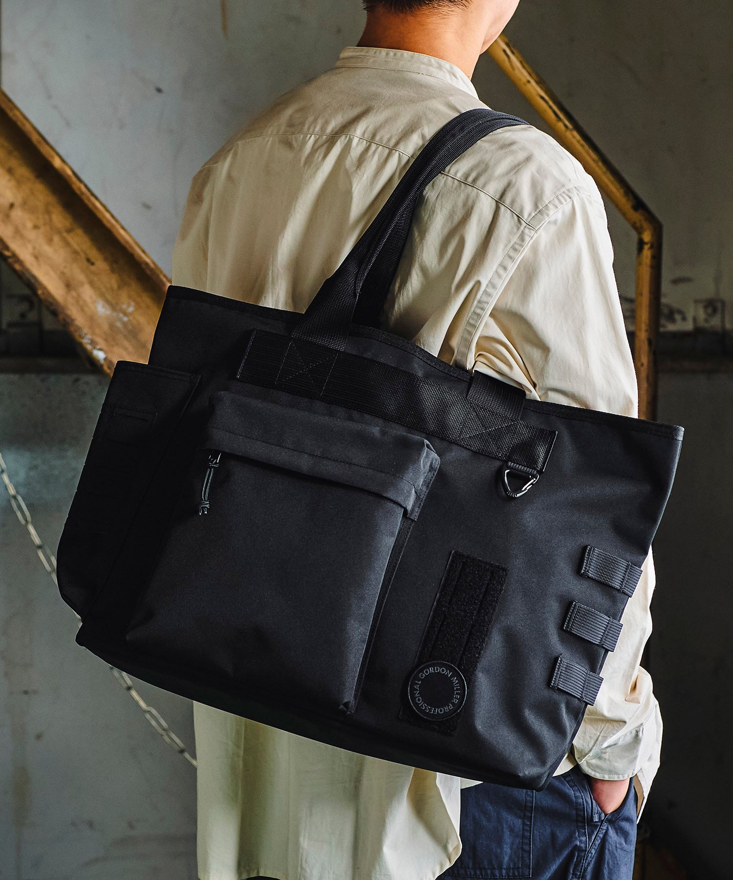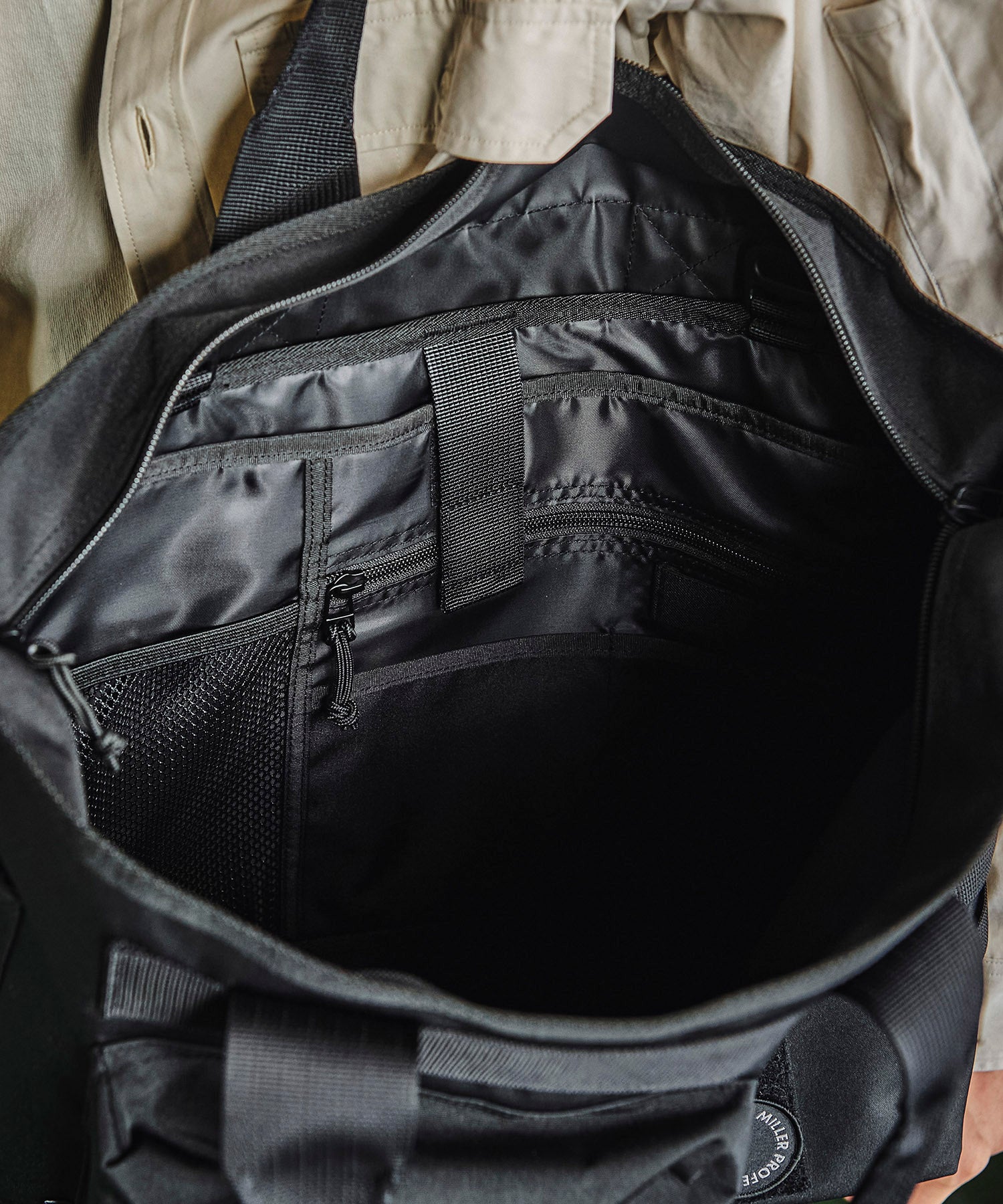 容量27Lとたっぷりした収納力があります。 正面にはちょっとした小物を収納するフラップ付きのジップポケット。 片側にボトル等収納するメッシュポケット、そしてその反対側にはベルクロにレーザーカットを施したモールシステムがあるので、別売りのガジェットポーチを付けていただけば収納力を拡張いただけます。 背面は旅行カートに引っかけられるループが付いています。 内側には取り外しできるオーガナイザーが付属。 15インチ相当のPCを入れたり、書類やガジェット等を入れるポケット、そしてペンホルダーがあり、オーガナイザーごとバッグから取り出し移動が可能です。 GORDON MILLER PROFESSIONALロゴワッペン付属しています。