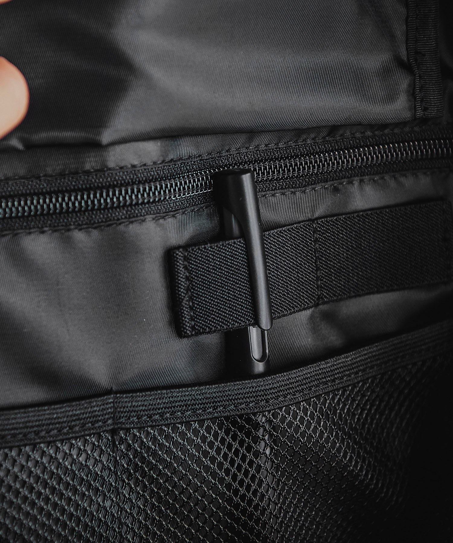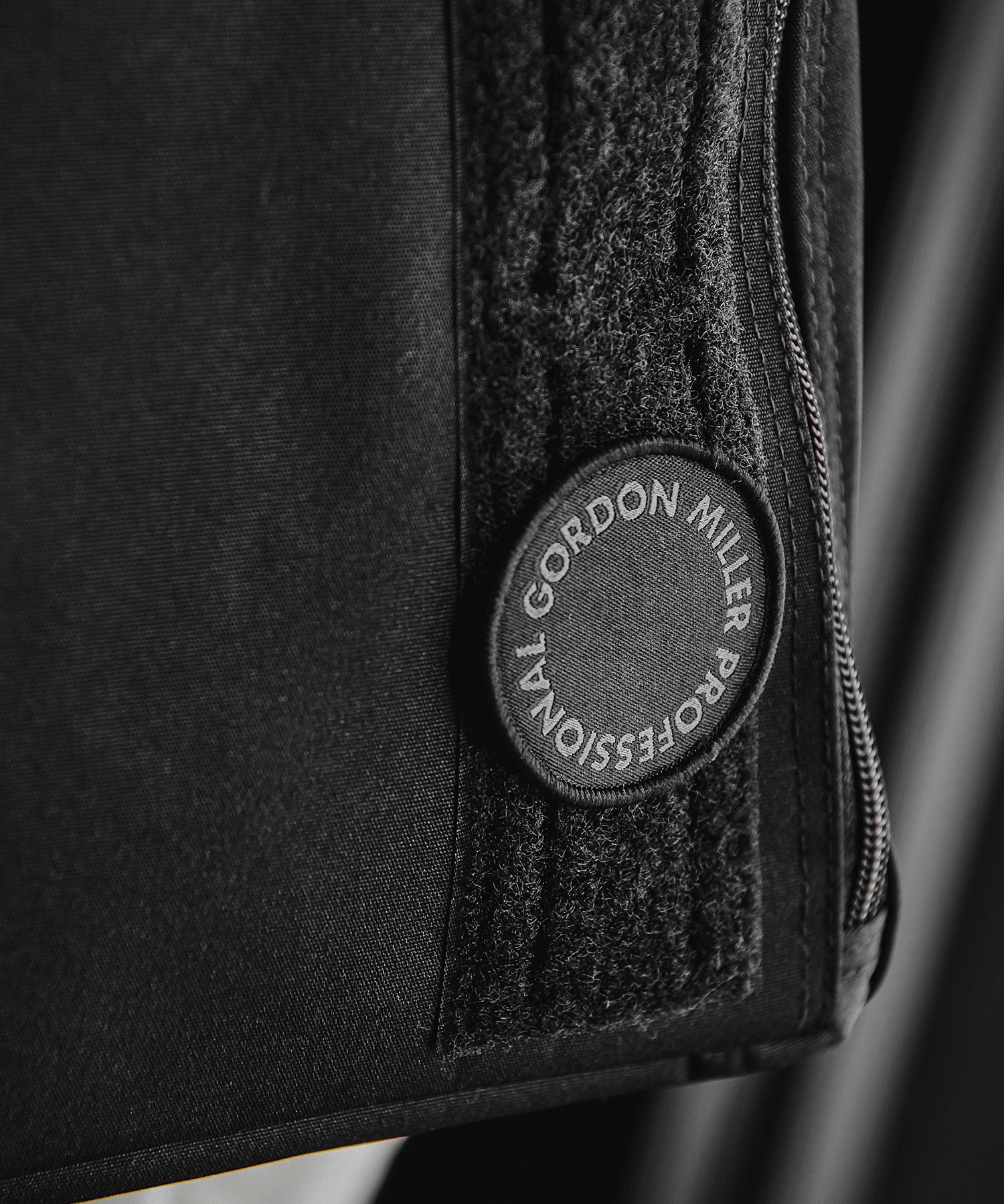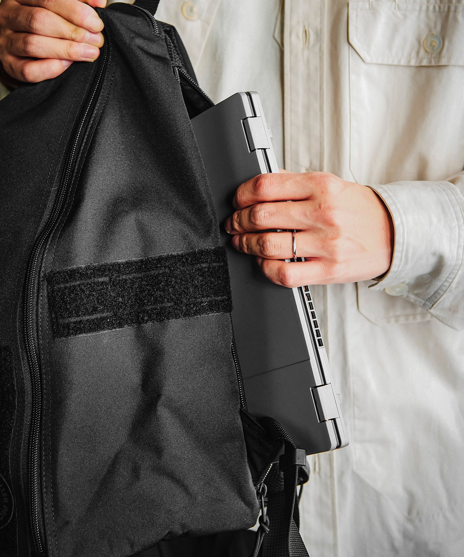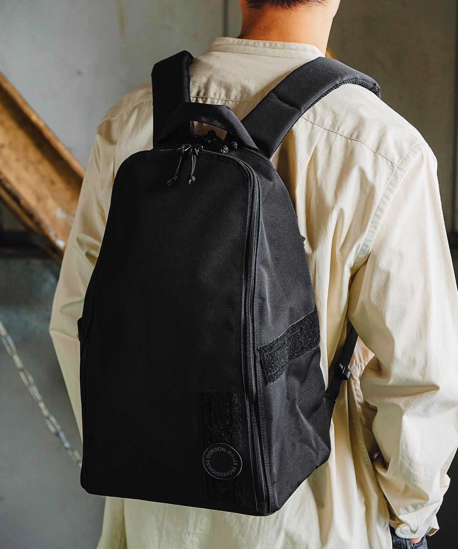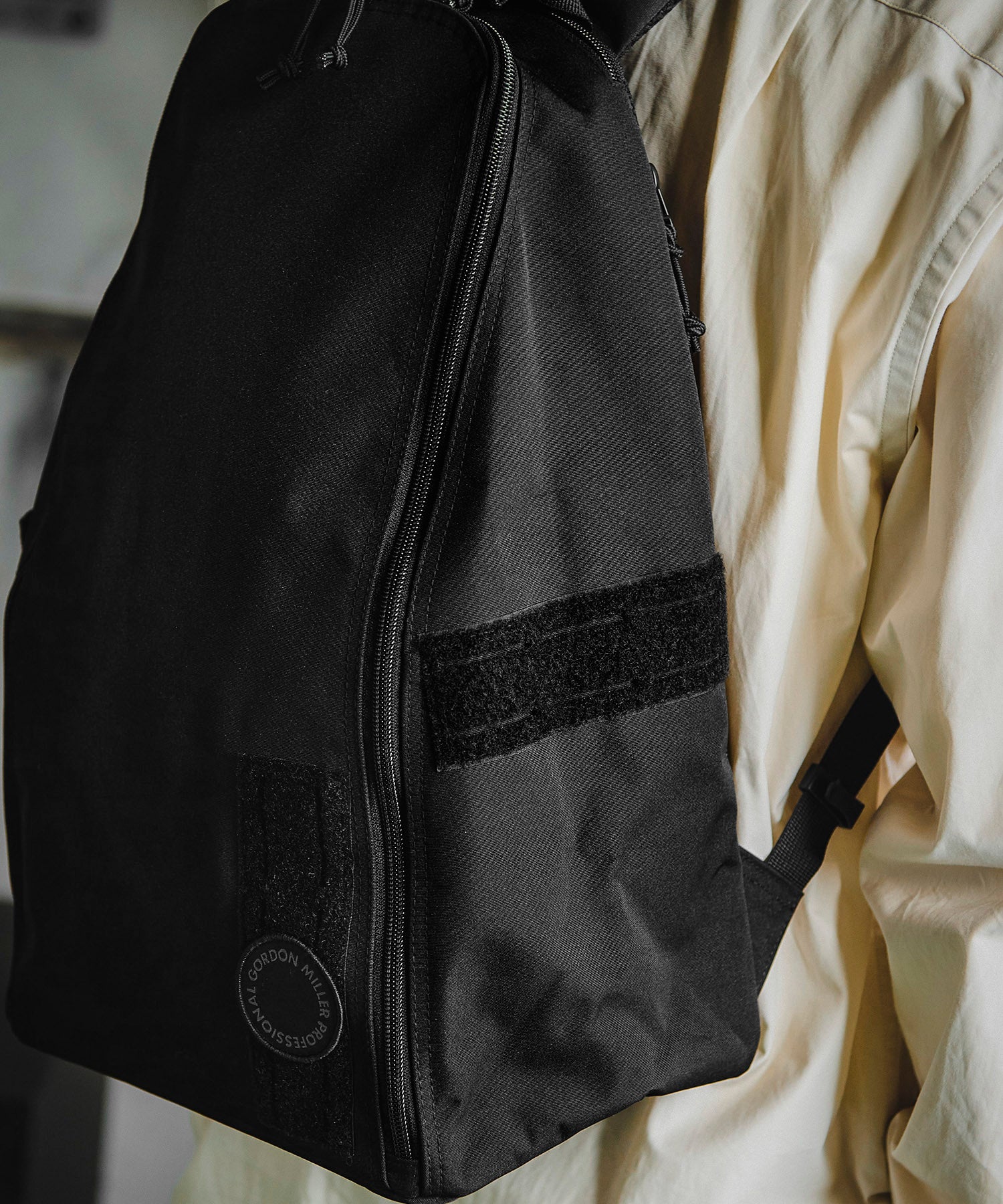 容量18Lと普段使いに丁度良い収納力。 シンプルなデザインで上面にはサングラスやガジェットを入れるジップポケットがあります。 内側にはボトルが倒れてしまわないようにボトルホルダーと仕分けポケットあります。 背面の側面にはPC用のジップポケット。背面には旅行カートの持ち手に差し込めるループが付いています。 側面にはモールシステムがあるので、別売りのガジェットポーチを付けていただけば収納力を拡張いただけます。 GORDON MILLER PROFESSIONALロゴワッペン付属しています。