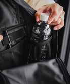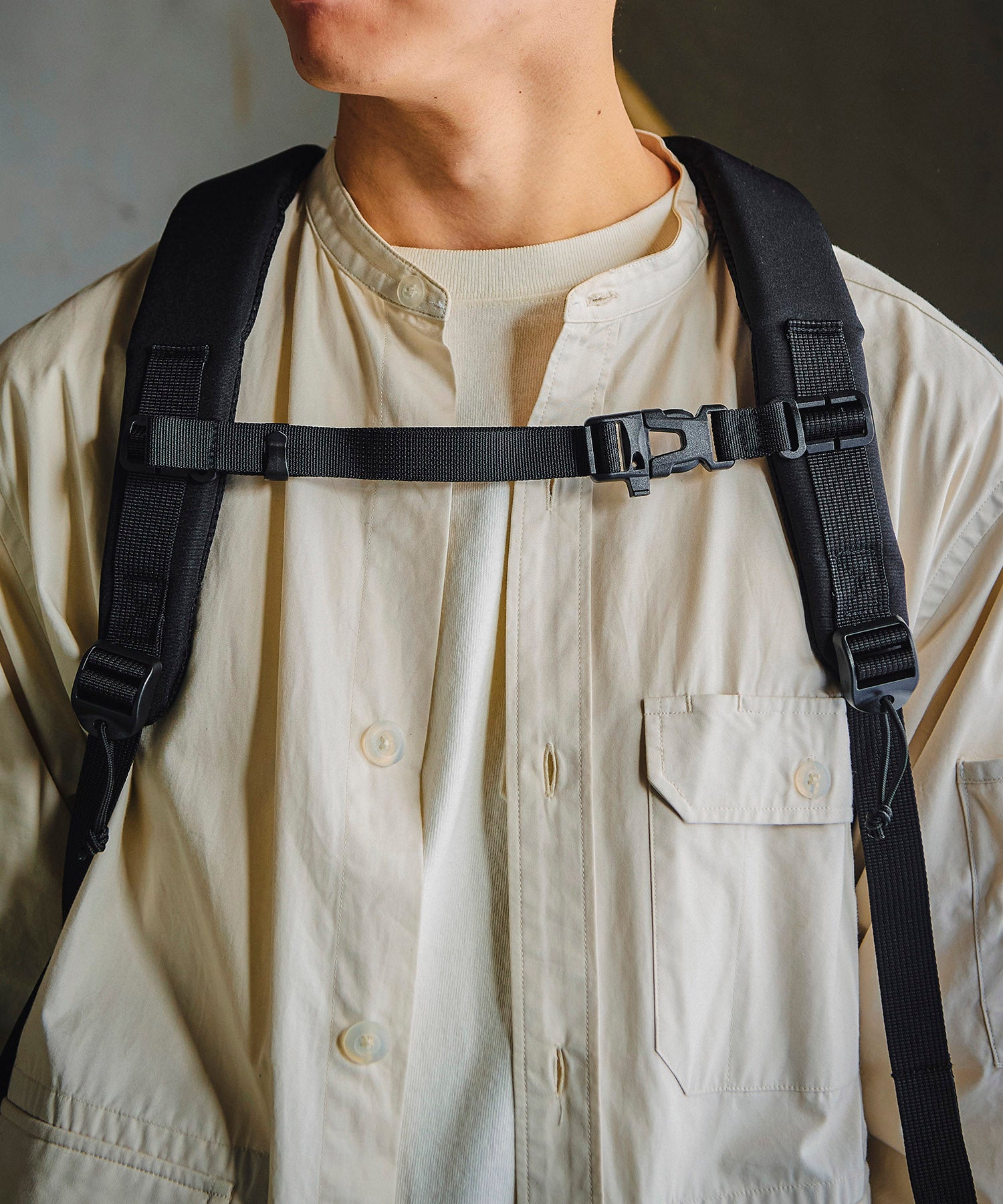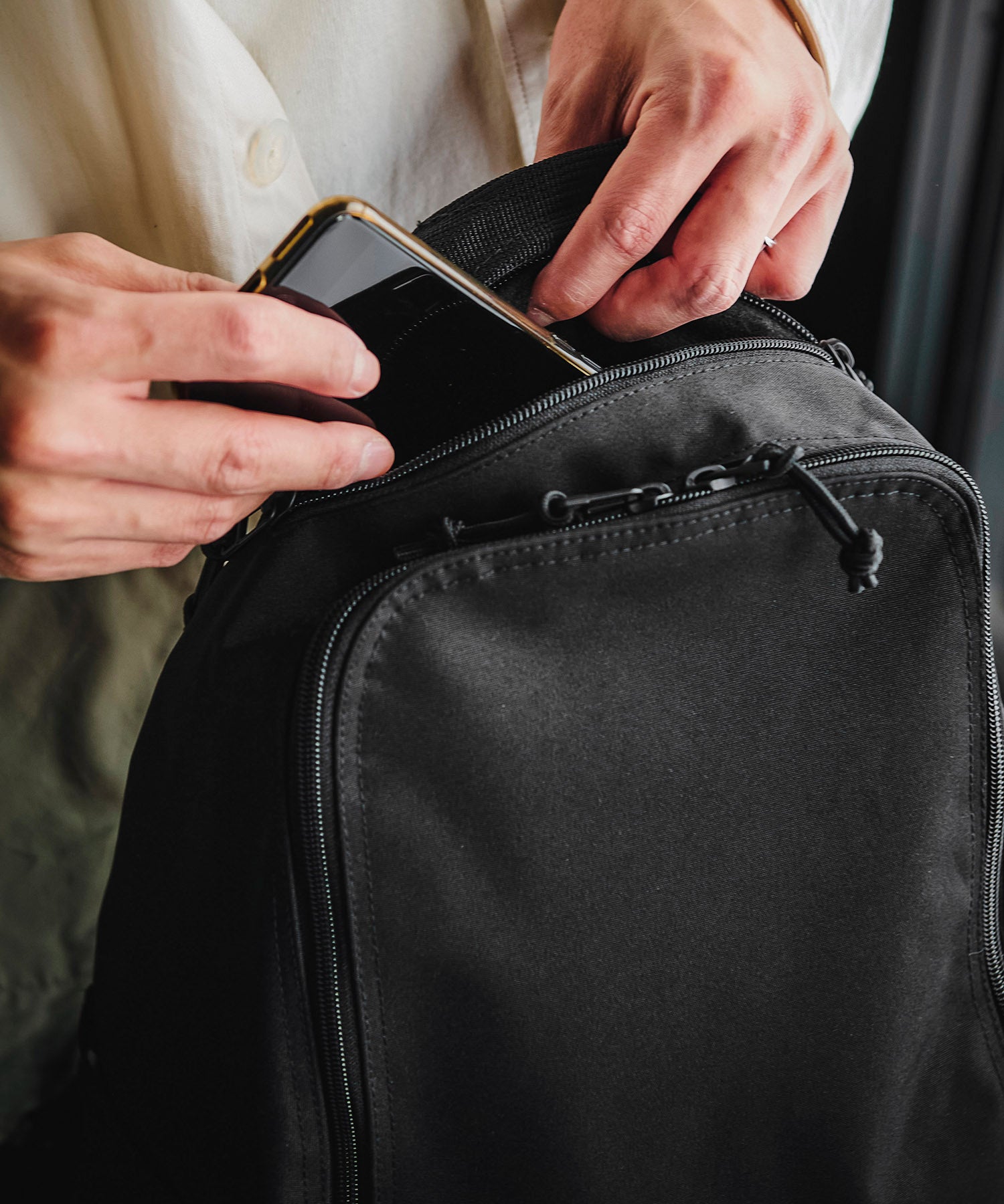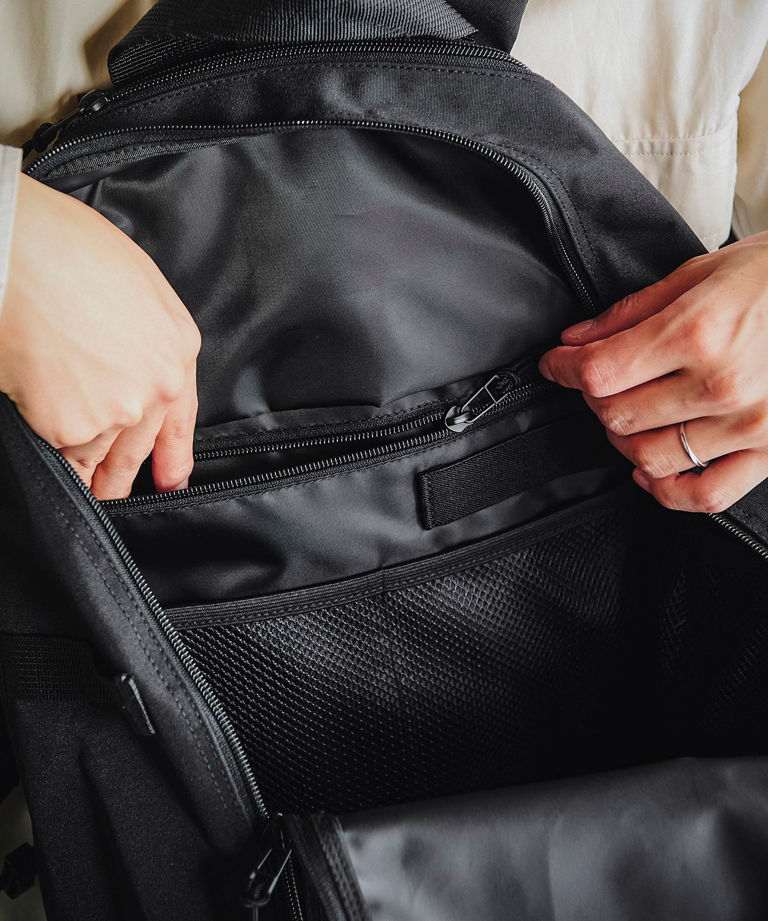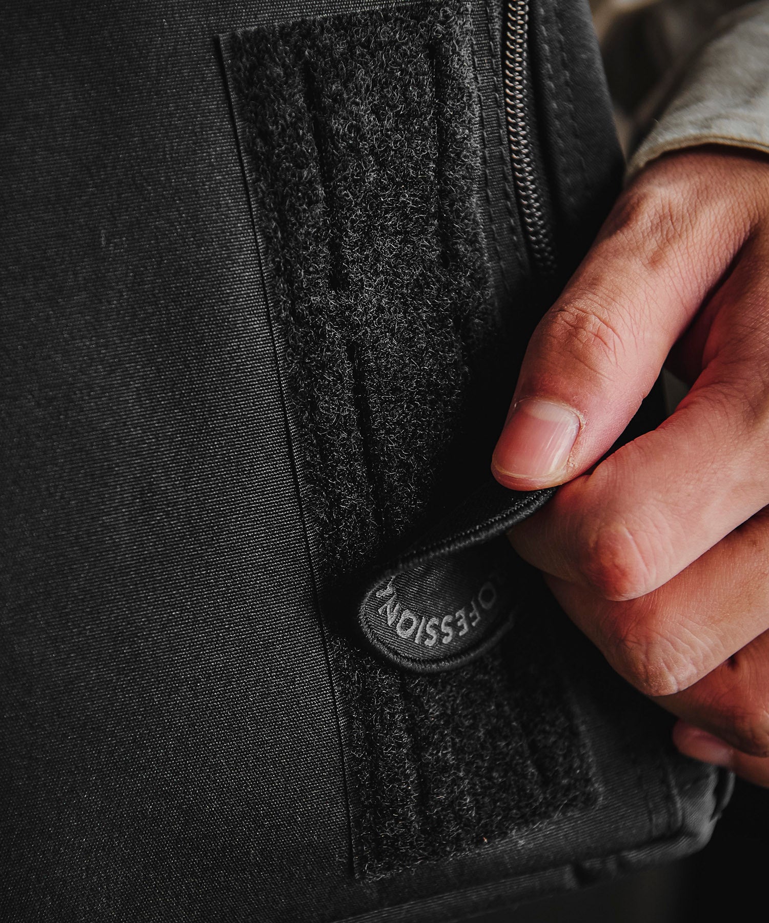 容量18Lと普段使いに丁度良い収納力。 シンプルなデザインで上面にはサングラスやガジェットを入れるジップポケットがあります。 内側にはボトルが倒れてしまわないようにボトルホルダーと仕分けポケットあります。 背面の側面にはPC用のジップポケット。背面には旅行カートの持ち手に差し込めるループが付いています。 側面にはモールシステムがあるので、別売りのガジェットポーチを付けていただけば収納力を拡張いただけます。 GORDON MILLER PROFESSIONALロゴワッペン付属しています。