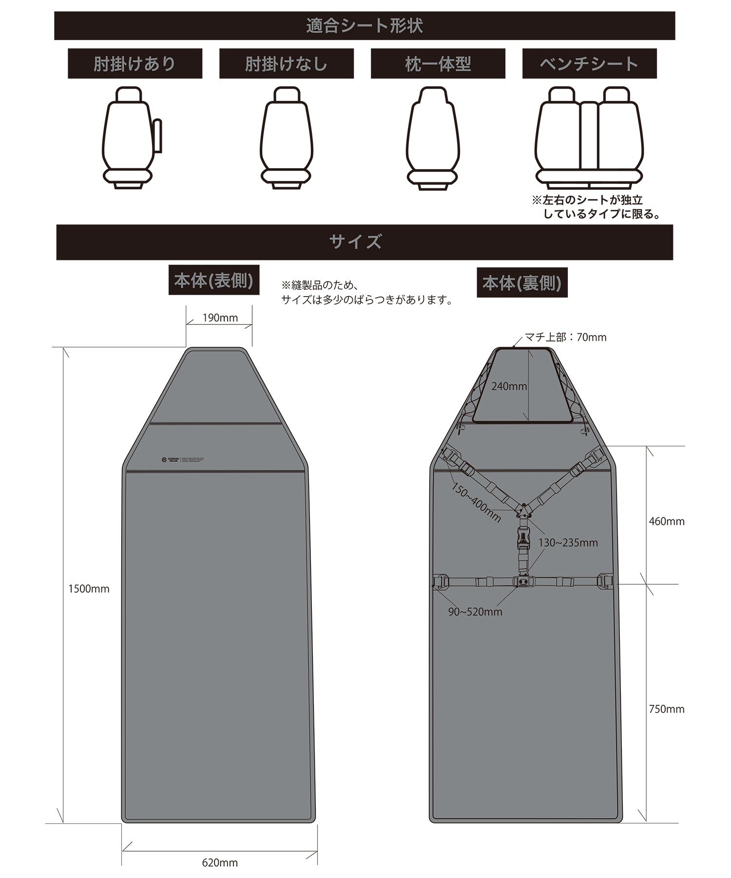 ●本製品は多くの車種に幅広く取り付けができるように設計されたフリーサイズカバーです。本体シート機能(リクライニング、アームレスト、レバー、ボタン等)の妨げになる場合がありますのでご注意ください。