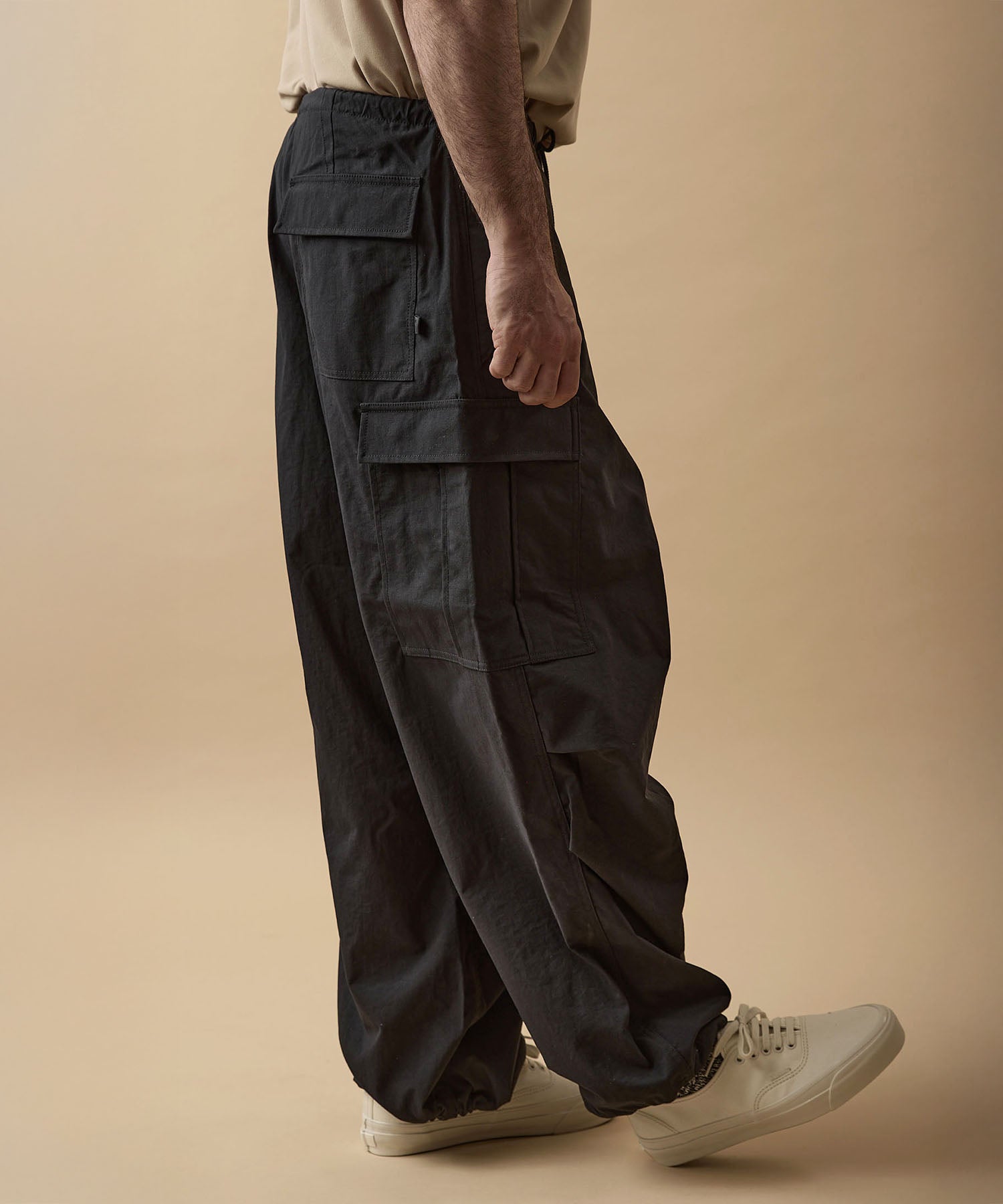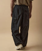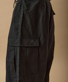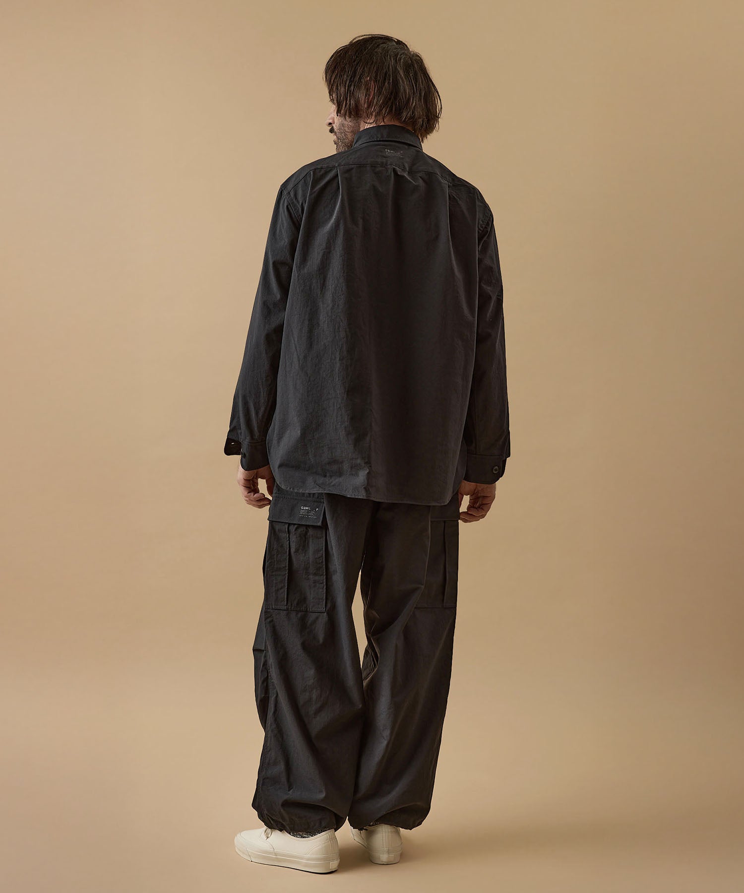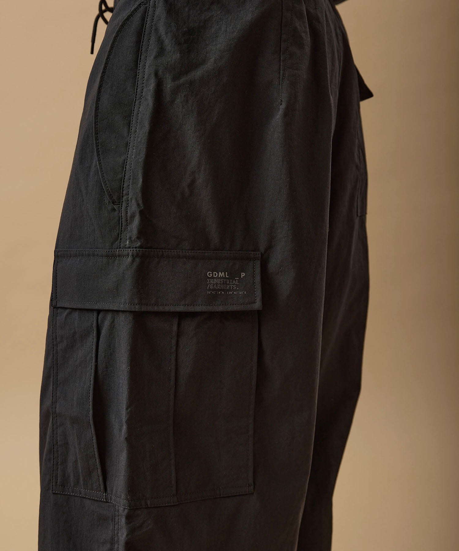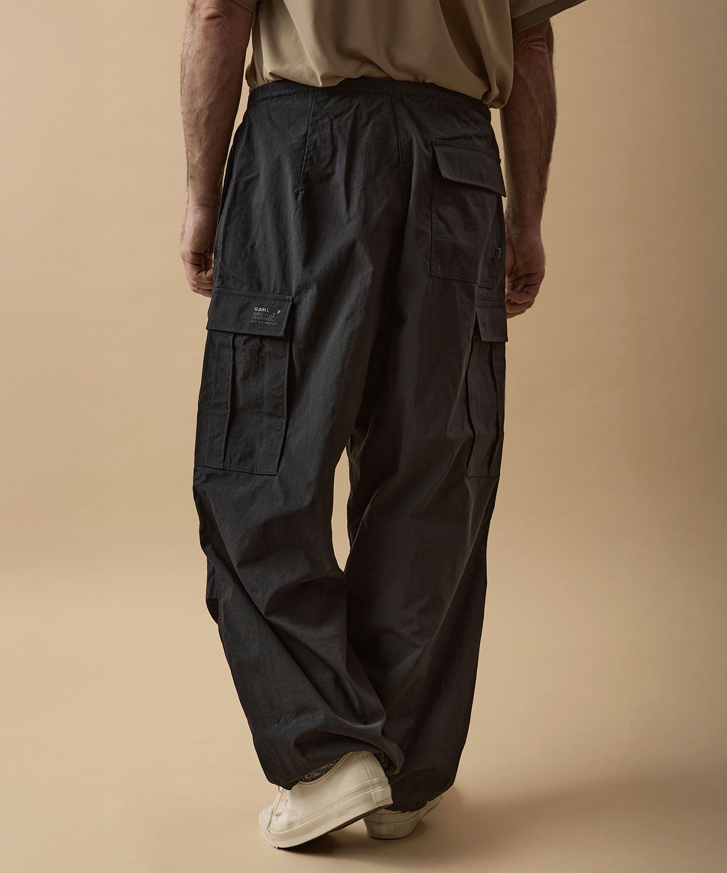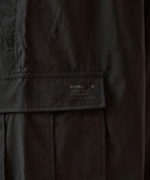 しっかりとした硬さと張りがあり、平織りのコットンかのような重厚に見えるイメージでも、ナイロン100%で軽く、丈夫な素材。 張りと表面の凸凹により張り付かず肌から離れるので暑苦しい感じがありません。 ヴィンテージっぽいワッシャー感のある加工を施したこの素材は 初期撥水し透湿機能もあるまさに呼吸するテキスタイル。 服の中の湿気を外に出してくれるので、じめじめした季節もストレスフリーに過ごせます。 米軍M-51をベースにしたカーゴパンツはシャツ同様に大容量のポケットワーク。 オーバーサイズシルエットでボトムにボリュームを持たせています。 左ポケットフラップにINDUSTRIAL GARMENTSをテーマとしたさりげないロゴプリント。シックなグレーと定番のブラック。