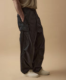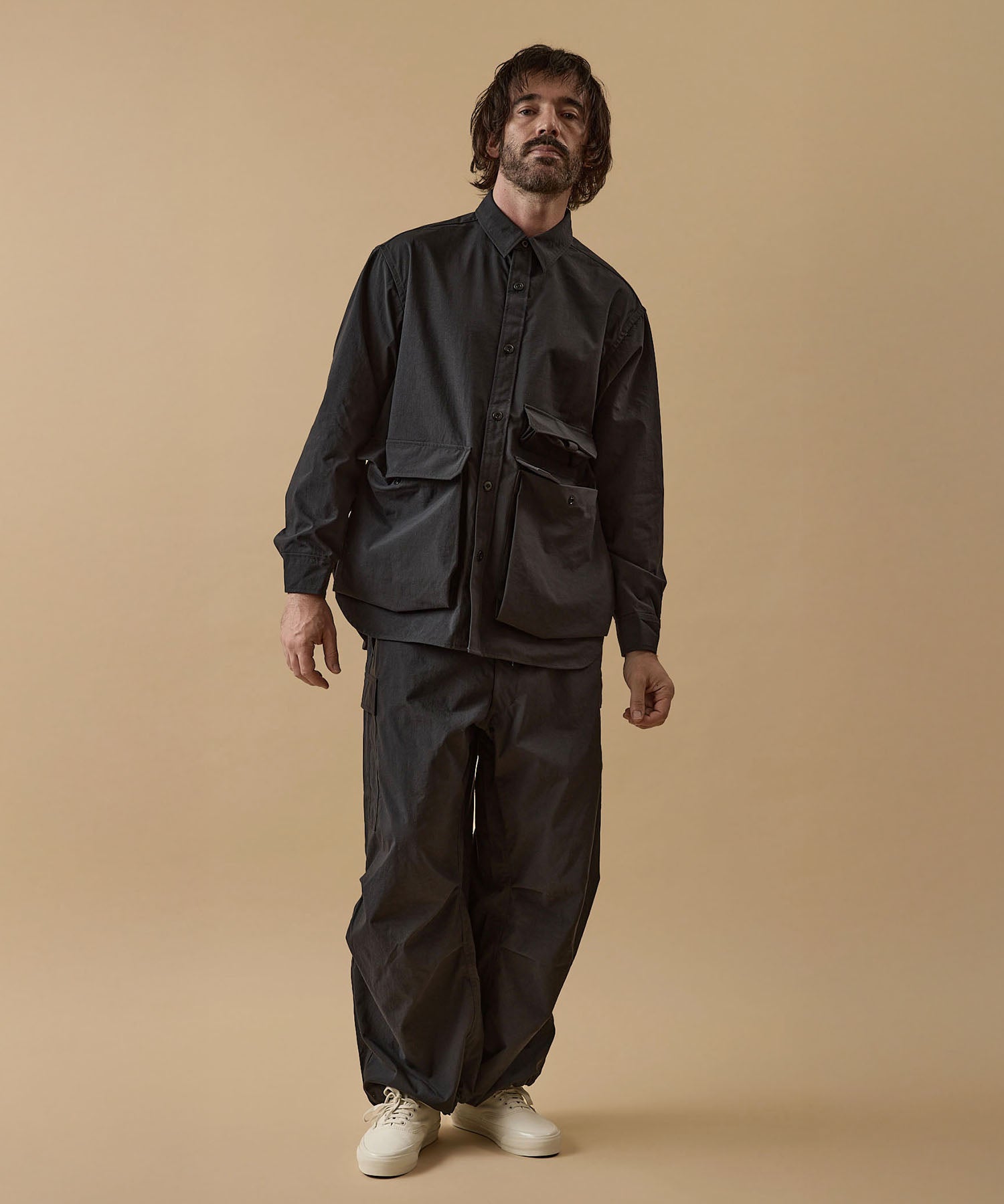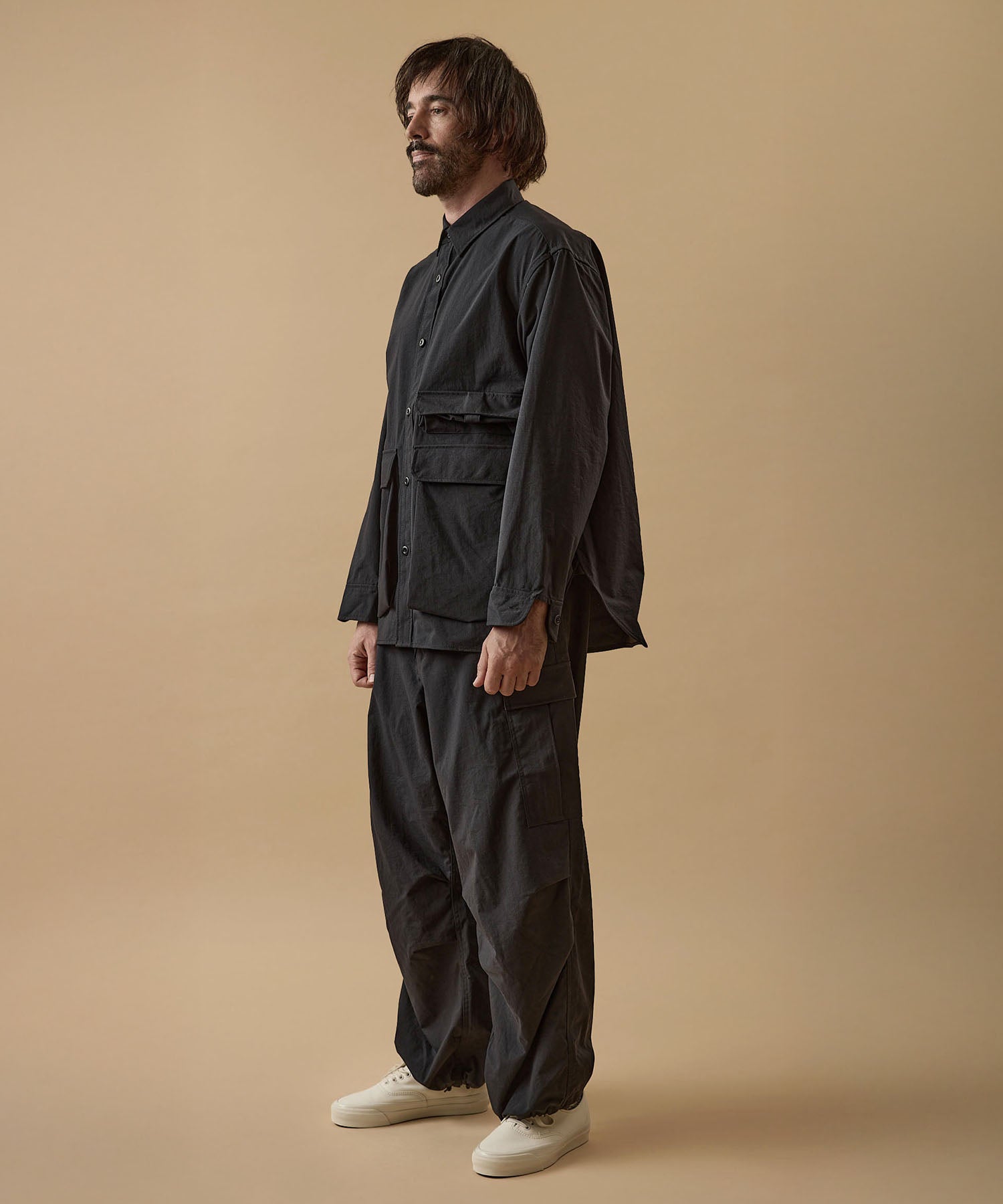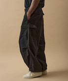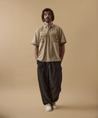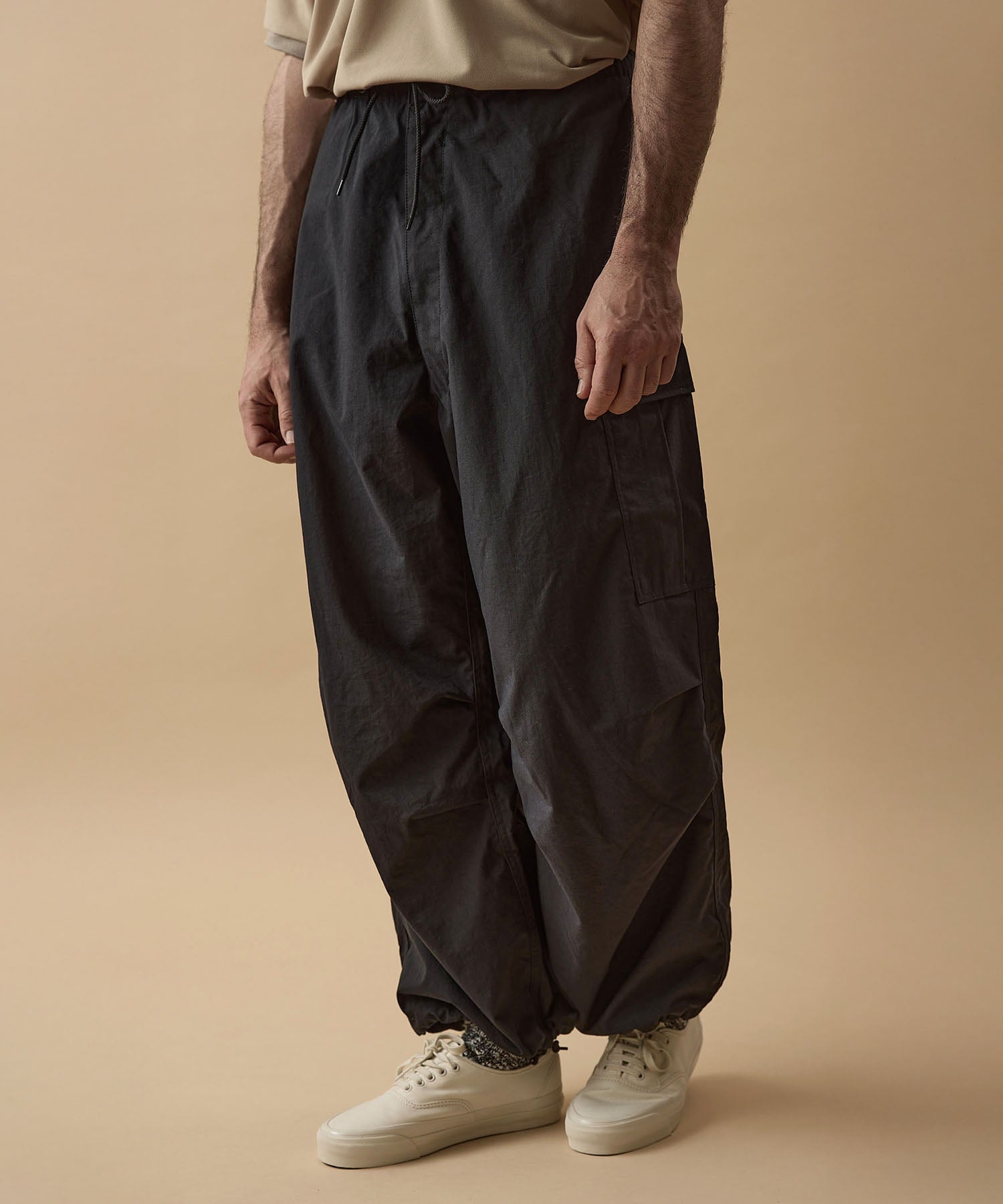しっかりとした硬さと張りがあり、平織りのコットンかのような重厚に見えるイメージでも、ナイロン100%で軽く、丈夫な素材。 張りと表面の凸凹により張り付かず肌から離れるので暑苦しい感じがありません。 ヴィンテージっぽいワッシャー感のある加工を施したこの素材は 初期撥水し透湿機能もあるまさに呼吸するテキスタイル。 服の中の湿気を外に出してくれるので、じめじめした季節もストレスフリーに過ごせます。 米軍M-51をベースにしたカーゴパンツはシャツ同様に大容量のポケットワーク。 オーバーサイズシルエットでボトムにボリュームを持たせています。 左ポケットフラップにINDUSTRIAL GARMENTSをテーマとしたさりげないロゴプリント。シックなグレーと定番のブラック。