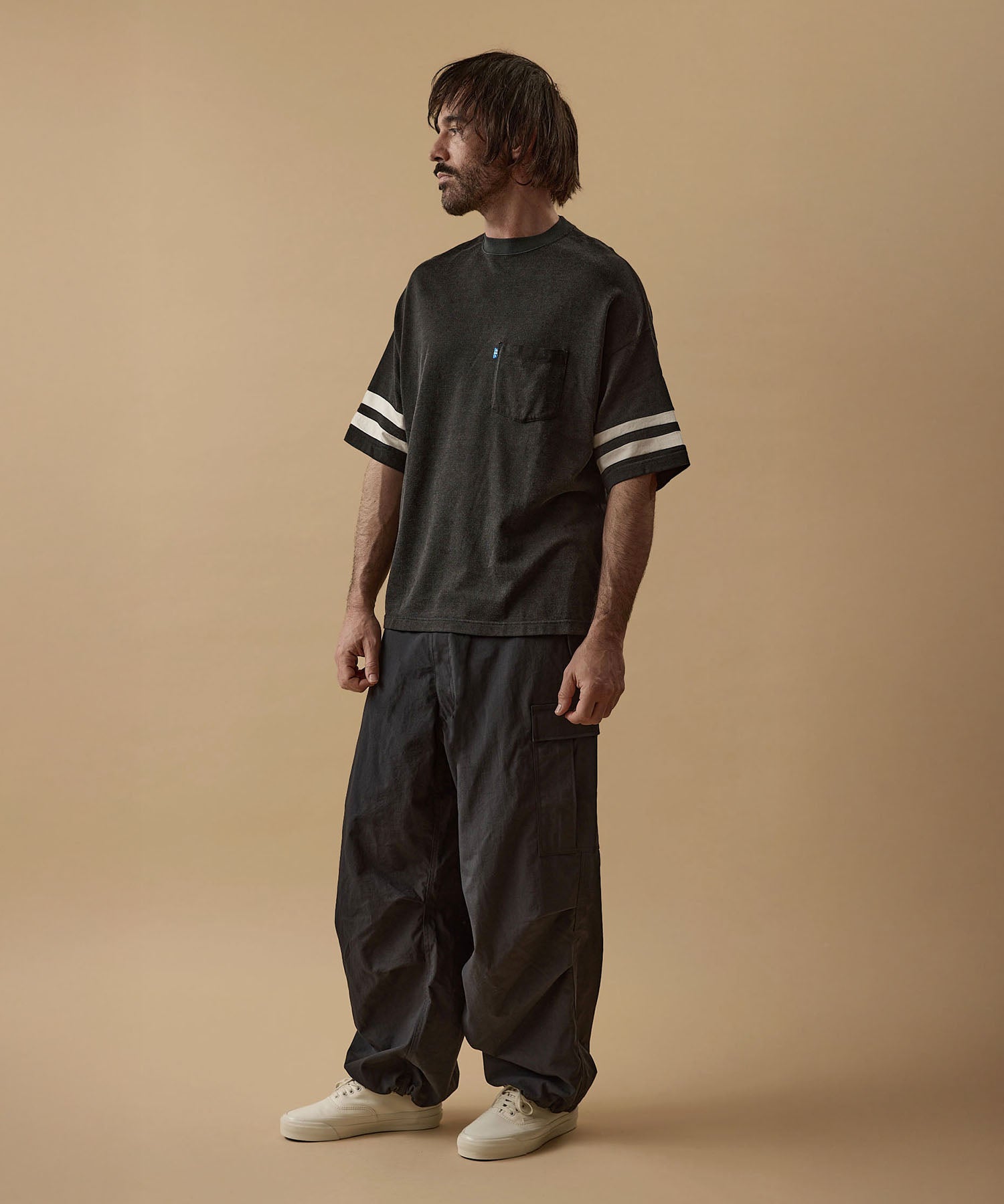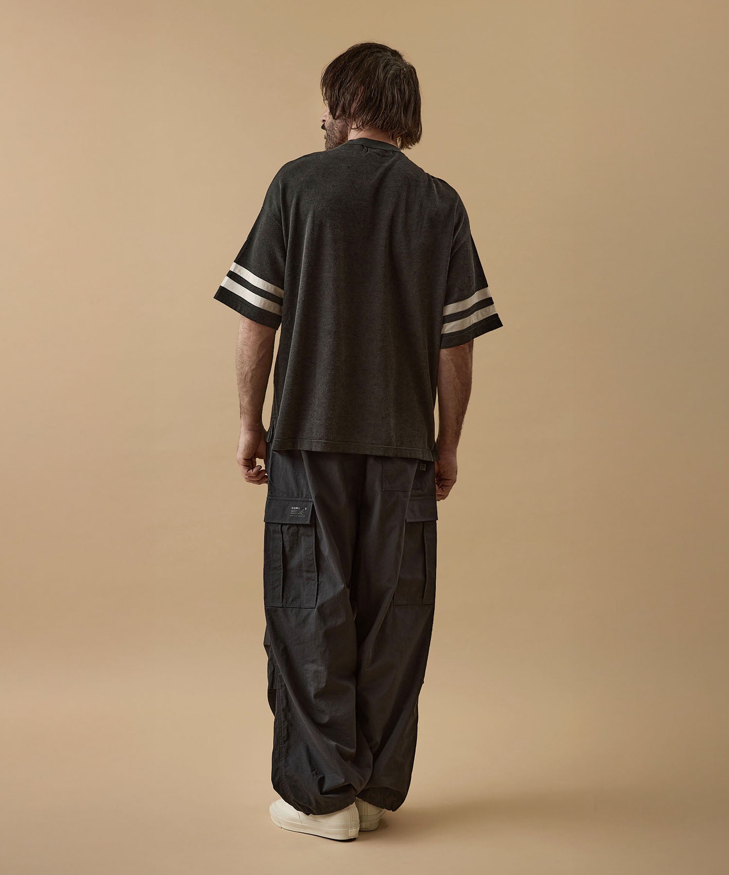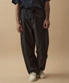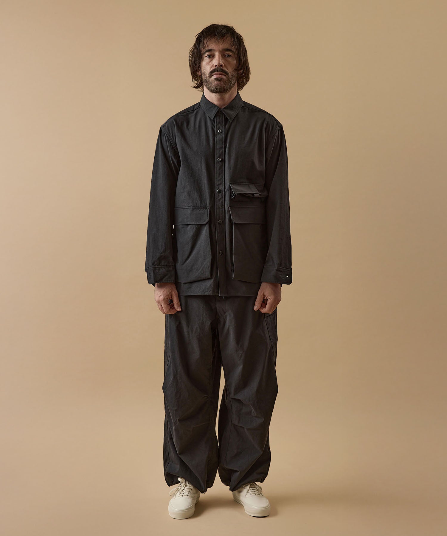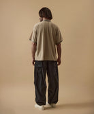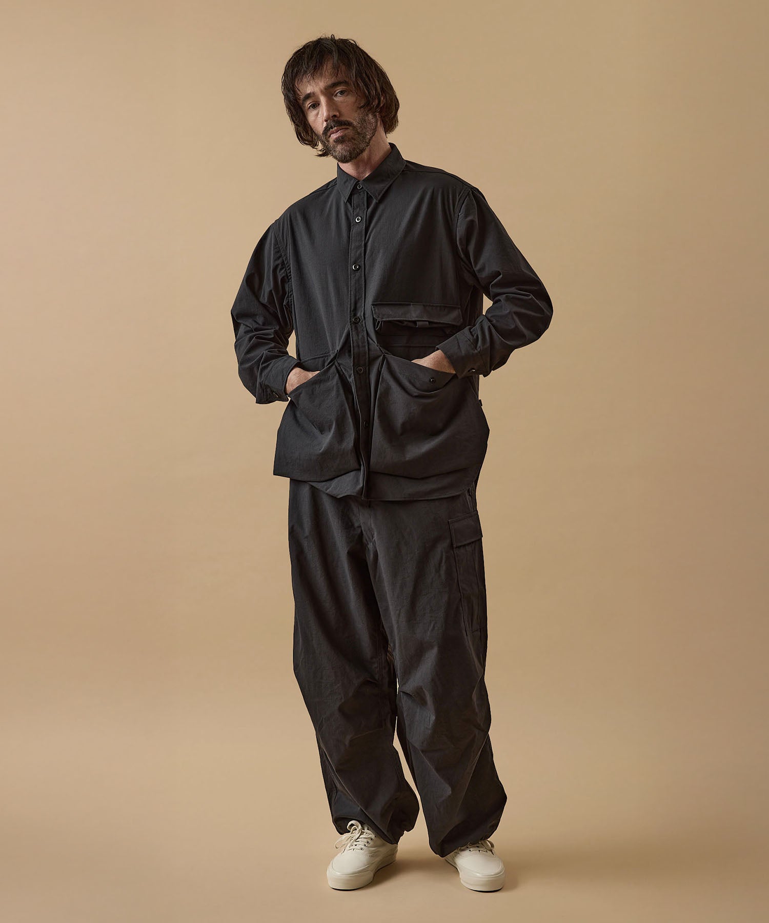 しっかりとした硬さと張りがあり、平織りのコットンかのような重厚に見えるイメージでも、ナイロン100%で軽く、丈夫な素材。 張りと表面の凸凹により張り付かず肌から離れるので暑苦しい感じがありません。 ヴィンテージっぽいワッシャー感のある加工を施したこの素材は 初期撥水し透湿機能もあるまさに呼吸するテキスタイル。 服の中の湿気を外に出してくれるので、じめじめした季節もストレスフリーに過ごせます。 米軍M-51をベースにしたカーゴパンツはシャツ同様に大容量のポケットワーク。 オーバーサイズシルエットでボトムにボリュームを持たせています。 左ポケットフラップにINDUSTRIAL GARMENTSをテーマとしたさりげないロゴプリント。シックなグレーと定番のブラック。