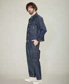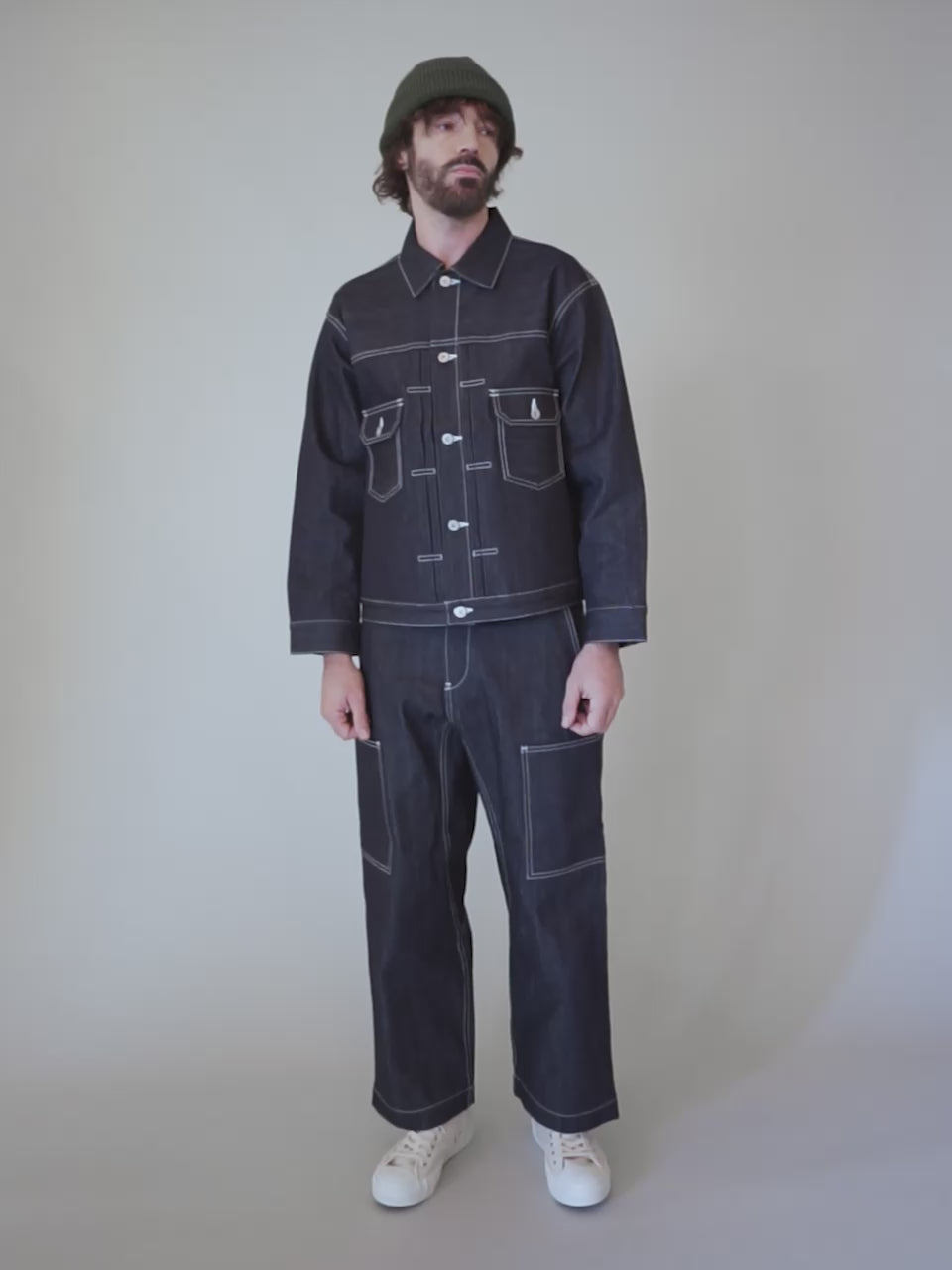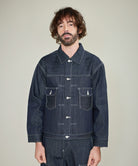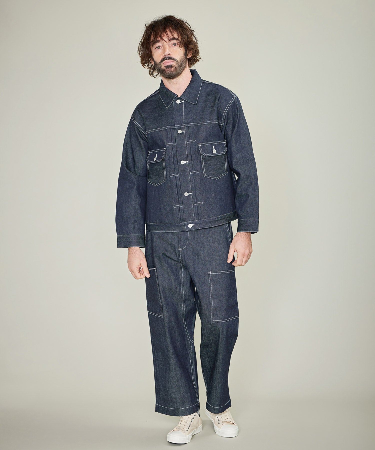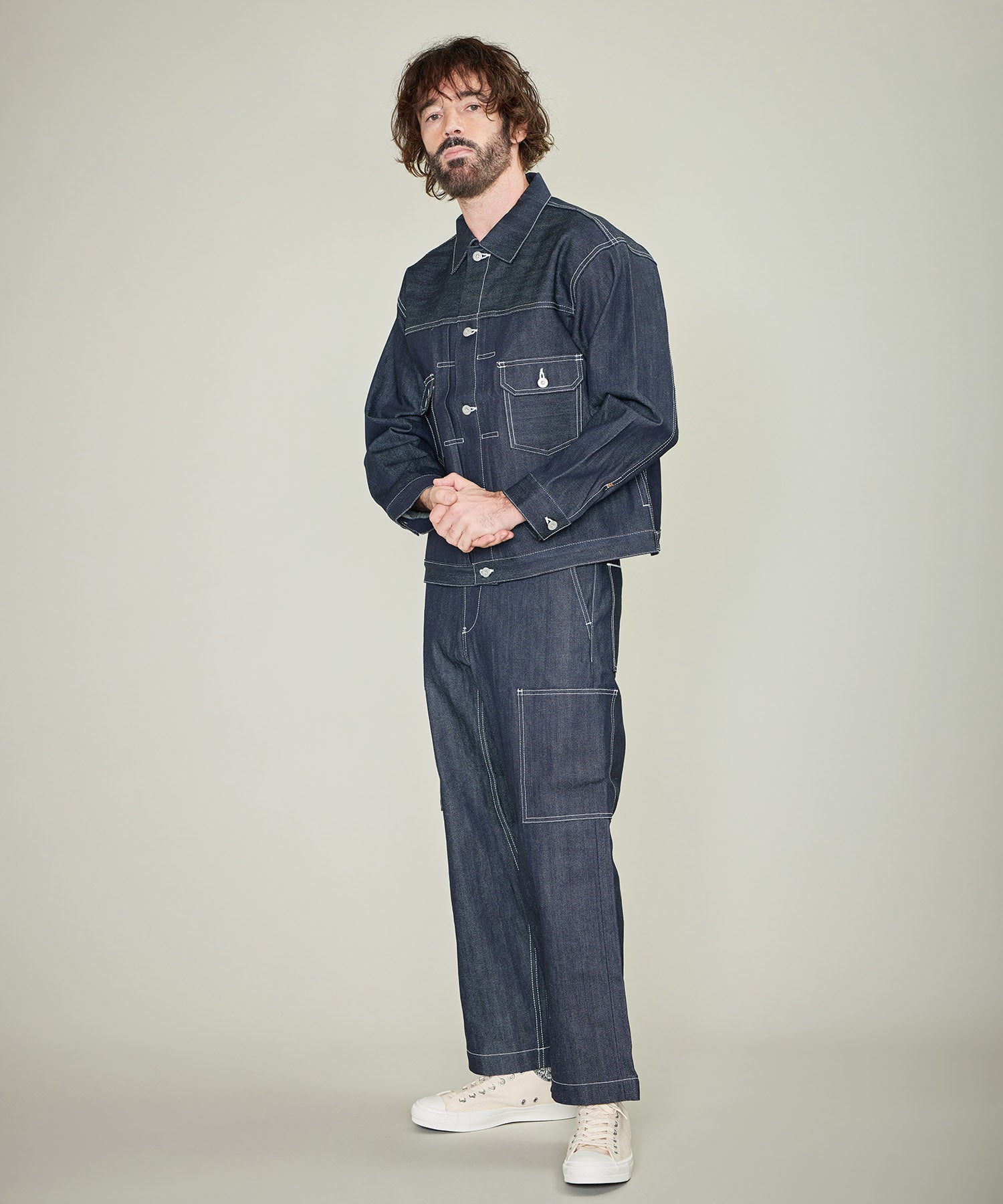 GORDON MILLERがレミレリーフへ別注したデニムのジャケット。 インダストリアル感漂うホワイトステッチ。 1950年代のいわゆる”セカンド”と言われるモデルを踏襲し、 オーバーサイズのボックスシルエットになっています。 胸周りに立体的なゆとりを確保し、動きやすくするフロントのダブルプリーツ。 両胸にはシンメトリーに配したフラップポケット。 サイド縫い目にはサイドポケットを配し、内側にもポケットがあり、 収納力のあるアウターに仕上がっています。 サイドにはタックボタン式のアジャスターがあるので、シルエット、フィット感を変える事が可能です。