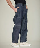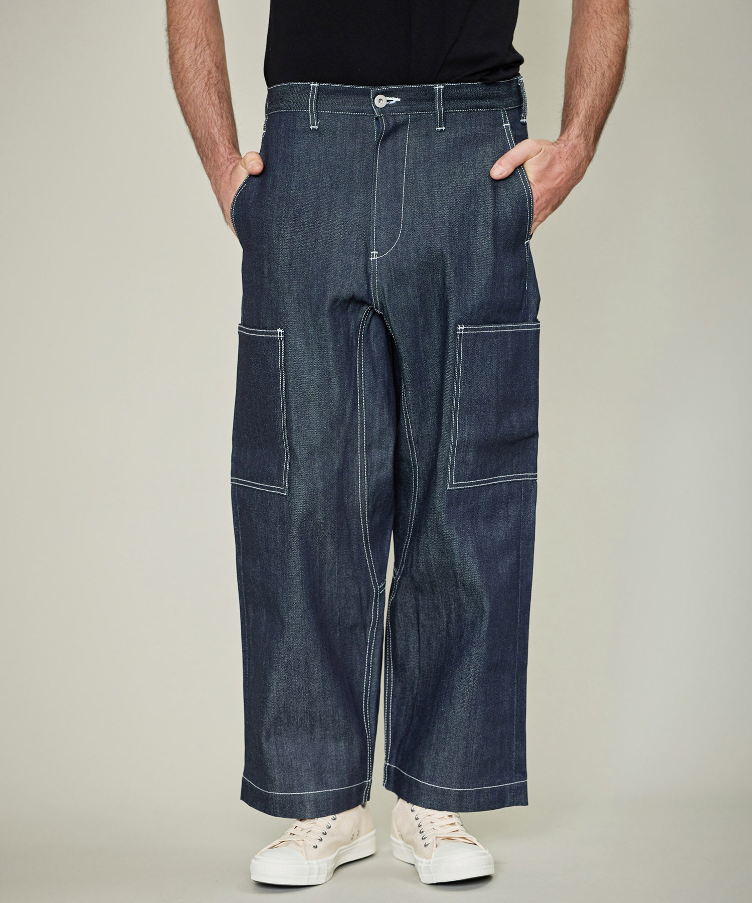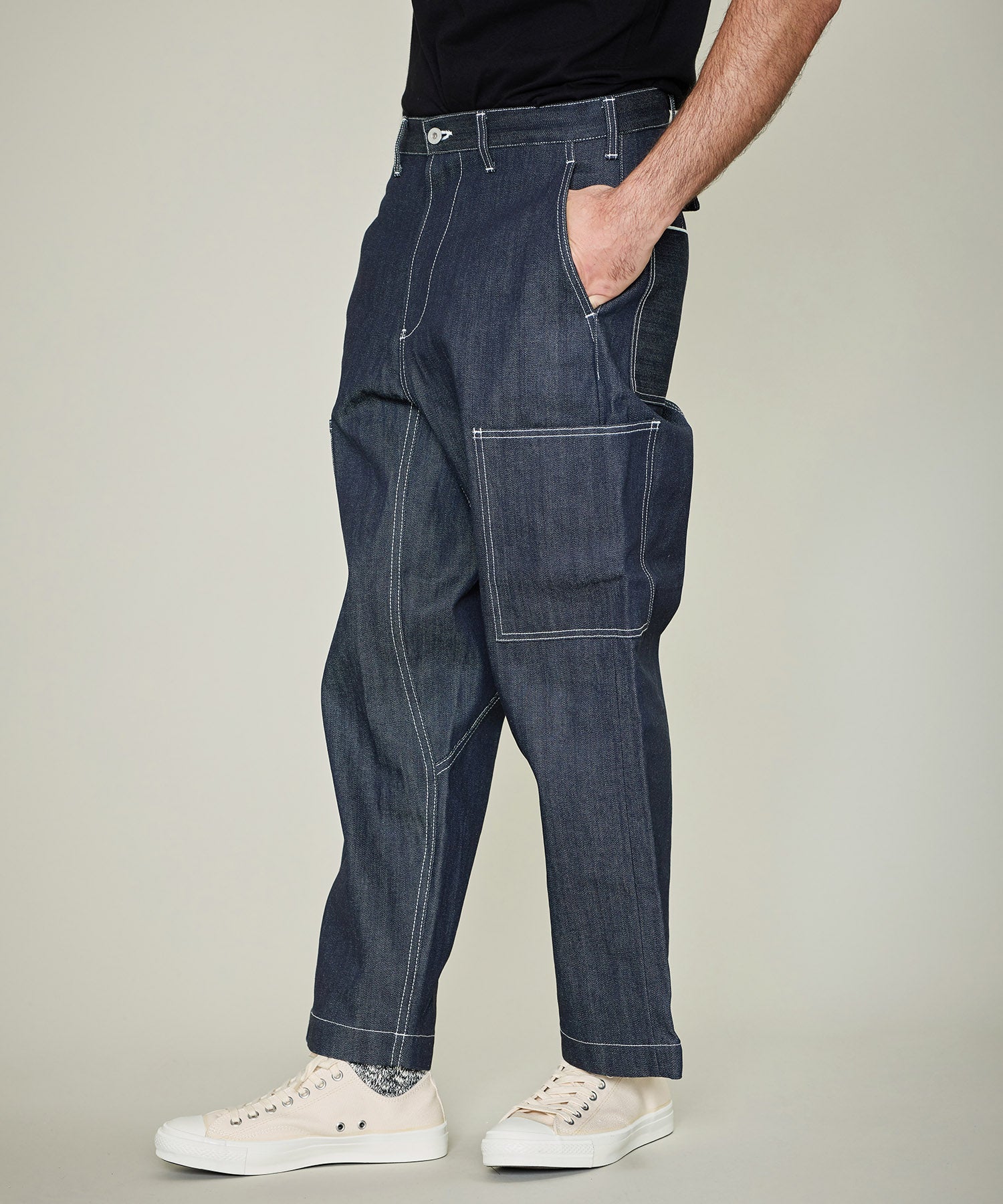 GORDON MILLERがレミレリーフへ別注したデニムのカーゴパンツ。 インダストリアル感漂うホワイトステッチ。 オーバーサイズのシルエットでゆったり感はありつつ、 タックボタン式のシンチバックにより、ウエストの調整が可能。 ベルトループも配しているので、ベルトを付けてのコーディネートも可能です。 側面にシンプルなカーゴポケットを配し、股は生地あてがされワークテイストも程よくアレンジがされています。 生地は岡山製の白ミミの14ozセルビッジデニム。洗いを一度もかけていないリジッドデニム(生デニム)。 過去の著名なデニムを研究した再現したこの生地は、異なる数種のムラの形状がある糸を使い、 当時の雰囲気が感じられるムラ感をバランスよく再現。 使用していく事で色落ちがされていく事で、ムラ感も感じられ味わいが深くなっていきます。
