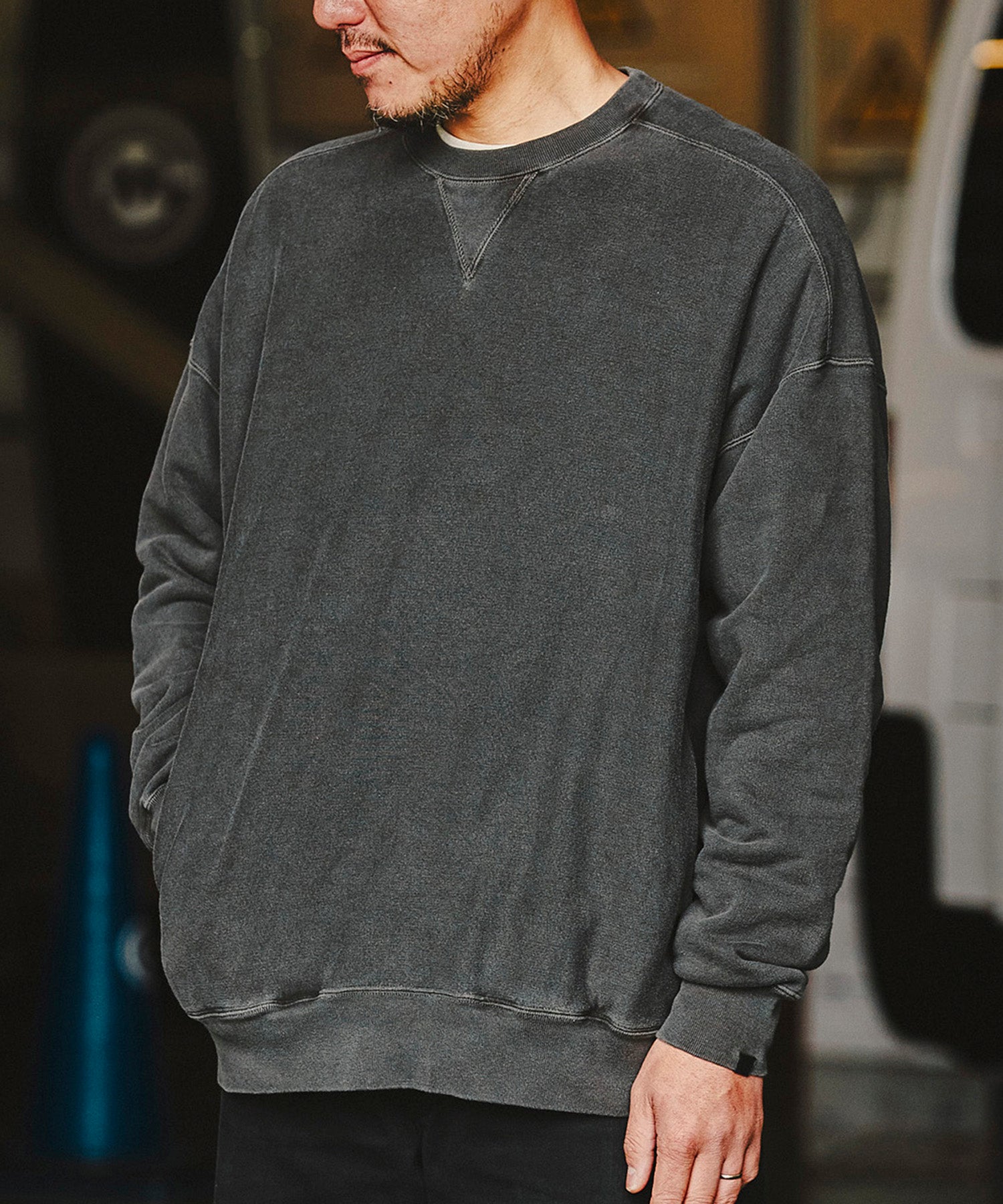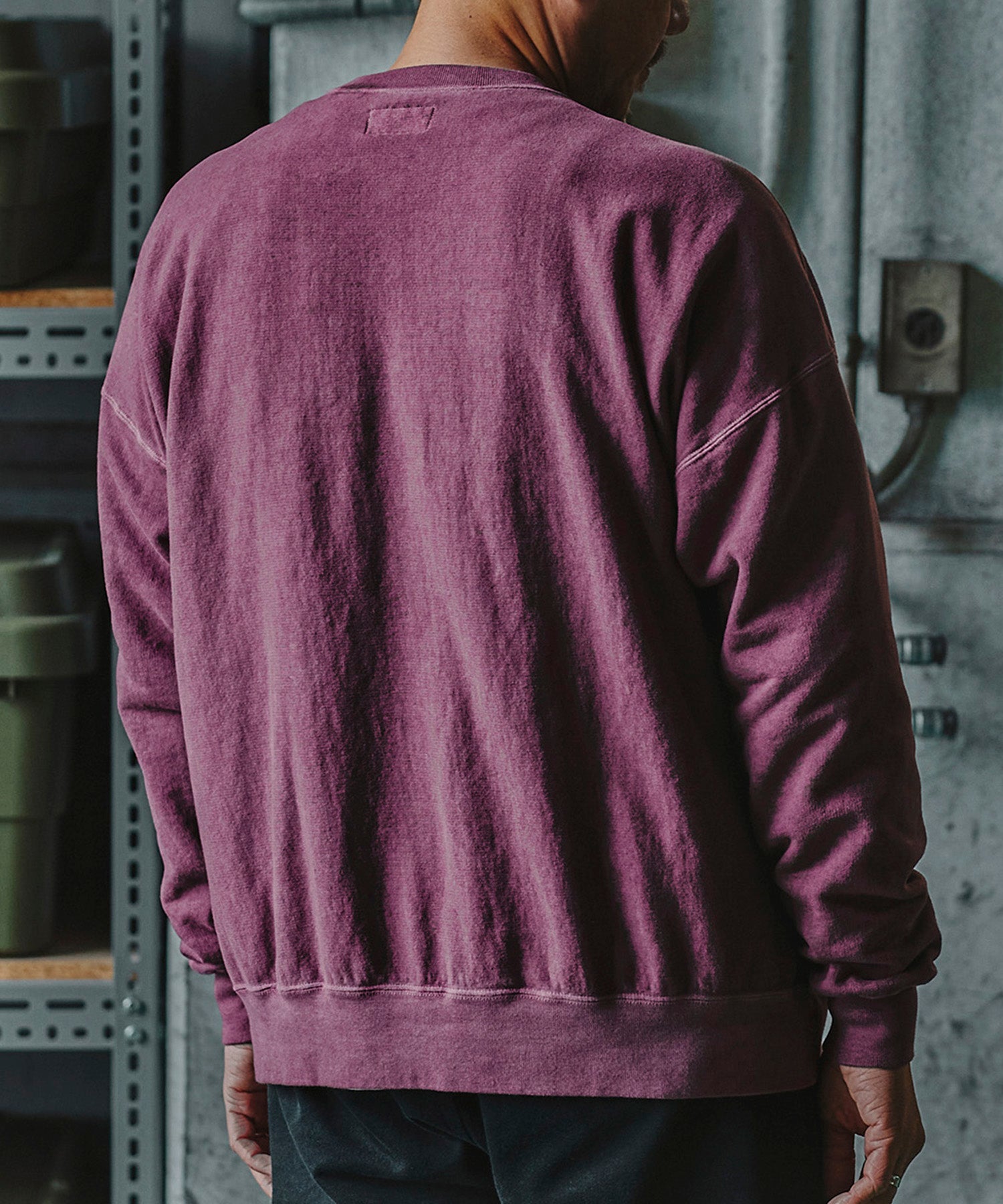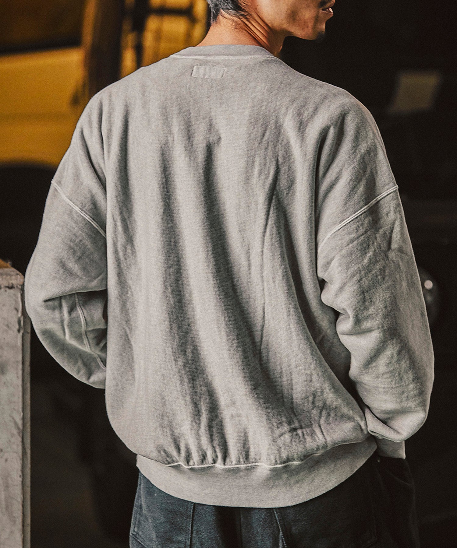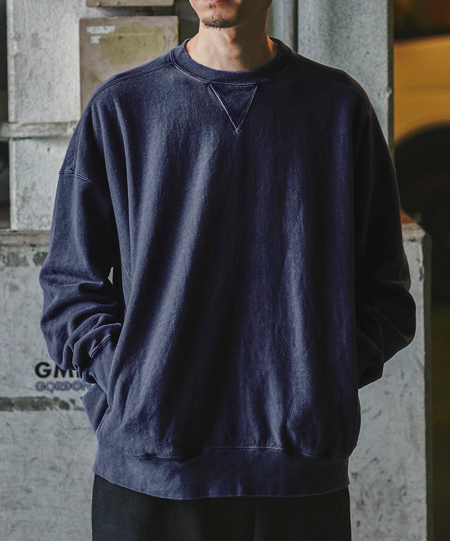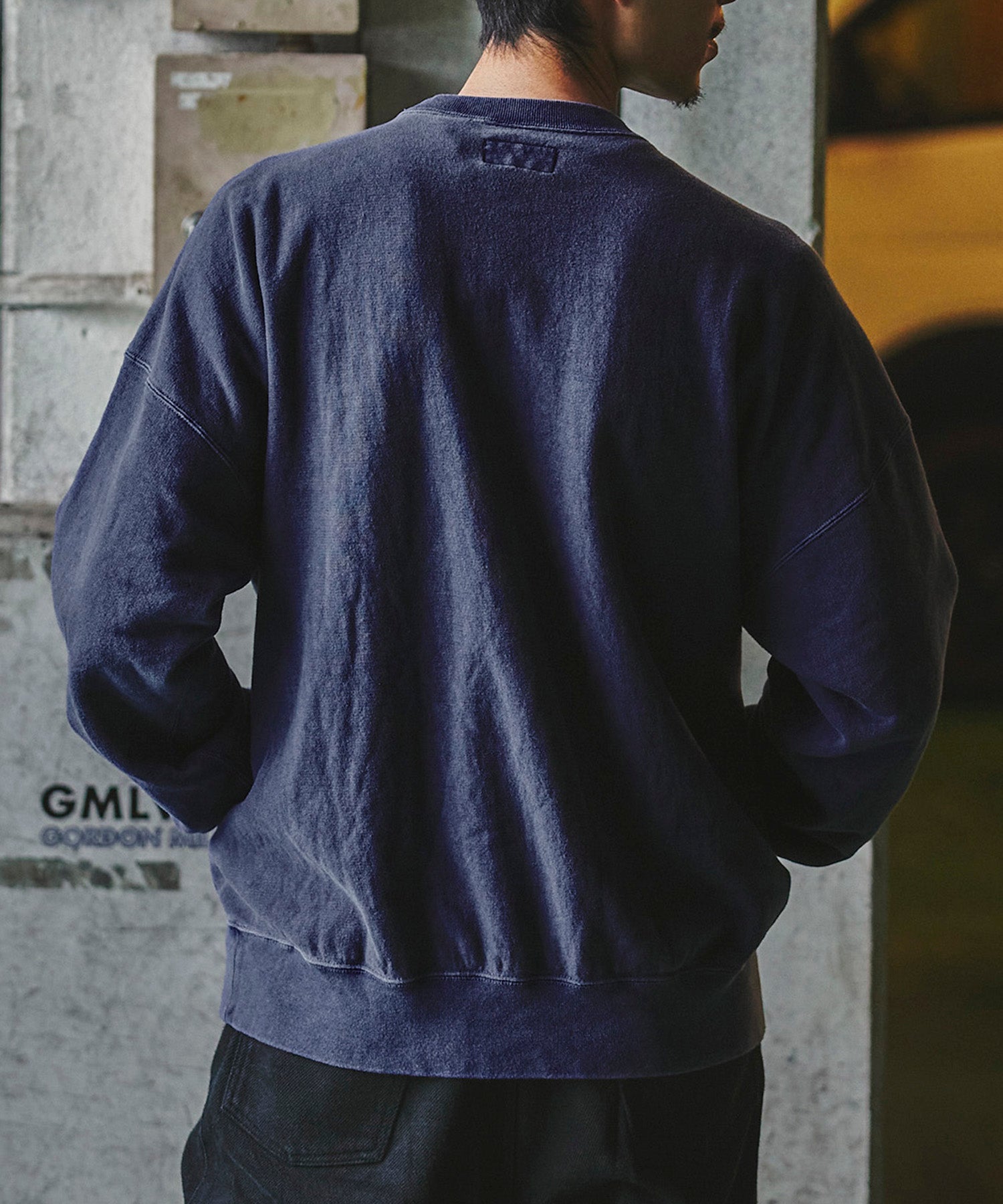袖にはピスネームを配し首後ろにはGOOD ONの特別モデルの証でもあるネームがついています。発色が良く上品な仕上がりのReactive dye(反応染め)カラーは、素材本来の柔らかくナチュラルな風合い感を楽しむことができ、スウェット本来のシンプルな見た目と、様々なスタイルへの着回しやすさが特徴。スウェット特有の生地やステッチの凹凸に色の濃淡が際立つPigment Dye(顔料染め)カラーは他にはない味のある表情が特徴で、洗濯の度に表面から徐々に色褪せしさらに風合いを増していくので、長く愛用するほどに上質なビンテージ品のように印象が変わっていきます。
