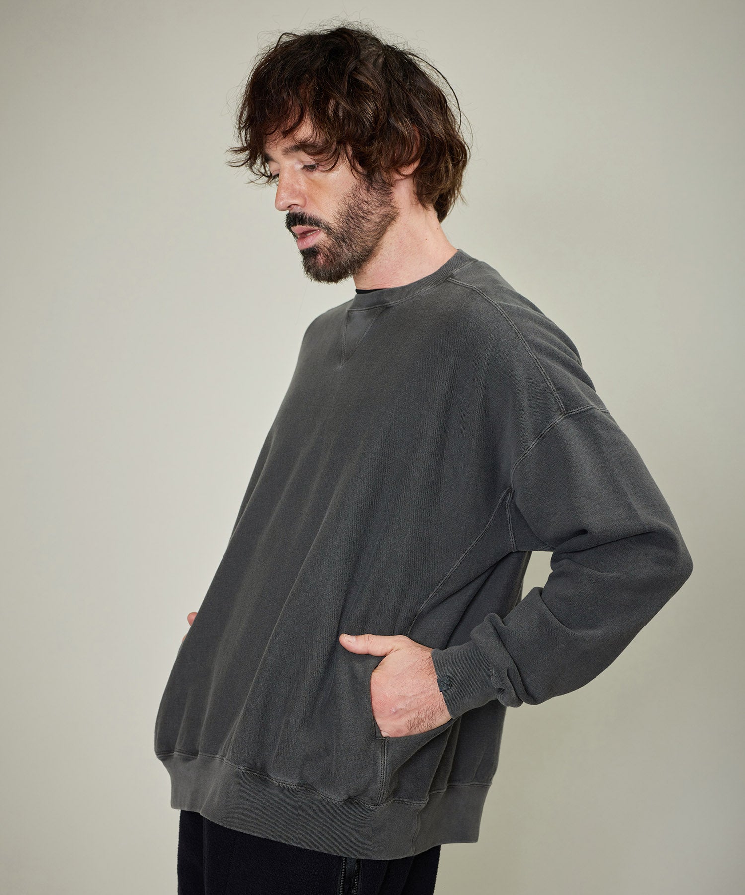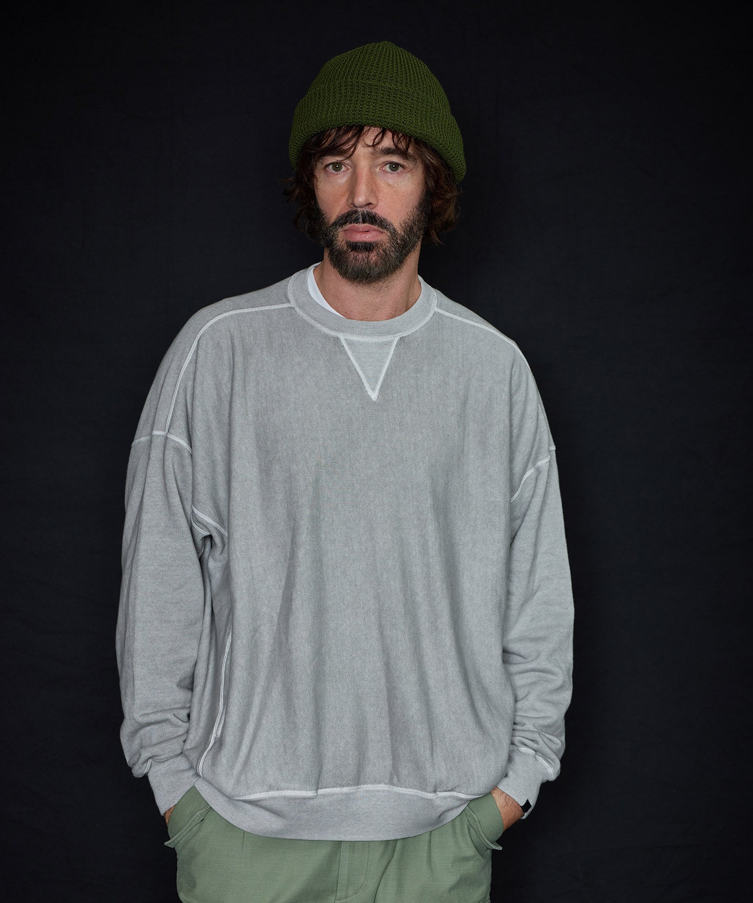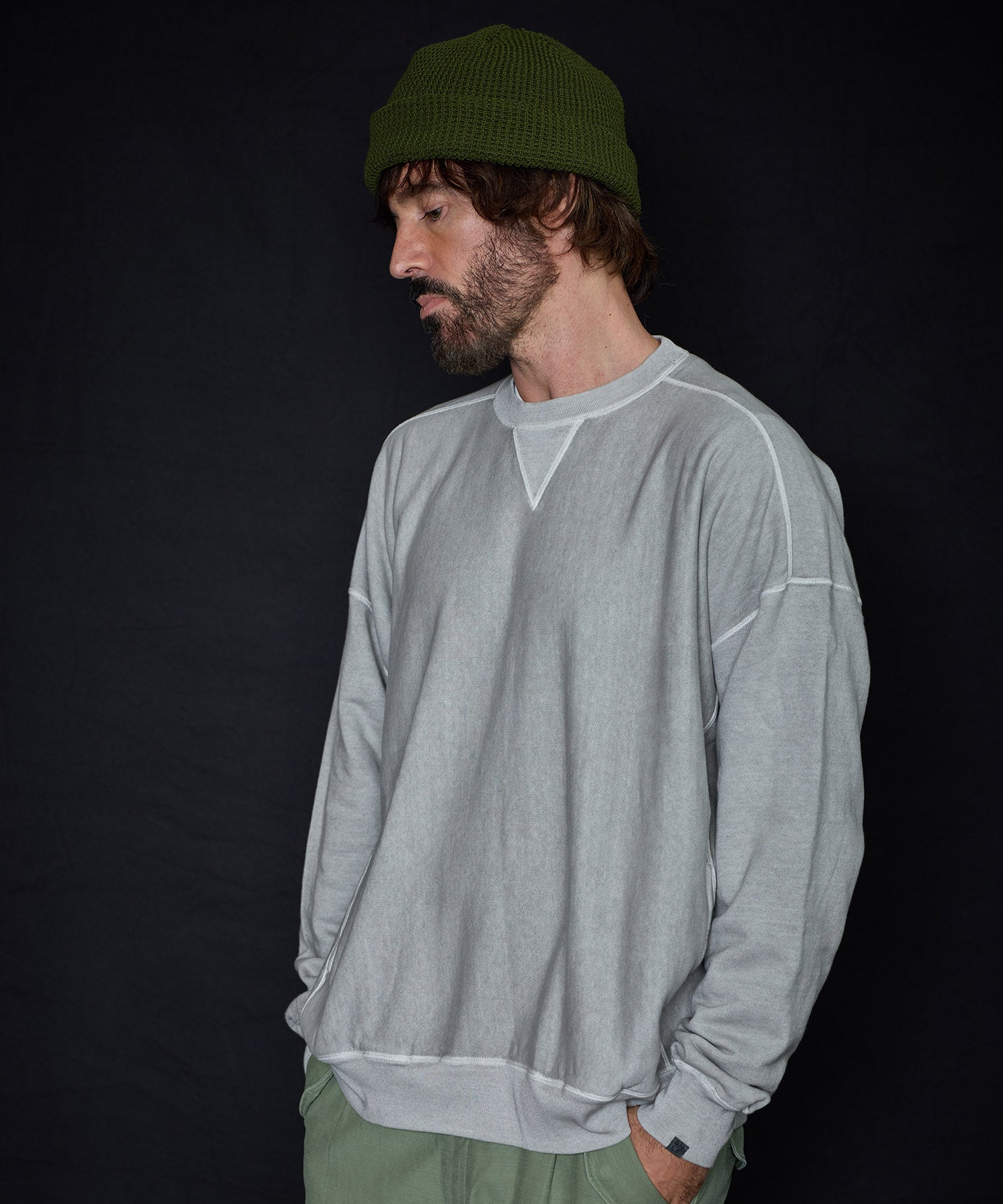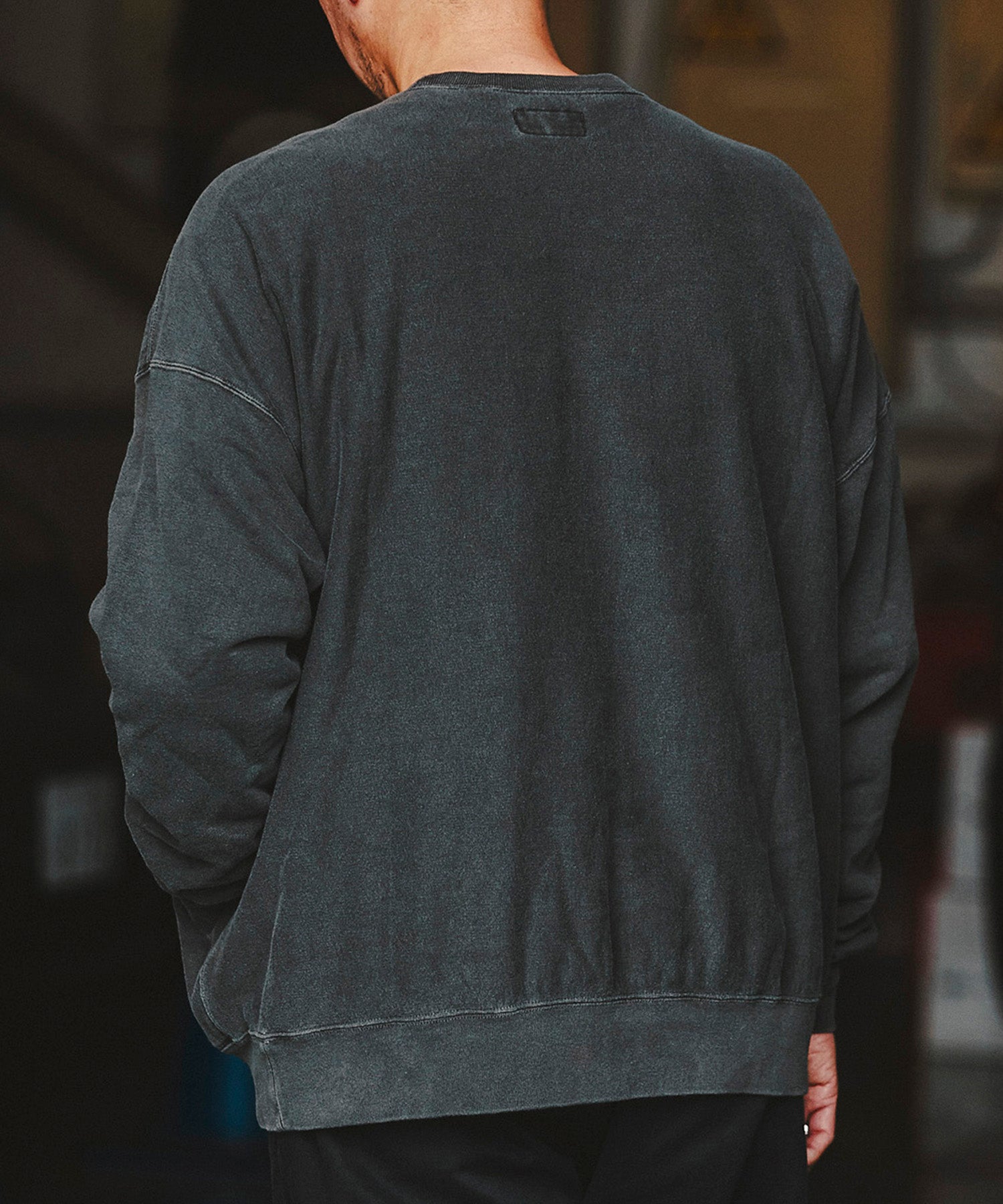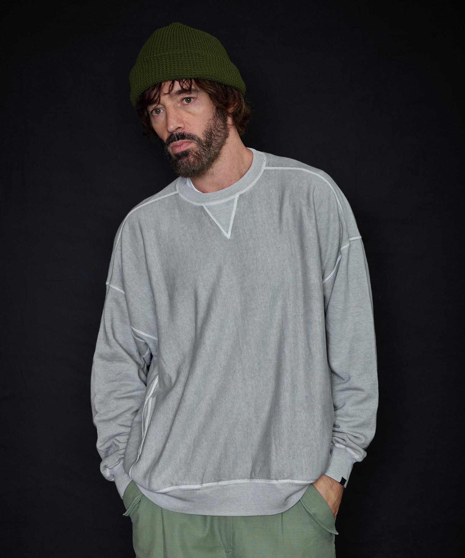 袖にはピスネームを配し首後ろにはGOOD ONの特別モデルの証でもあるネームがついています。発色が良く上品な仕上がりのReactive dye(反応染め)カラーは、素材本来の柔らかくナチュラルな風合い感を楽しむことができ、スウェット本来のシンプルな見た目と、様々なスタイルへの着回しやすさが特徴。スウェット特有の生地やステッチの凹凸に色の濃淡が際立つPigment Dye(顔料染め)カラーは他にはない味のある表情が特徴で、洗濯の度に表面から徐々に色褪せしさらに風合いを増していくので、長く愛用するほどに上質なビンテージ品のように印象が変わっていきます。