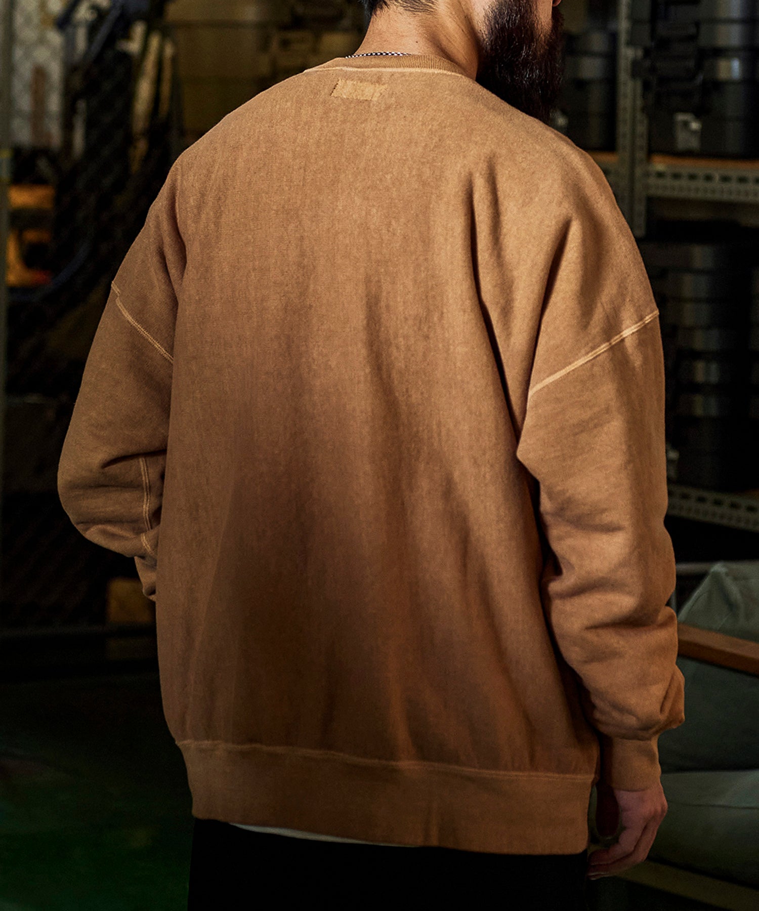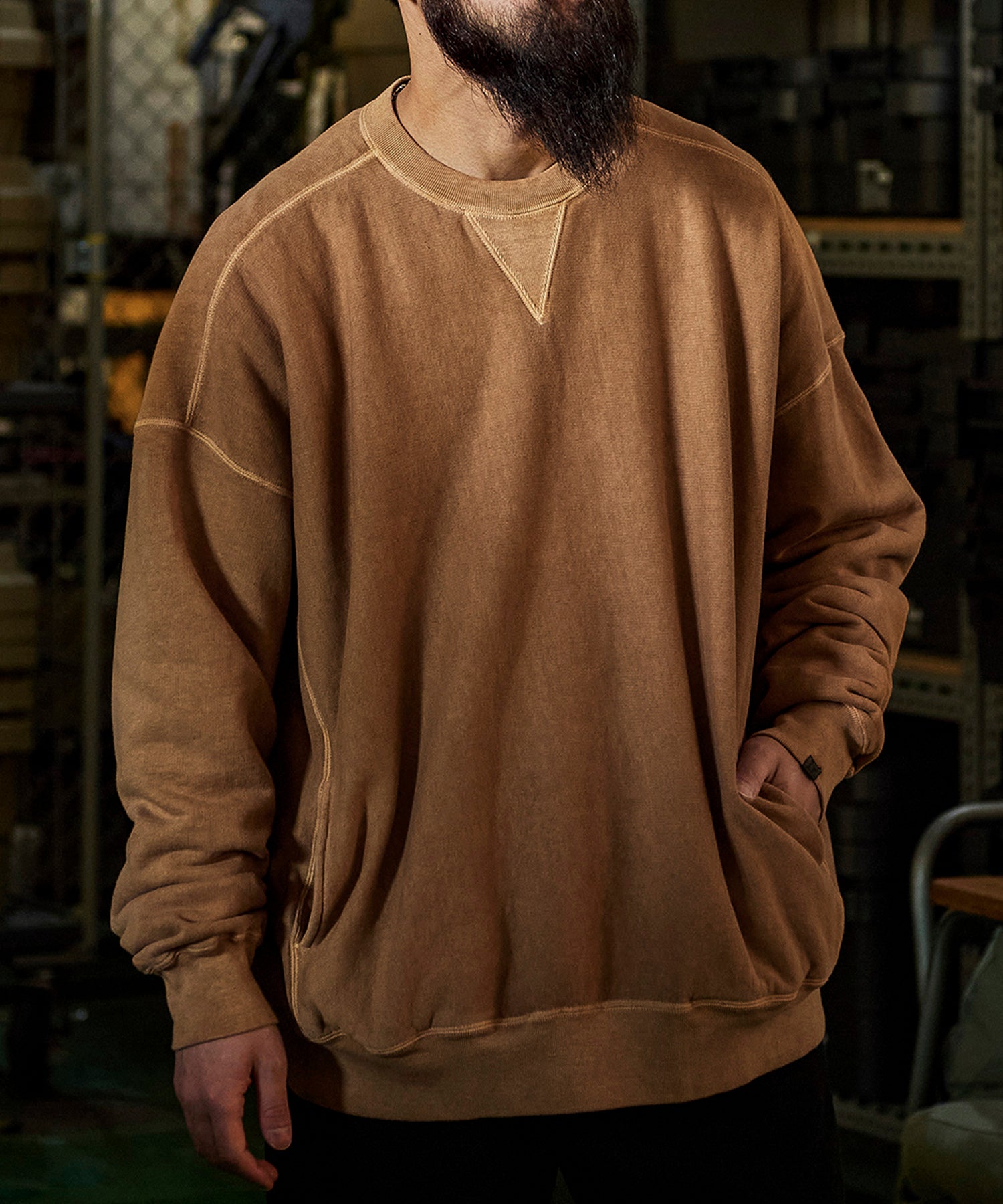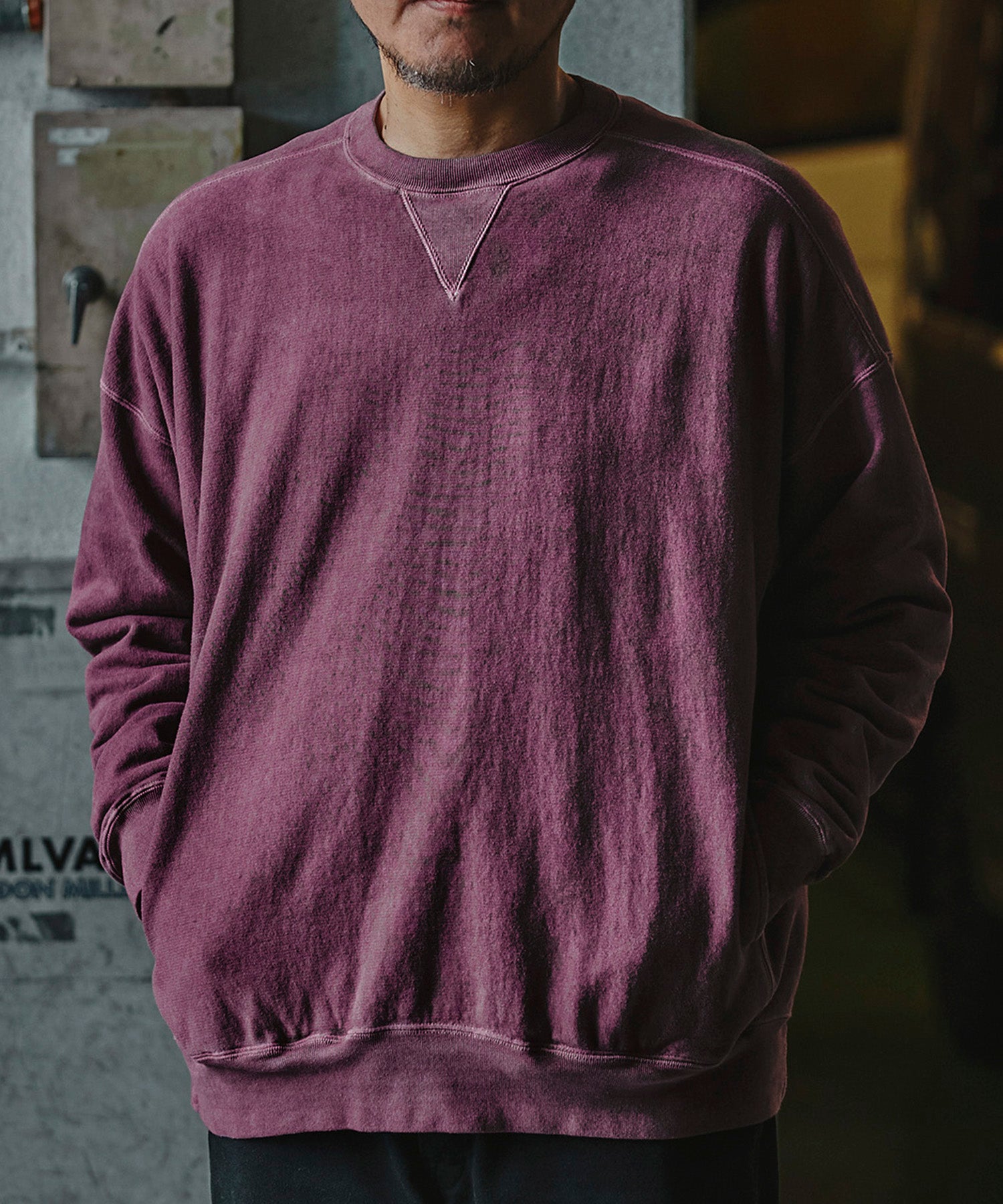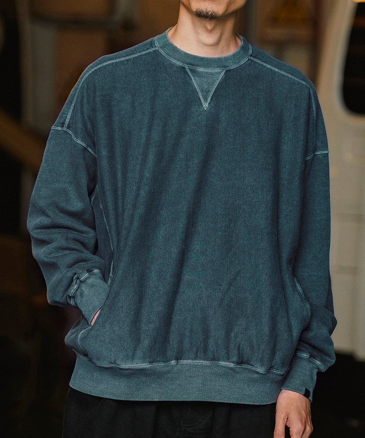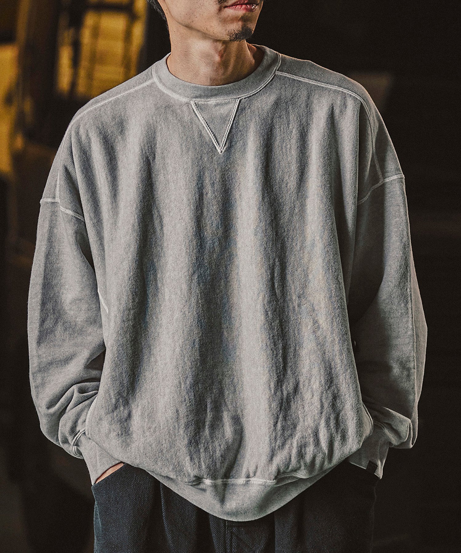 袖にはピスネームを配し首後ろにはGOOD ONの特別モデルの証でもあるネームがついています。発色が良く上品な仕上がりのReactive dye(反応染め)カラーは、素材本来の柔らかくナチュラルな風合い感を楽しむことができ、スウェット本来のシンプルな見た目と、様々なスタイルへの着回しやすさが特徴。スウェット特有の生地やステッチの凹凸に色の濃淡が際立つPigment Dye(顔料染め)カラーは他にはない味のある表情が特徴で、洗濯の度に表面から徐々に色褪せしさらに風合いを増していくので、長く愛用するほどに上質なビンテージ品のように印象が変わっていきます。