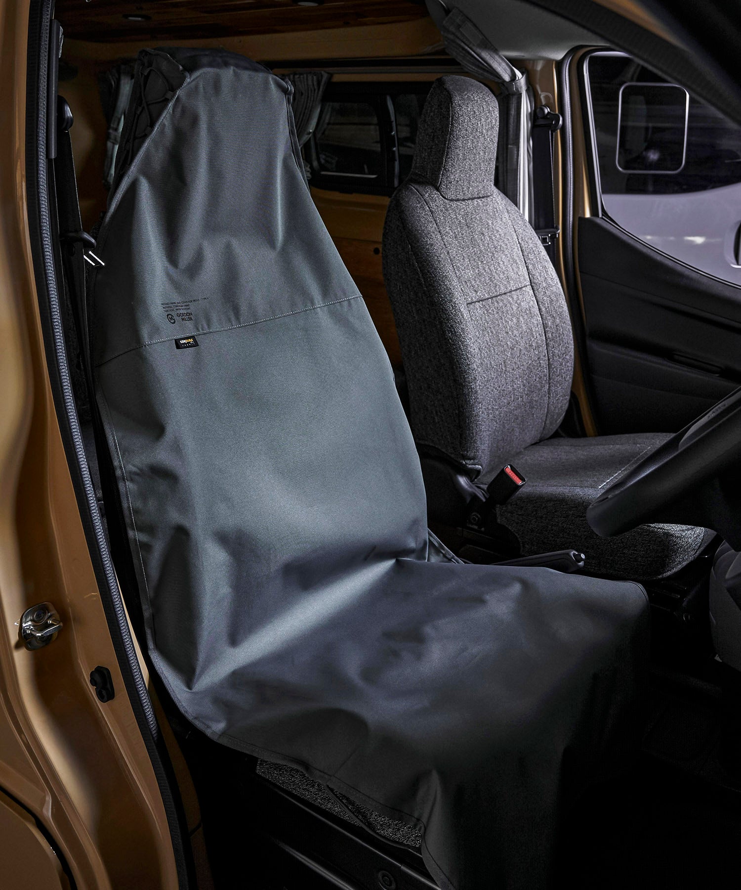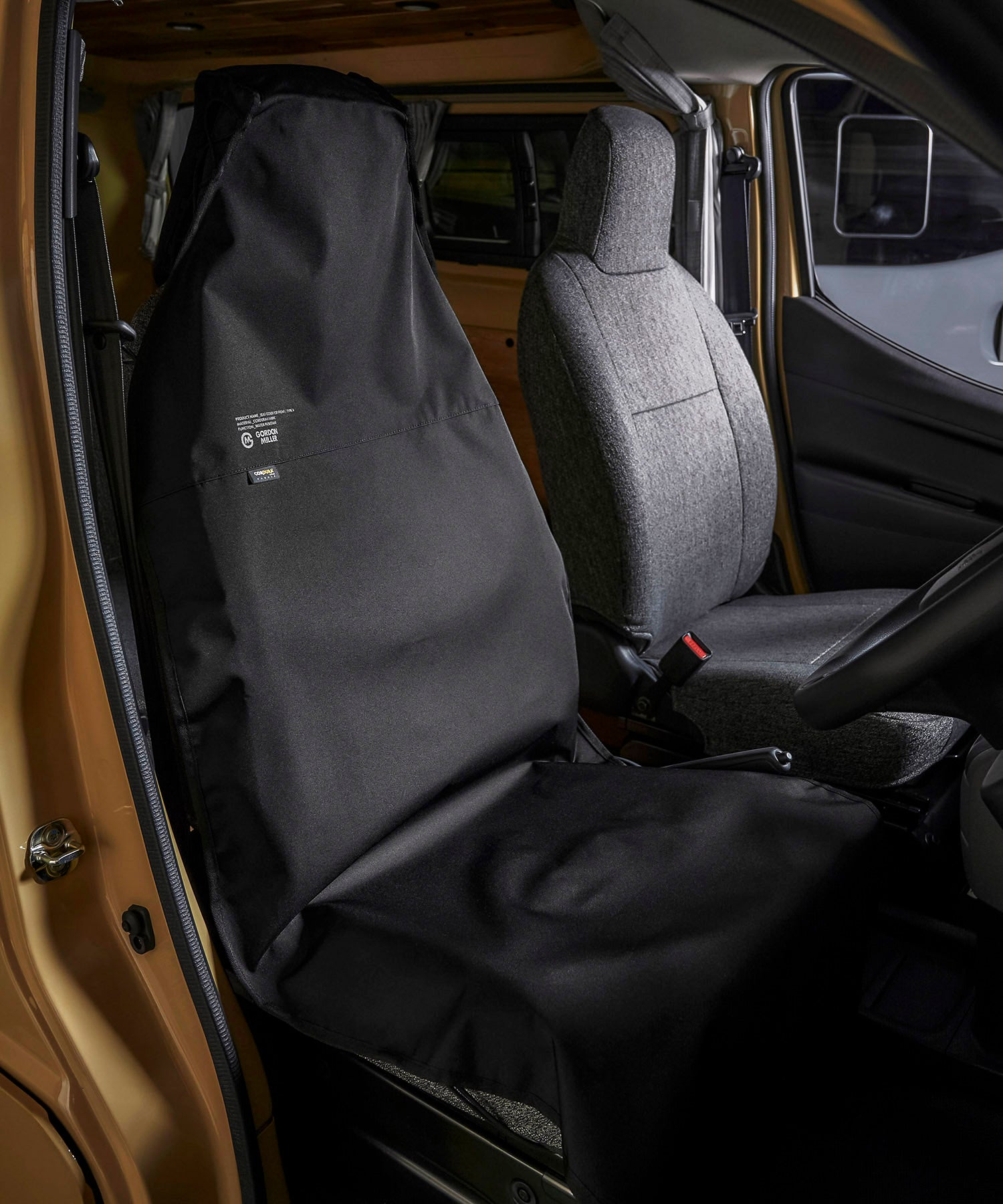 摩擦・引裂き・擦り切れに対する強度に優れ、生地表面には撥水加工が施されたGORDON MILLERオリジナルのCORDURA® FABRICを使用したシートカバーです。 305デニールオックスに耐久撥水加工を施すとともに裏面にはPVCコーティングがされた2レイヤー構造で軽量でありながら高い強度を誇ります。防水性に優れており、サーフィンをしてそのまま車に乗り込んでも生地自体は水を通しません。防汚性にも強く、雨水で濡れたペットをそのまま乗せても泥や土の汚れからガード出来、ペットがいるご家庭におすすめです。また、汎用性にも優れているため幅広い車種に対応しております。シートはかけるだけの装着方法で見た目もおしゃれで簡単に脱着が可能。 従来品(※1)よりも全長を長くしシートの前方下部分までを広くカバー。 そして裾部分にはドローコードの留め具により、煩わしい乗降時の裾ズレを軽減します。 従来品と同じく汎用性はもちろんの事、更にGORDON MILLERオリジナルのハーネス型固定システム(※2)により、シートへのフィッテイング性能が格段に向上しています。 ヘッドレスト背面にはレーザーカットされたベルクロテープにより、ワッペン等でカスタマイズしたり、カラビナ等を引っ掛ける事ができます。収納袋付きで簡単に収納出来て非常に便利なカーグッズです。