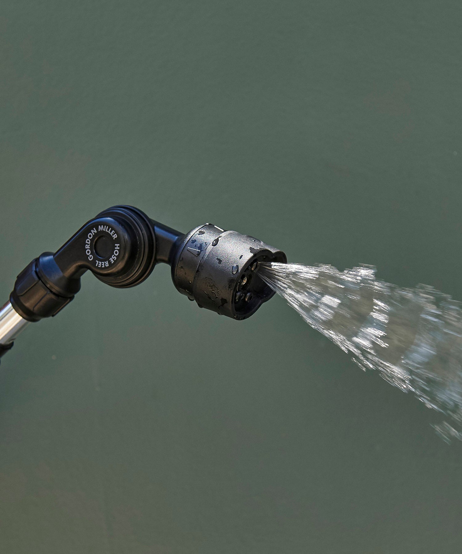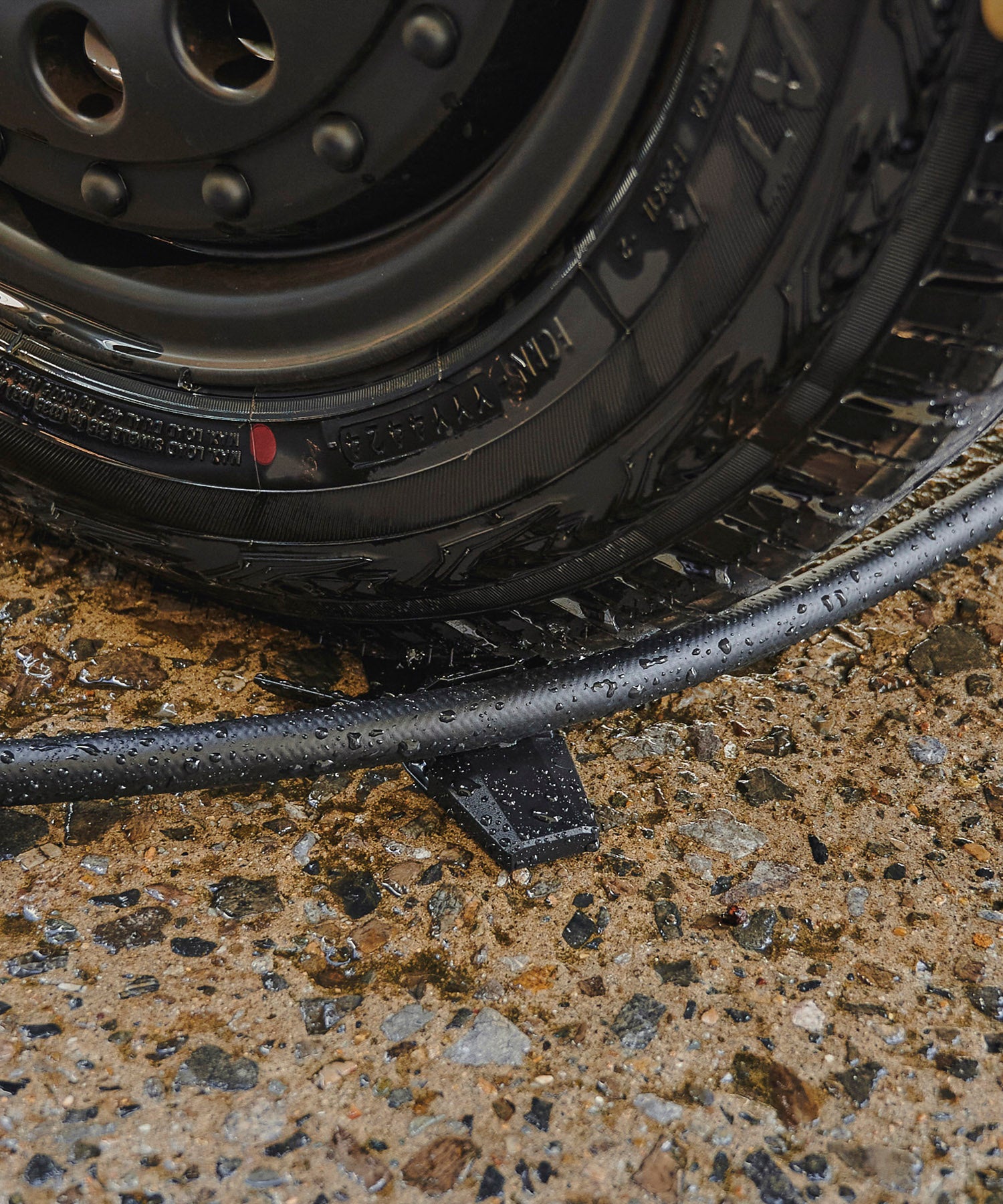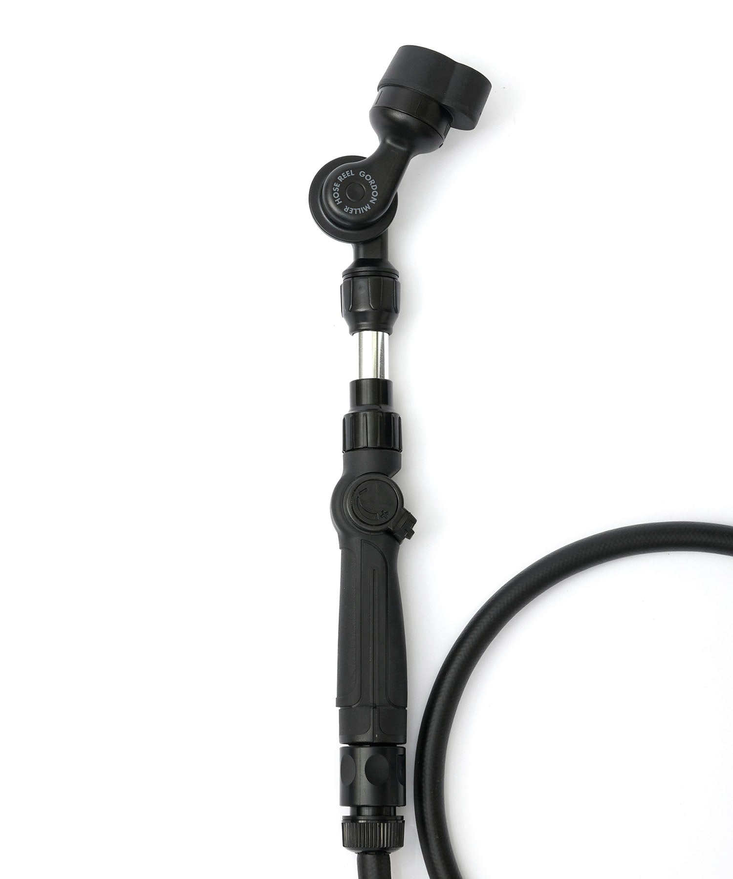 洗車に特化した新しいホースリール。ブラックに統一された直線的でカッコいいデザインは、ガレージに置きたくなるようなお気に入りギアのひとつになりそうです。ホースの改良により耐水圧がUPしたのと、絡まりにくいさらさらのホースは取り回しがしやすく、またマットなブラックがかっこいい。別パーツのホースガイド2個が付属されており、洗車時にタイヤ下に差し込むことでホースがタイヤに引っかかるのを防いでくれます。そして最大の特徴が絶妙な長さのショートノズル。ロングノズルよりも細かな作業がしやすく、洗車に特化した縦水形はジェット、ジェットワイド、フラットスリム、フラット、シャワーの5種類。先端ヘッドは270°角度調節が可能、また先端は車を傷つけにくいゴム製。水量の調節はスライドレバー式:親指だけで水量調節できるので、水の跳ね返りを防いだり、あらゆる箇所へ細かく調整可能です。タイヤ裏や角度が難しい箇所にもアプローチでき、散水作業が効率的に行えます。ノズルは本体サイドに収納できます。