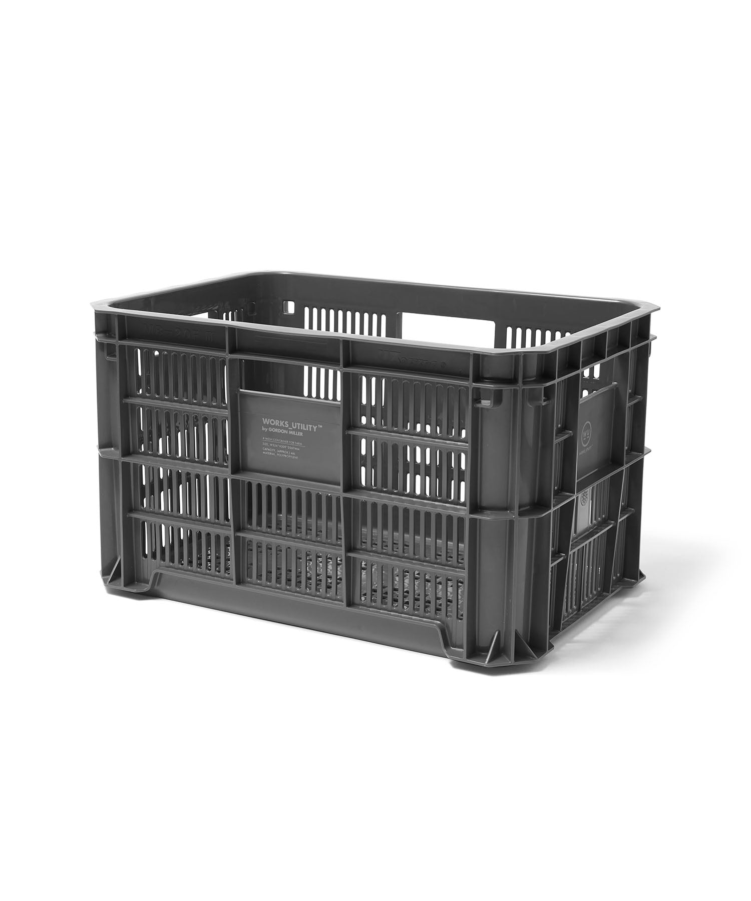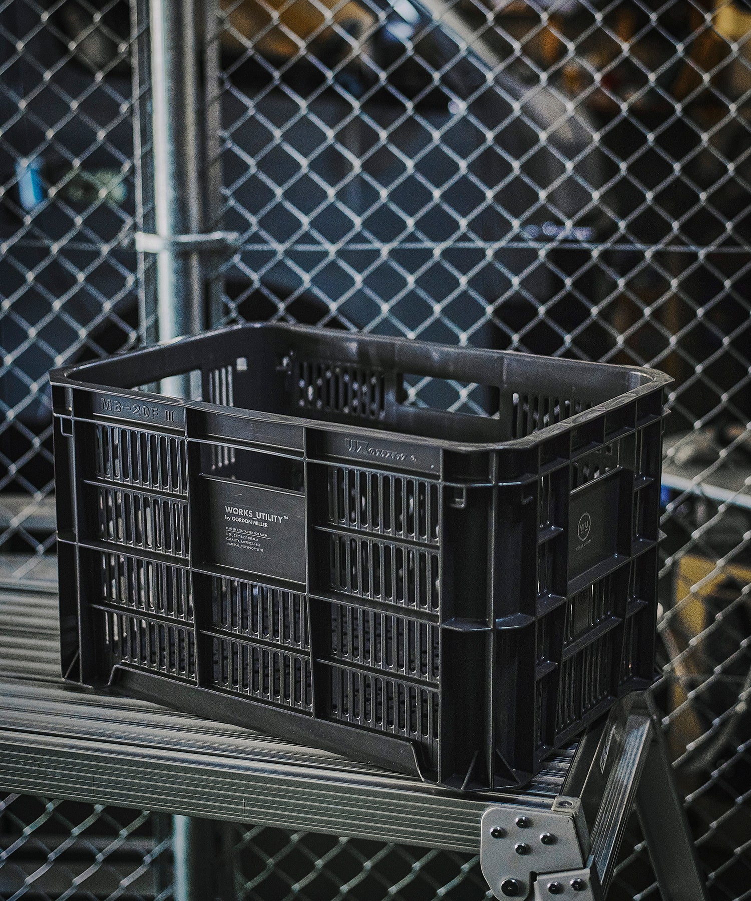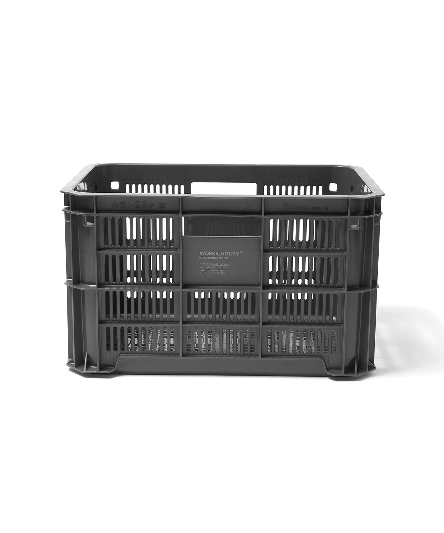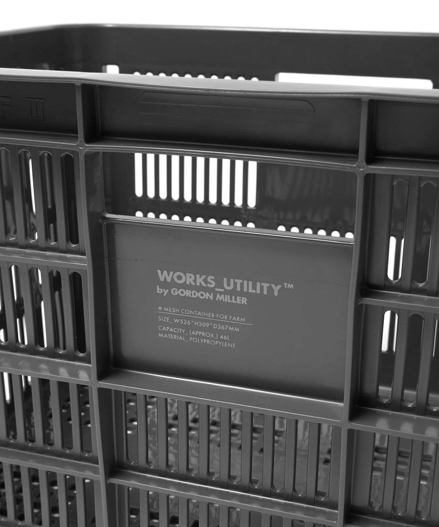 農業・林業・水産業などをはじめとするエッセンシャルワーカーのための新レーベル「GORDON MILLER WORKS UTILITY」実際、野菜・果物の収穫・運搬・保管で使用されているメッシュコンテナにWORKS UTILITYデザインを施しています。グリッド状の梁がタフさを実現。インダストリアルな直線を基本としたデザインになっています。四方向に持ち手穴があり、どの方向でも持ちやすいデザイン。紐を通す穴もあり、実際の現場で重宝します。
