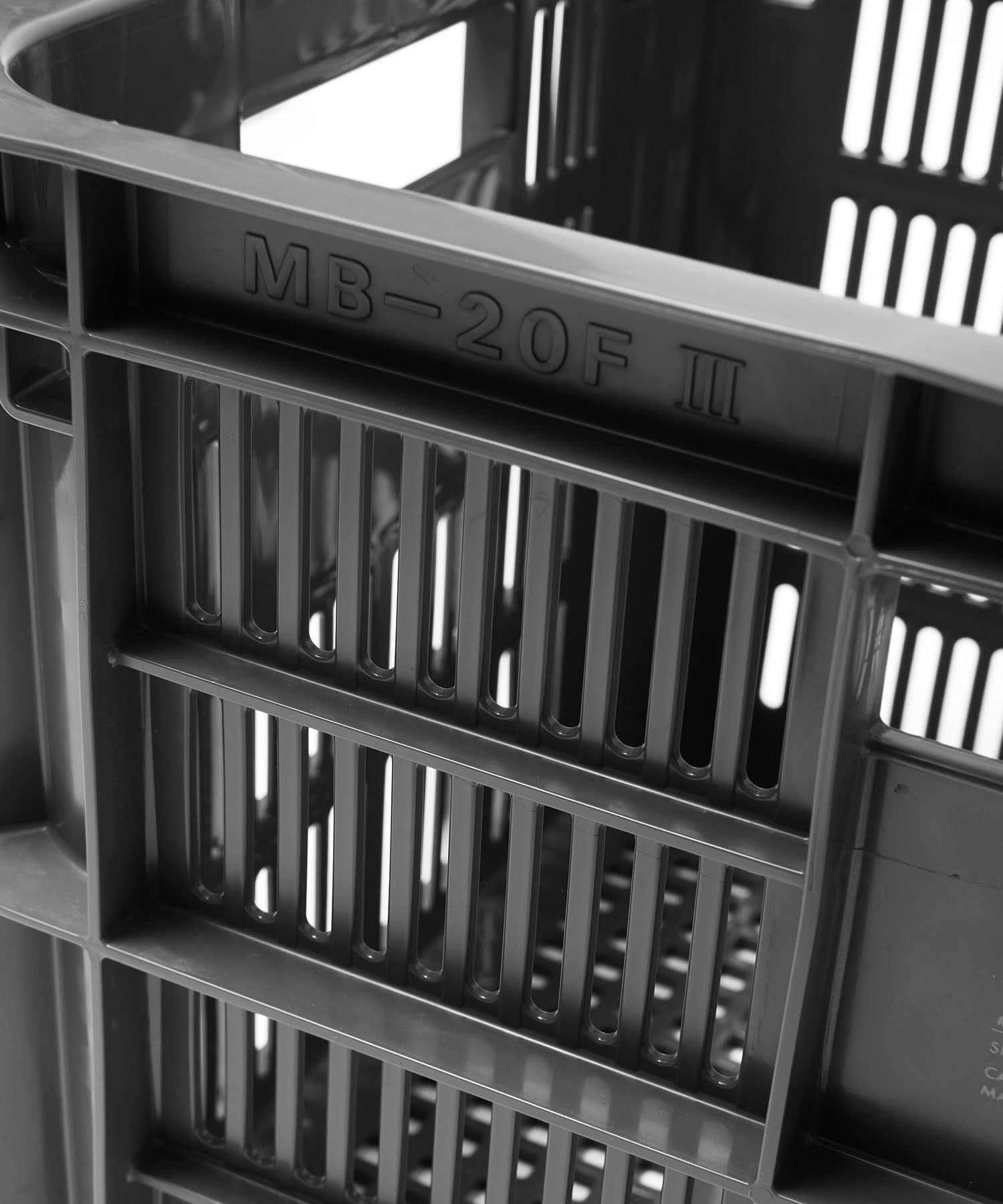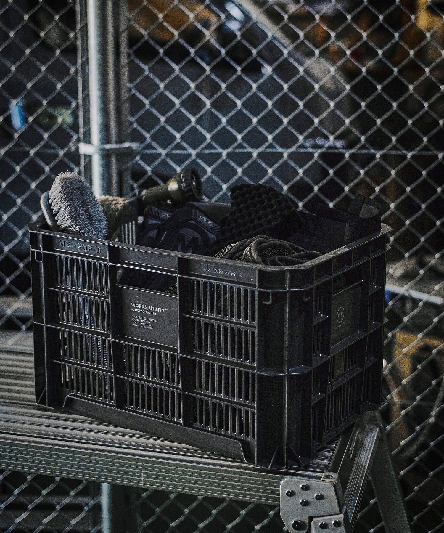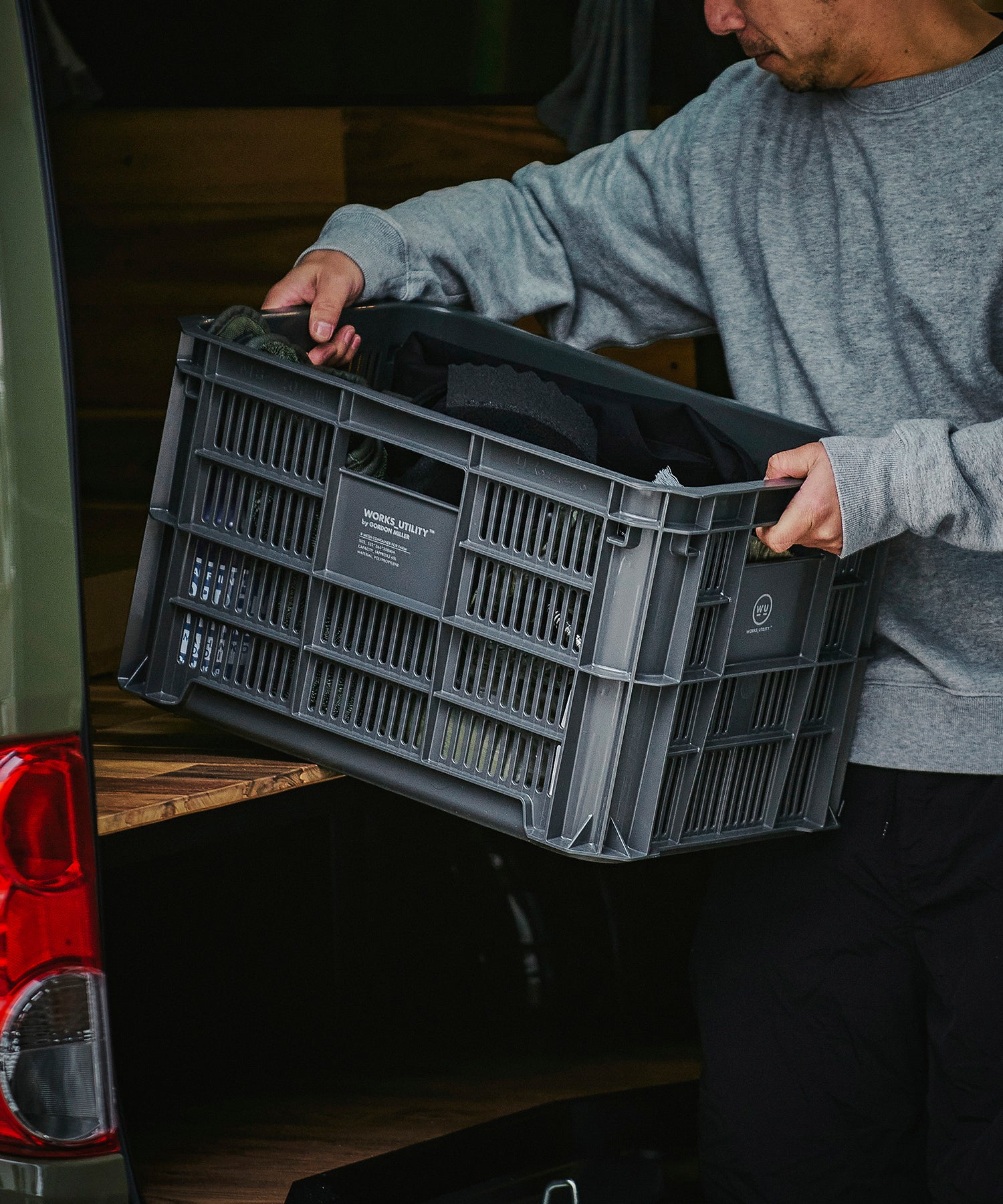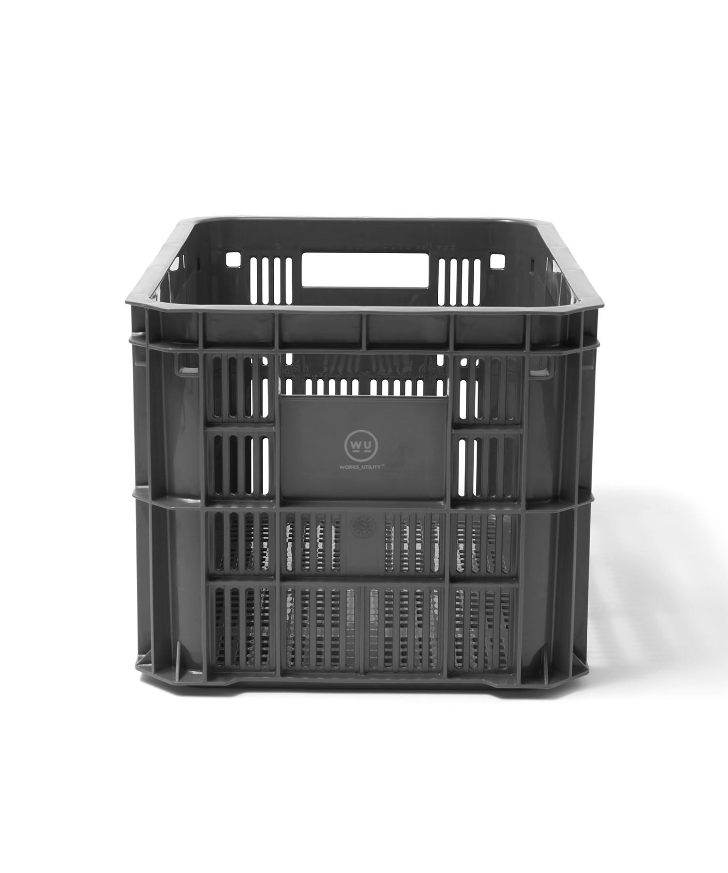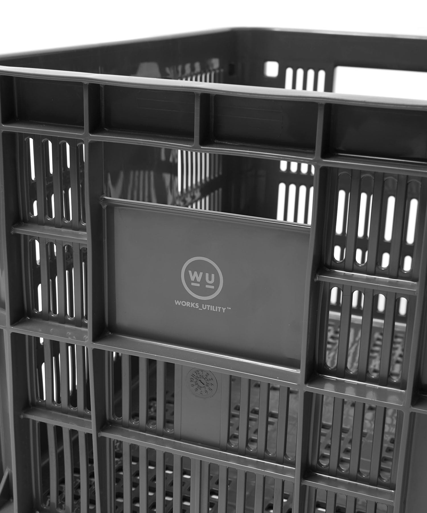 農業・林業・水産業などをはじめとするエッセンシャルワーカーのための新レーベル「GORDON MILLER WORKS UTILITY」実際、野菜・果物の収穫・運搬・保管で使用されているメッシュコンテナにWORKS UTILITYデザインを施しています。グリッド状の梁がタフさを実現。インダストリアルな直線を基本としたデザインになっています。四方向に持ち手穴があり、どの方向でも持ちやすいデザイン。紐を通す穴もあり、実際の現場で重宝します。
