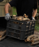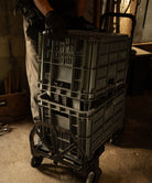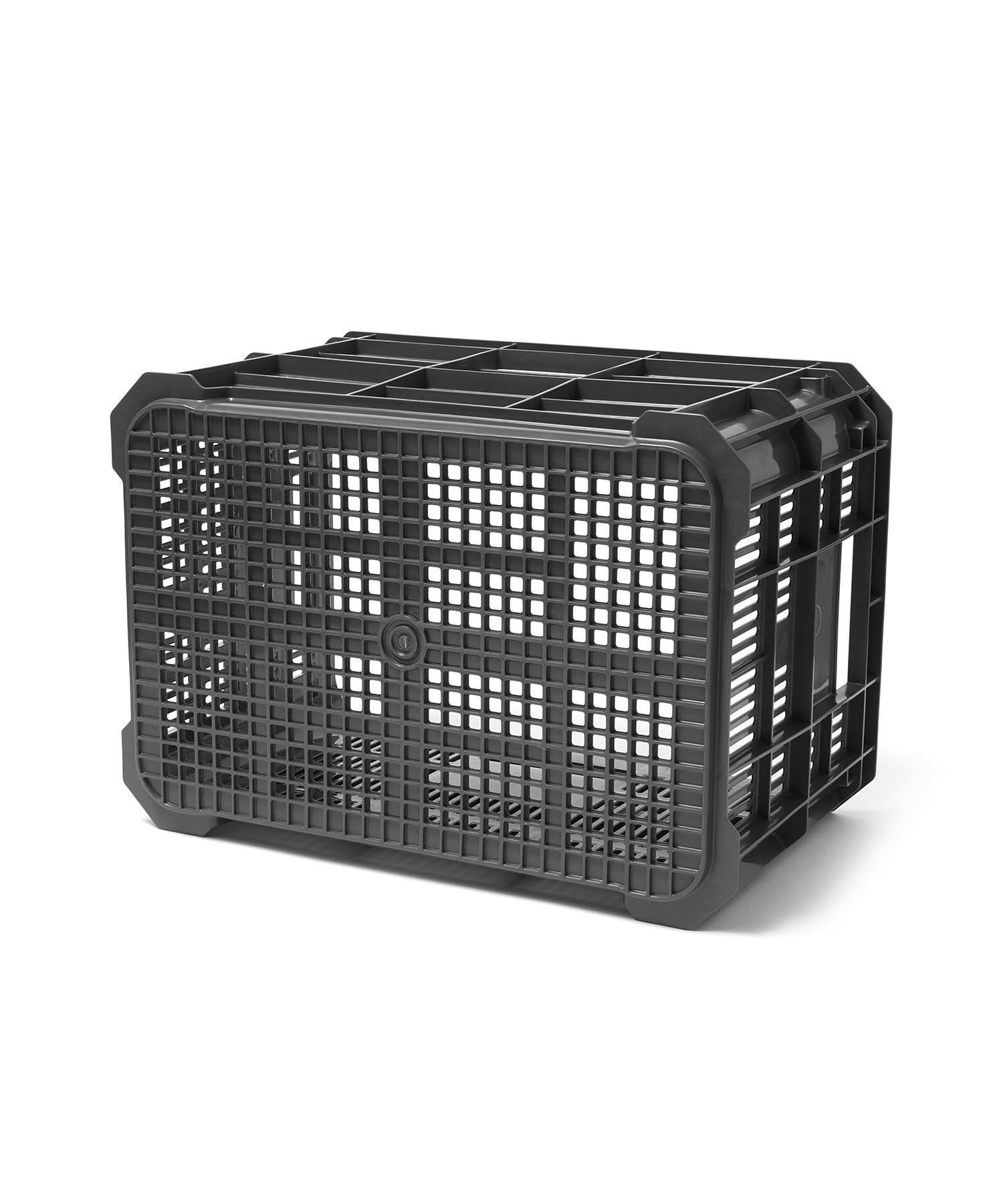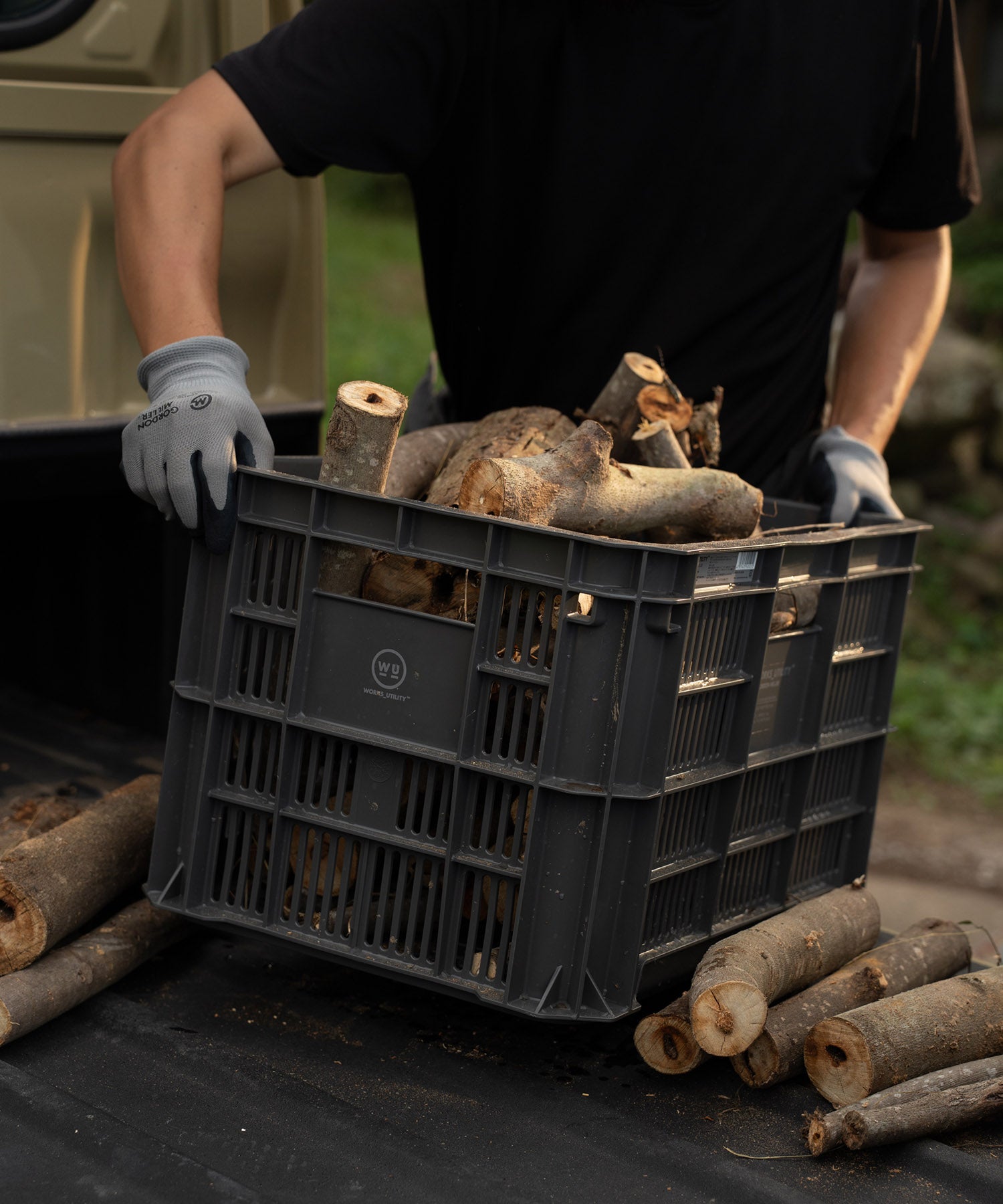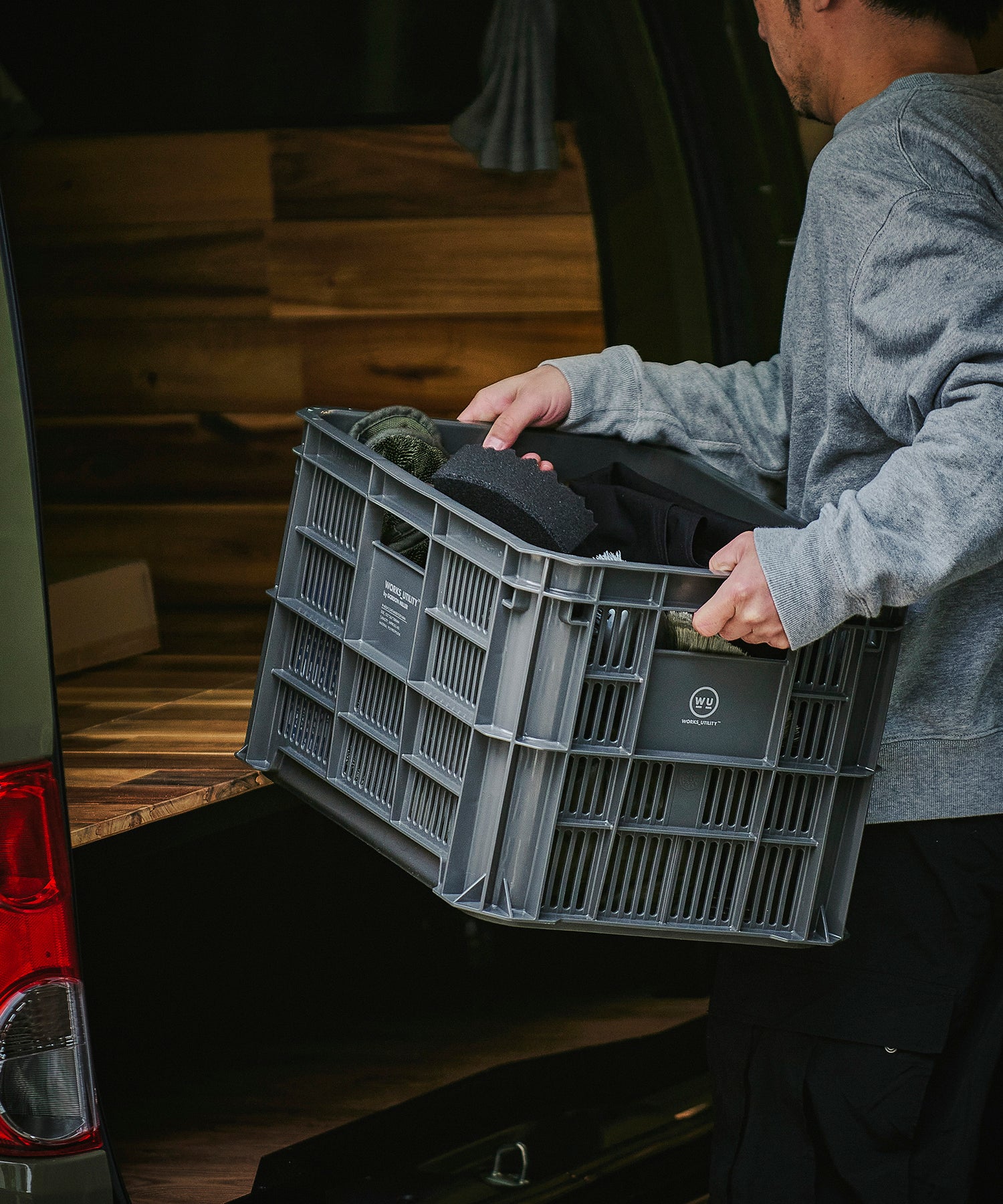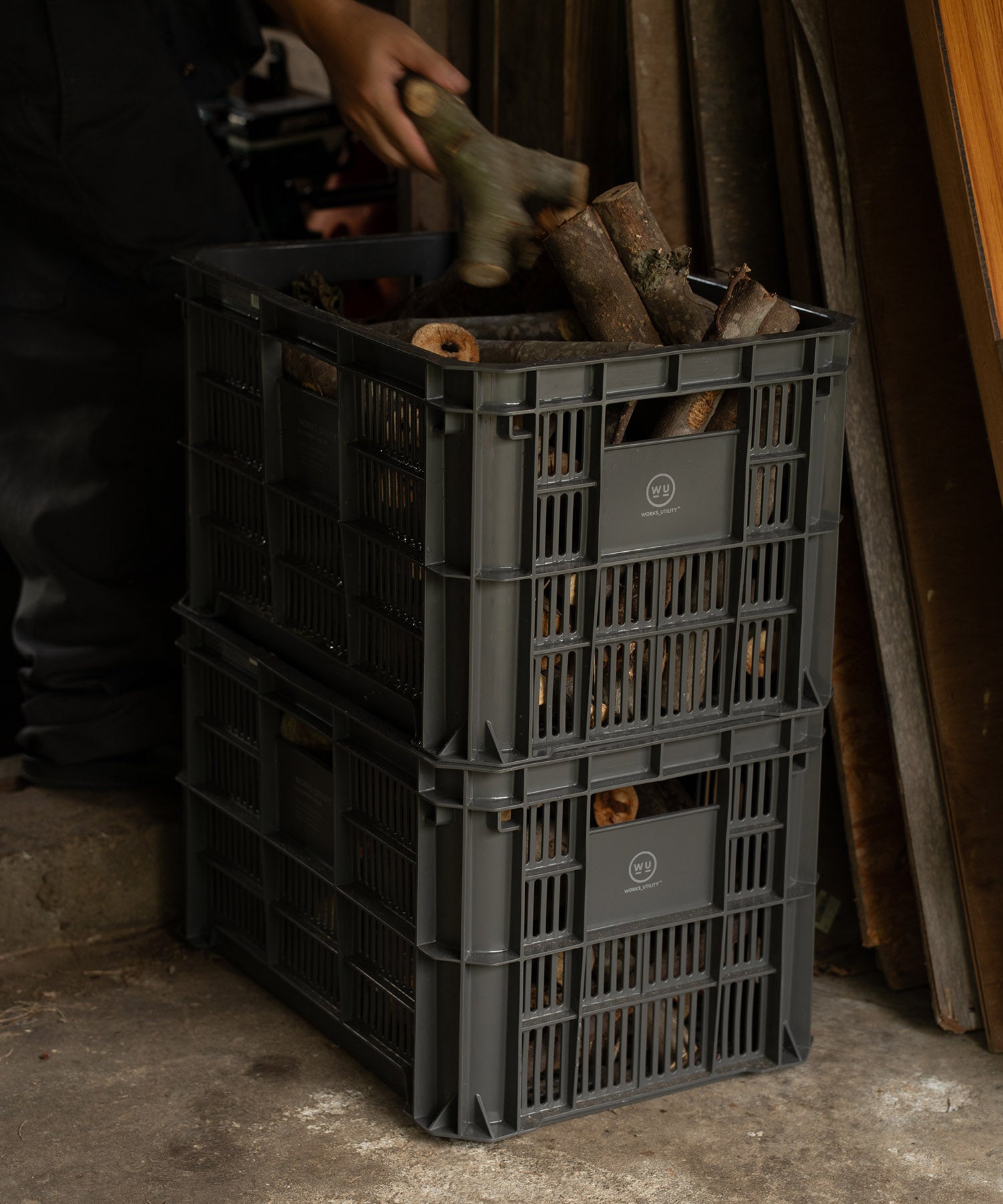 農業・林業・水産業などをはじめとするエッセンシャルワーカーのための新レーベル「GORDON MILLER WORKS UTILITY」実際、野菜・果物の収穫・運搬・保管で使用されているメッシュコンテナにWORKS UTILITYデザインを施しています。グリッド状の梁がタフさを実現。インダストリアルな直線を基本としたデザインになっています。四方向に持ち手穴があり、どの方向でも持ちやすいデザイン。紐を通す穴もあり、実際の現場で重宝します。