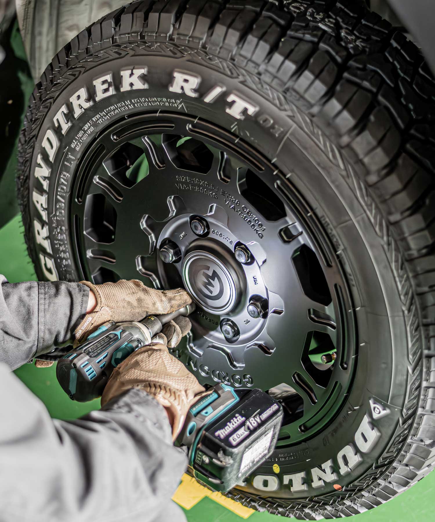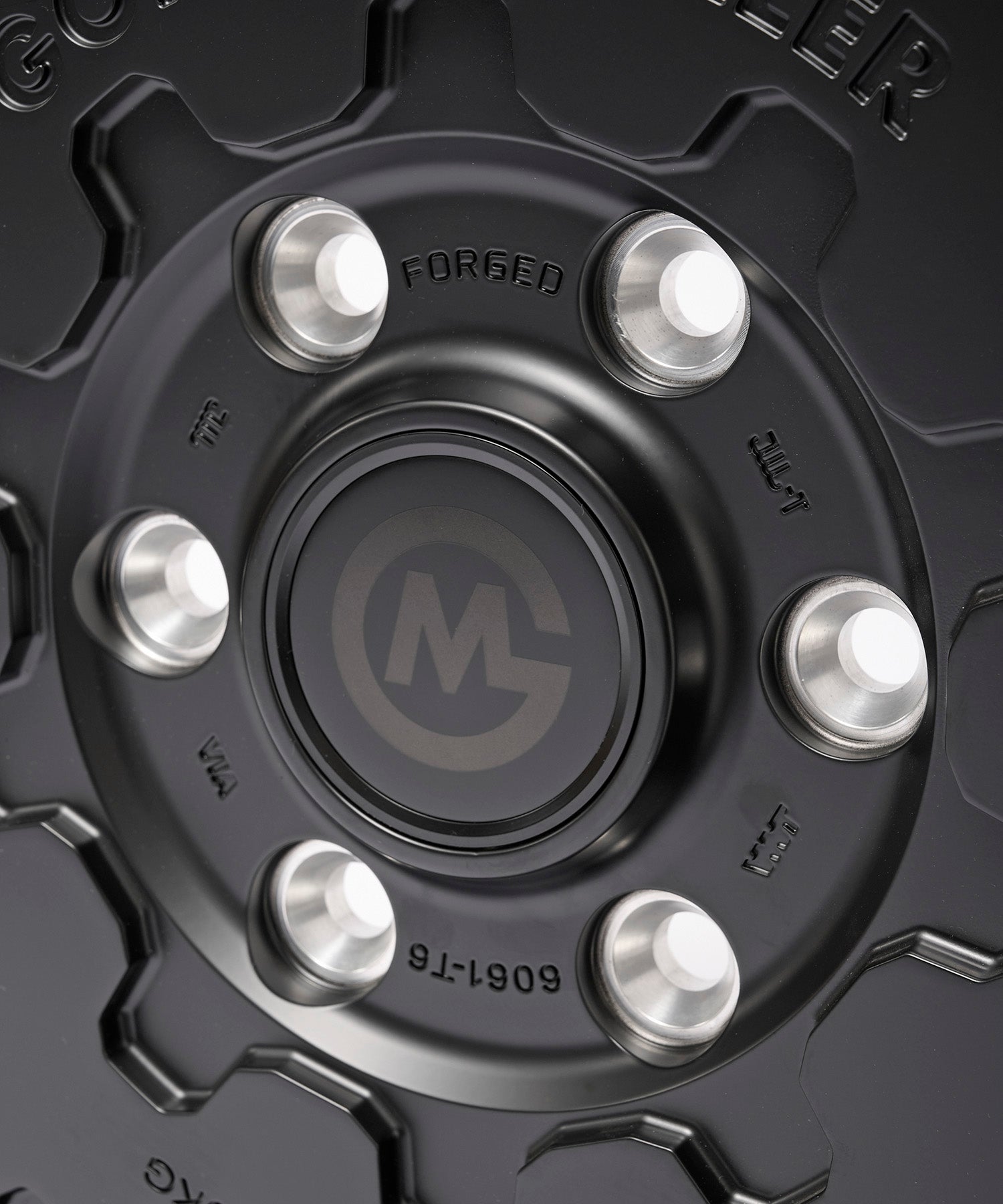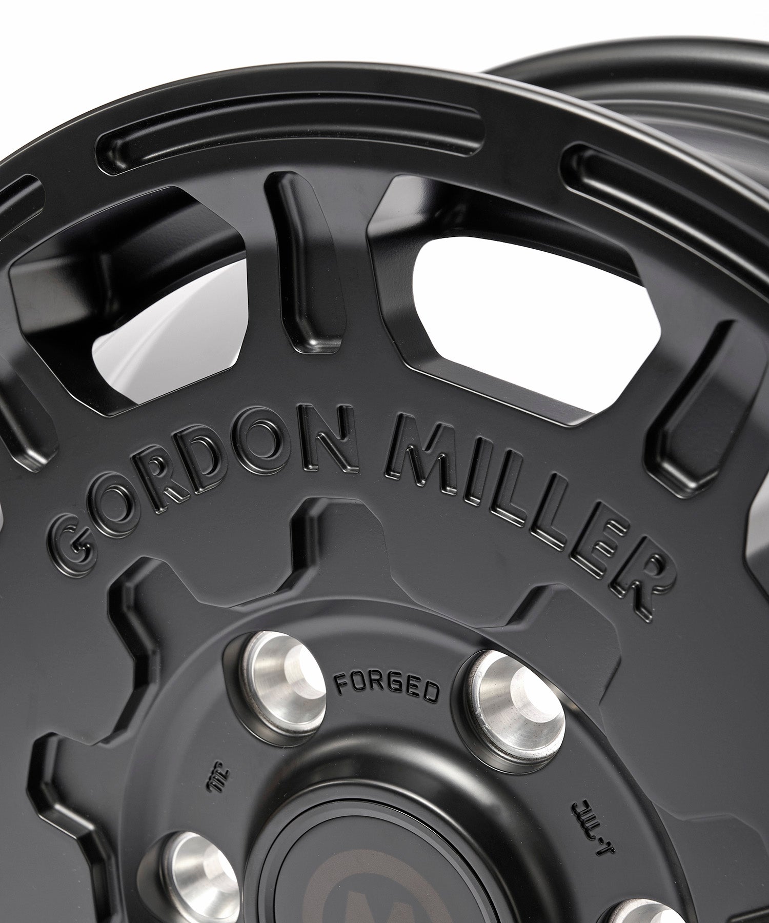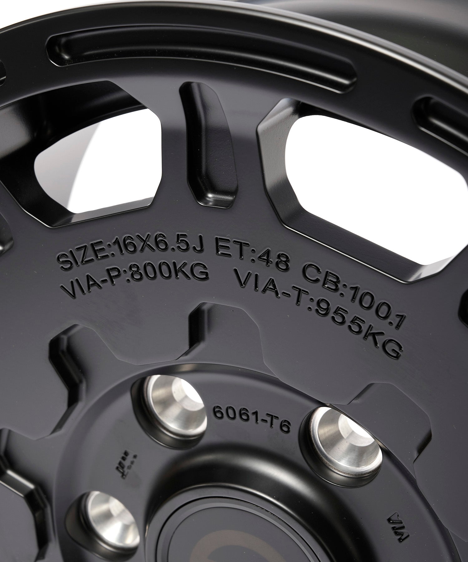 ハイエース / GMLVAN V01用に開発された、 デザインと性能を兼ね備えた鍛造ホイール は、 直線と平面で構成されたインダストリアルなデザインに、 鍛造ならではの強度と軽さ 耐久性が特徴的です。 鍛造ビレット製法で作られてたアルミホイール。 鍛造ビレット製法とは、 アルミニウム合金の金属塊を12000tのプレス機で鍛造します。 この際に、 金属内部の結晶が微細化され、 密度が高まります。 次にフローフォーミング製 法にてリムを形成し厚み2.6㎜の薄さに引き伸ばします。 そして、 5次元加工機でDISK面にデザインを施してから、 色々な検査を経て塗装工程に入り、 強度試験を行い検品後出荷 をしています。 鍛造ビレット製法は、 高い強度と軽量化を実現する優れた製造方法です。