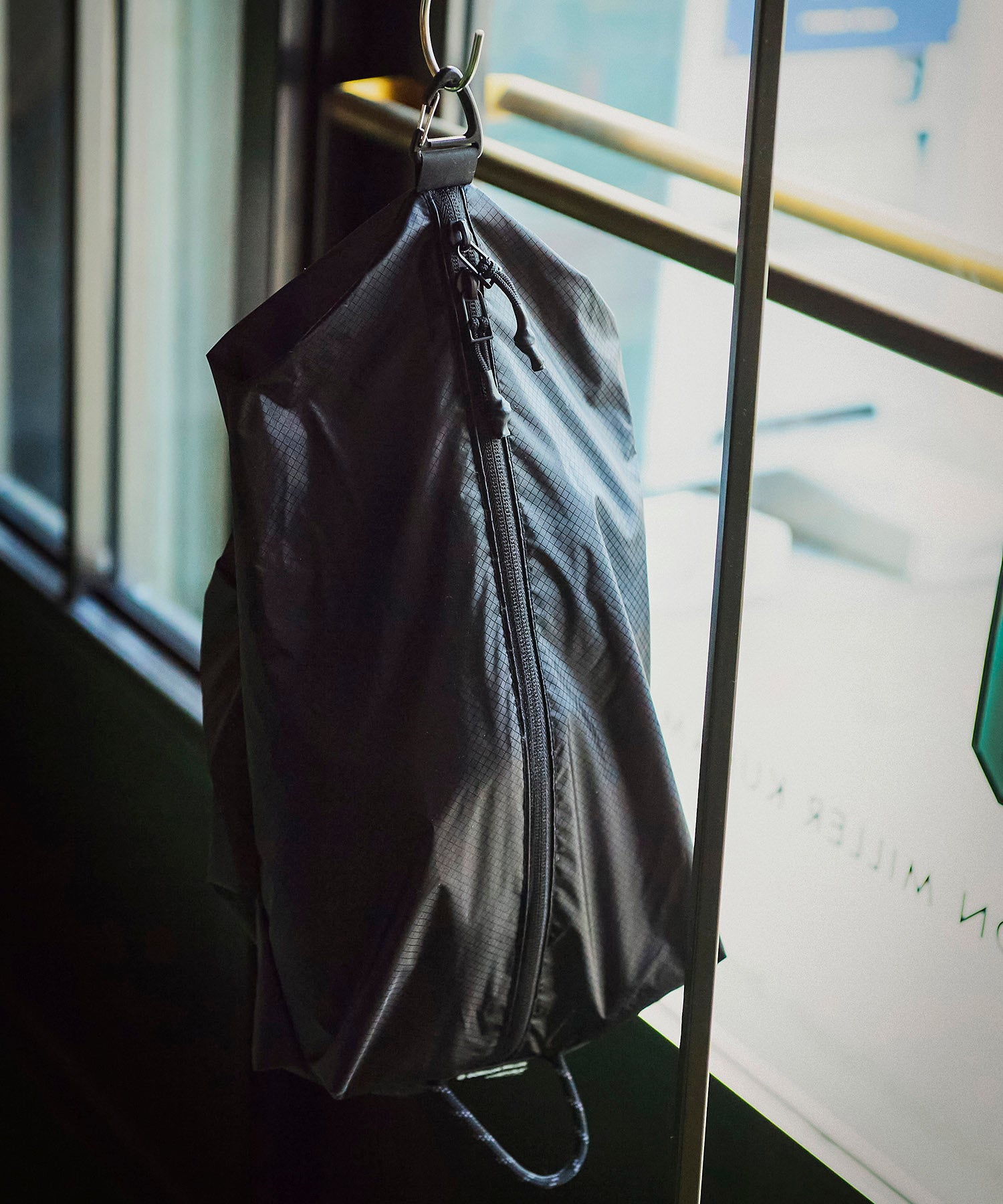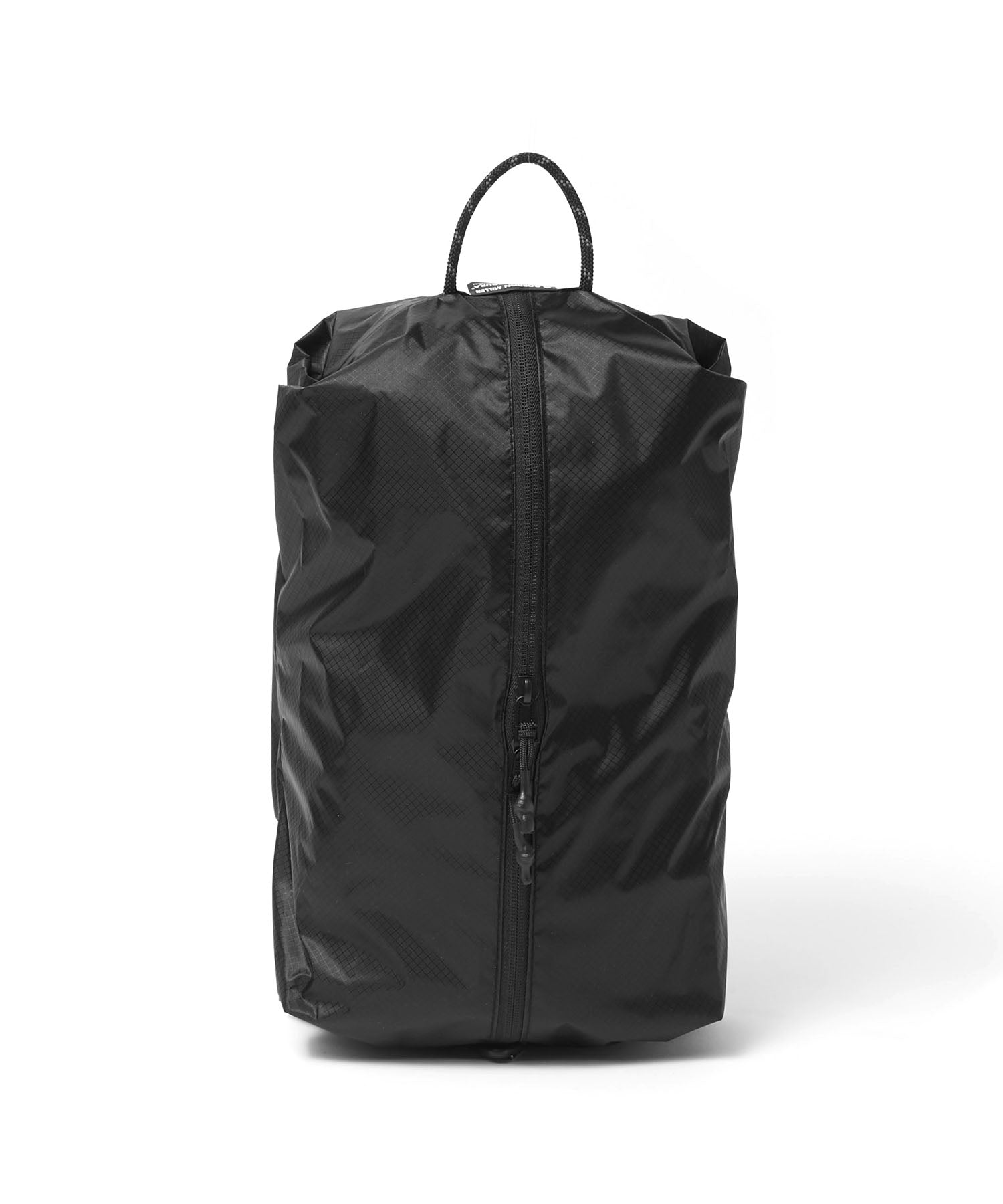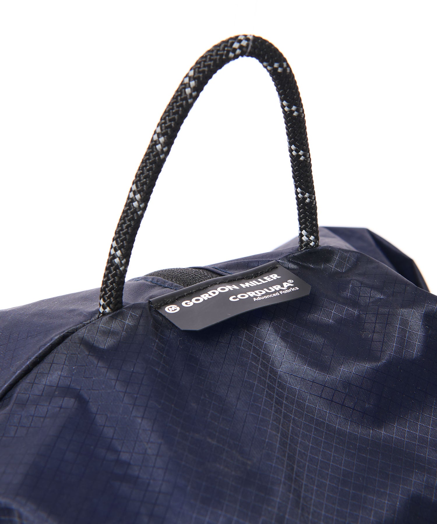 'GORDON MILLER CORDURA® Ripstop Nylon PACK’シリーズ高い強度と耐摩耗性をもつ66ナイロンのコーデュラ糸を使用したバッグのシリーズです。生地の表面にはシリコンコーティングを施し耐水性に優れ、防汚機能を備えています。裏面はウレタンコーティングにより耐水性3,000mmになります。三角カラビナがついているので、ベルトループやバッグ等に引っ掛けて持ち運びができます。ダブルジッパーで開閉も容易なサック。車中泊やジムトレーニング時にスニーカー入れとしても使える便利なサイズです。下着等の着替え類を入れたり、タオルやシャンプー等を入れて銭湯道具一式を入れたり、トラベルシーン、キャンプシーンでの利用がとても便利です。