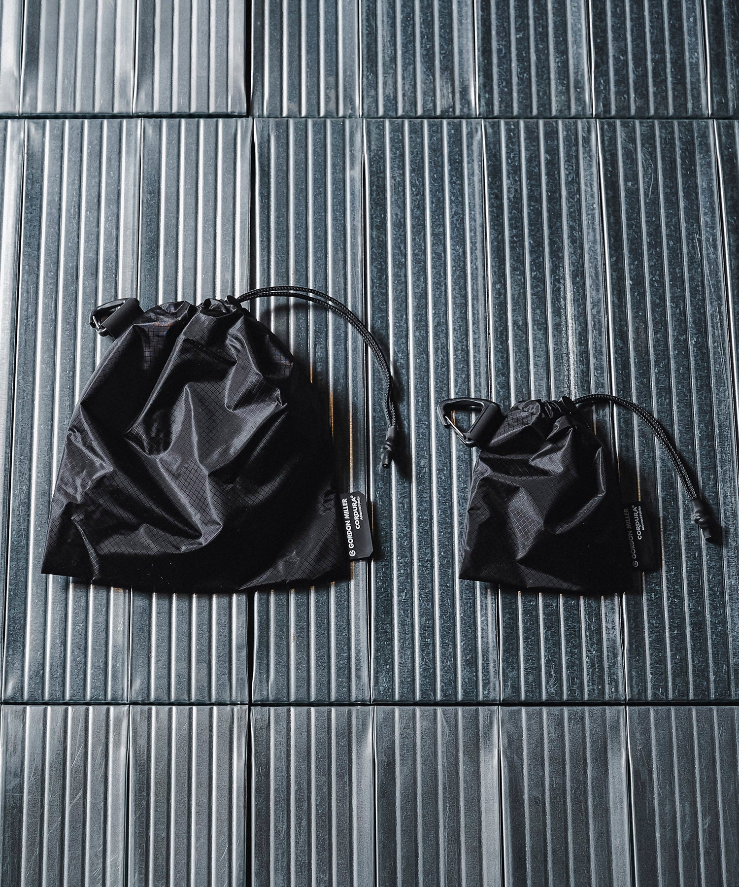 'GORDON MILLER CORDURA® Ripstop Nylon PACK’シリーズ。高い強度と耐摩耗性をもつ66ナイロンのコーデュラ糸を使用したバッグのシリーズです。生地の表面にはシリコンコーティングを施し耐水性に優れ、防汚機能を備えています。裏面はウレタンコーティングにより耐水性3,000mmになります。三角カラビナがついているので、ベルトループやバッグ等に引っ掛けて持ち運びができます。 細かいモノの仕分けに便利なミニ巾着。お菓子やおにぎりといった軽食を入れたり、タバコとライターを入れたり、スマホの充電器といったガジェット類を入れたりするのに便利なサイズです。カラビナを利用して別売のネックストラップを使用すれば、ショルダー的にもご利用いただけます。(※別売りのネックストラップは9月下旬発売予定。)