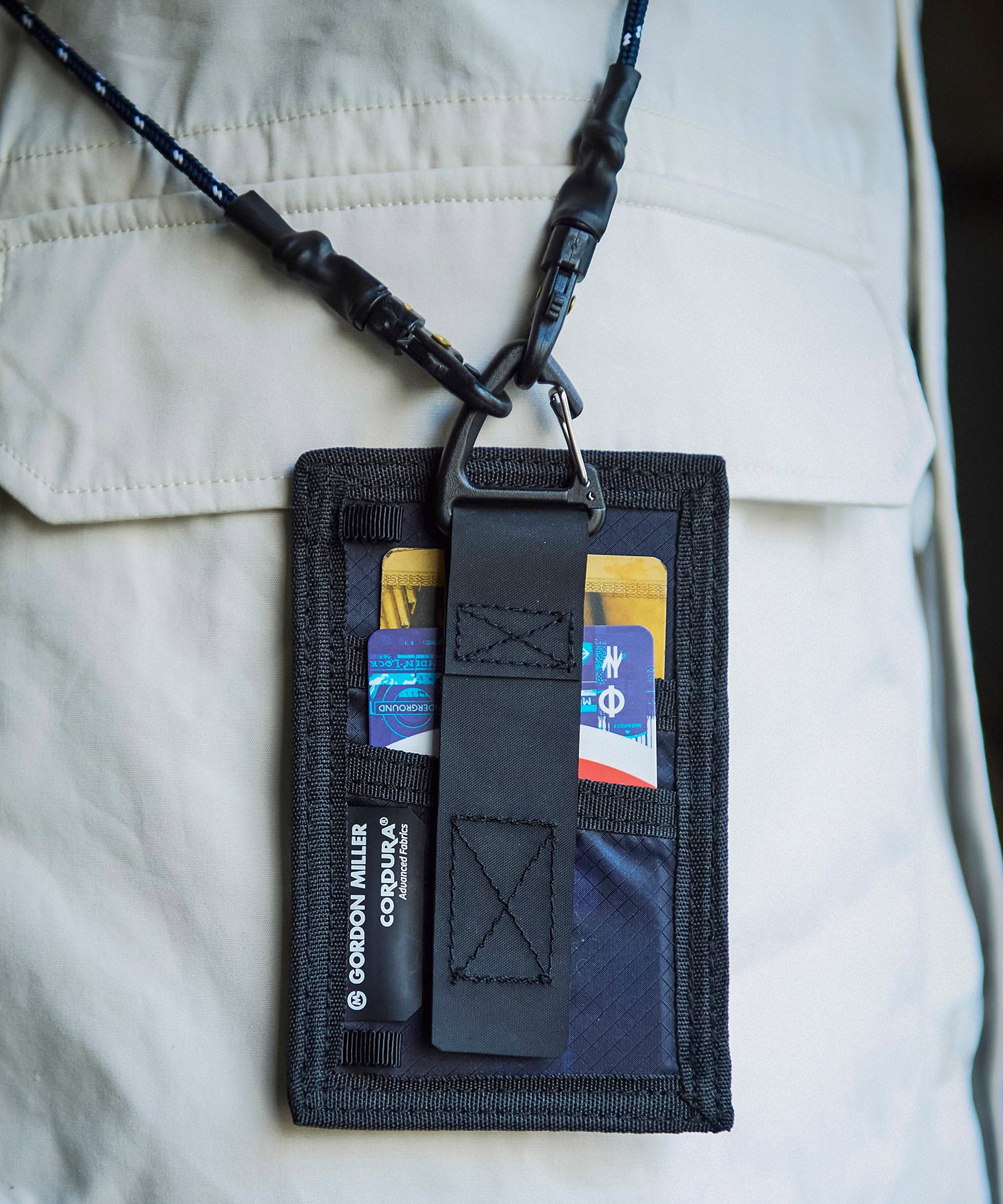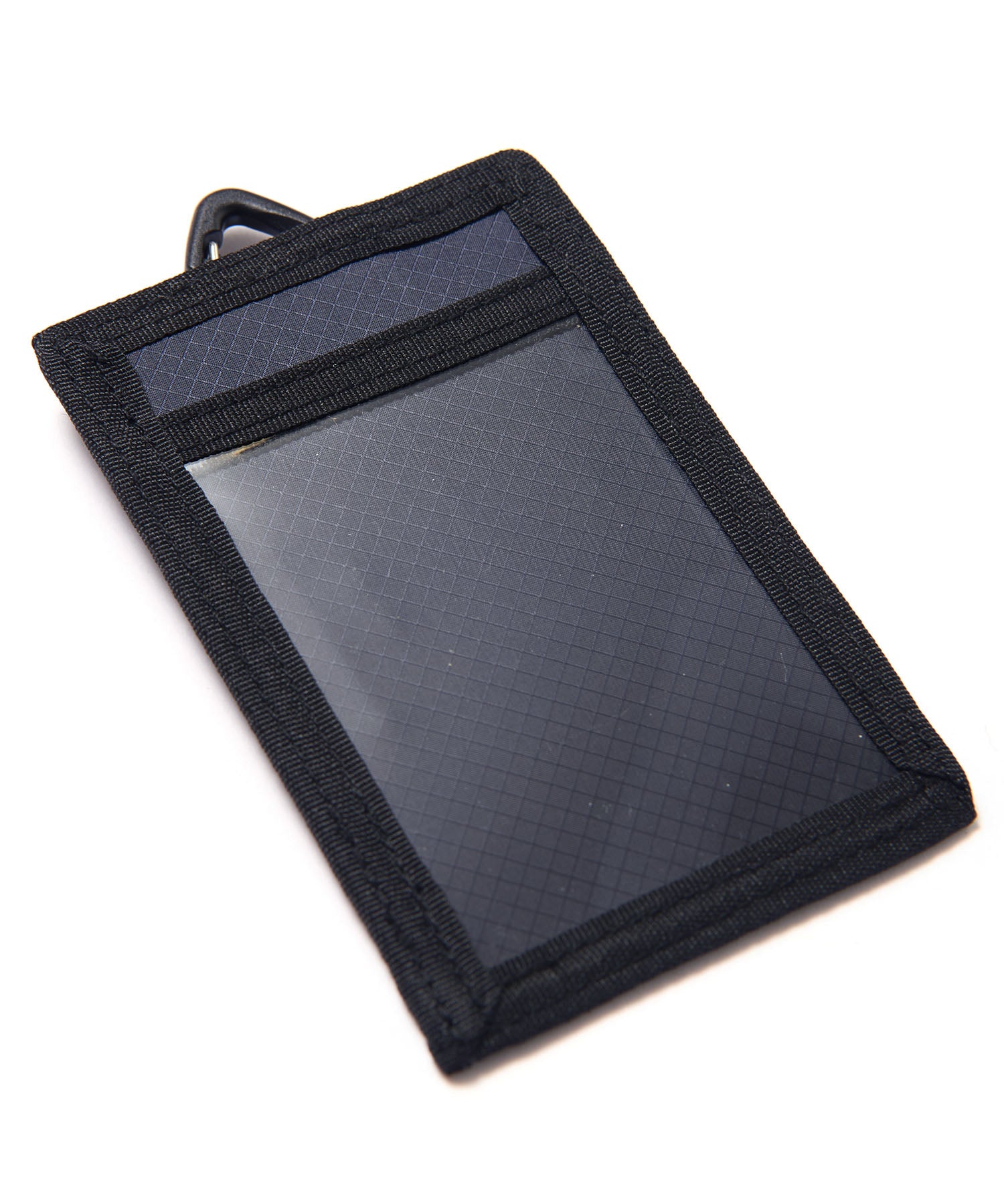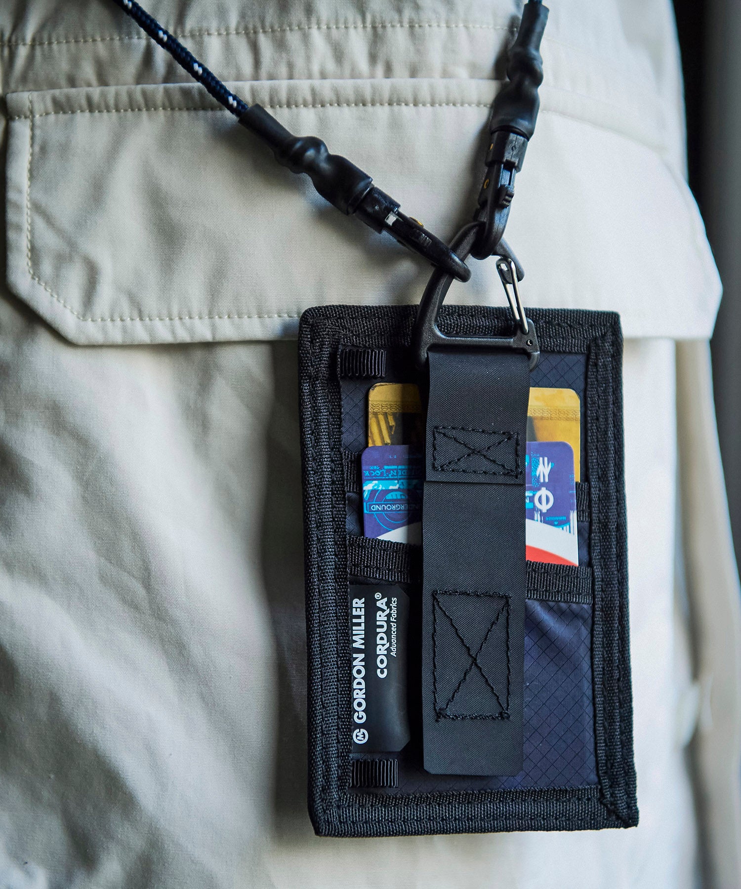 'GORDON MILLER CORDURA® Ripstop Nylon PACK’シリーズ。高い強度と耐摩耗性をもつ66ナイロンのコーデュラ糸を使用したバッグのシリーズです。生地の表面にはシリコンコーティングを施し耐水性に優れ、防汚機能を備えています。裏面はウレタンコーティングにより耐水性3,000mmになります。三角カラビナがついているので、ベルトループやバッグ等に引っ掛けて持ち運びができます。PVCの窓のついたカードケースです。交通系ICカード等を入れたりするのに便利です。裏面には別でカード入れられます。別売のネックストラップを使用すれば首からも下げてご使用いただけるので、社員証等にも便利です。