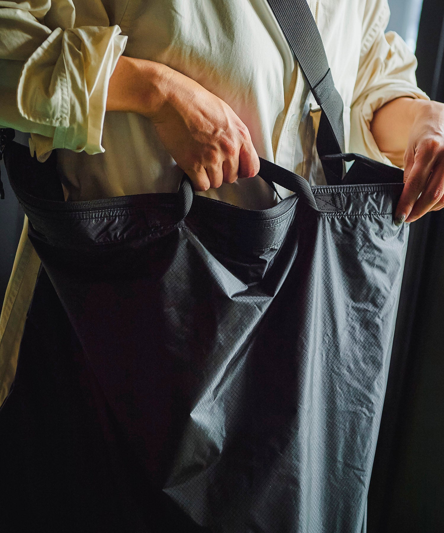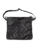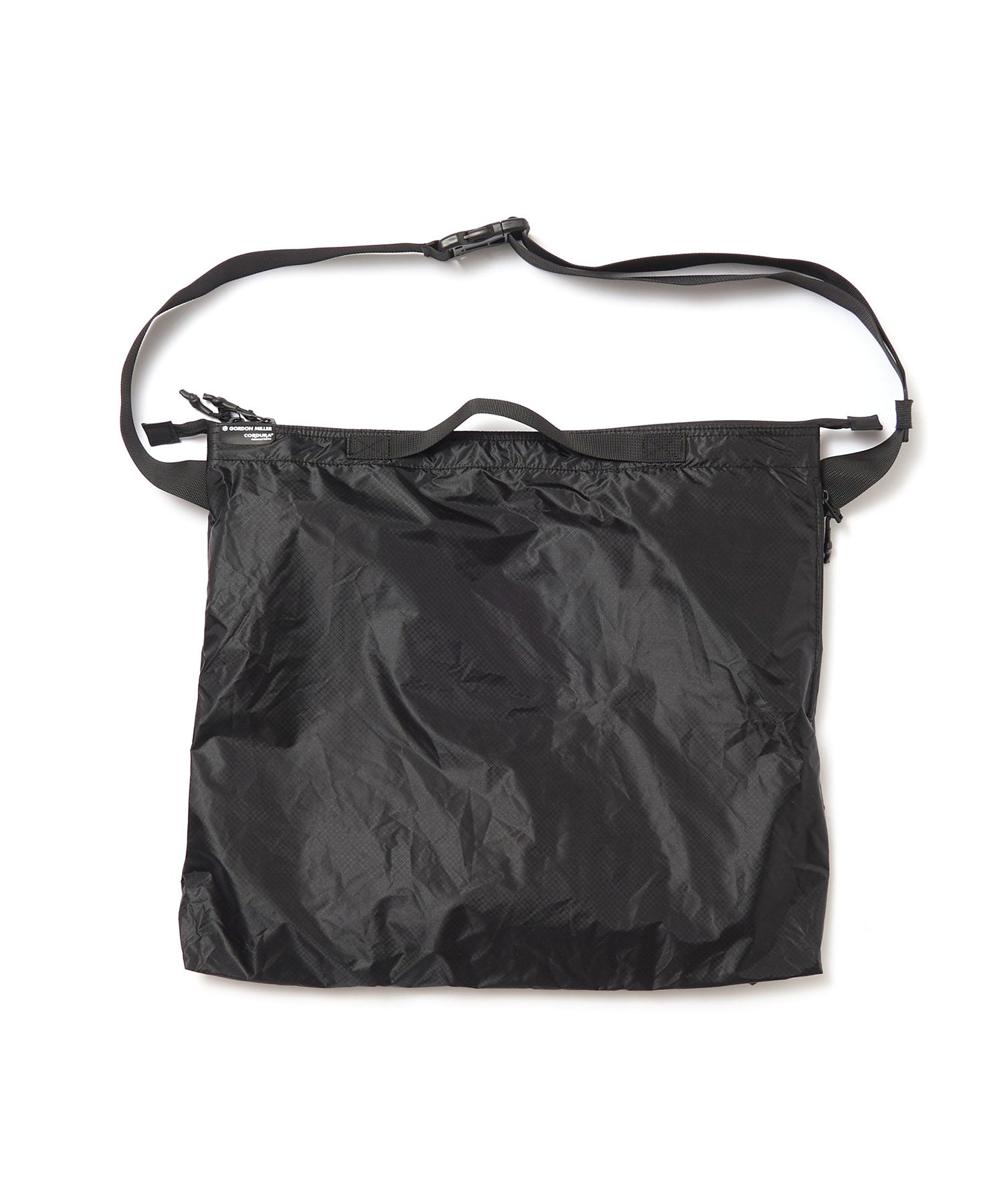 'GORDON MILLER CORDURA® Ripstop Nylon PACK’シリーズ。高い強度と耐摩耗性をもつ66ナイロンのコーデュラ糸を使用したバッグのシリーズです。生地の表面にはシリコンコーティングを施し耐水性に優れ、防汚機能を備えています。裏面はウレタンコーティングにより耐水性3,000mmになります。三角カラビナがついているので、ベルトループやバッグ等に引っ掛けて持ち運びができます。普段使いに便利なサイズのショルダーバッグ。横にジッパーポケットが付いているので、スマホや鍵、財布といったモノを仕分けて入れるのに便利です。このポケットはポケッタブル仕様で中に入れることで小さくコンパクトに収納できます。