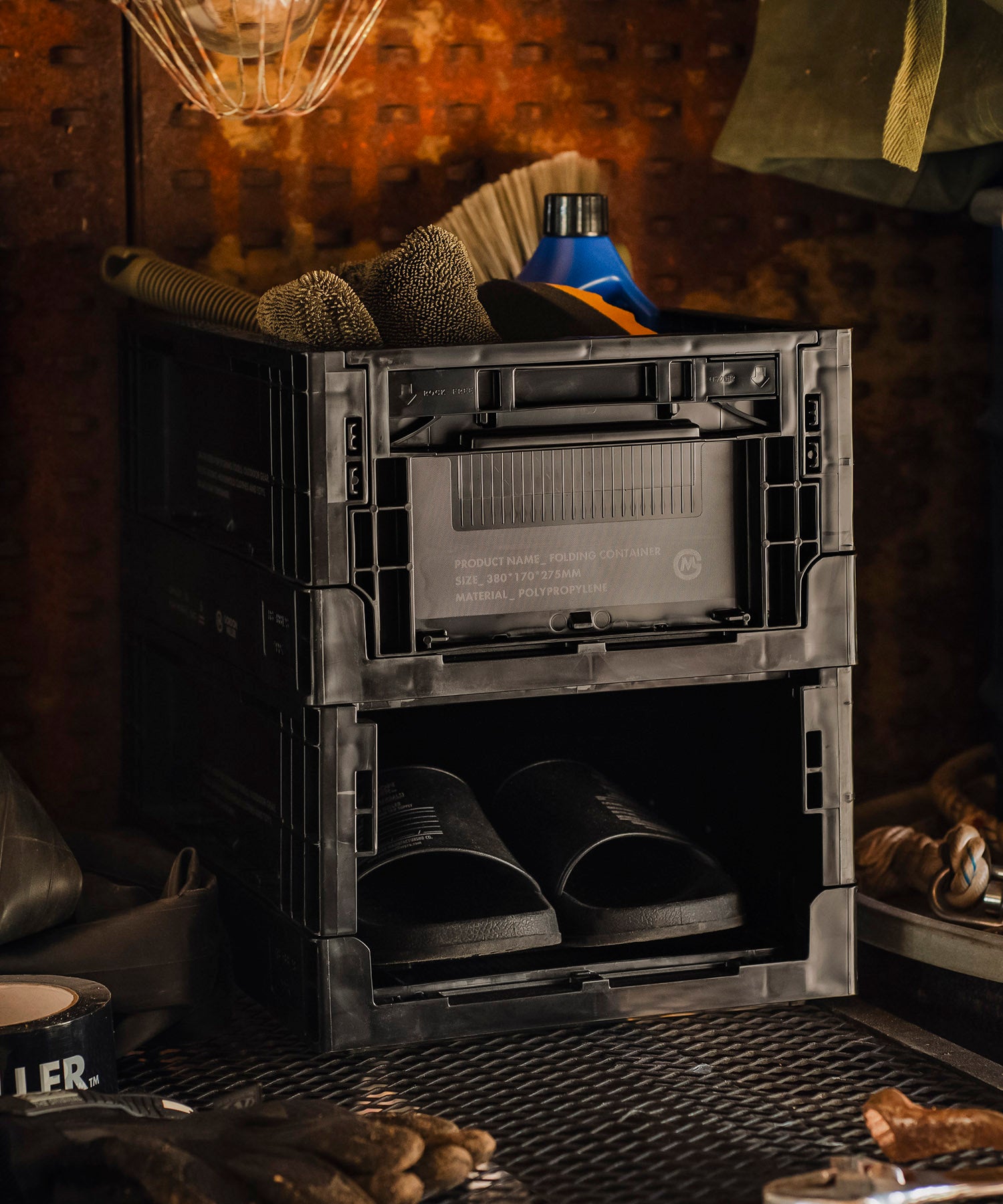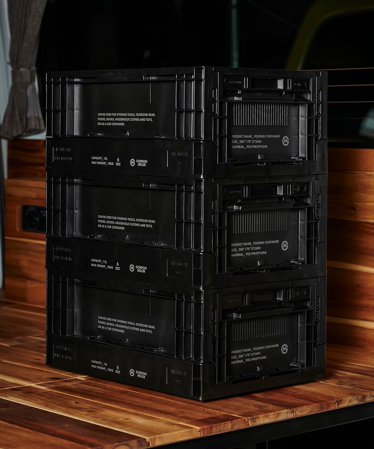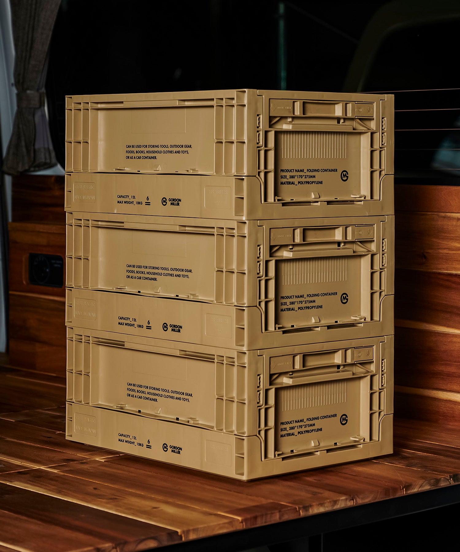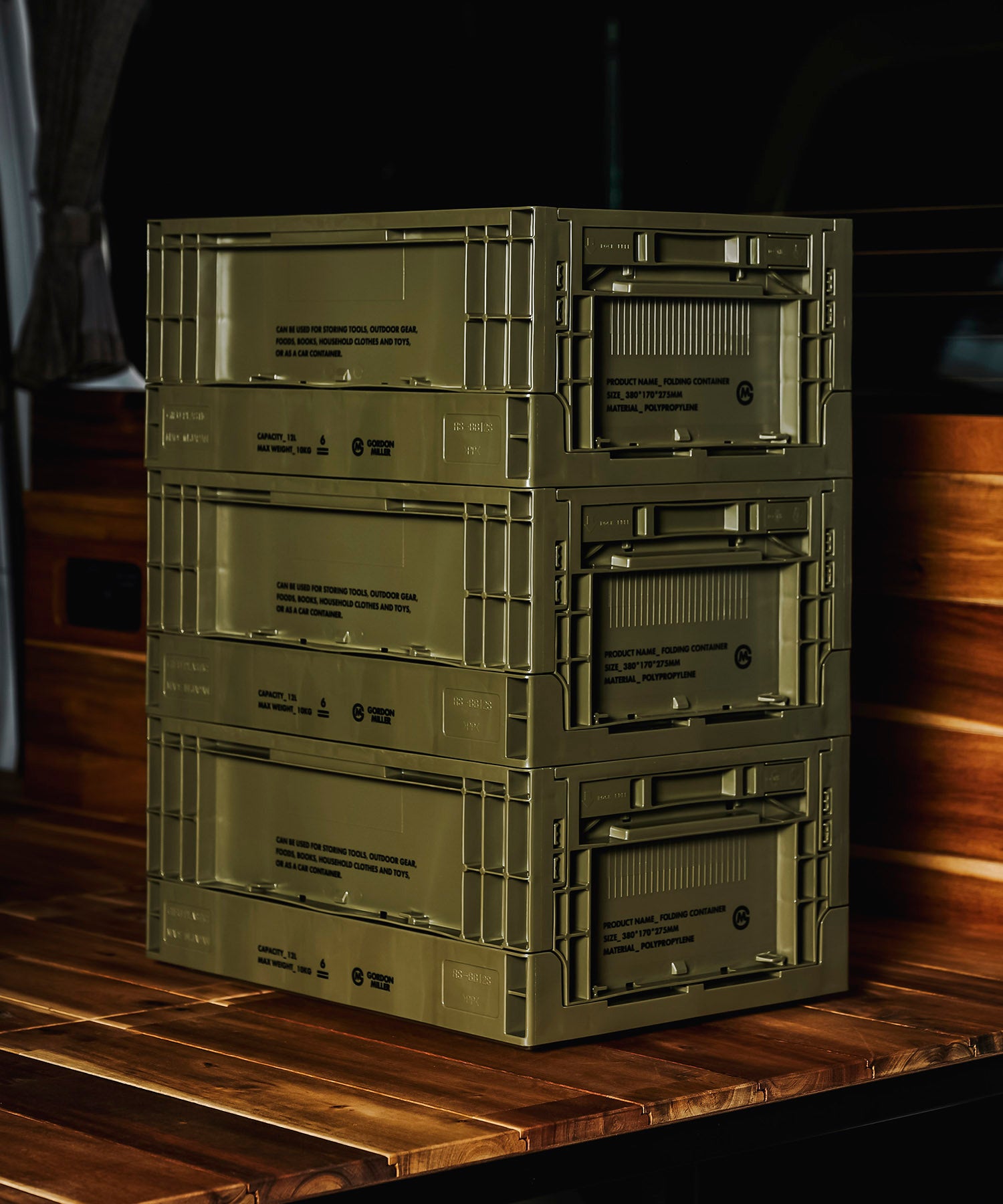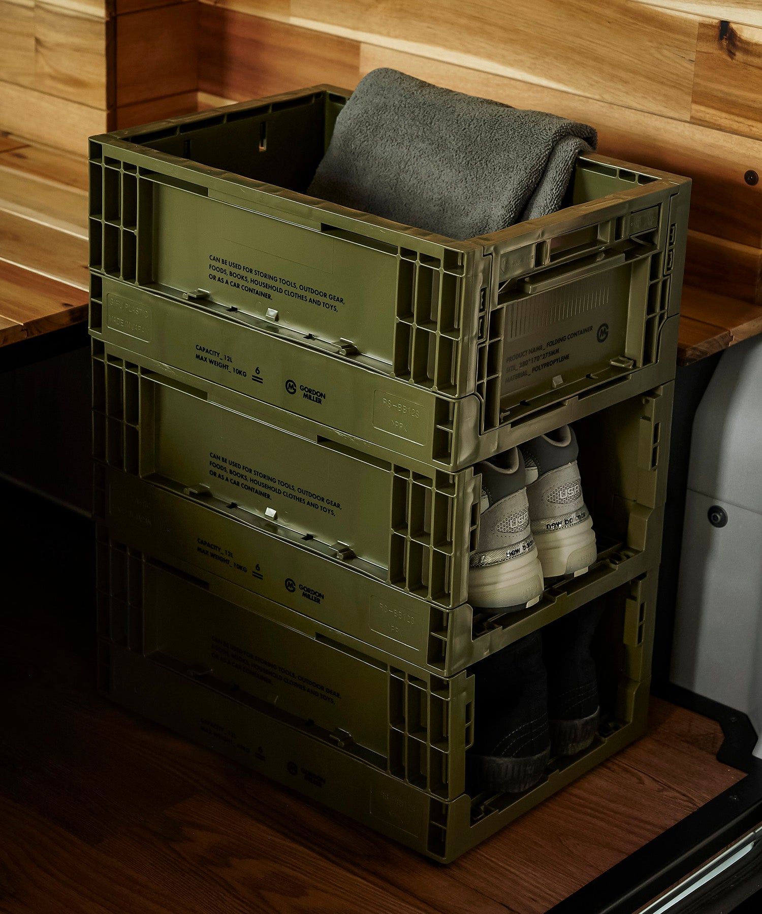 GORDON MILLERオリジナルデザインがされた一般流通で使用されている頑丈でタフな業務用のコンテナです。両側面が畳めるので、コンパクトに収納可能。短側面を畳めば、コンテナを積んだままでも収納物の出し入れが可能。何段か積んでシューズラックや衣類の収納としてもご使用いただけます。車の中やガレージはもちろん、クローゼットの中やリビングに出して見せる収納としても使用可能な便利アイテム。