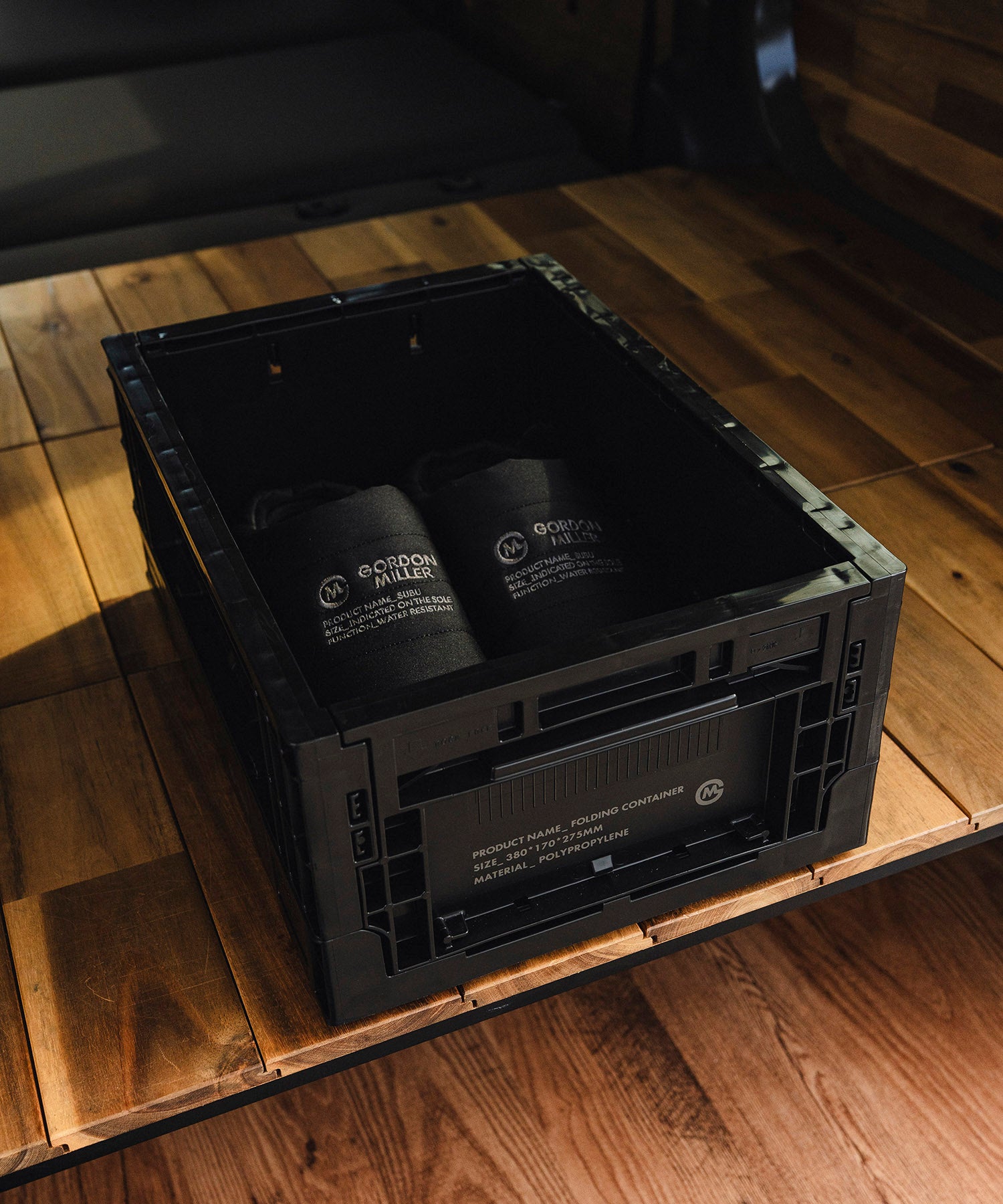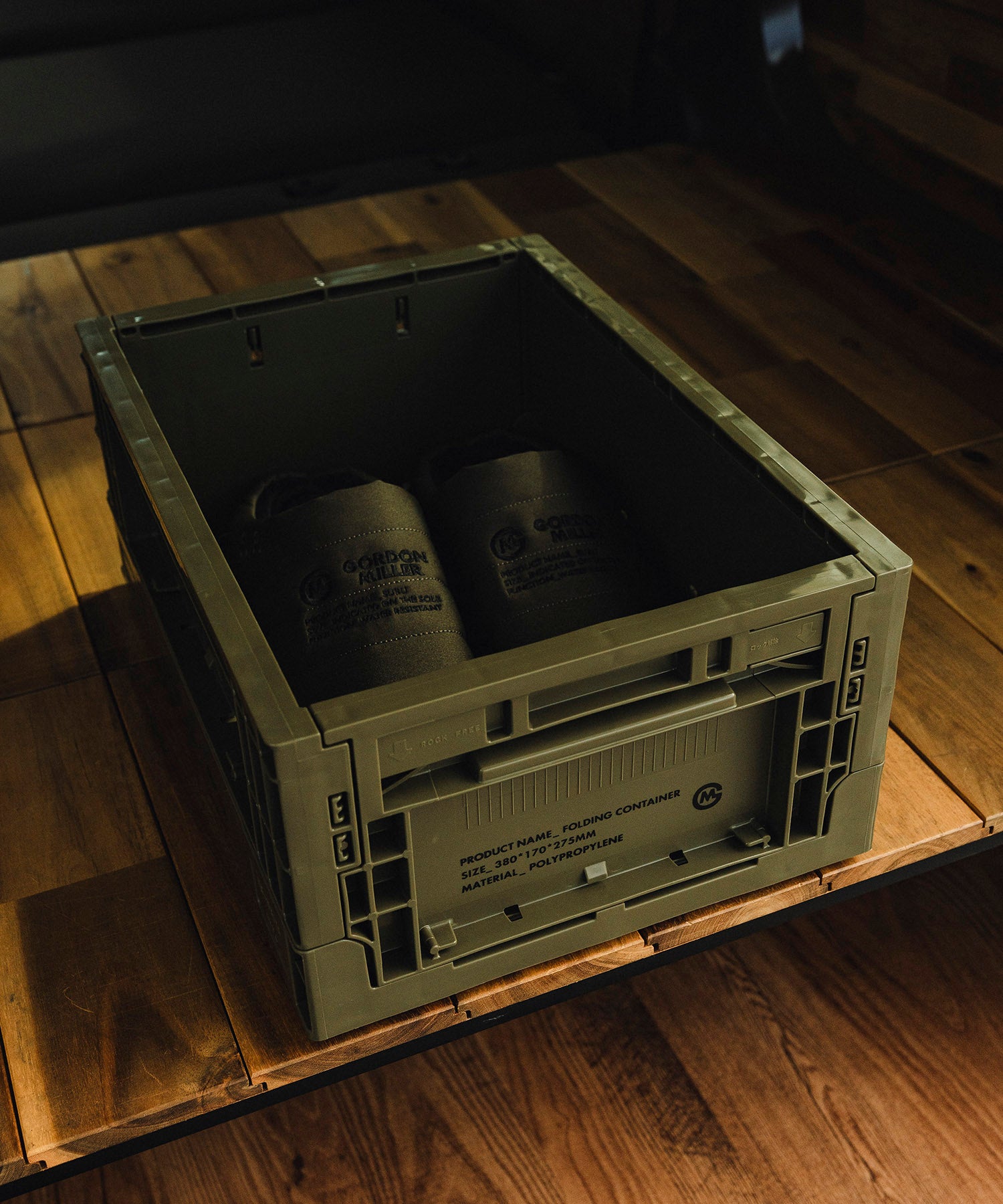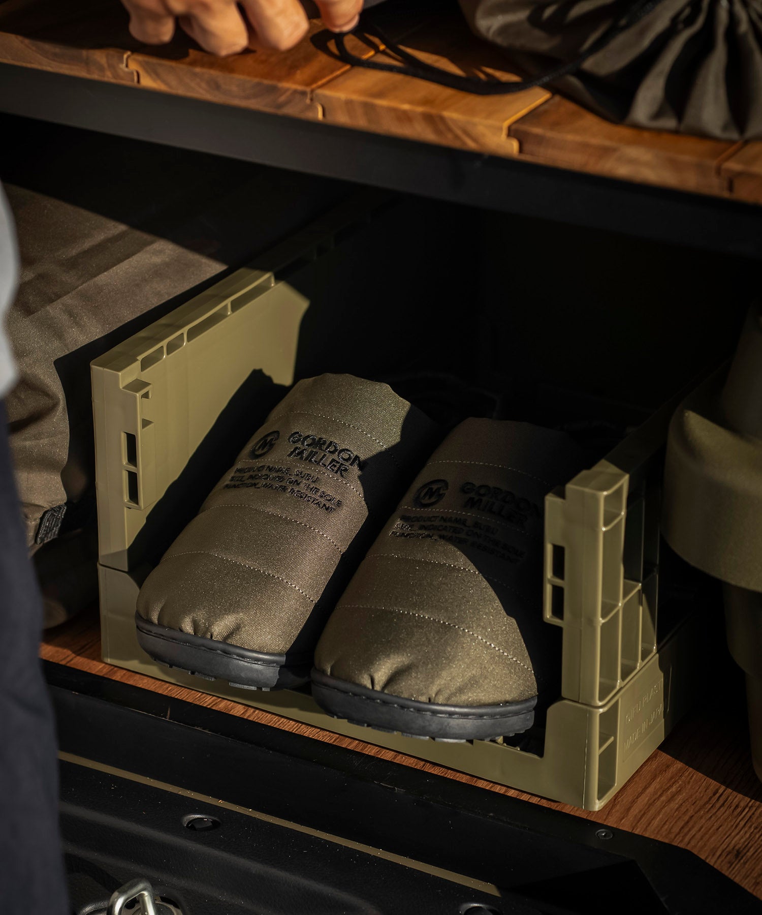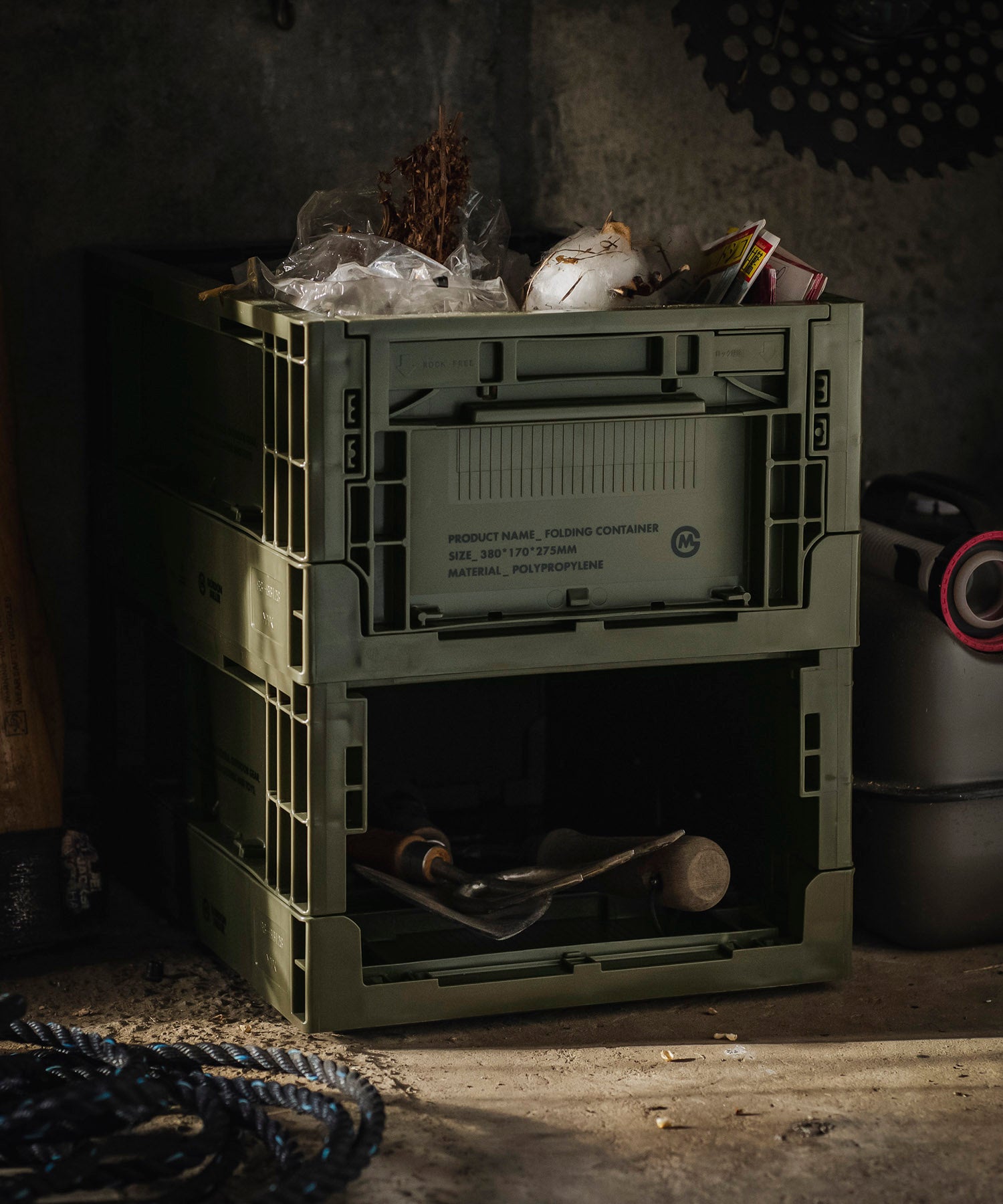 GORDON MILLERオリジナルデザインがされた一般流通で使用されている頑丈でタフな業務用のコンテナです。両側面が畳めるので、コンパクトに収納可能。短側面を畳めば、コンテナを積んだままでも収納物の出し入れが可能。何段か積んでシューズラックや衣類の収納としてもご使用いただけます。車の中やガレージはもちろん、クローゼットの中やリビングに出して見せる収納としても使用可能な便利アイテム。