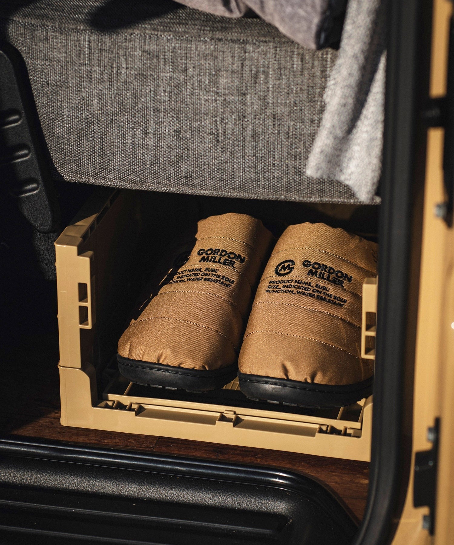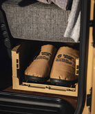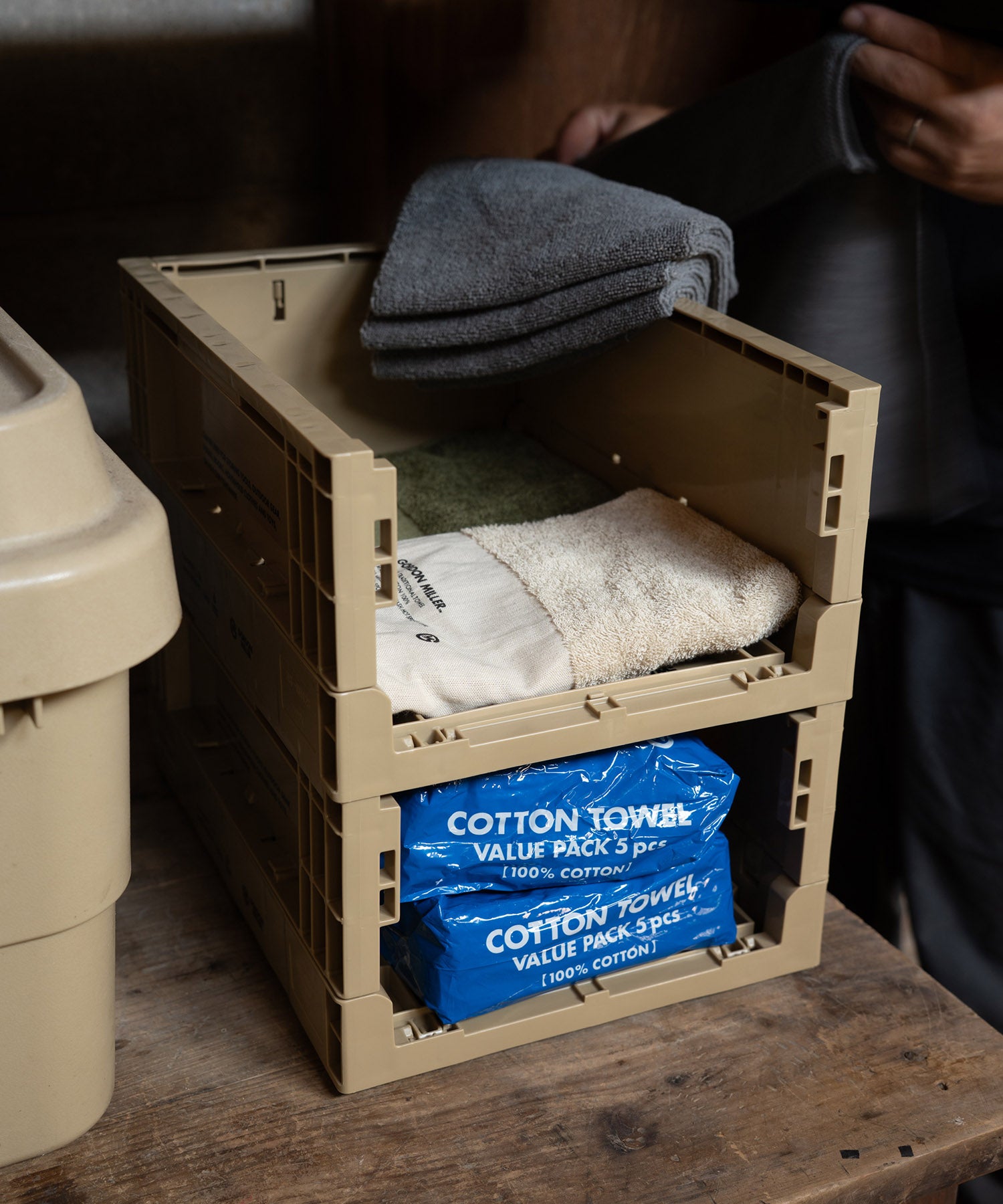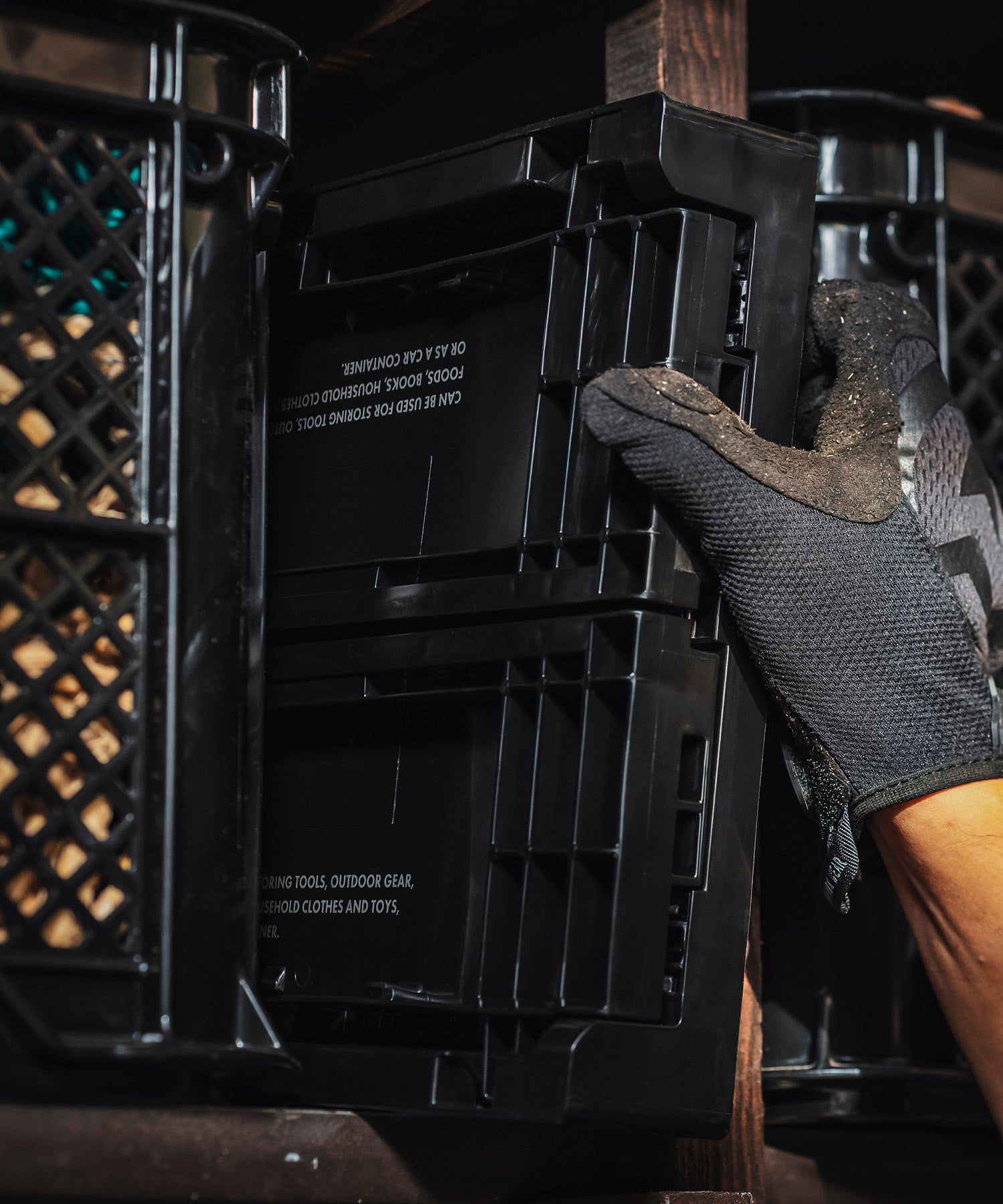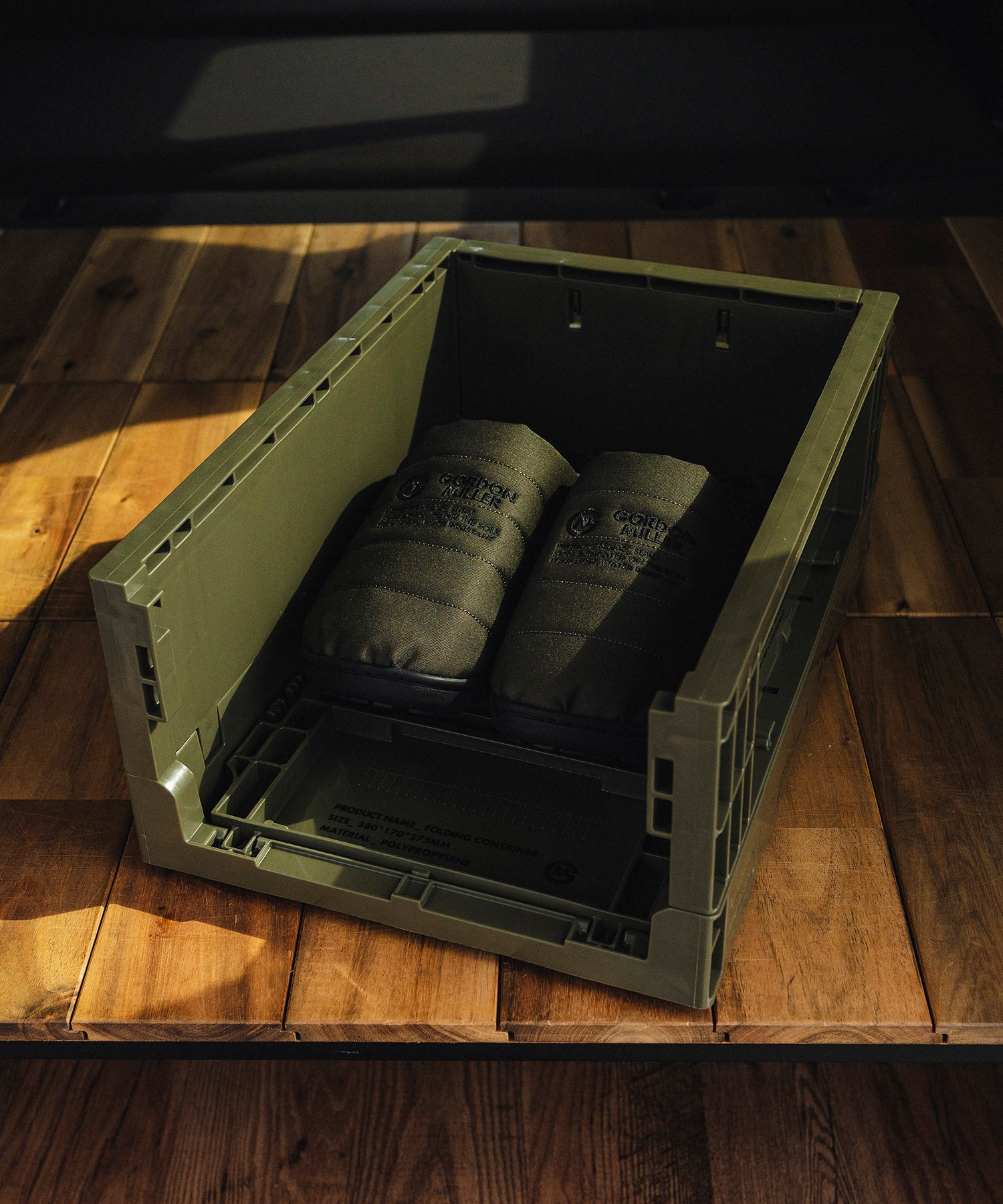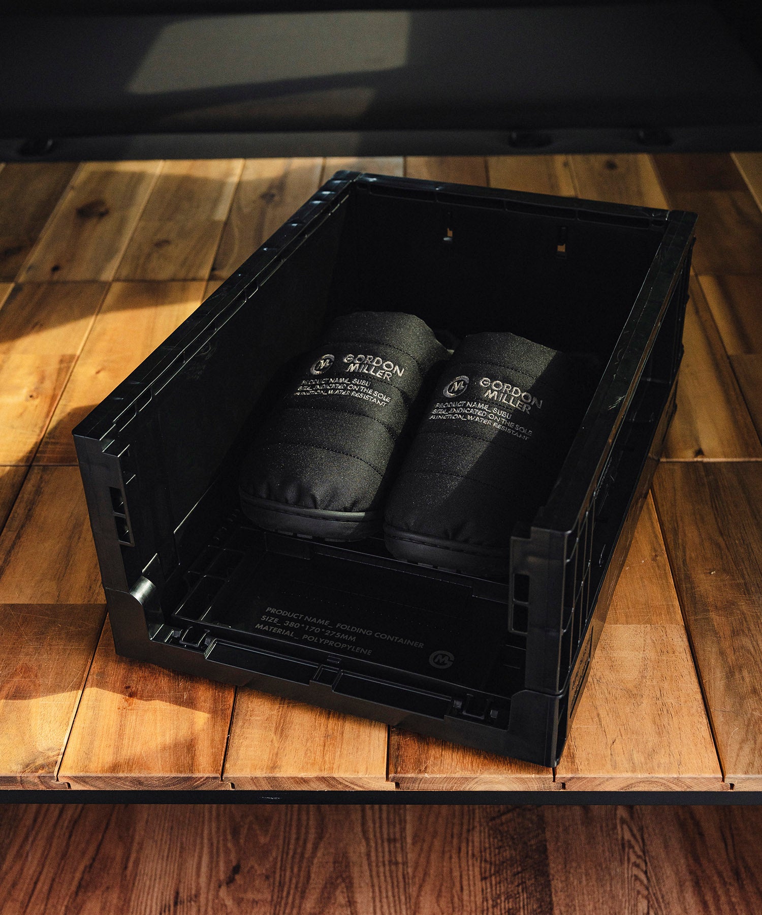 GORDON MILLERオリジナルデザインがされた一般流通で使用されている頑丈でタフな業務用のコンテナです。両側面が畳めるので、コンパクトに収納可能。短側面を畳めば、コンテナを積んだままでも収納物の出し入れが可能。何段か積んでシューズラックや衣類の収納としてもご使用いただけます。車の中やガレージはもちろん、クローゼットの中やリビングに出して見せる収納としても使用可能な便利アイテム。