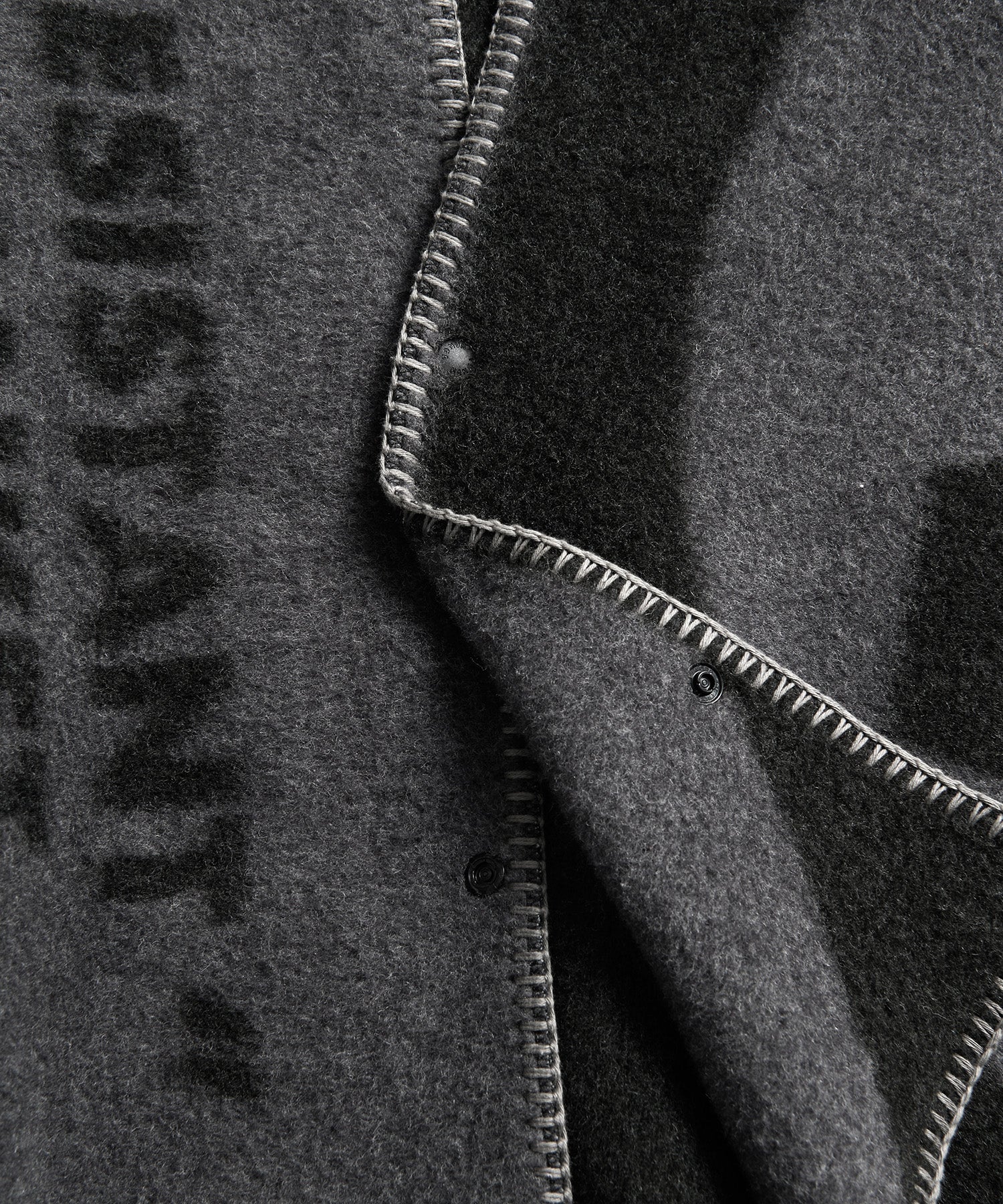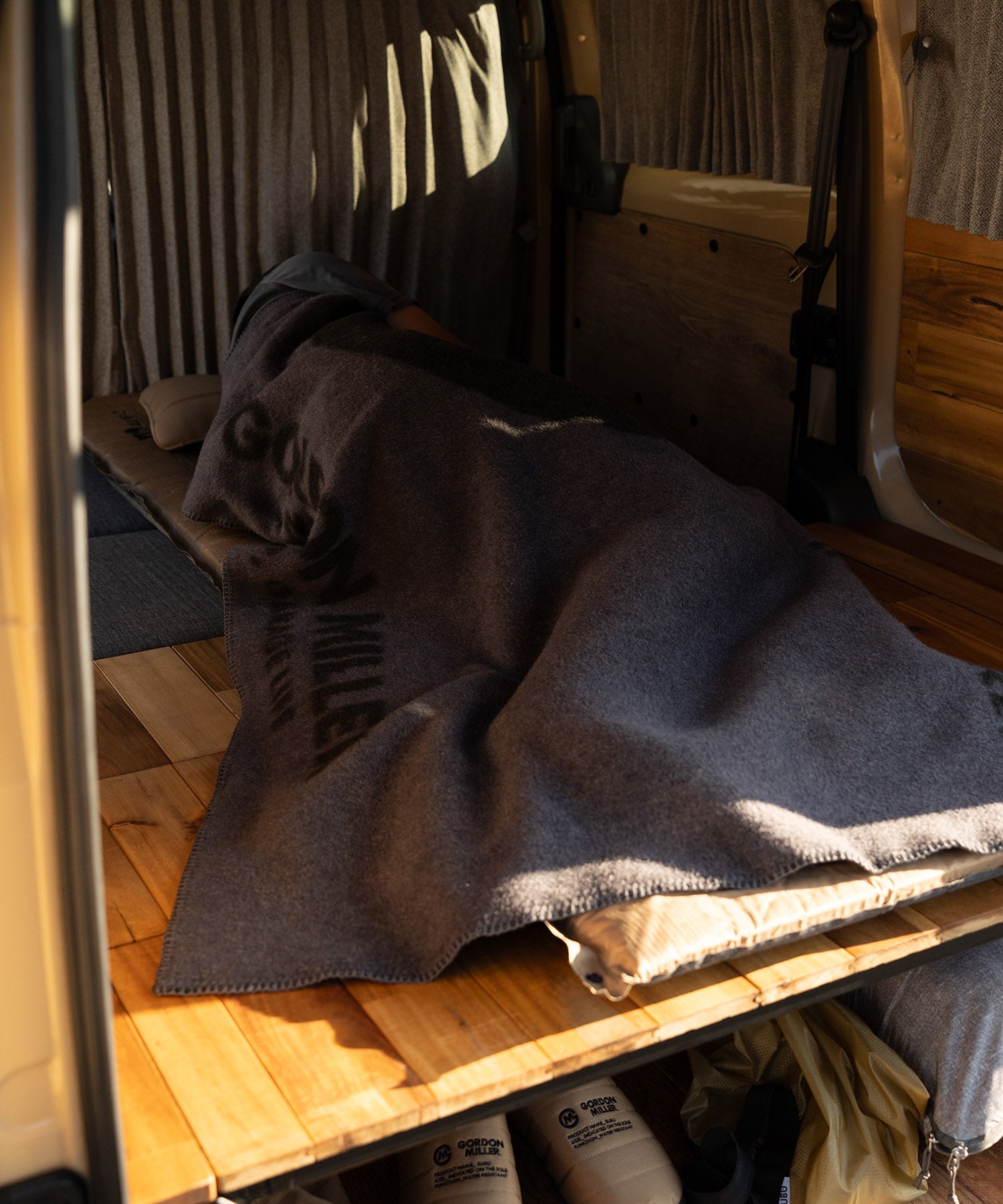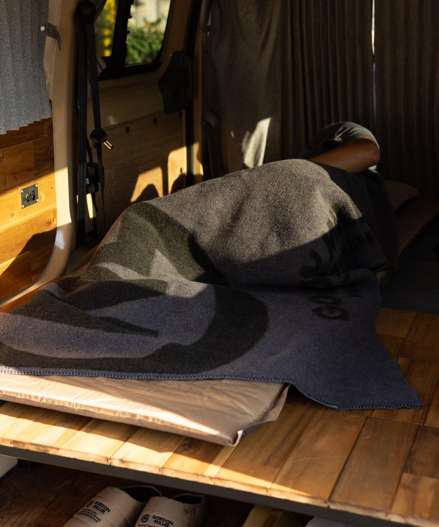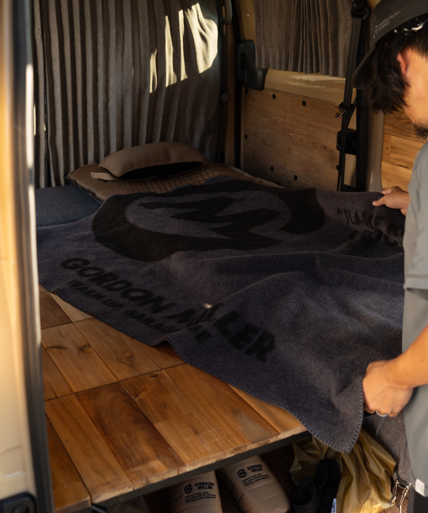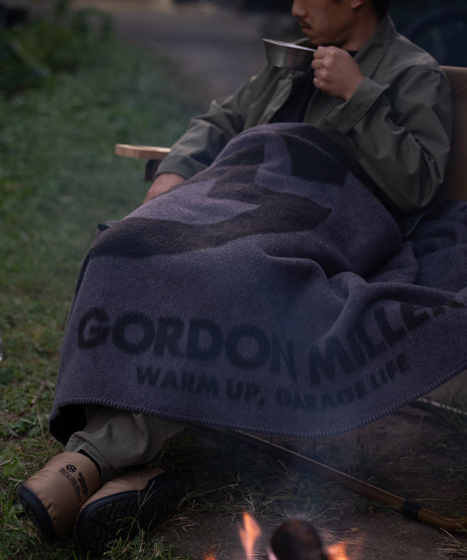GORDON MILLERがNANGAへ別注した,防炎機能付きブランケット。ウールの肌触りの良さを活かしつつ、防炎試験をクリアしたナンガの難燃ブランケット。大胆にGORDON MILLERのロゴマークを配したオリジナルデザインです。ぐるり周りをかこっているブランケットステッチがアクセント。毛足もふんわりやわらかく、大きさも手ごろなので、ひざ掛け、羽織といった使用が可能。2つのスナップボタンが付いているので肩から羽織って保持できる仕様にもなっております。キャンプ、バンライフなどのアウトドアシーンで肌寒い時にご着用いただけます。