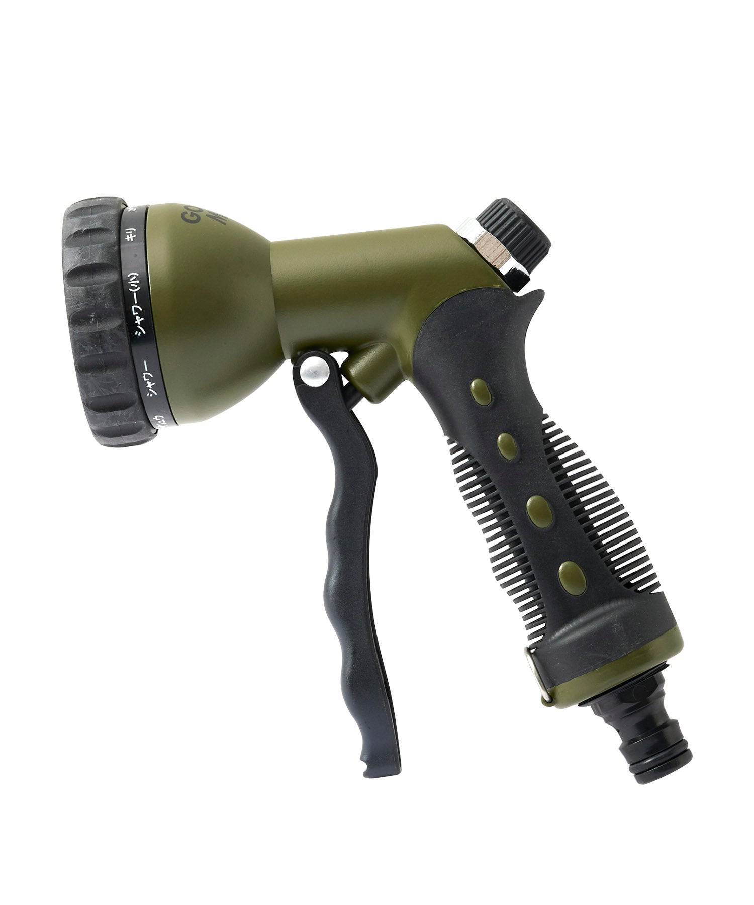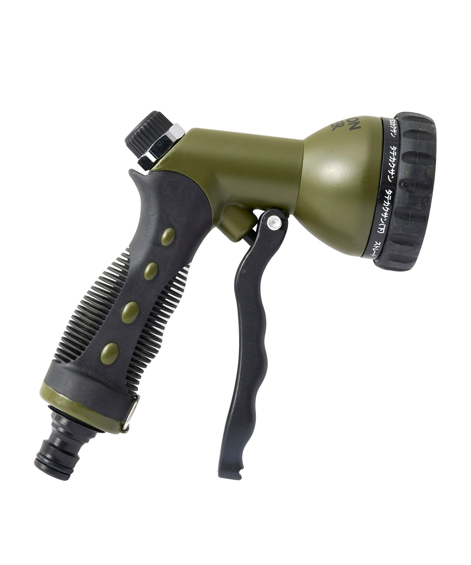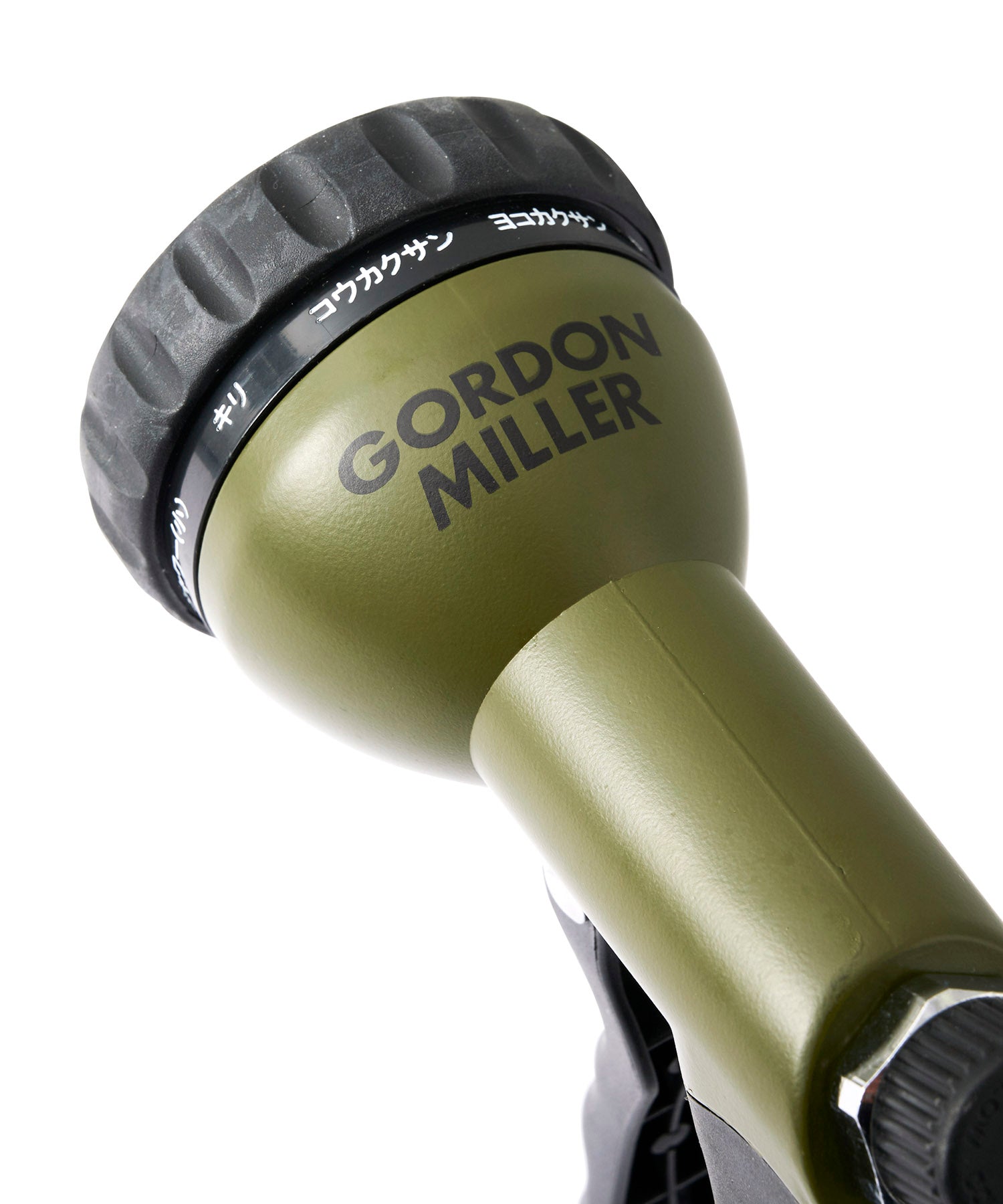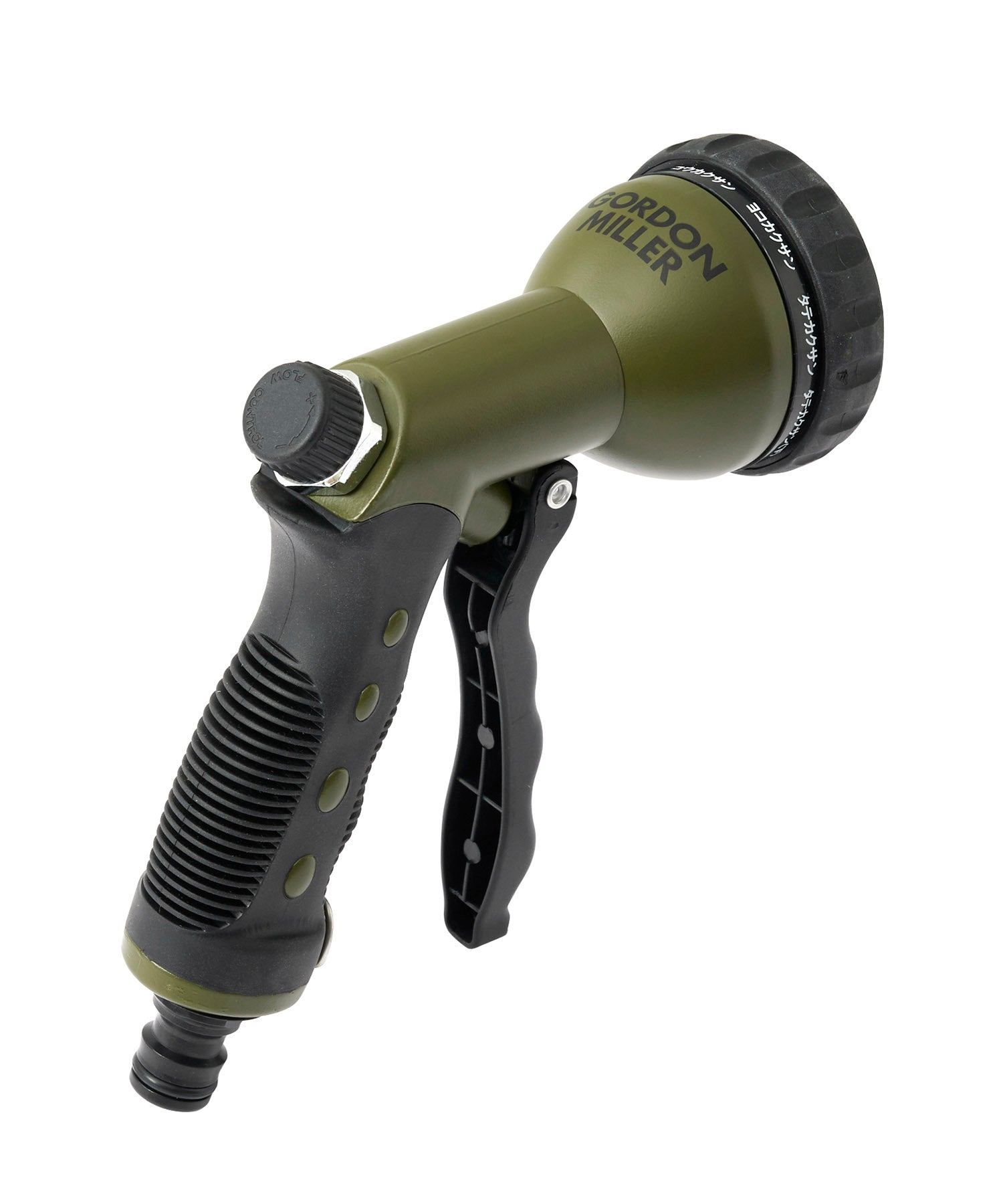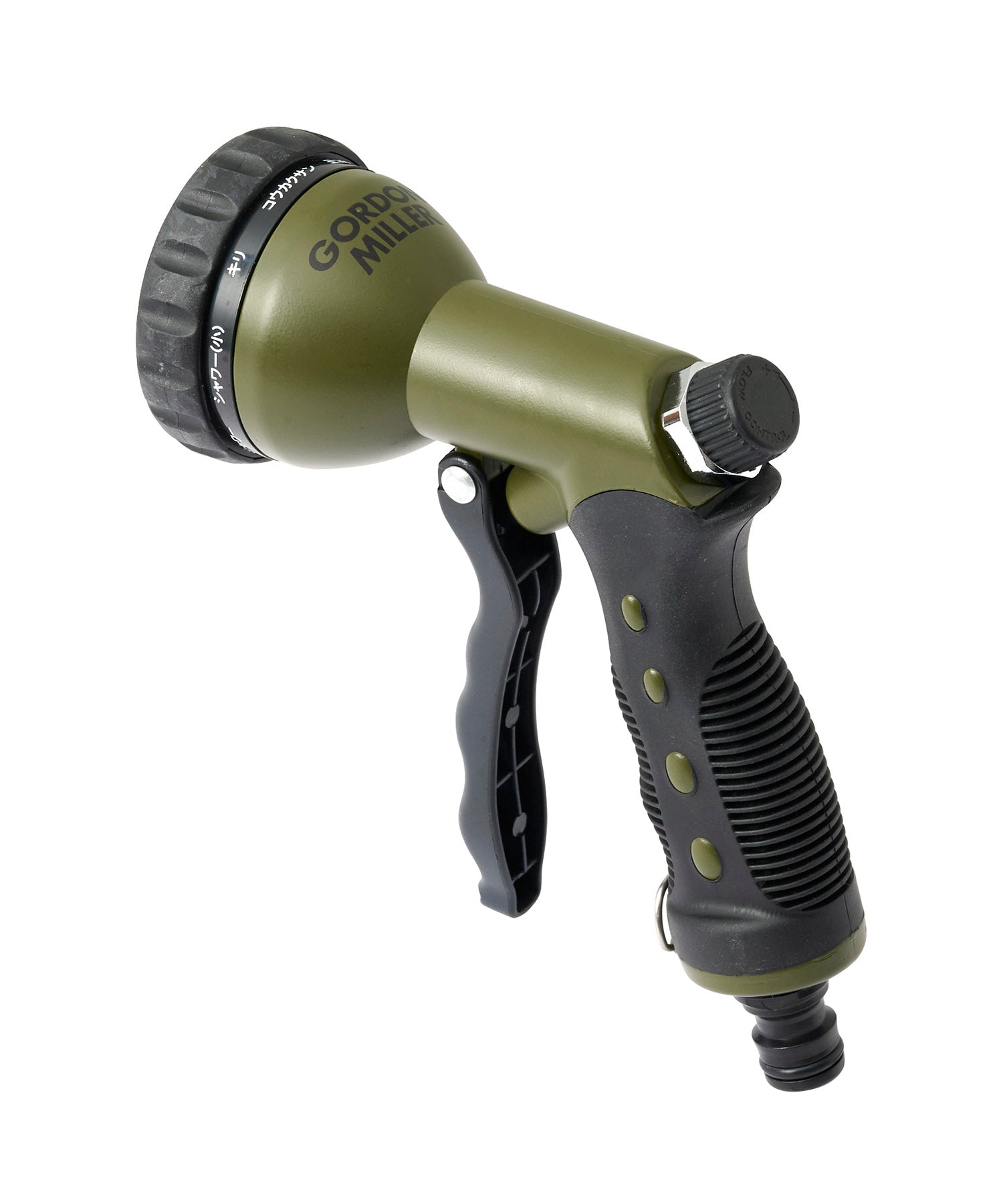 GORDON MILLERオリジナル:フルカバーホースリールとステンレスウォーターホースに取り付け可能な別売りの「交換用ノズル」。オリジナルカラーのOLIVEDRABで洗車や散水など、用途に合わせて9種類の水形パターンが選択できます。